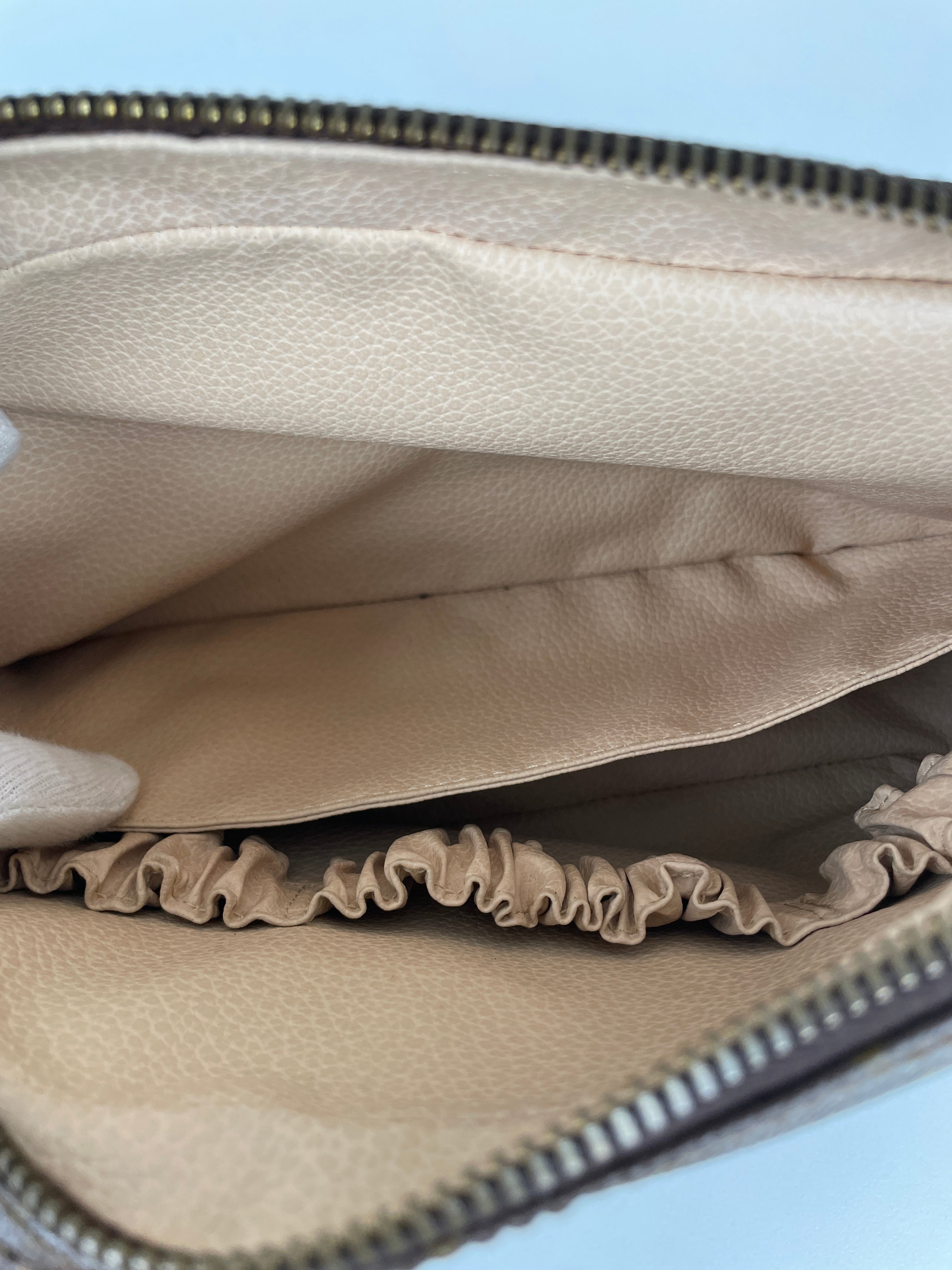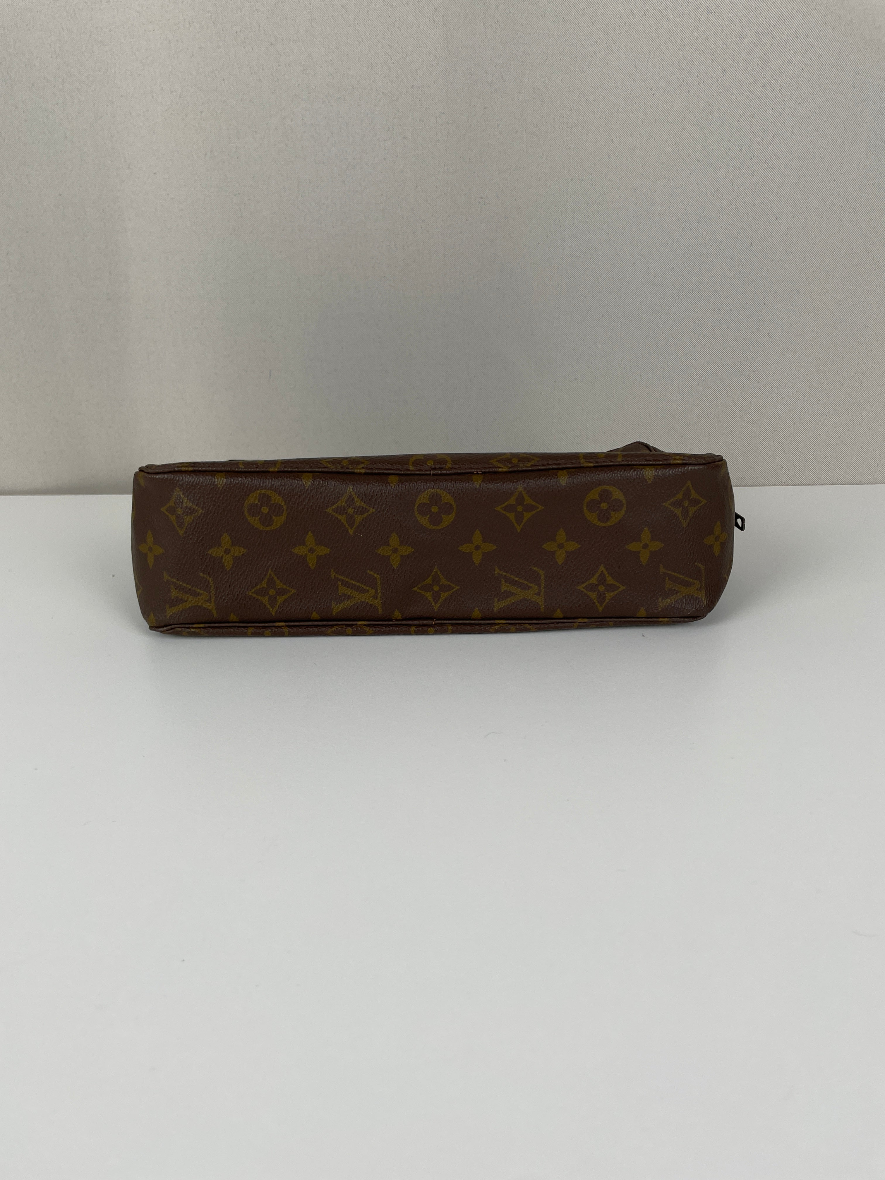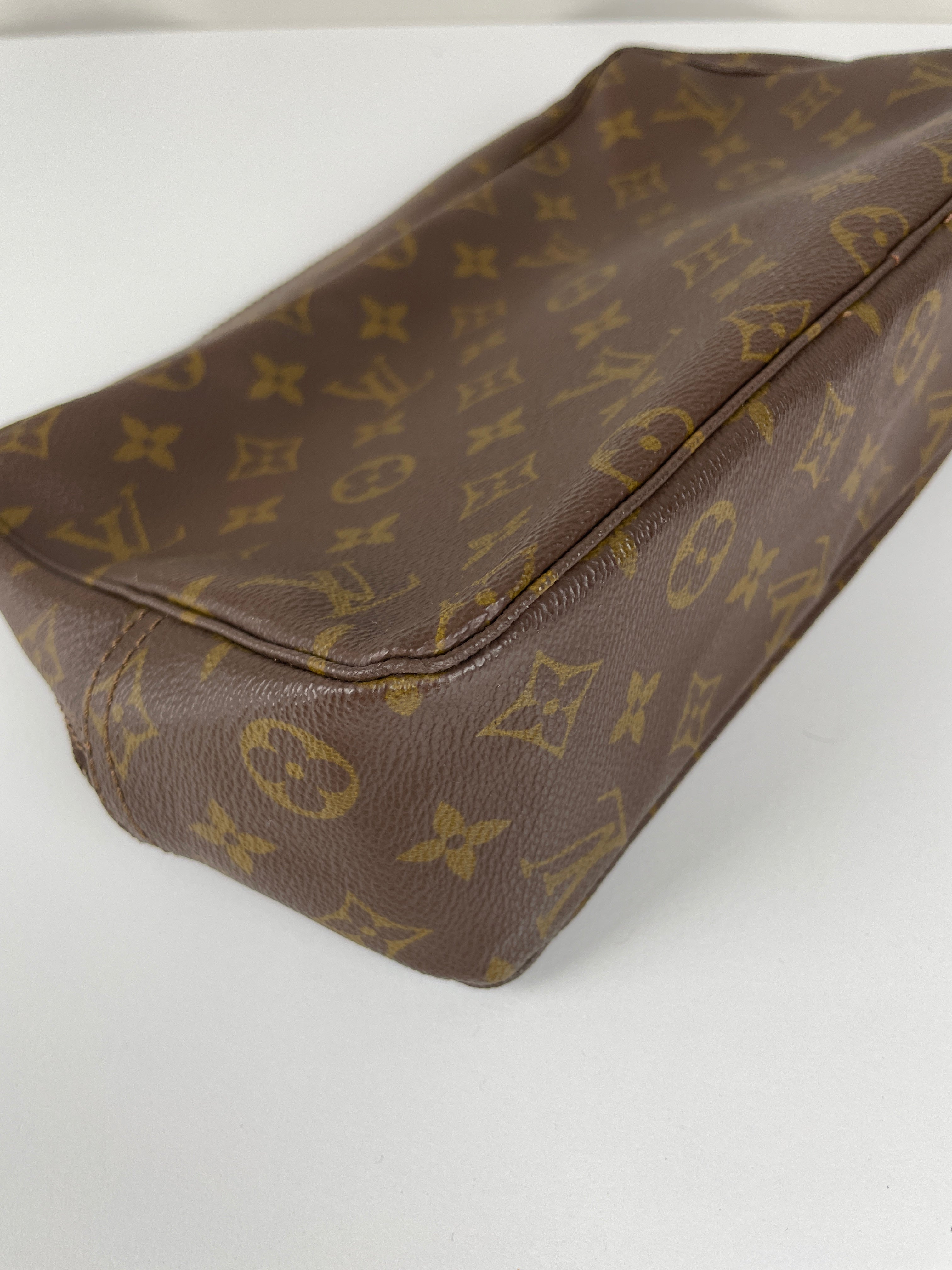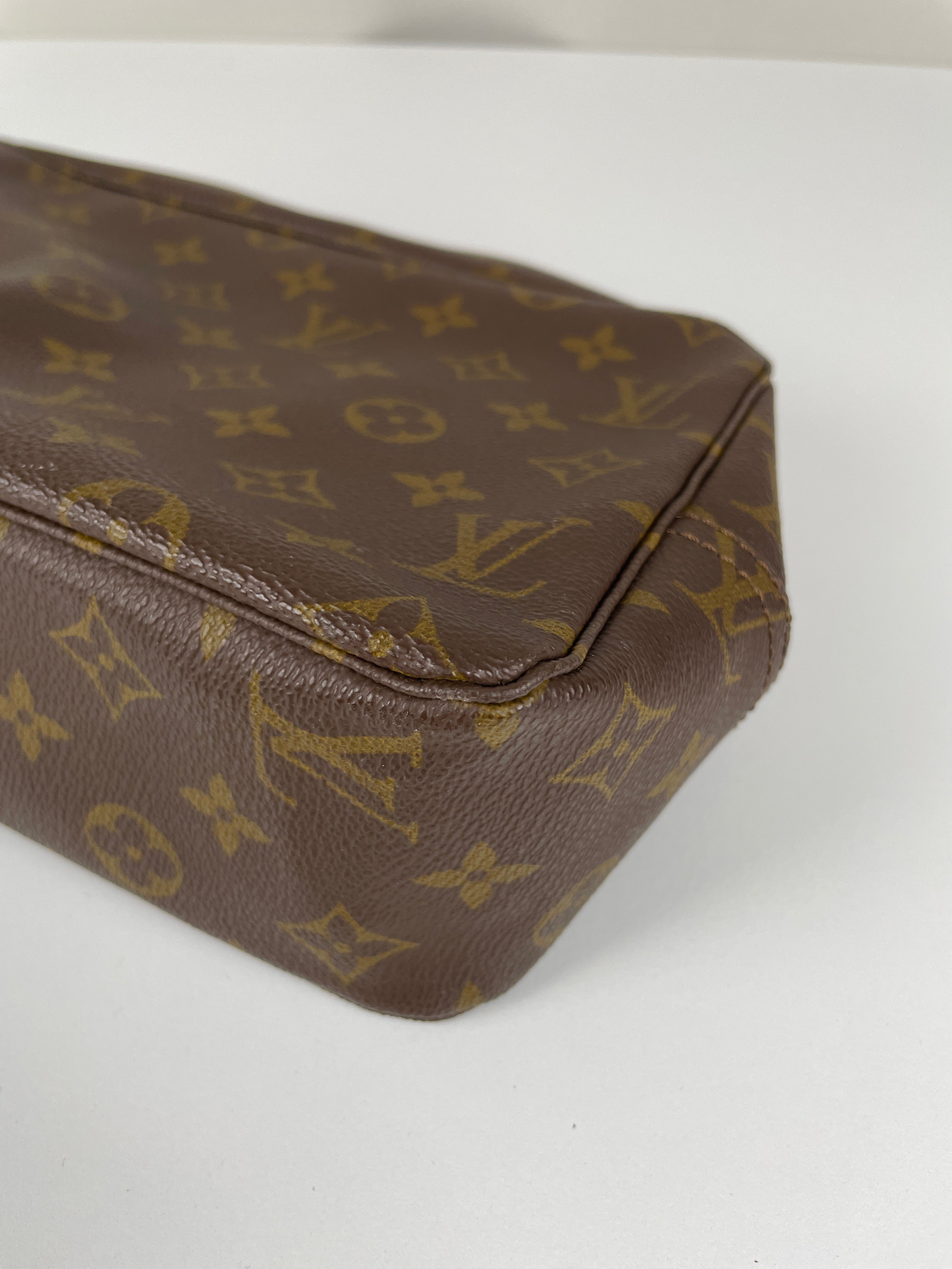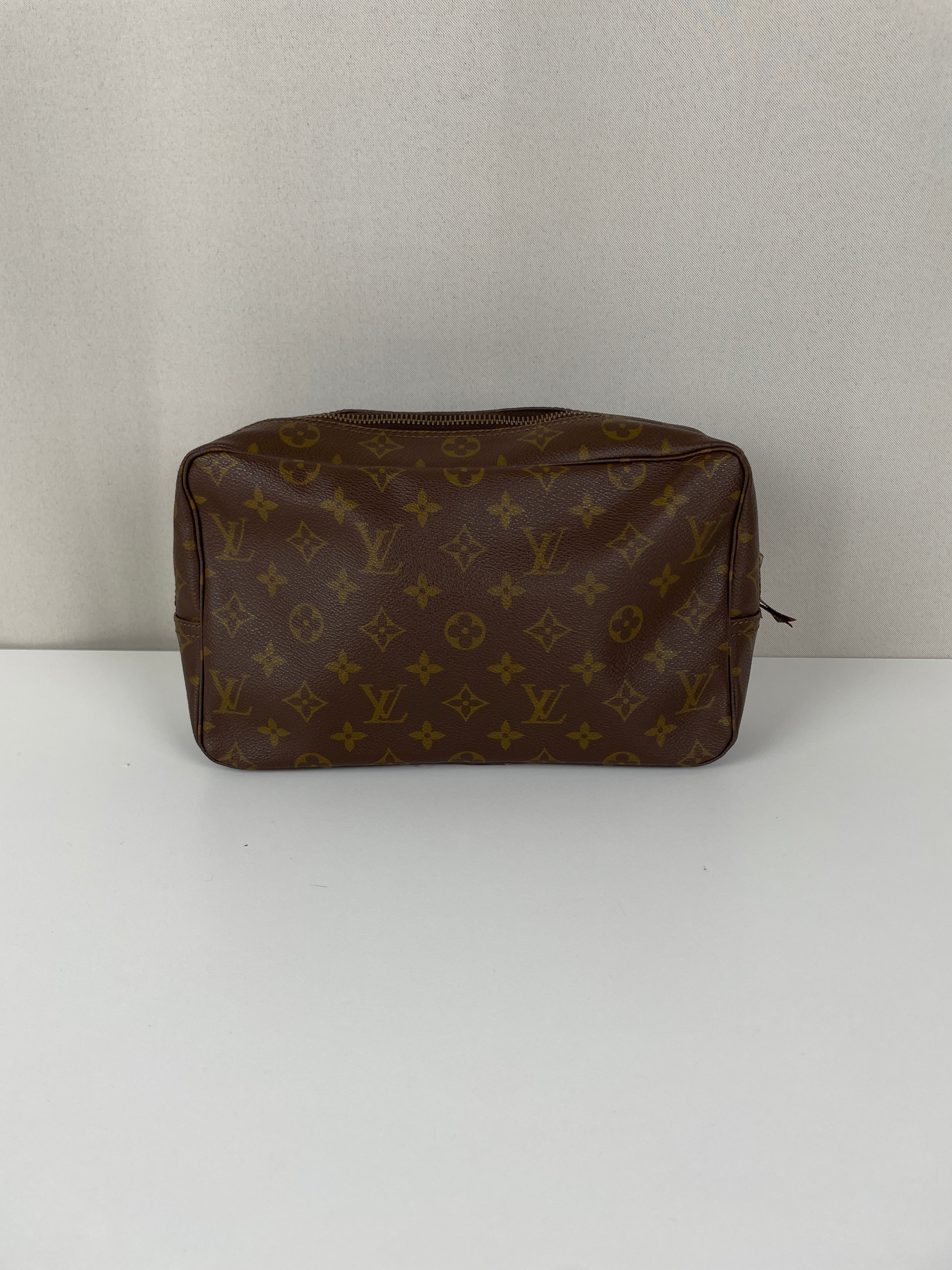 Cette trousse de toilette Louis Vuitton Monogram est en très bon état. L'intérieur est en très bon état avec quelques endroits noircis. La toile est en bon état. La fermeture éclair est frottée suite à une utilisation normale.