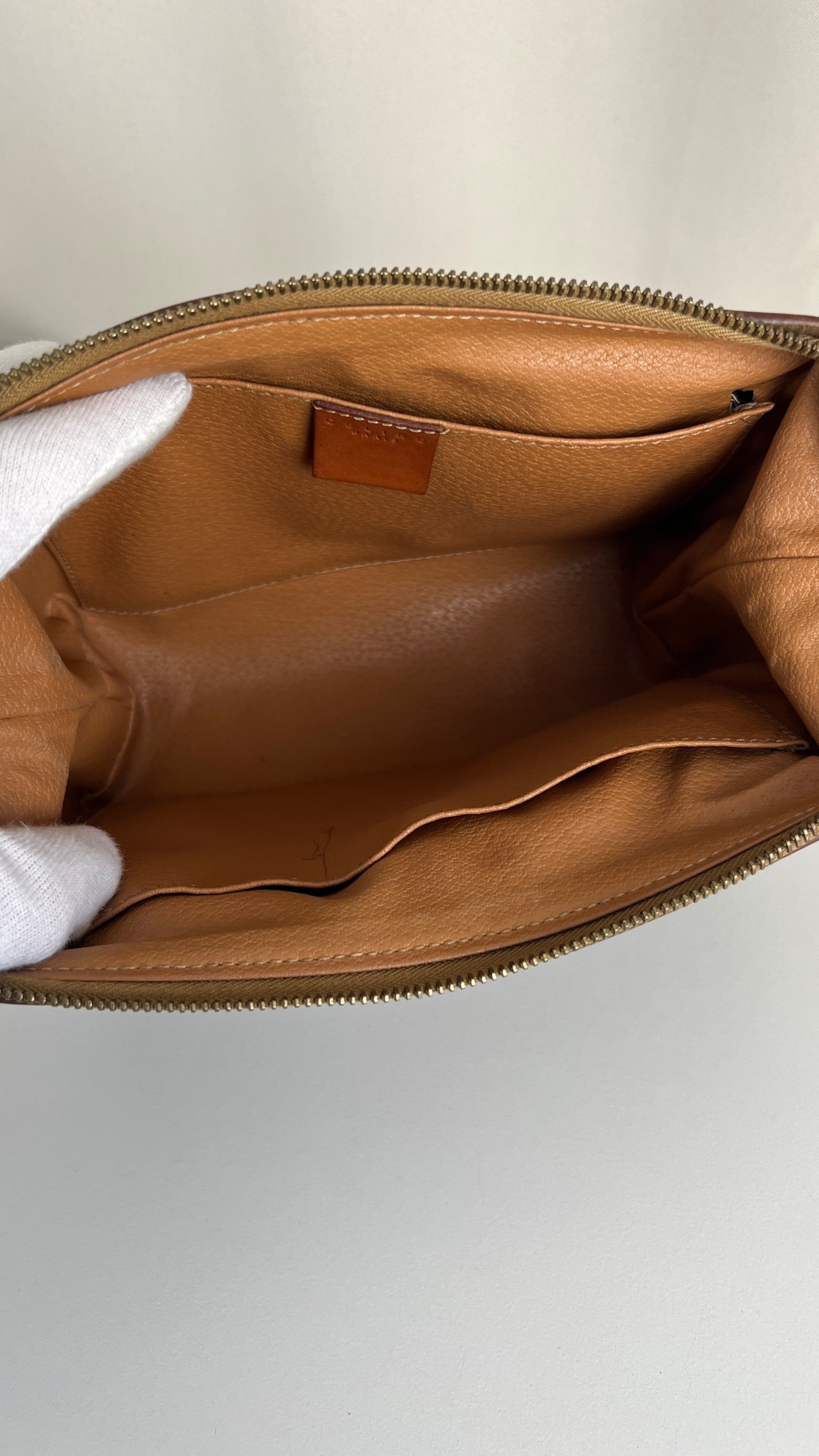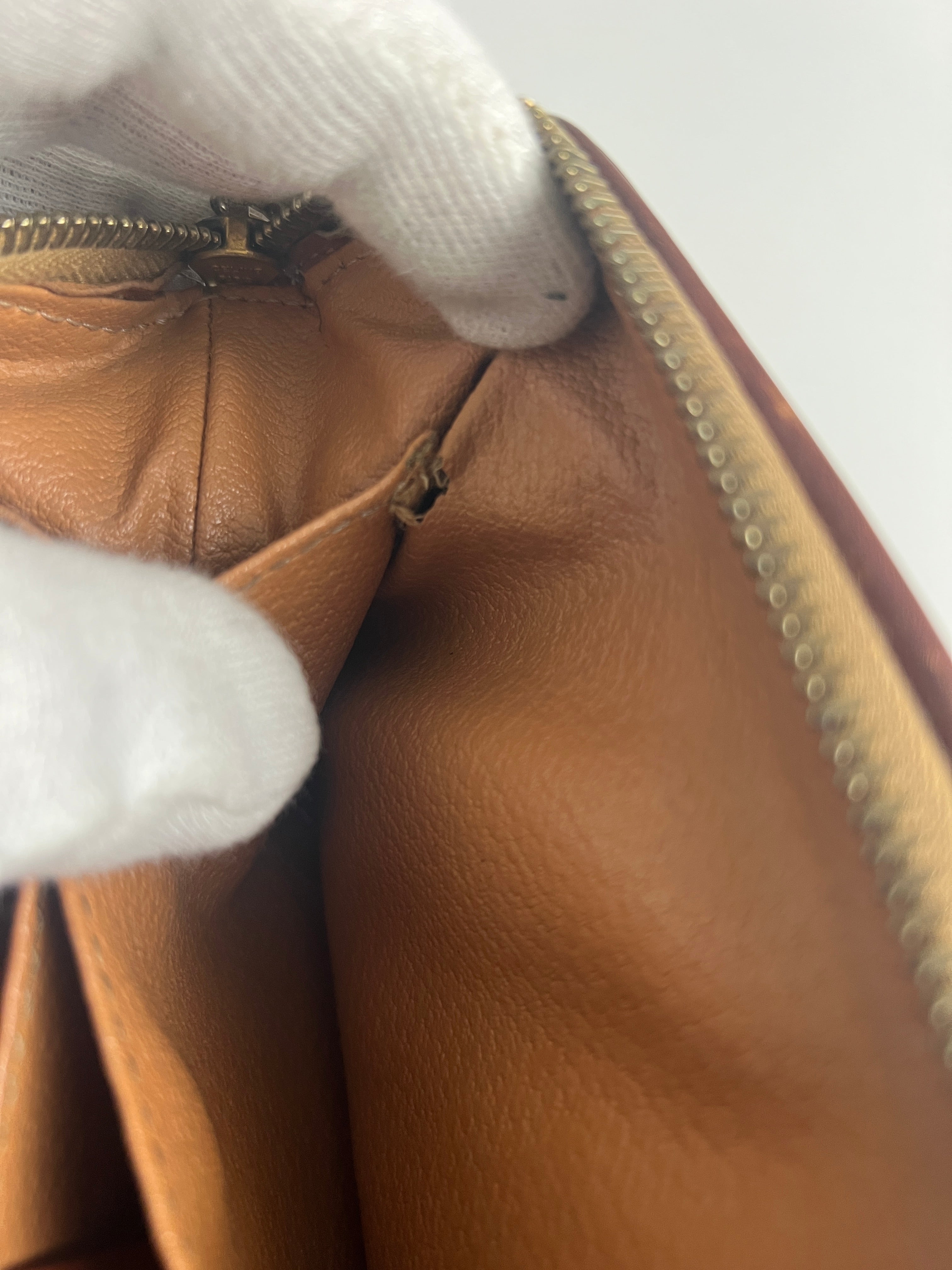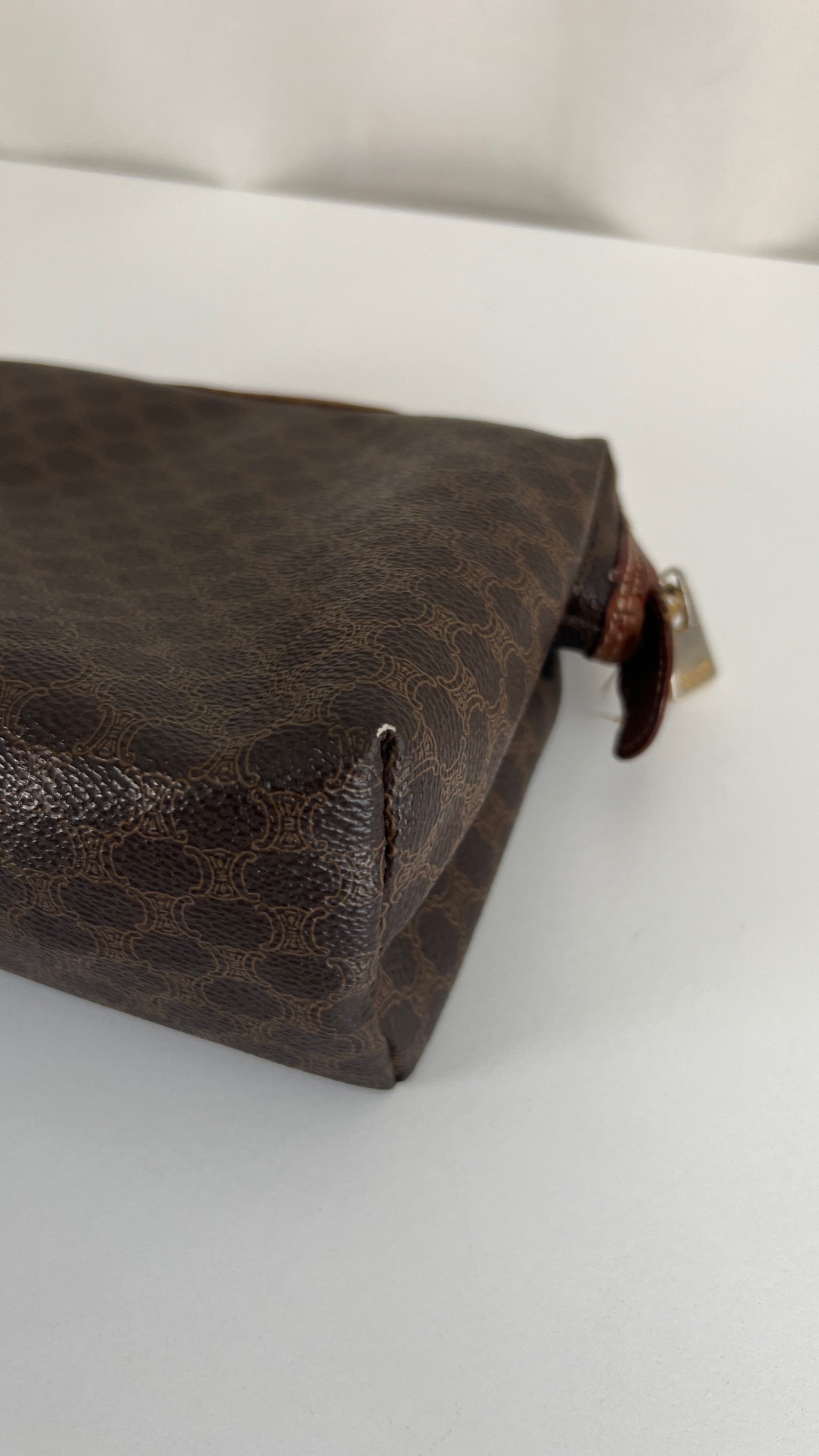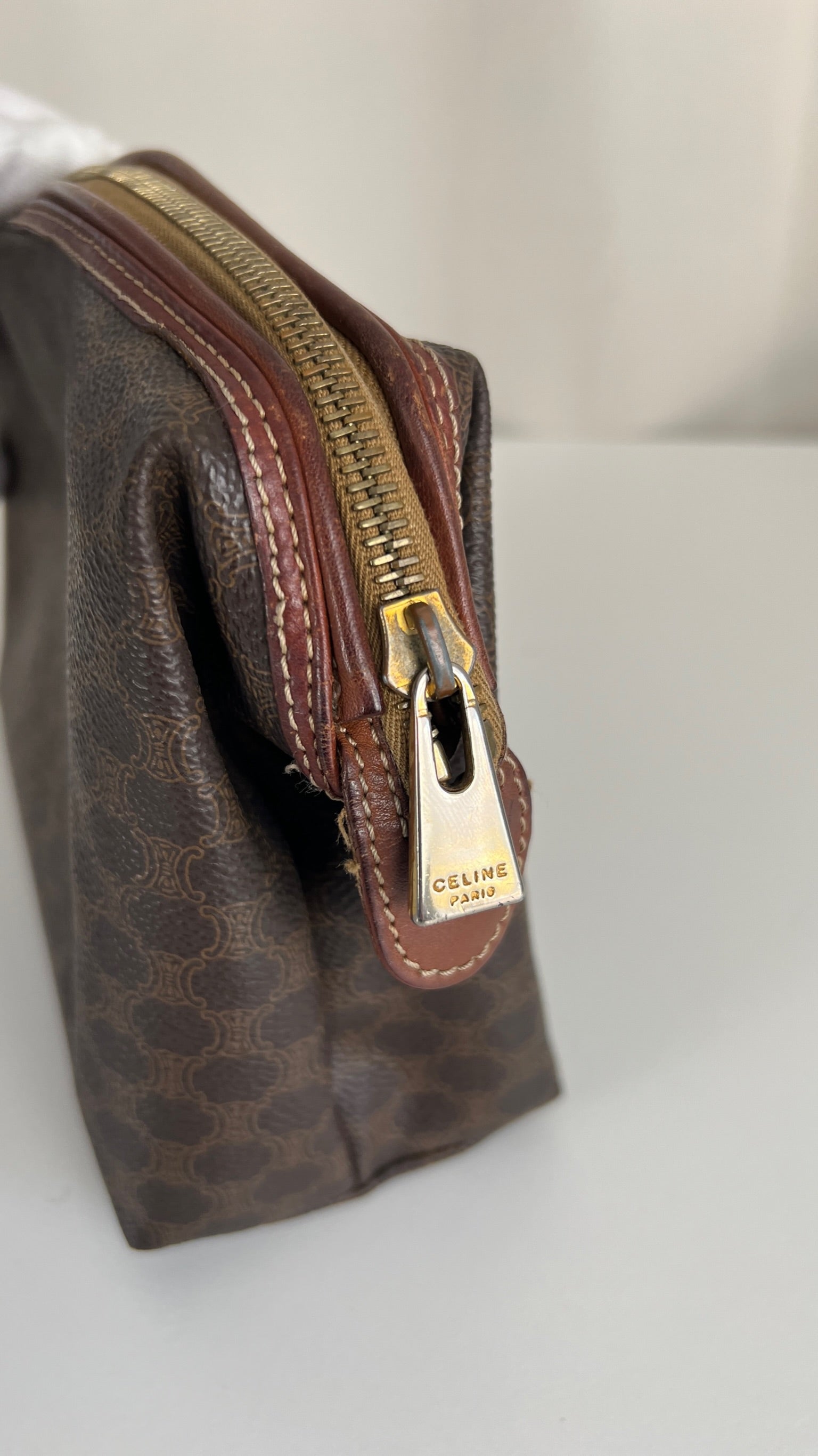 Cette pochette Céline est en état d'usage/bon état. La toile est en très bon état. Les coins sont frottés/usé. L'intérieur est en bon état : une marque de stylo + vous avez les coutures des 2 poches qui commencent à s'abîmer/déchirer (voir sur photos). Les parties métalliques sont un peu usé (mais normal).