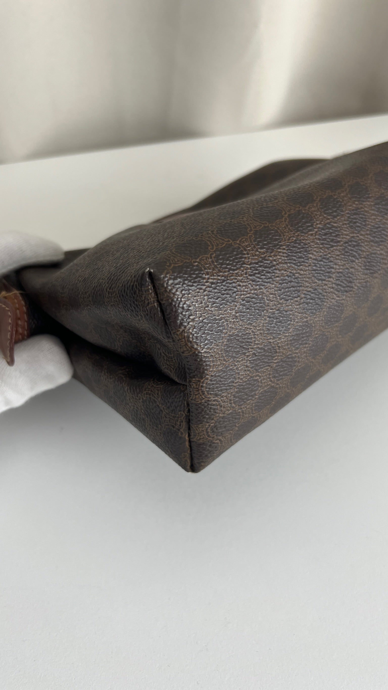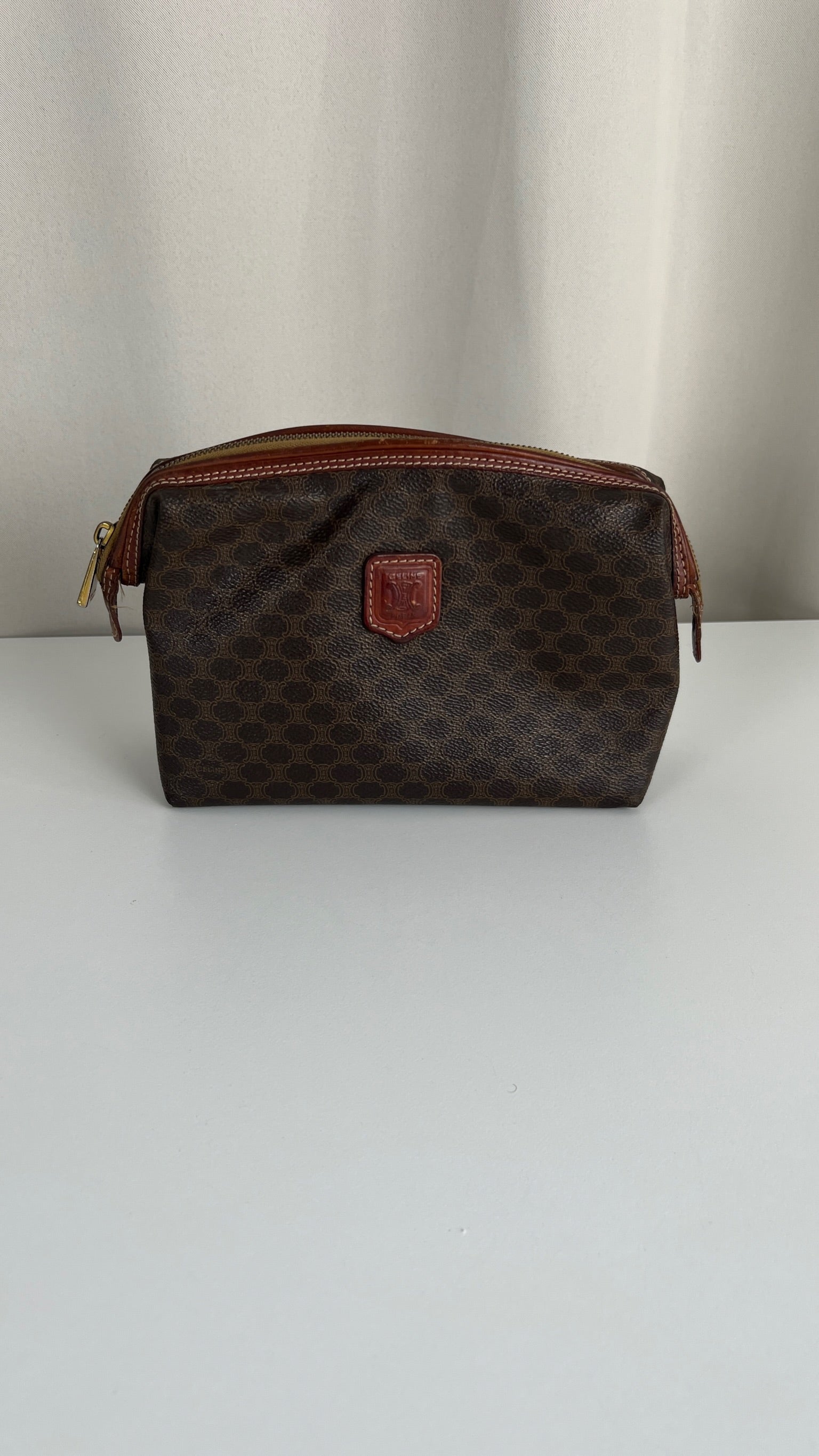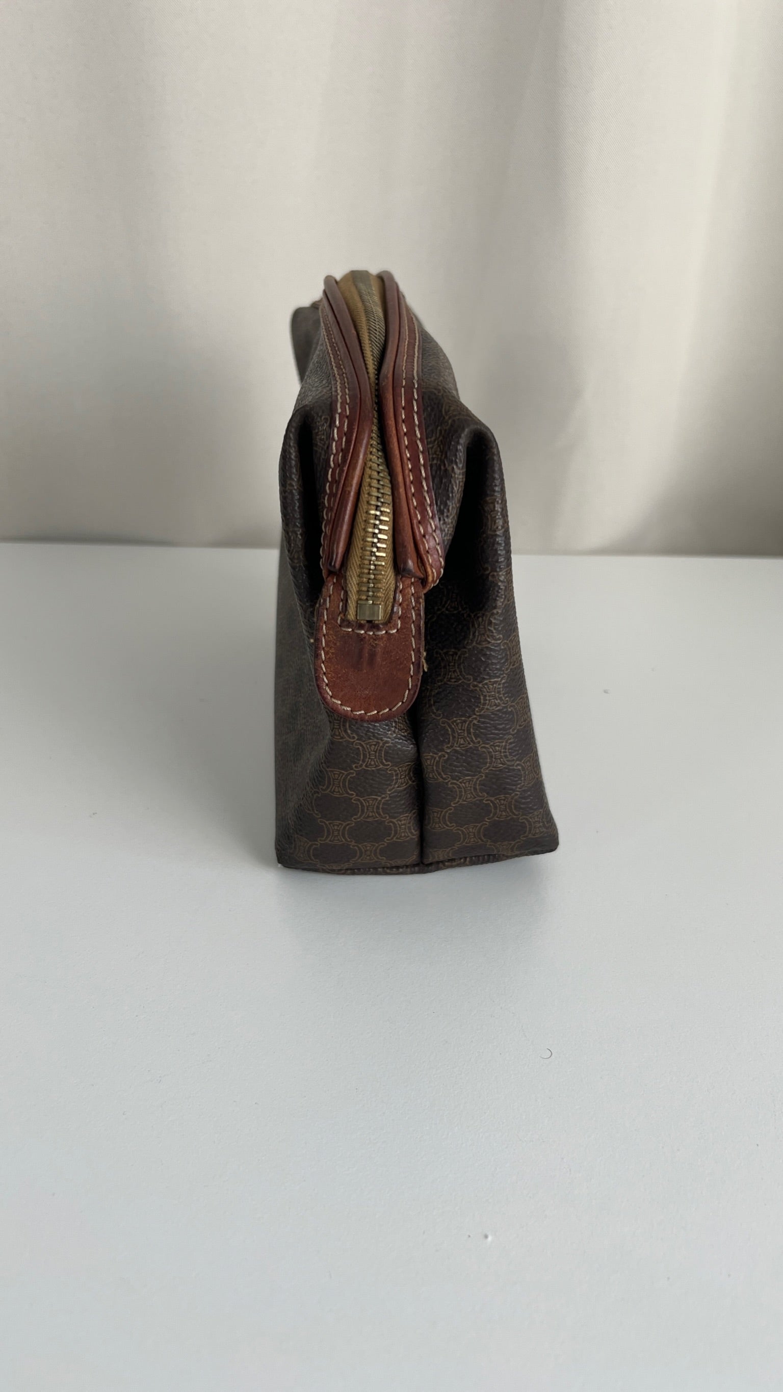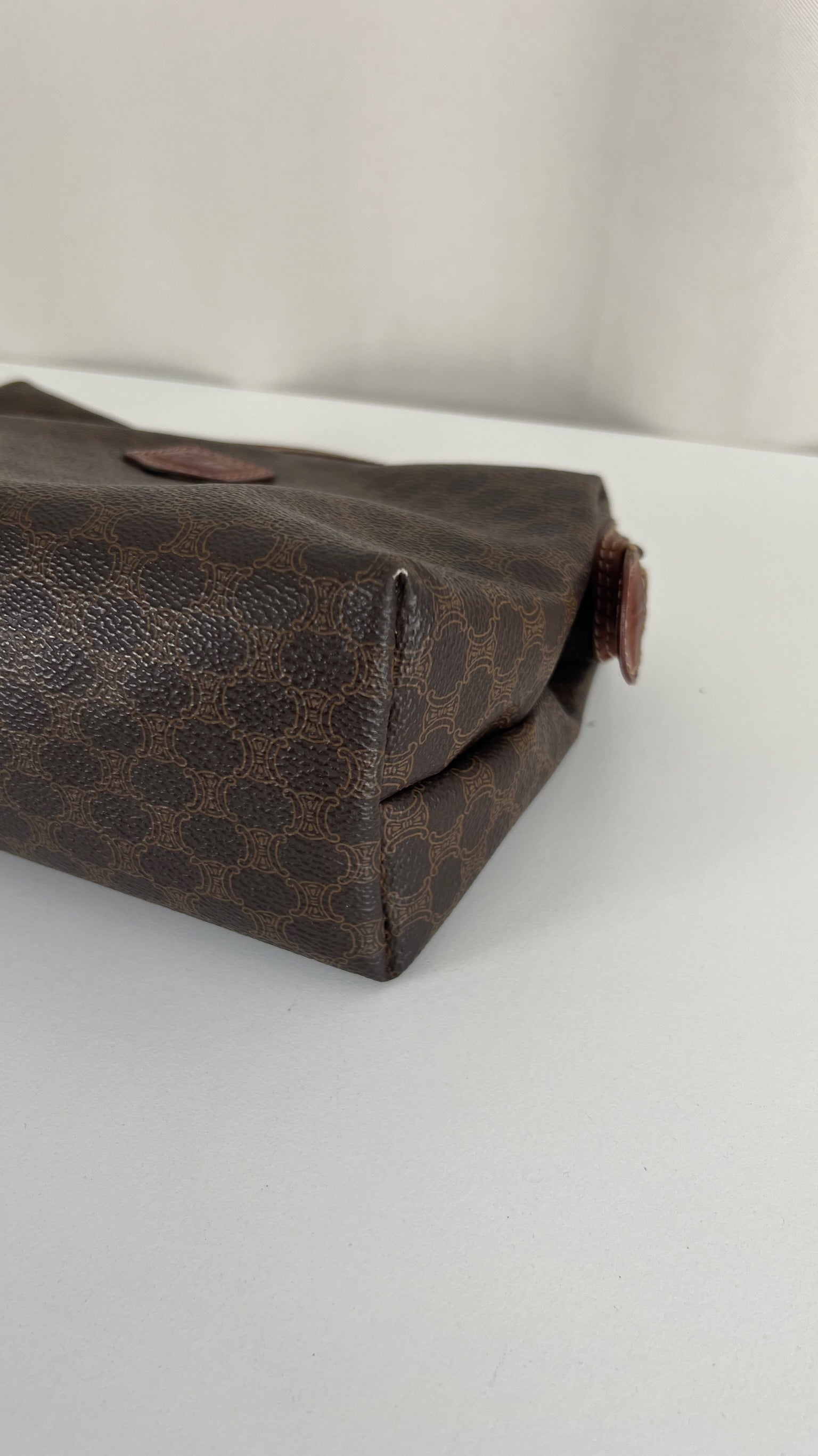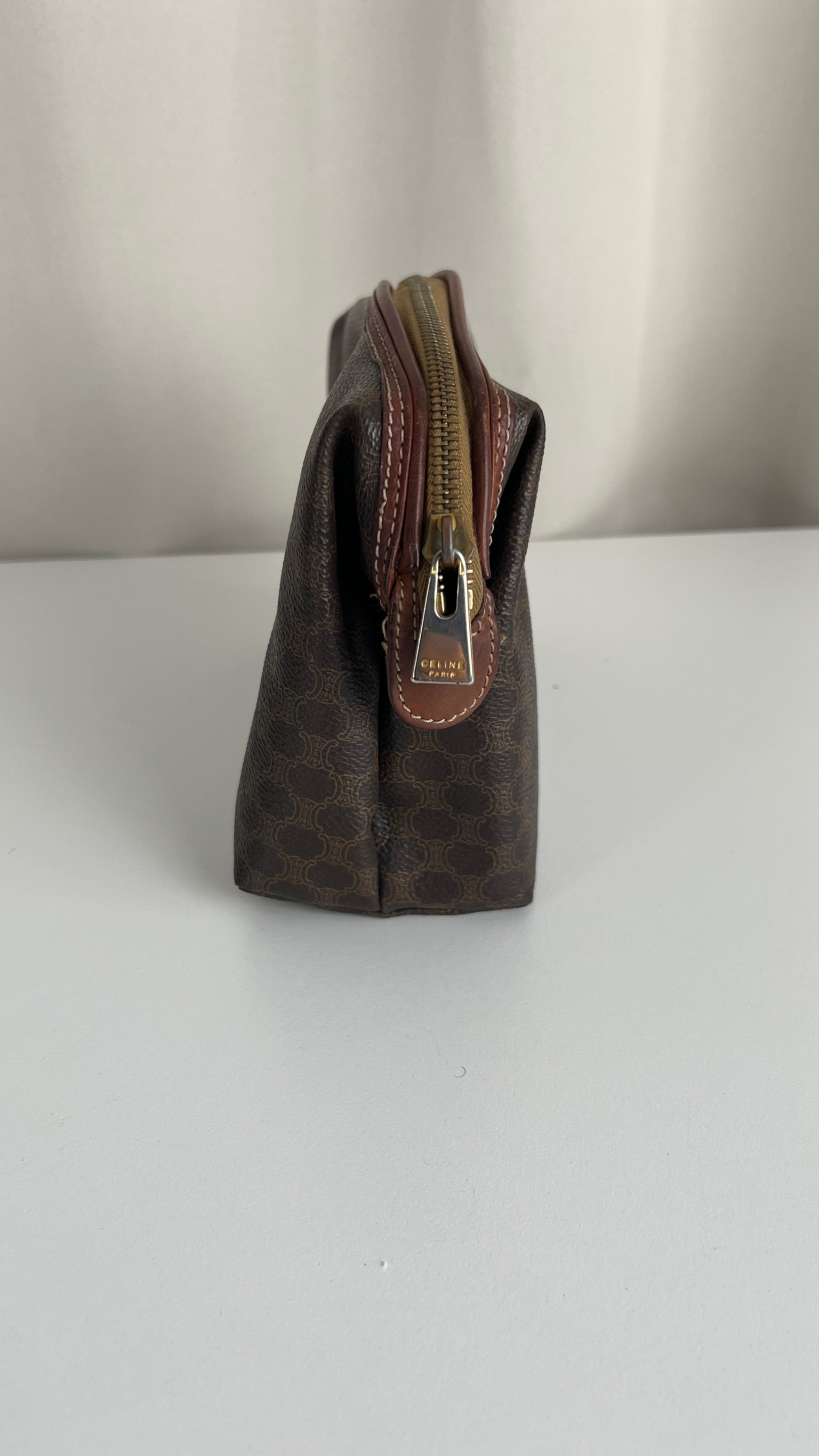 Cette pochette Céline est en état d'usage/bon état. La toile est en très bon état. Les coins sont frottés/usé. L'intérieur est en bon état : une marque de stylo + vous avez les coutures des 2 poches qui commencent à s'abîmer/déchirer (voir sur photos). Les parties métalliques sont un peu usé (mais normal).