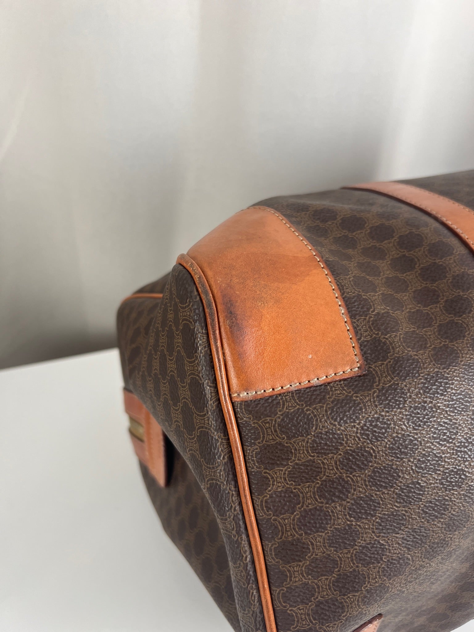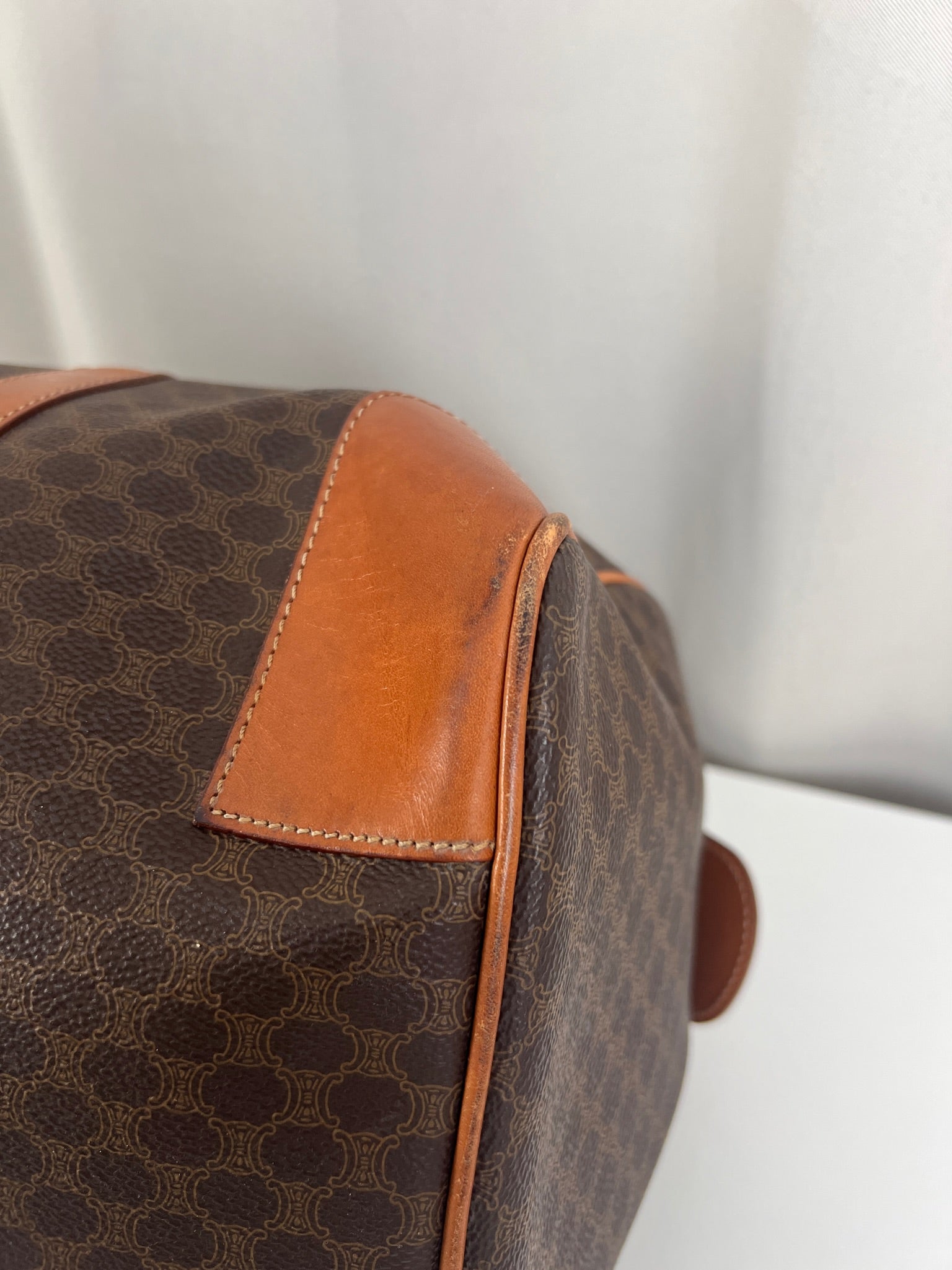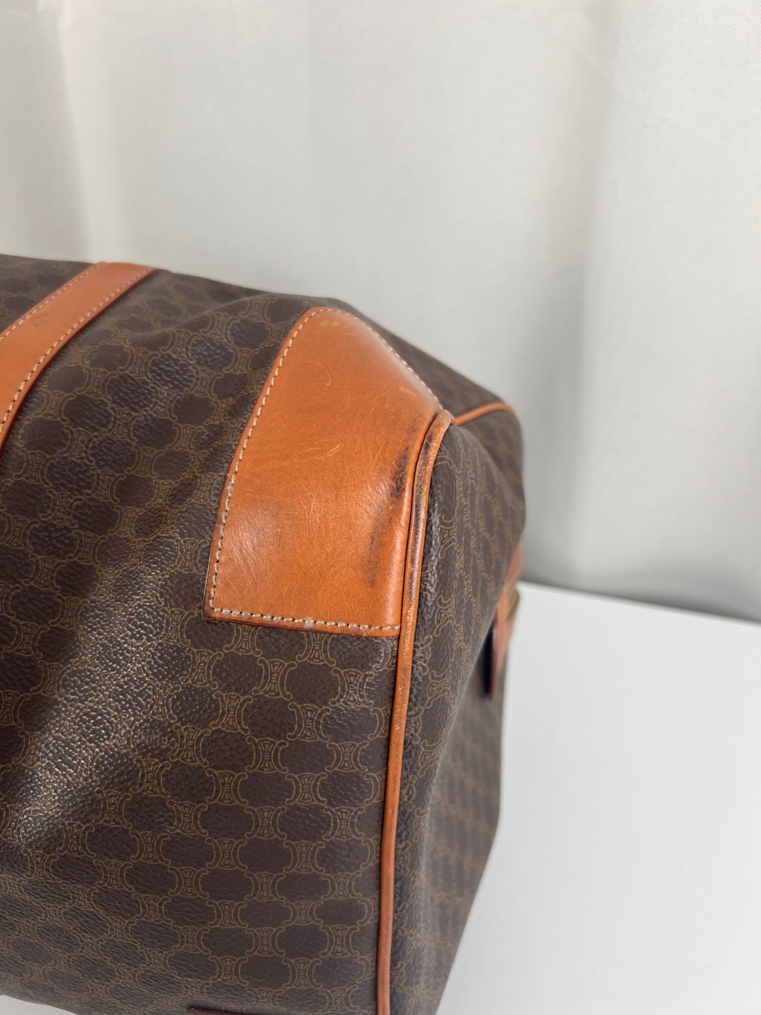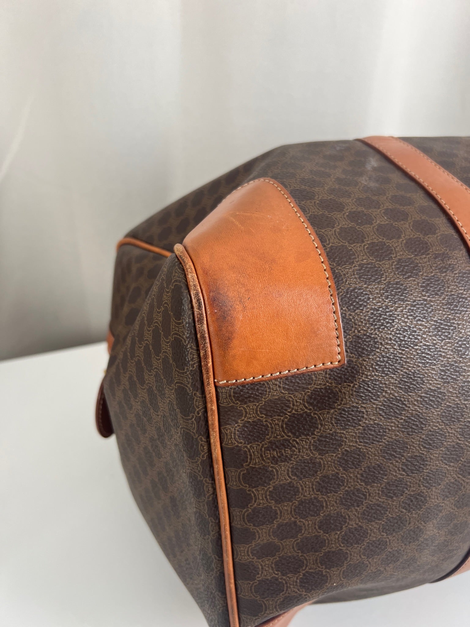 Ce sac de voyage Céline Macadam est en bon état. La toile est en très bon état, seulement quelques petites taches sur le dessous. La base du sac présente des tâches et trace d'usure. Les poignées sont en très bon état. Les coins sont frottés. L'intérieur est en bon état. Livré avec cadenas et clé.
