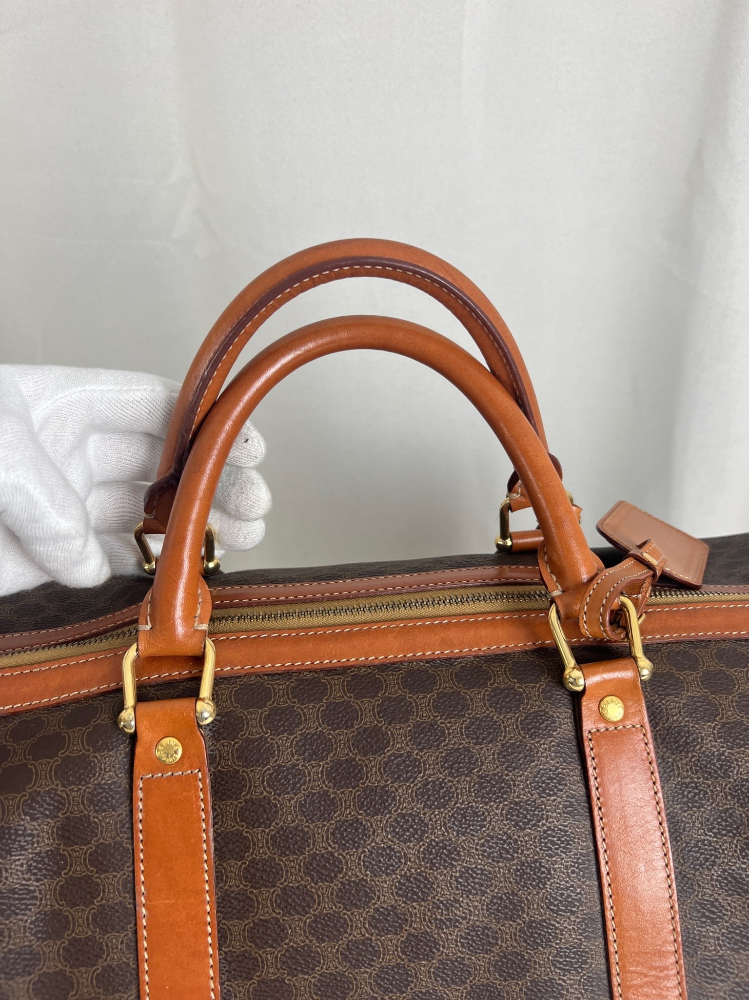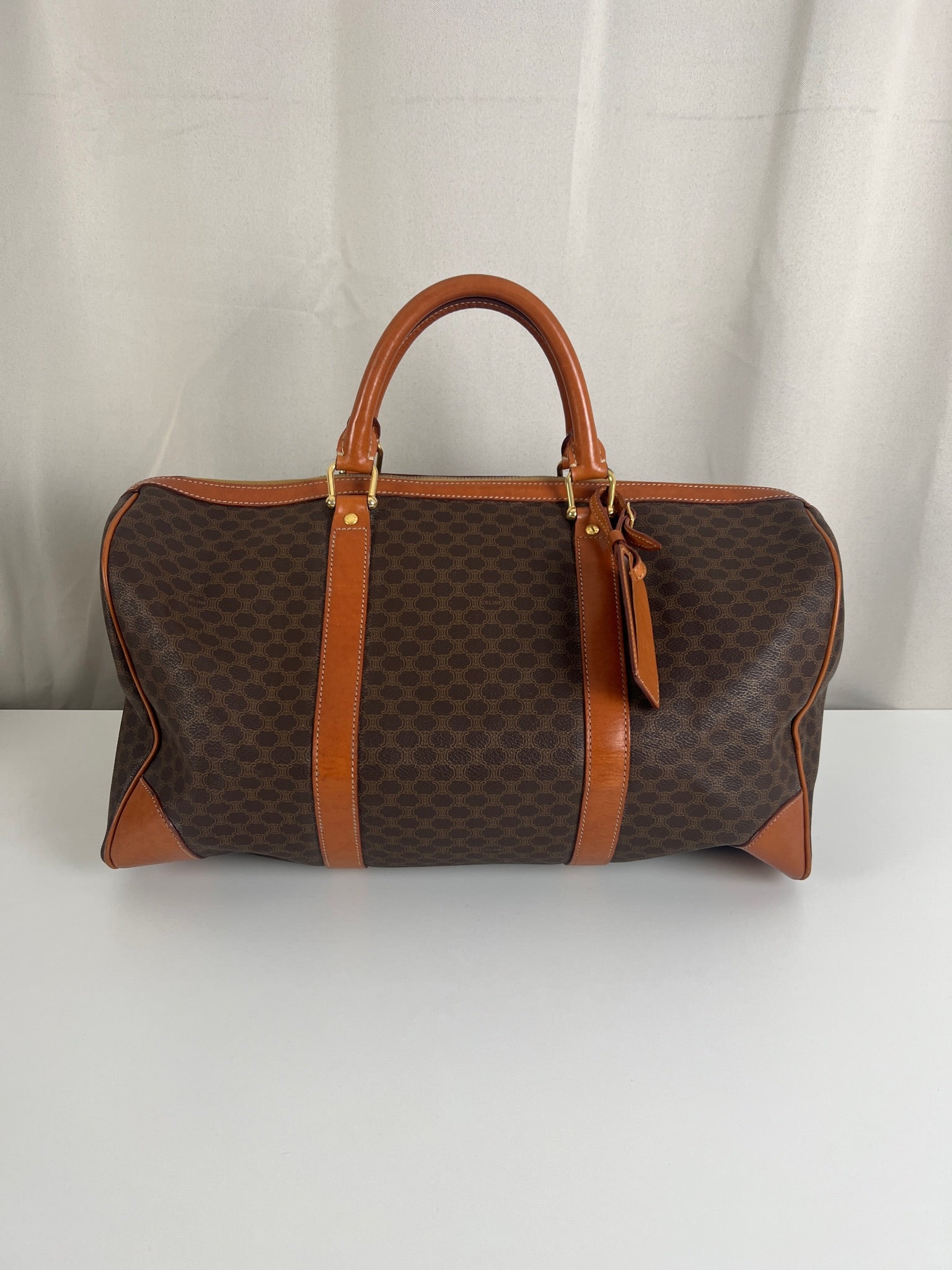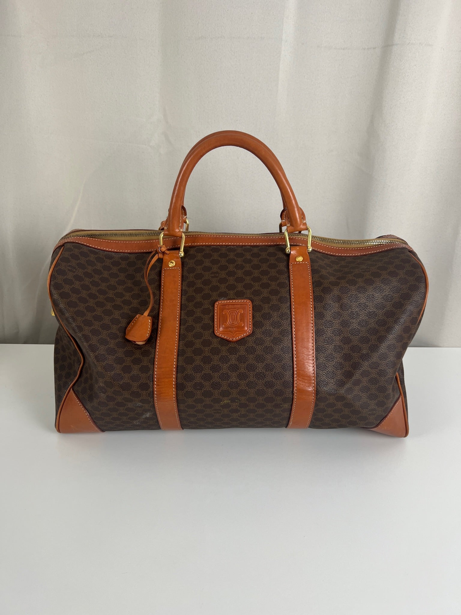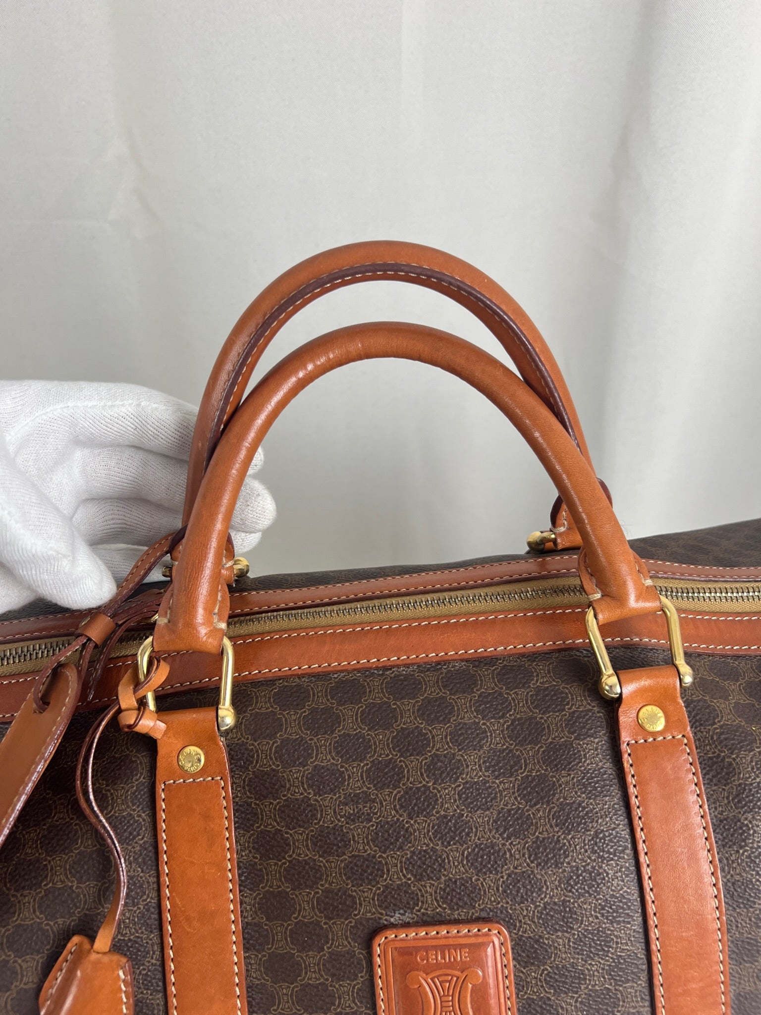 Ce sac de voyage Céline Macadam est en bon état. La toile est en très bon état, seulement quelques petites taches sur le dessous. La base du sac présente des tâches et trace d'usure. Les poignées sont en très bon état. Les coins sont frottés. L'intérieur est en bon état. Livré avec cadenas et clé.