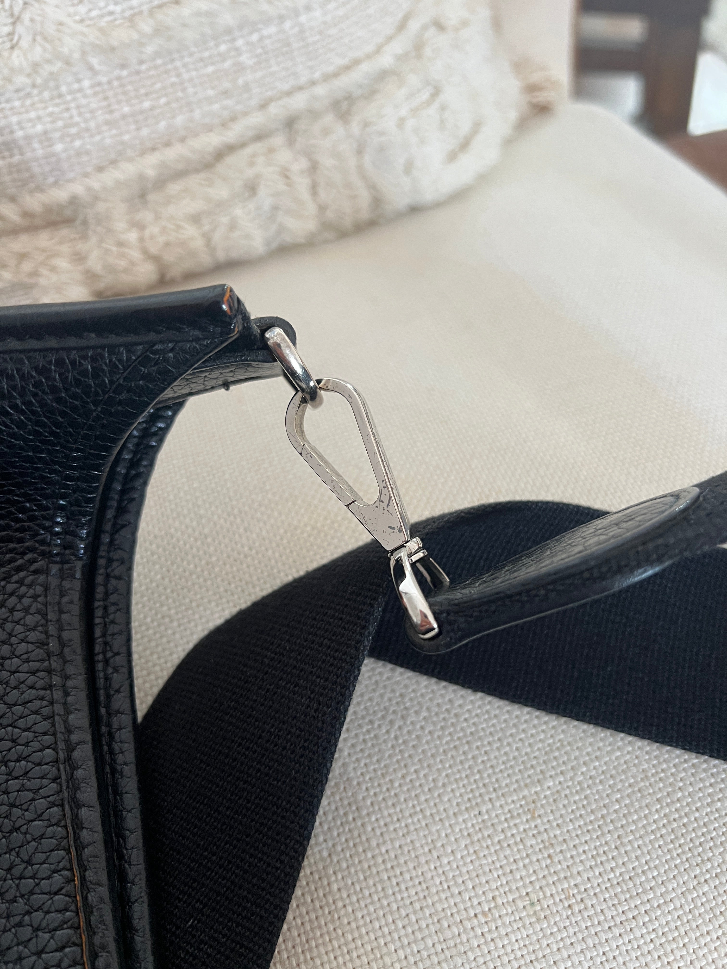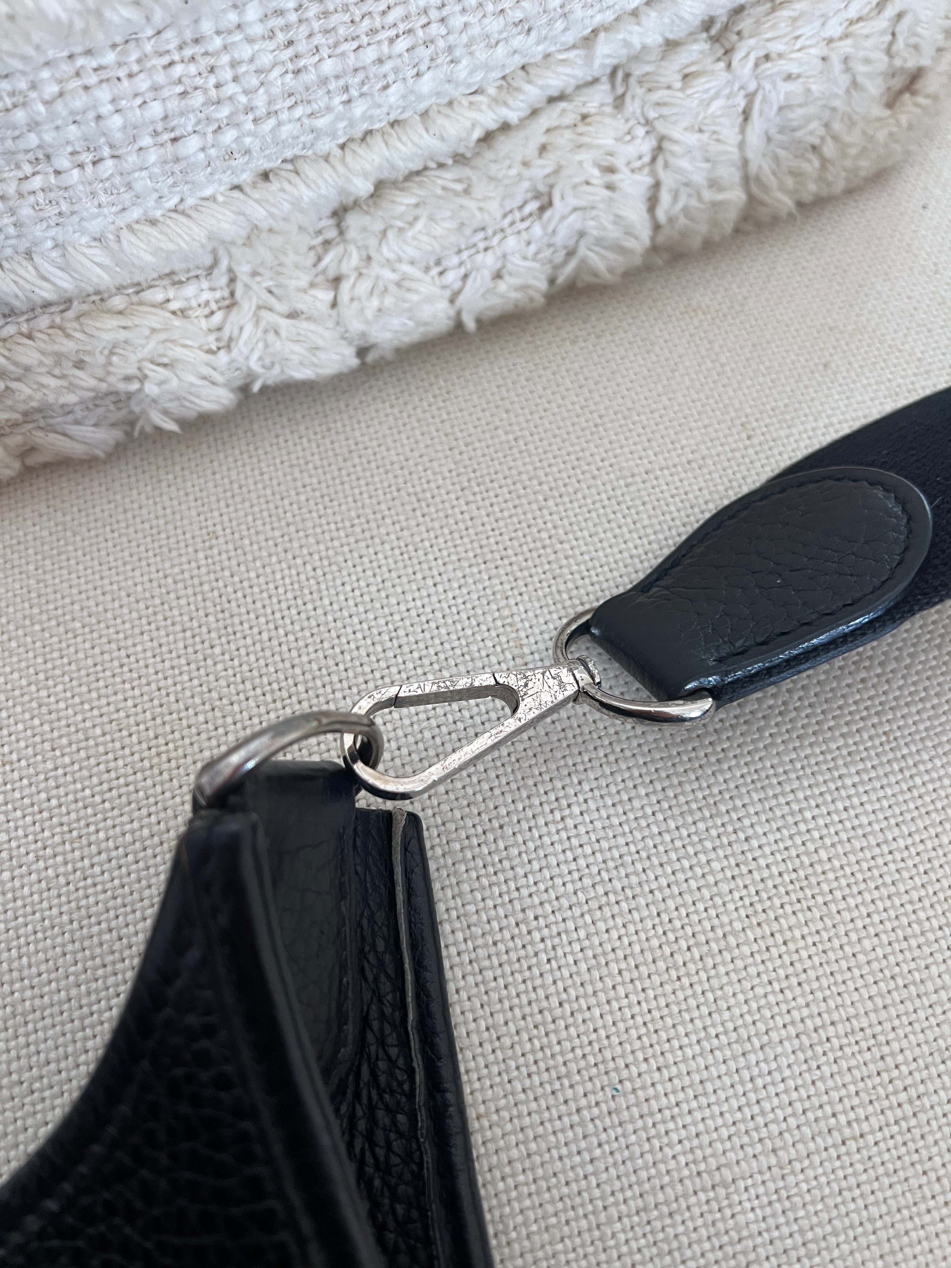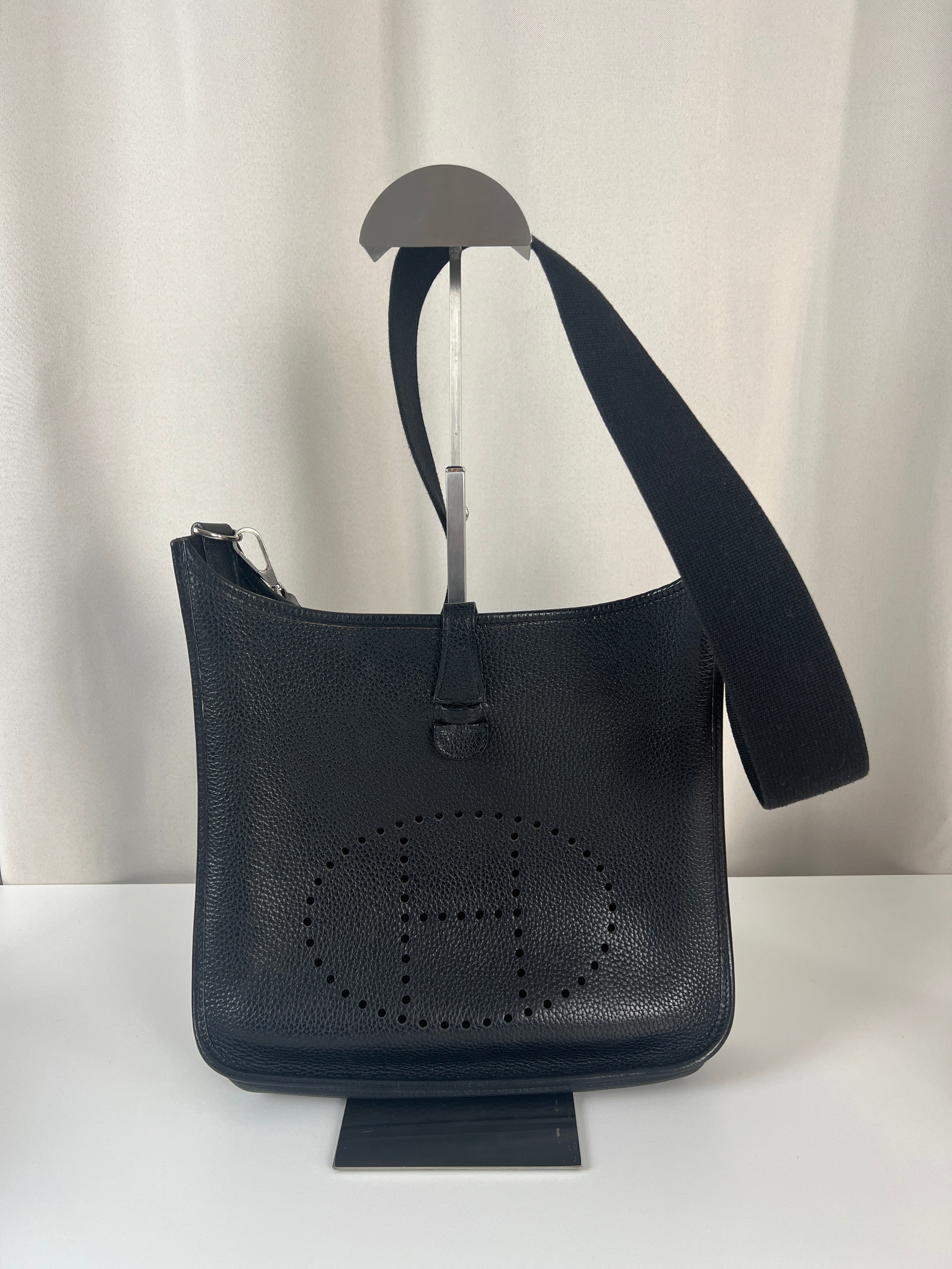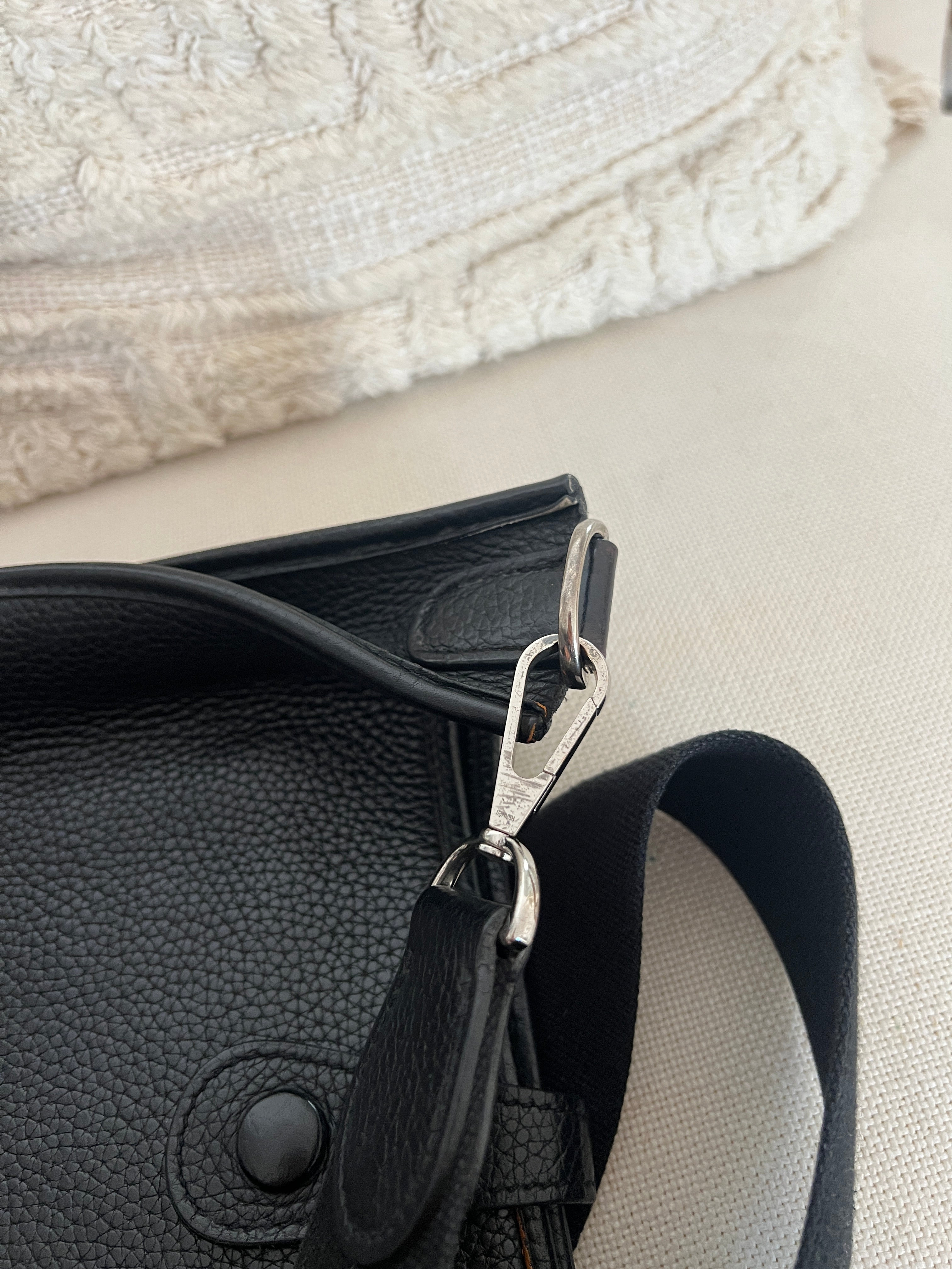 Cet Hermes Evelyn 29 est en bon état. Le cuir est en très bon état, quelques traces d'usure sont visibles. L'intérieur est en très bon état, seule la poche intérieure présente quelques traces d'usure. La bandoulière est en bon état. La bijouterie présente des signes d'usure, comme si les autocollants en plastique étaient là depuis longtemps, ça à laissé des traces.
