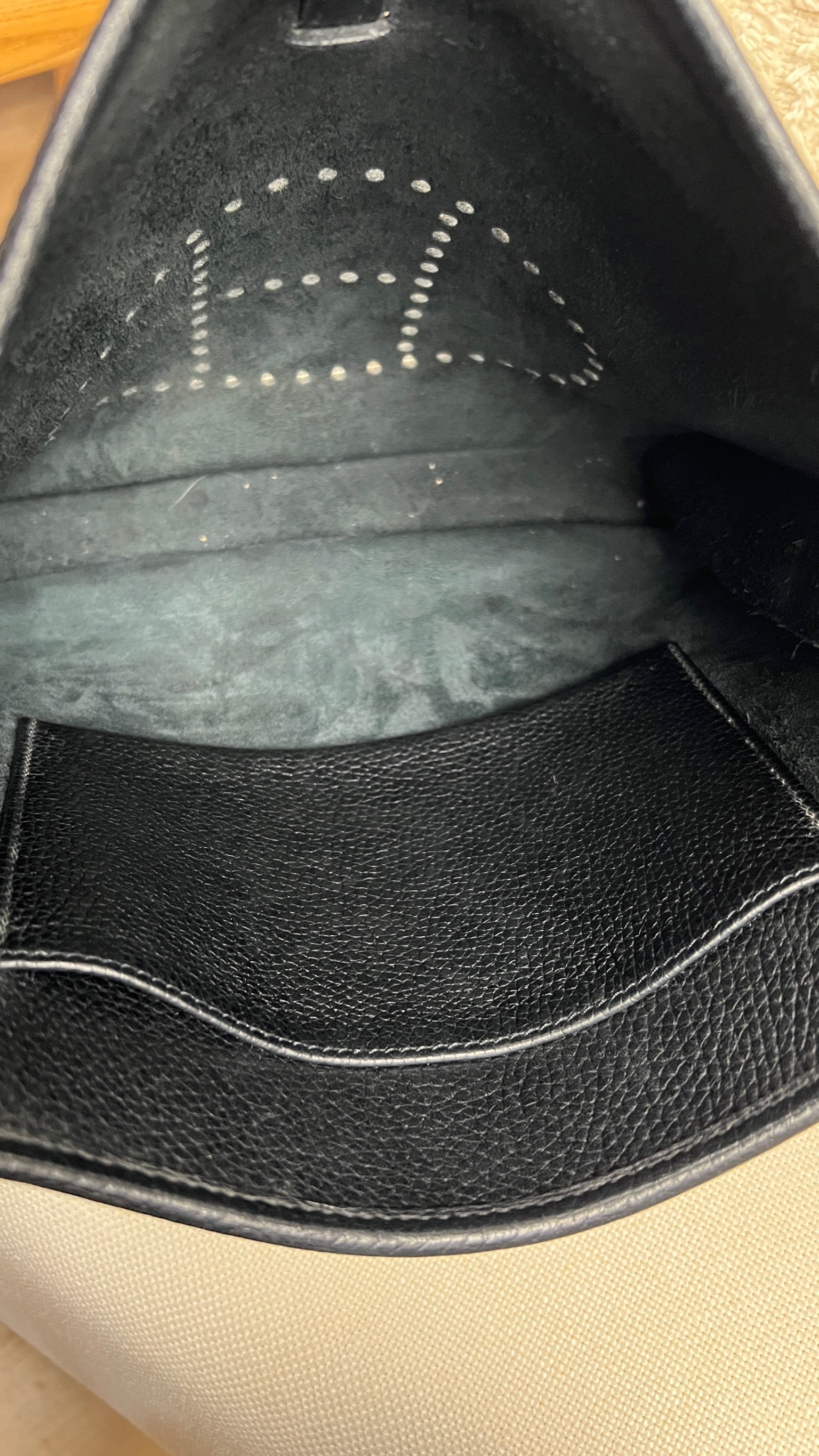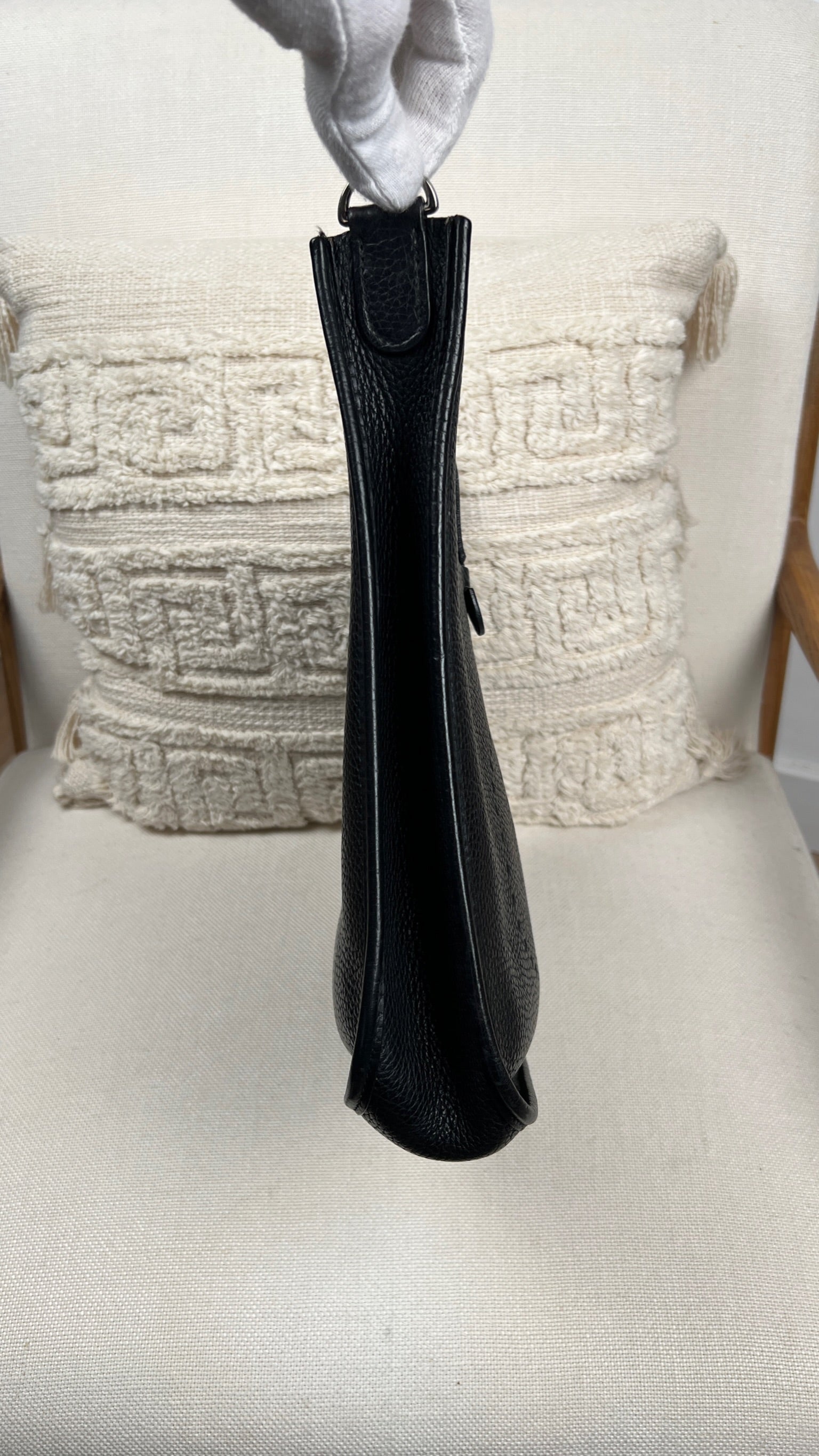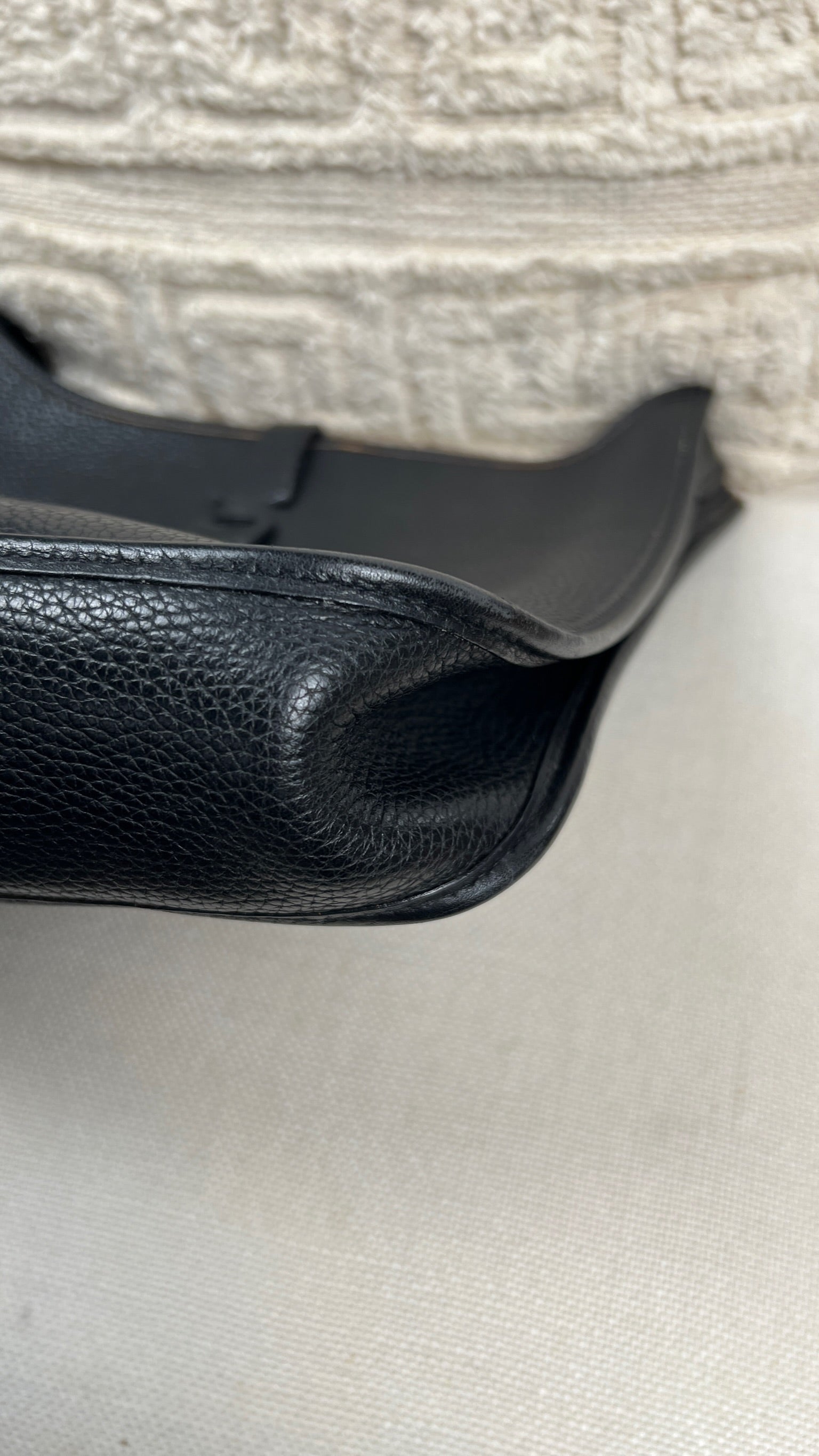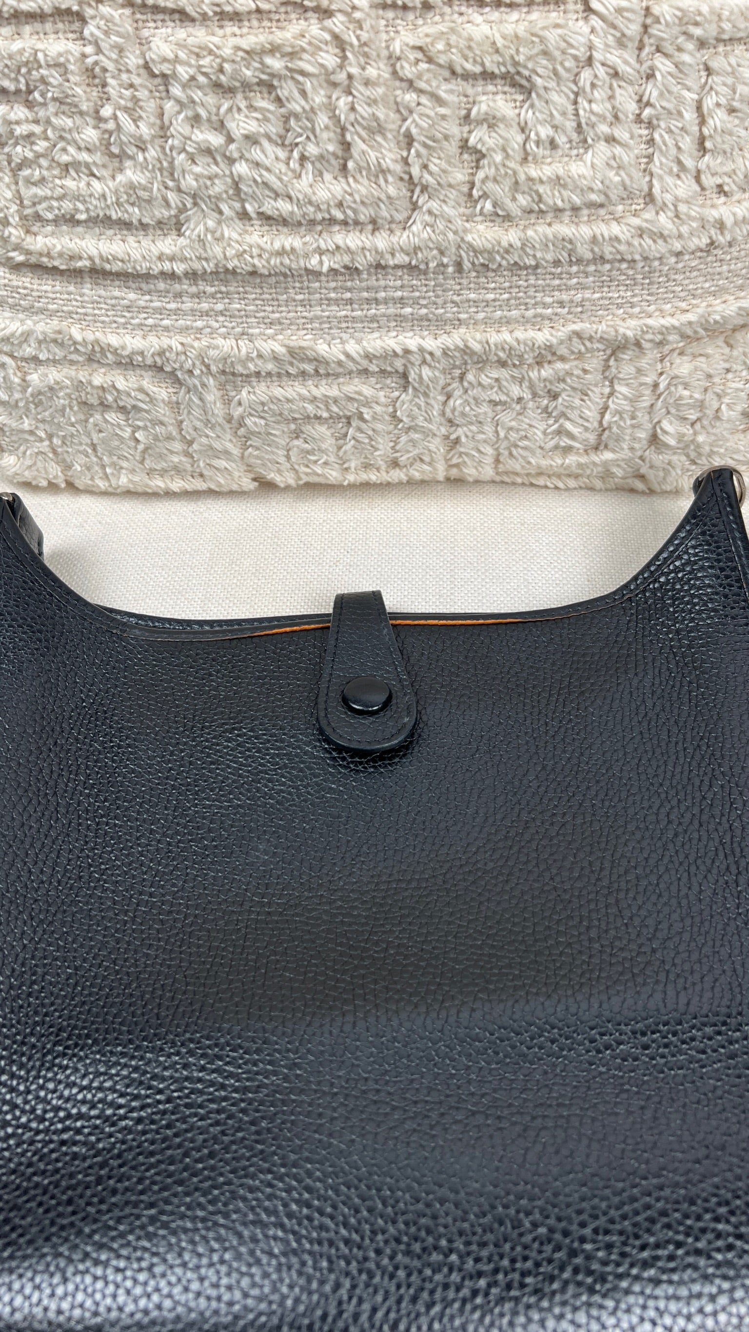 Cet Hermes Evelyn 29 est en bon état. Le cuir est en très bon état, quelques traces d'usure sont visibles. L'intérieur est en très bon état, seule la poche intérieure présente quelques traces d'usure. La bandoulière est en bon état. La bijouterie présente des signes d'usure, comme si les autocollants en plastique étaient là depuis longtemps, ça à laissé des traces.