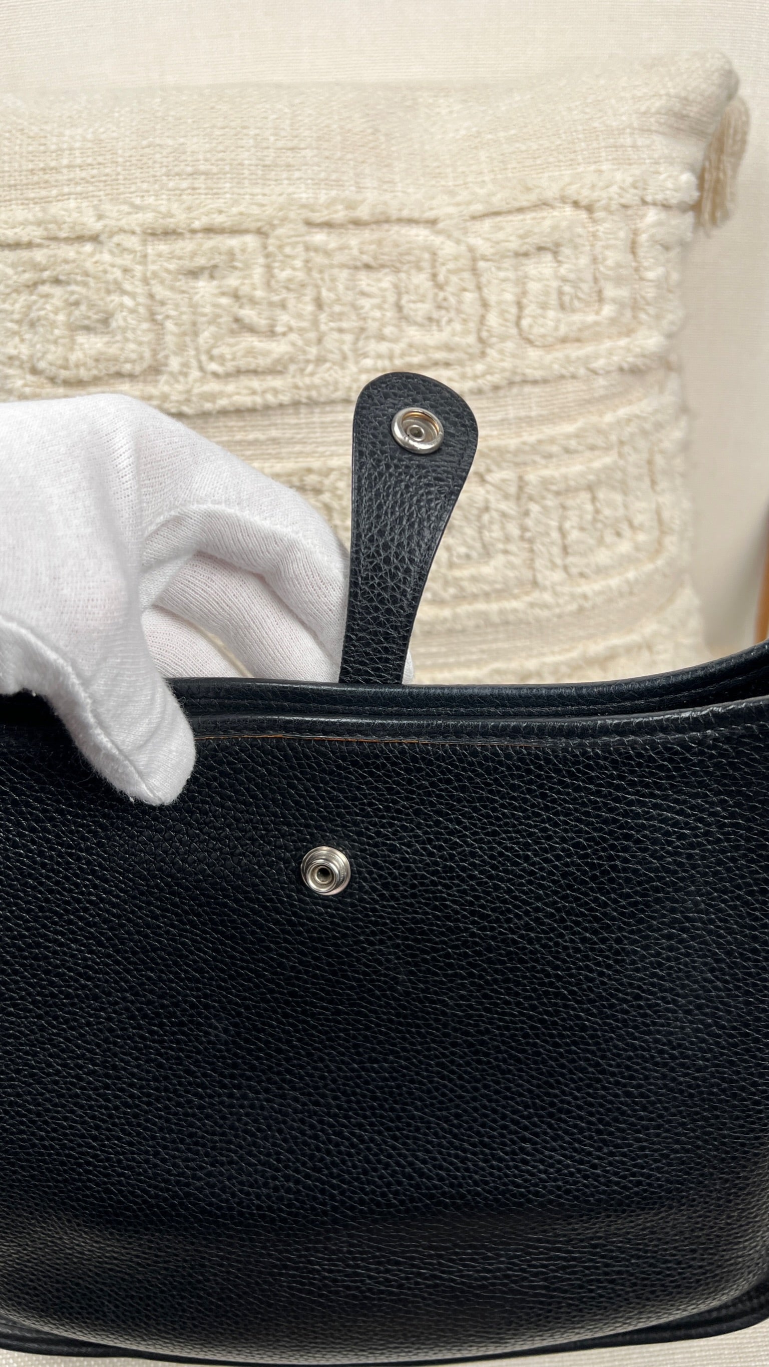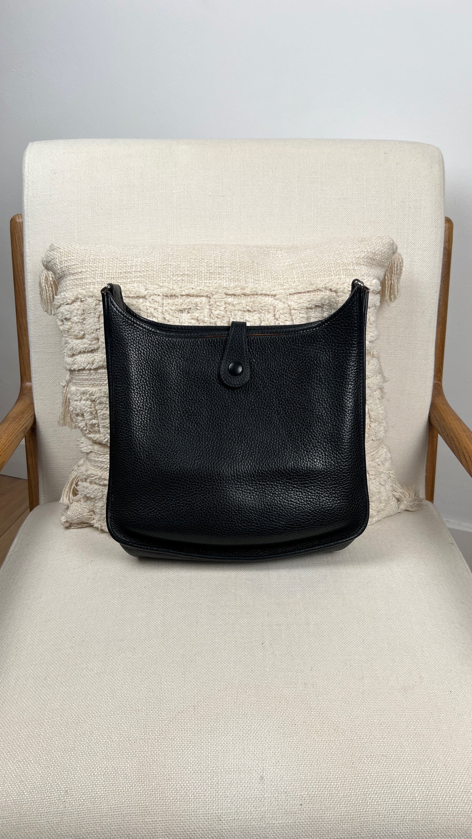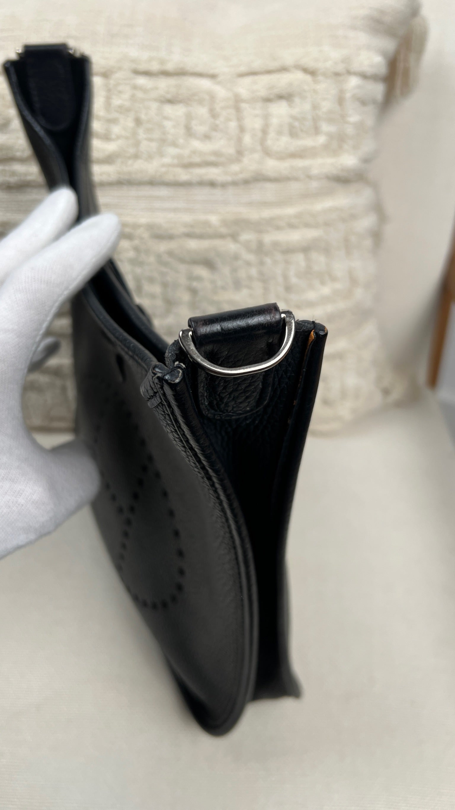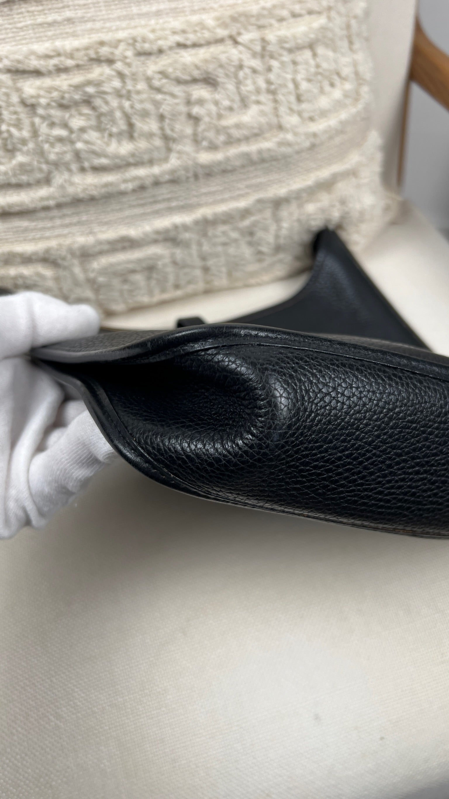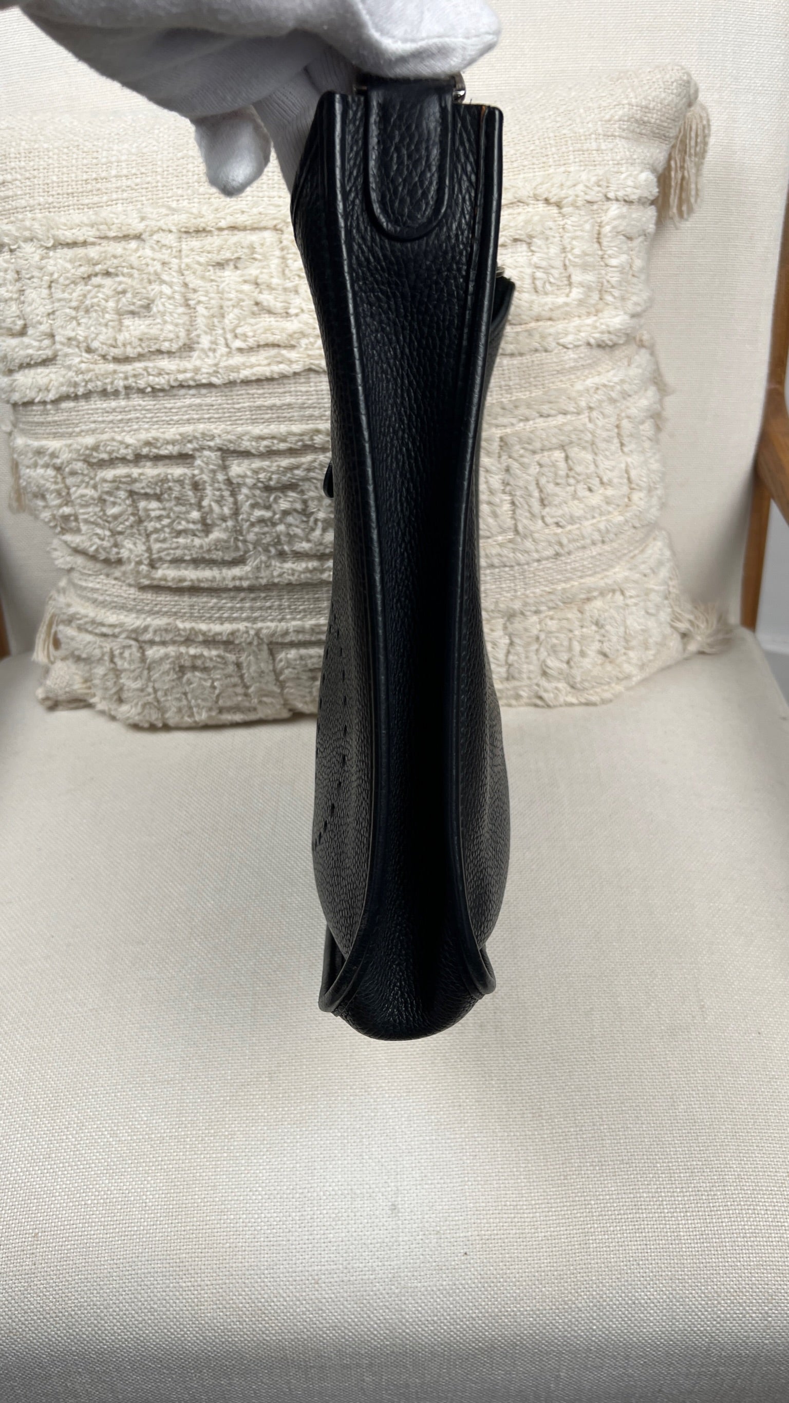 Cet Hermes Evelyn 29 est en bon état. Le cuir est en très bon état, quelques traces d'usure sont visibles. L'intérieur est en très bon état, seule la poche intérieure présente quelques traces d'usure. La bandoulière est en bon état. La bijouterie présente des signes d'usure, comme si les autocollants en plastique étaient là depuis longtemps, ça à laissé des traces.