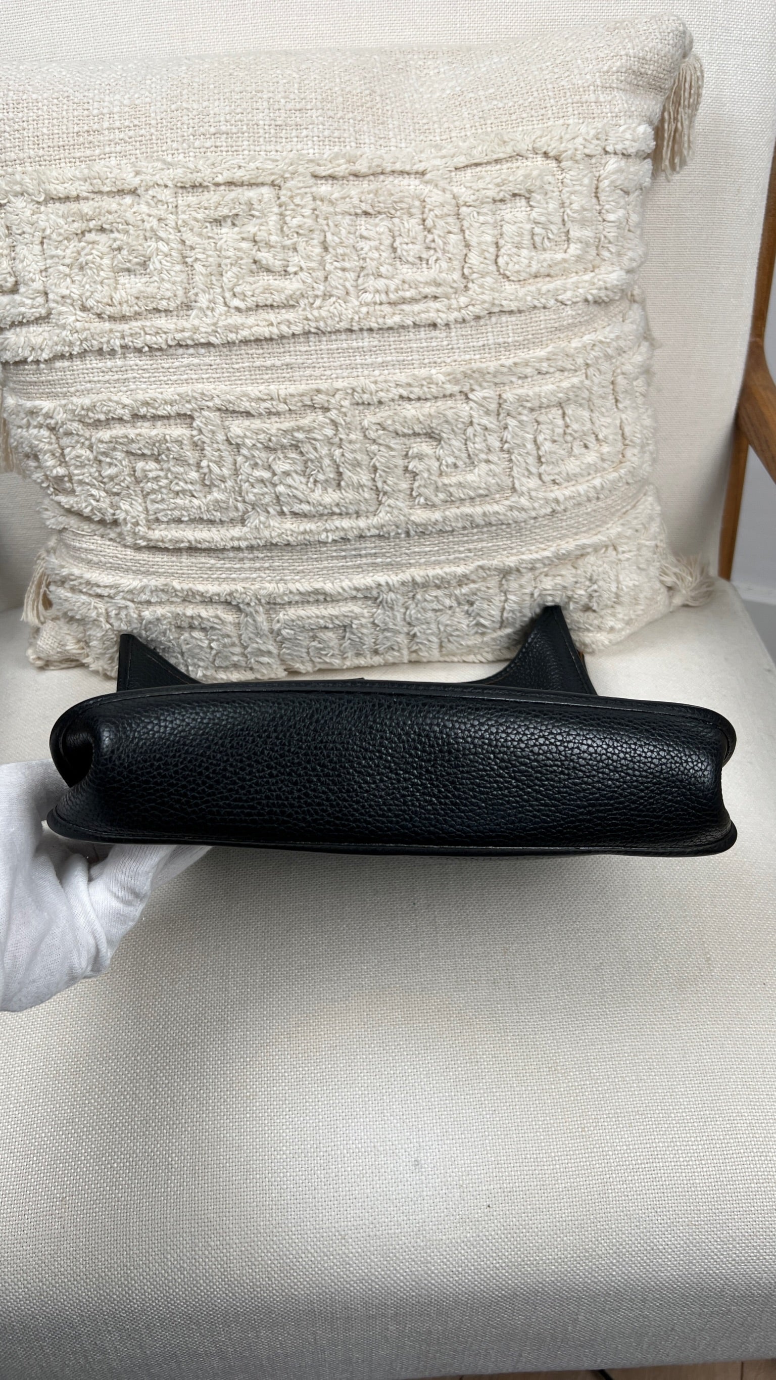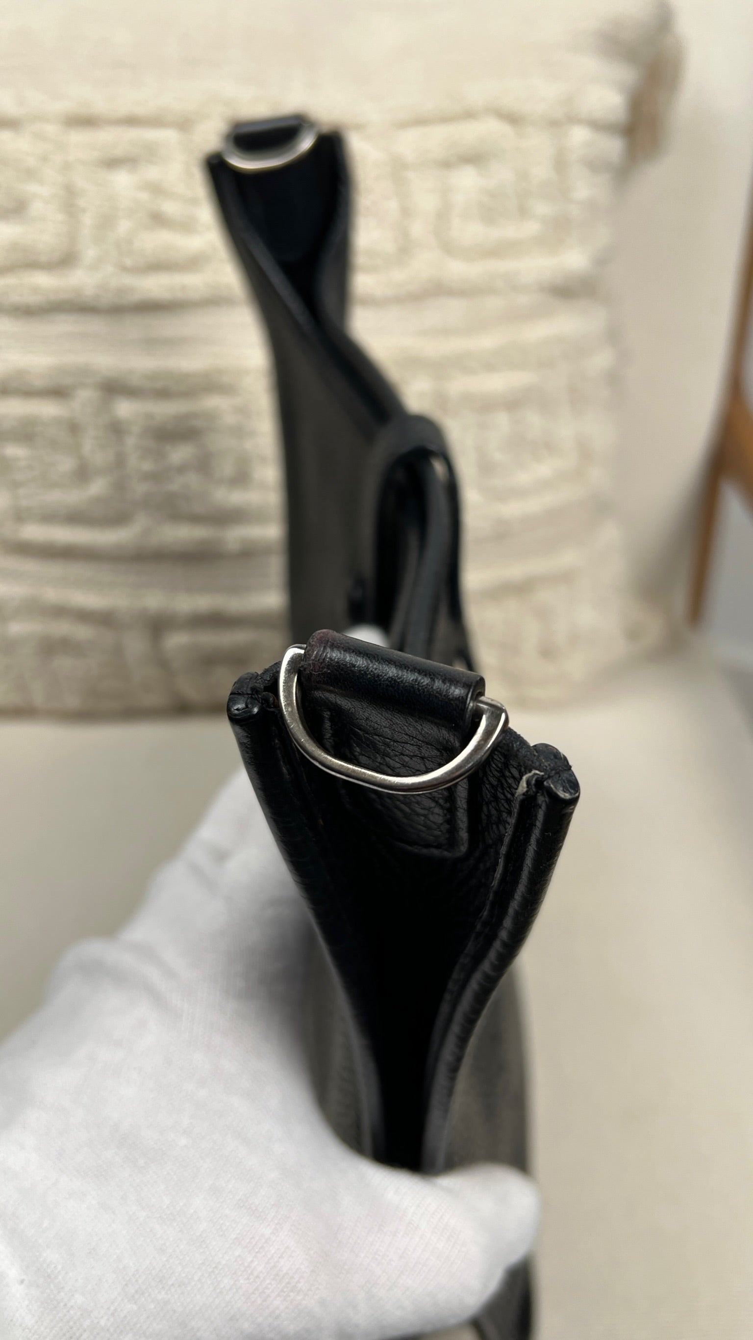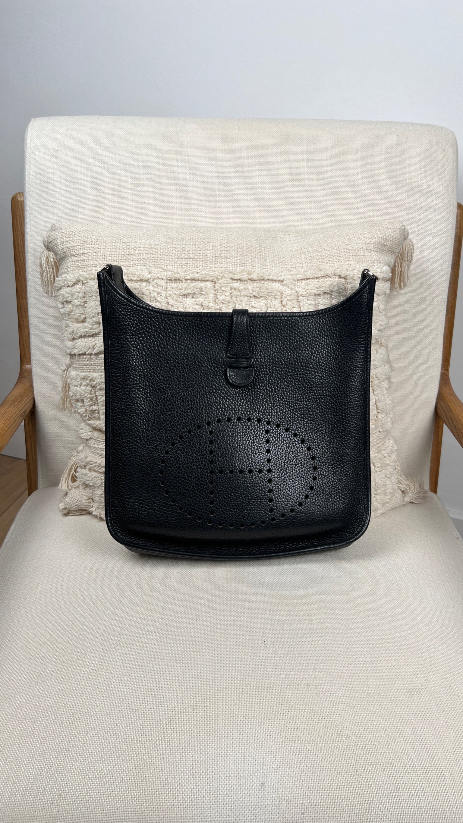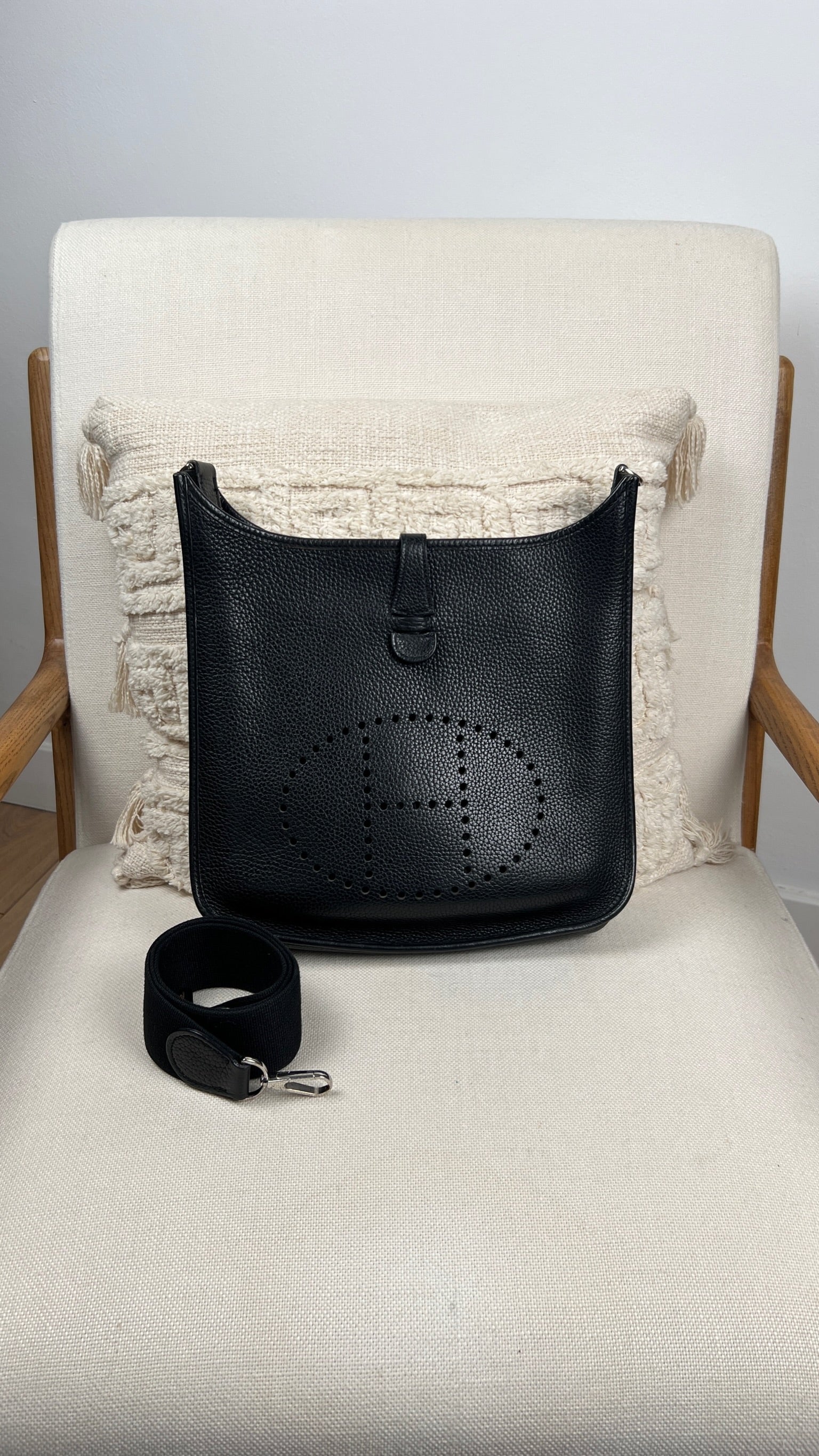 Cet Hermes Evelyn 29 est en bon état. Le cuir est en très bon état, quelques traces d'usure sont visibles. L'intérieur est en très bon état, seule la poche intérieure présente quelques traces d'usure. La bandoulière est en bon état. La bijouterie présente des signes d'usure, comme si les autocollants en plastique étaient là depuis longtemps, ça à laissé des traces.