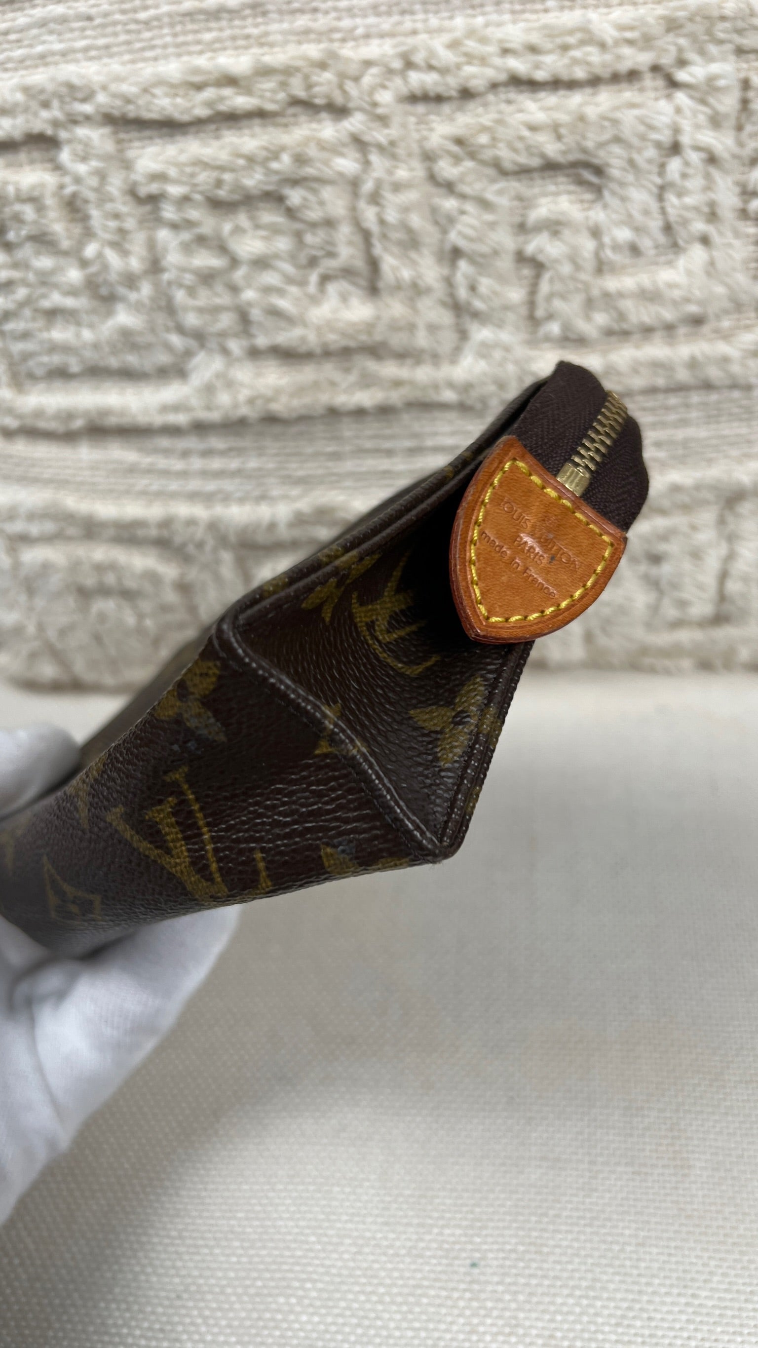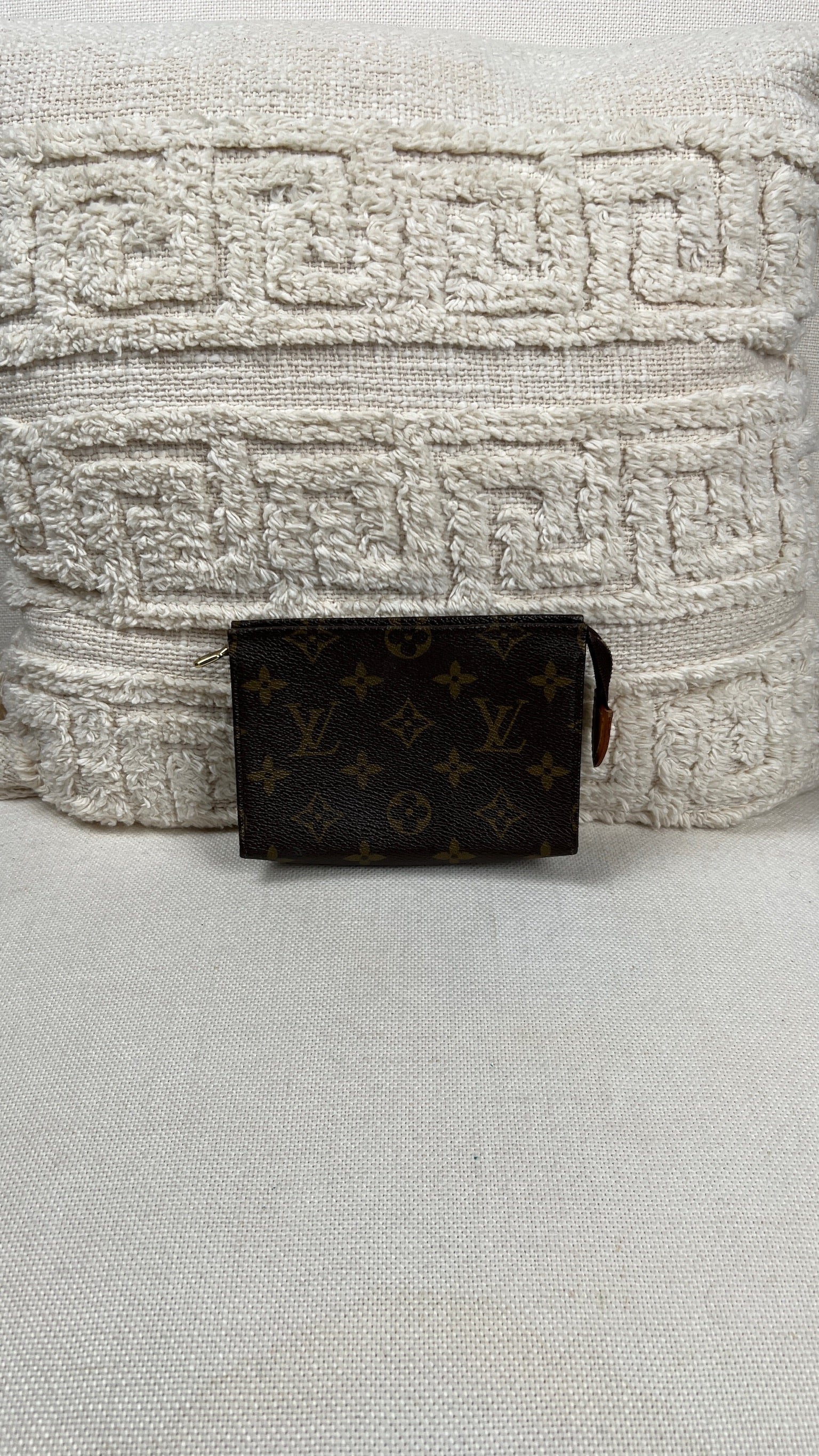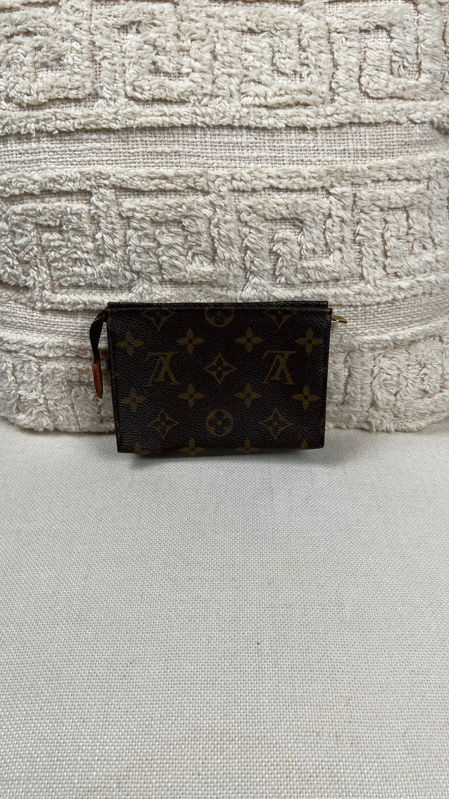 Cette petite trousse de toilette Louis Vuitton 15 est en très bon état. La toile est en bon état seul le bas présente quelques traces d'usure. L'intérieur est en bon état avec juste quelques petites taches. La fermeture éclair fonctionne bien.