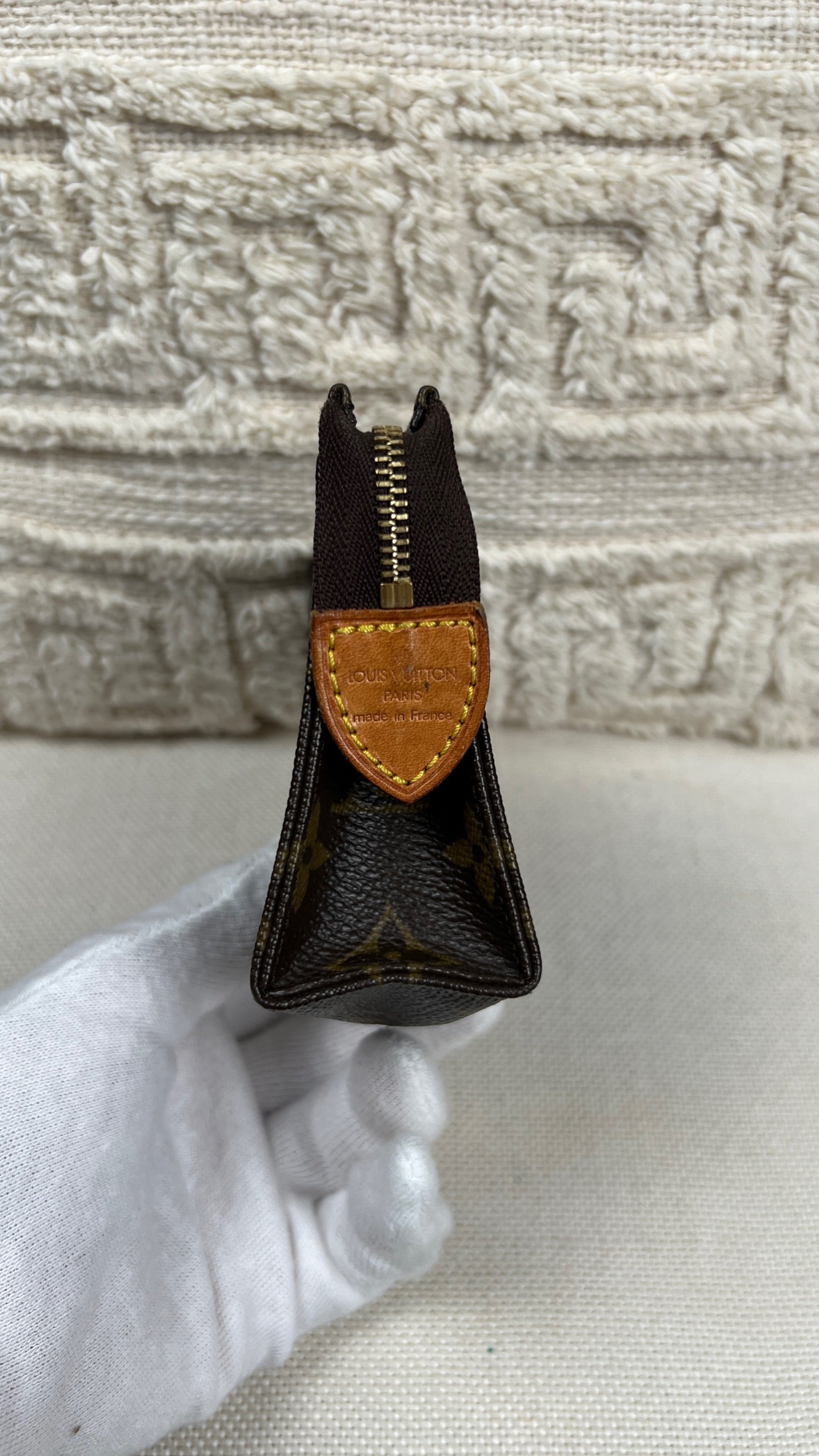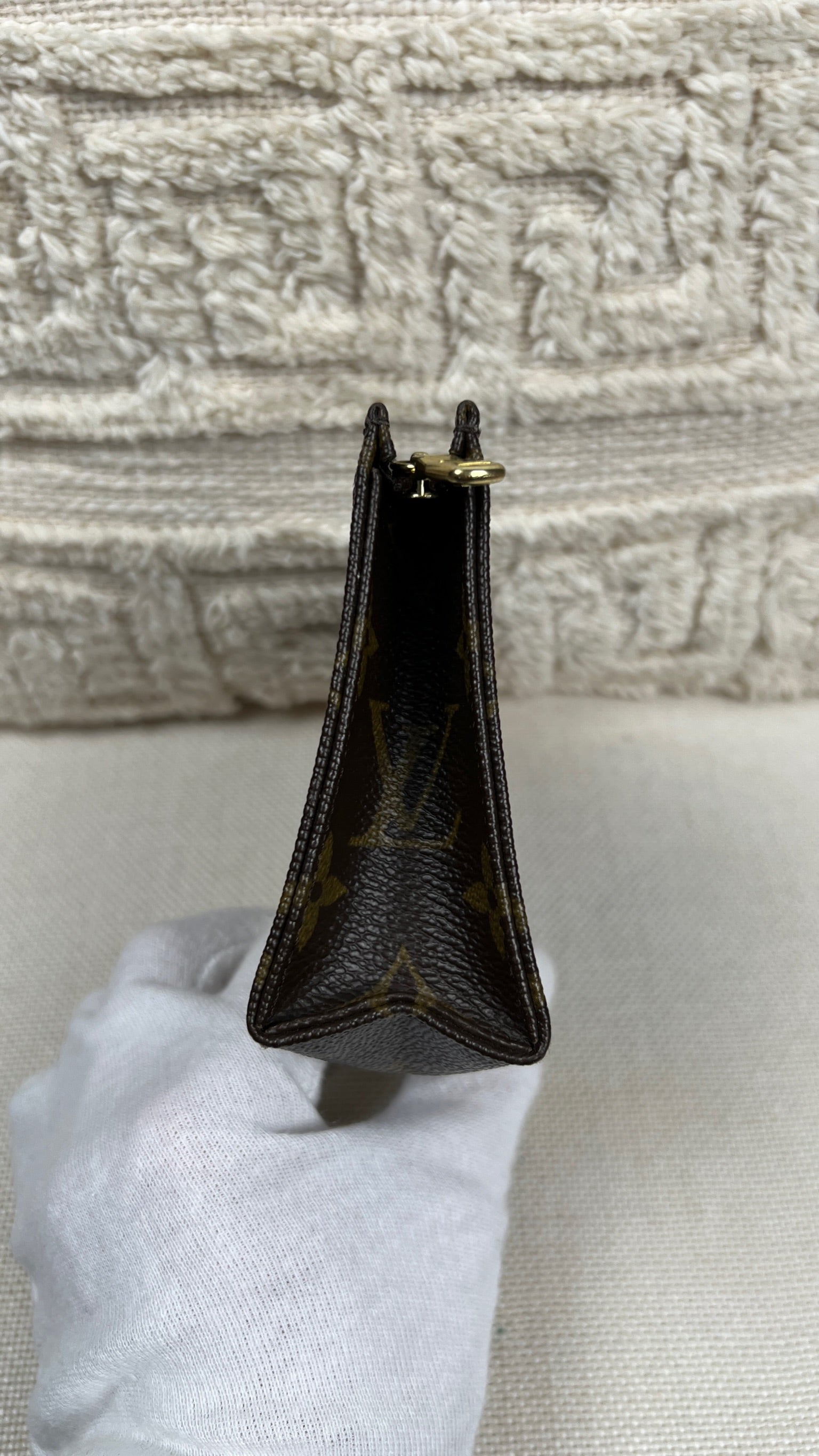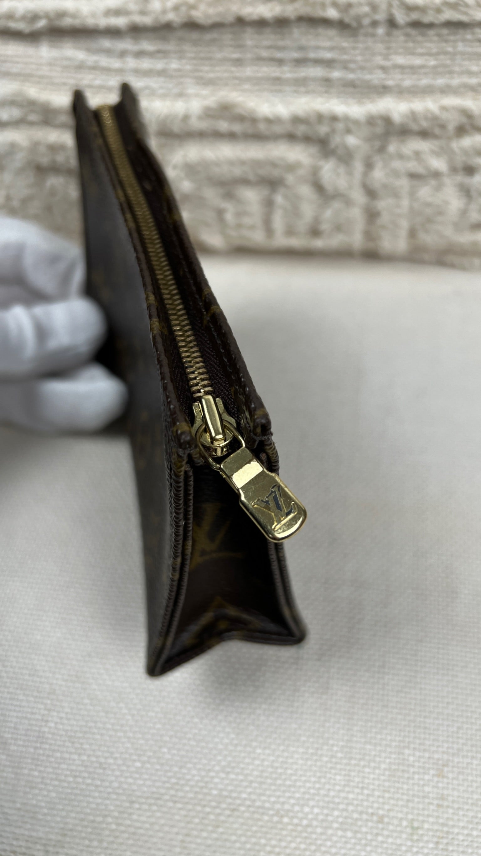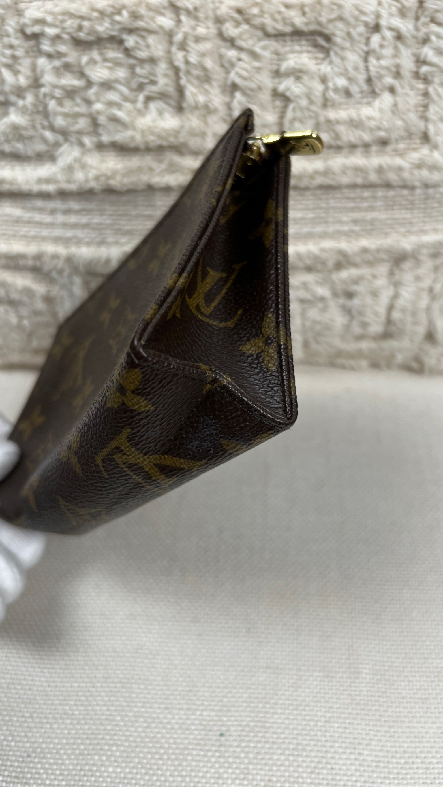 Cette petite trousse de toilette Louis Vuitton 15 est en très bon état. La toile est en bon état seul le bas présente quelques traces d'usure. L'intérieur est en bon état avec juste quelques petites taches. La fermeture éclair fonctionne bien.