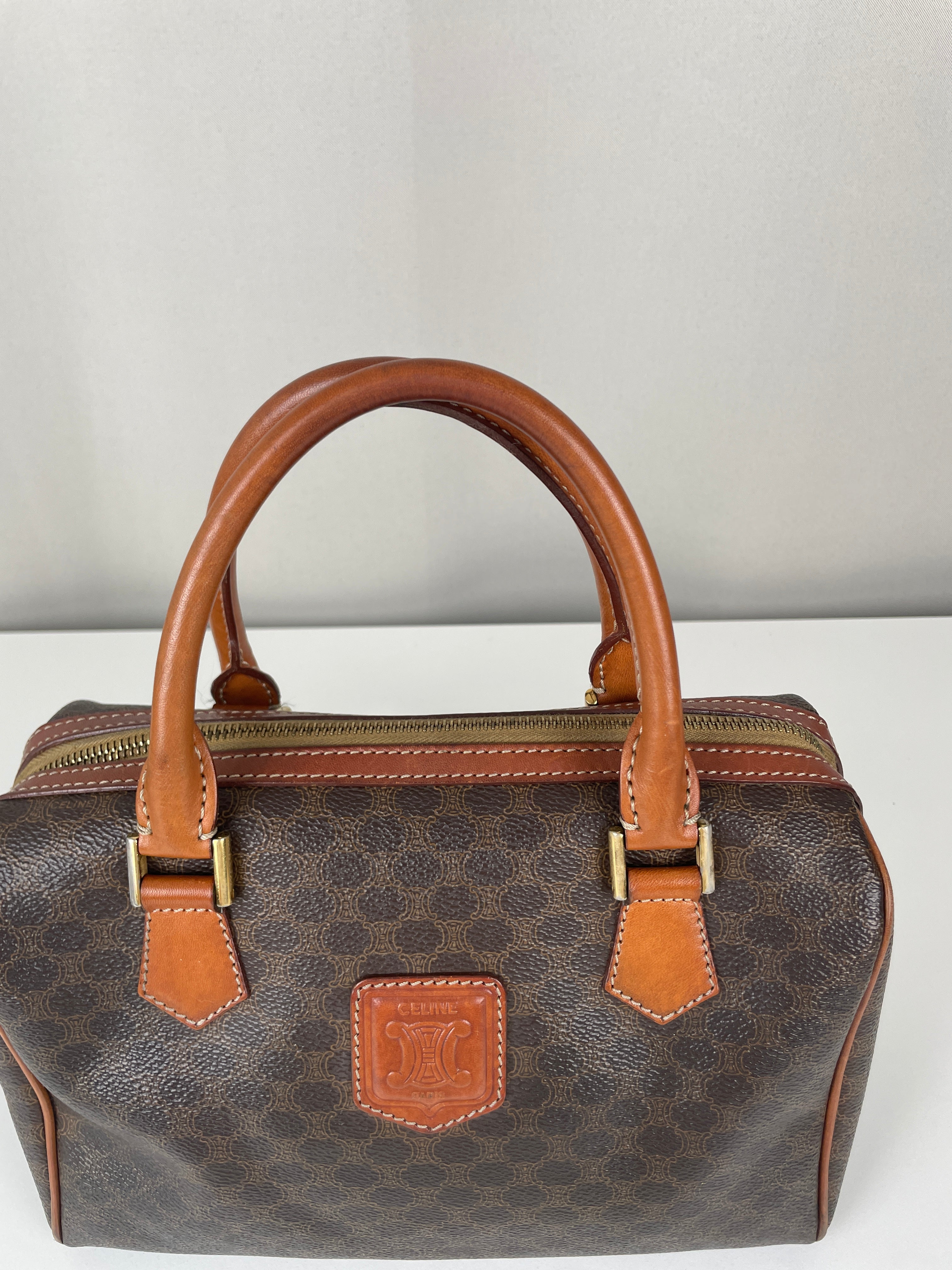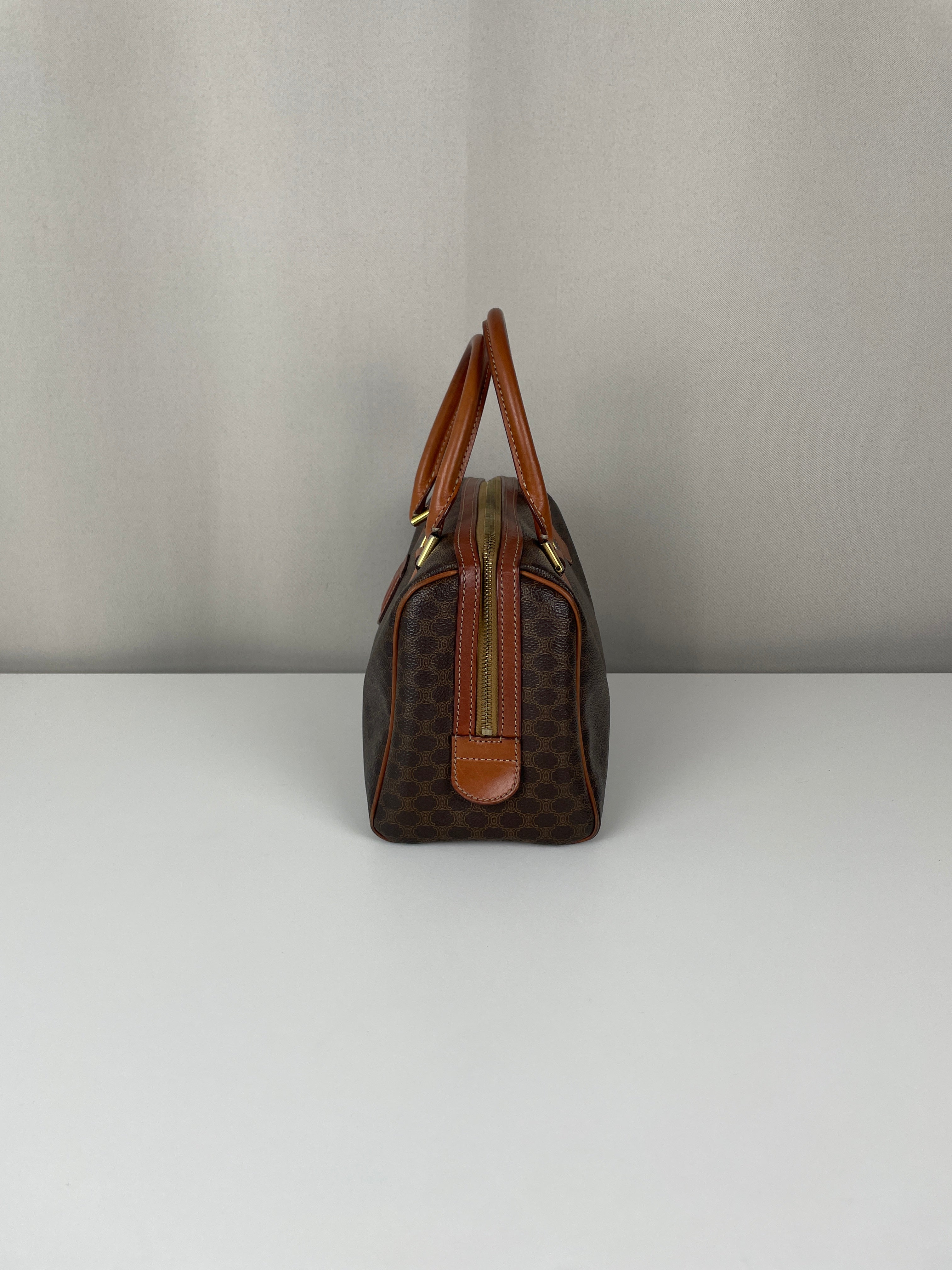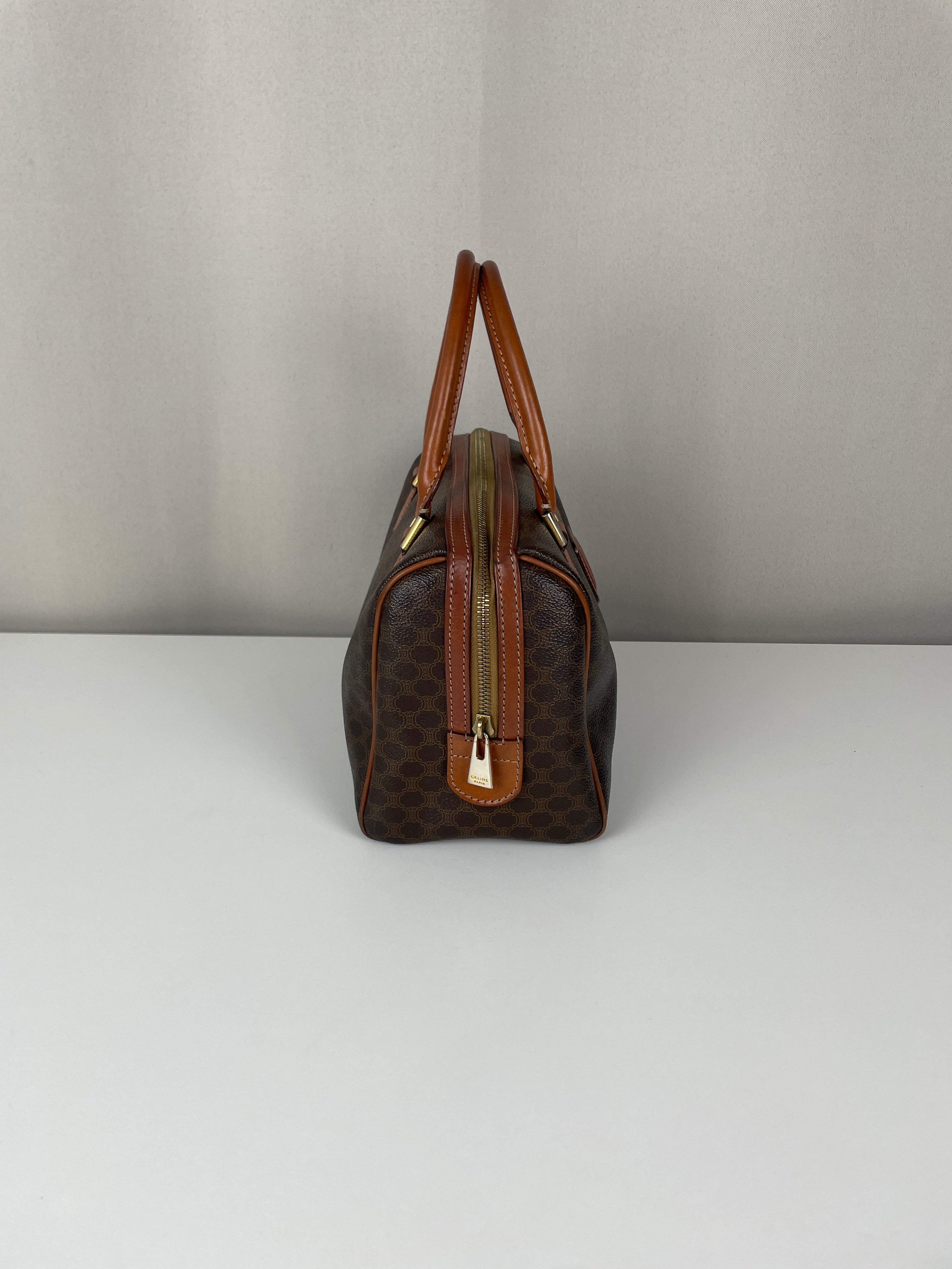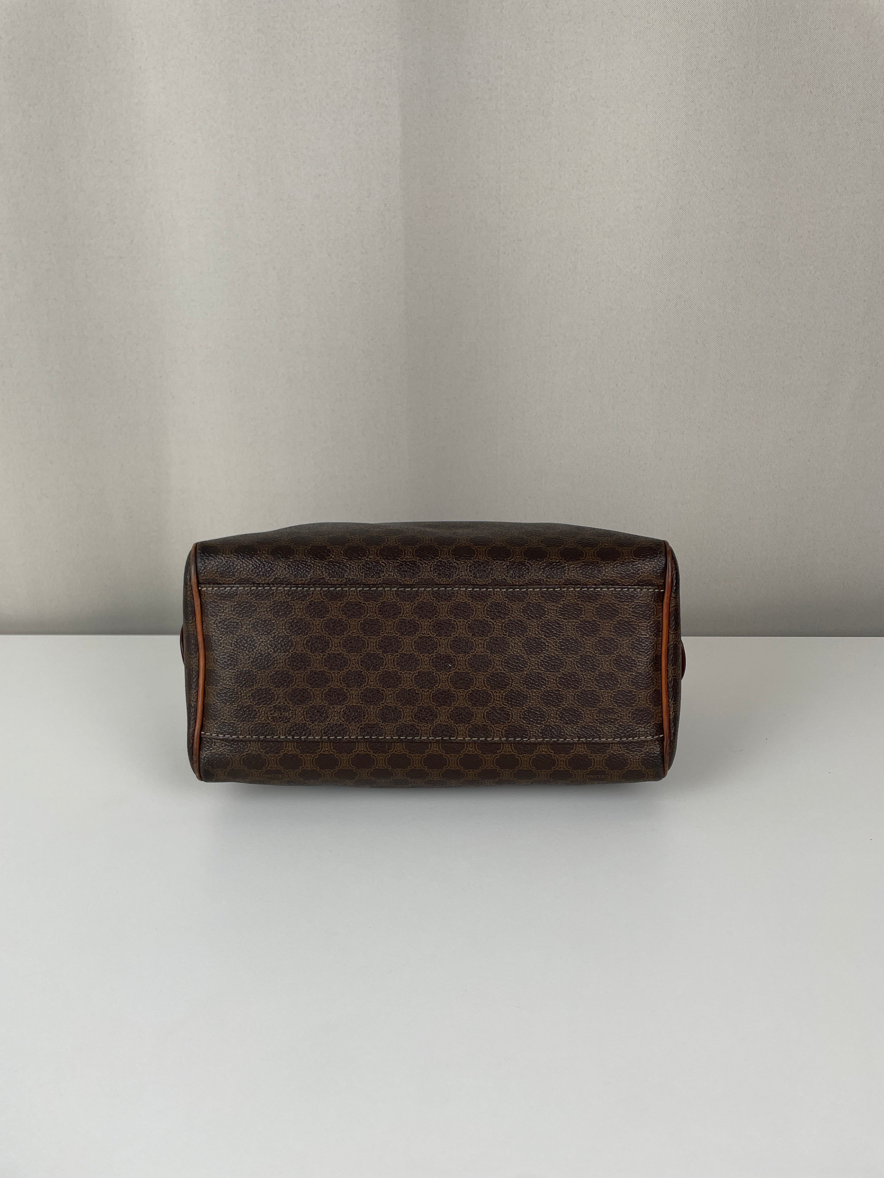 Le Mini Boston est l'un des modèles les plus pratiques et sophistiqués de Celine. Cette édition en toile marron illustre l'expertise de la maison en matière de matériaux mixtes et de luxe fonctionnel. Une pièce polyvalente qui incarne l'élégance discrète de Celine et représente le mélange parfait de sophistication décontractée avec un caractère authentique acquis par un usage délicat.