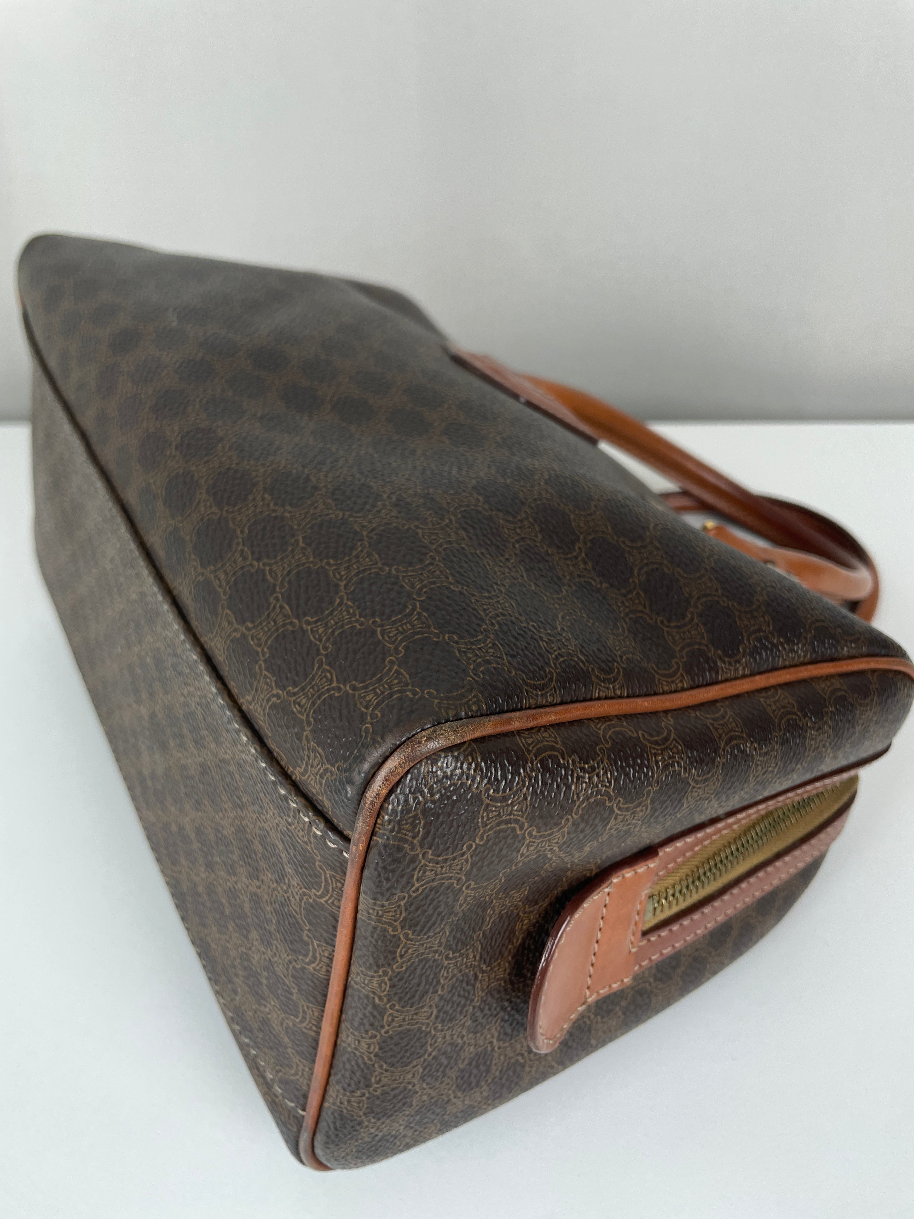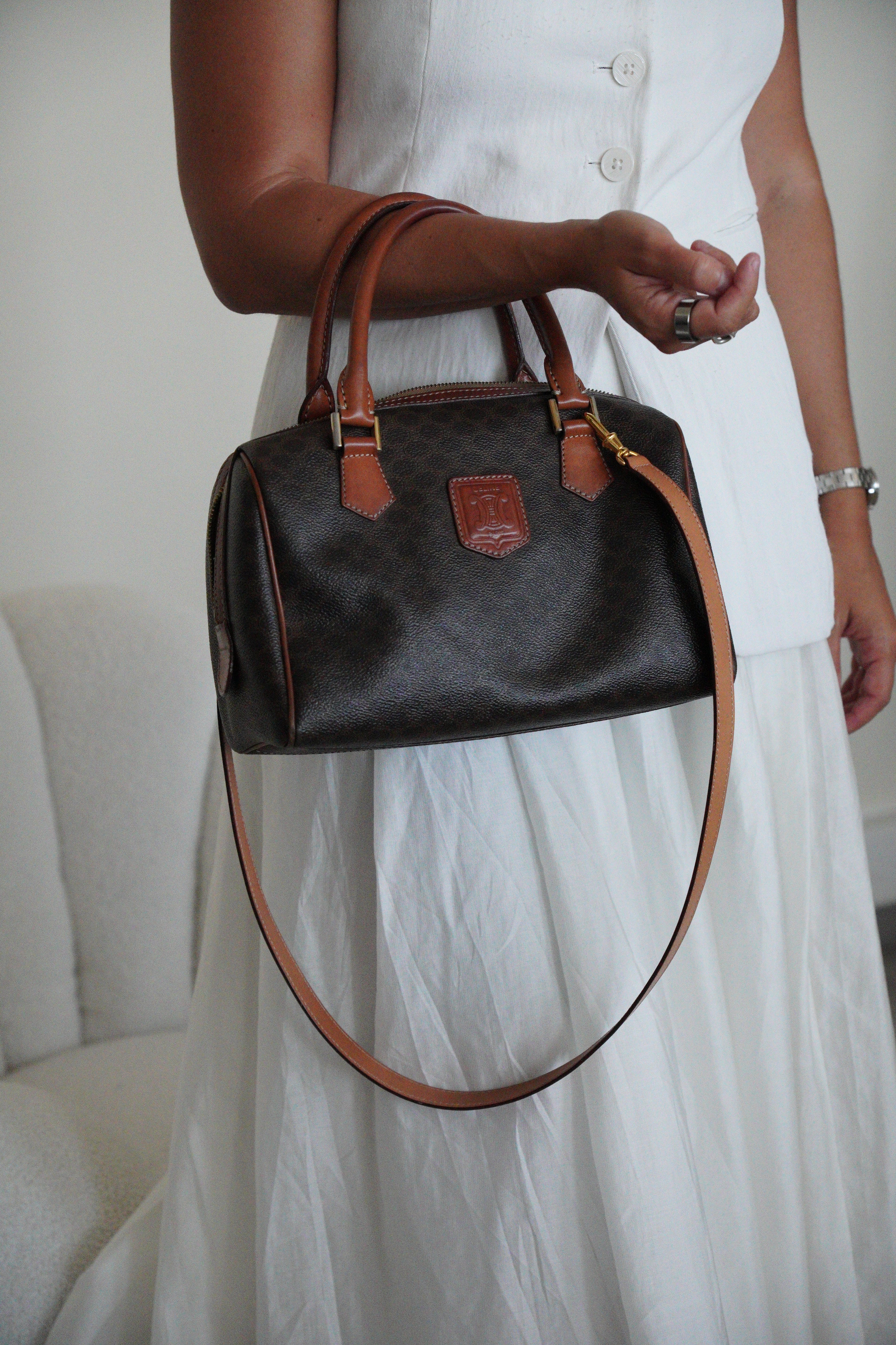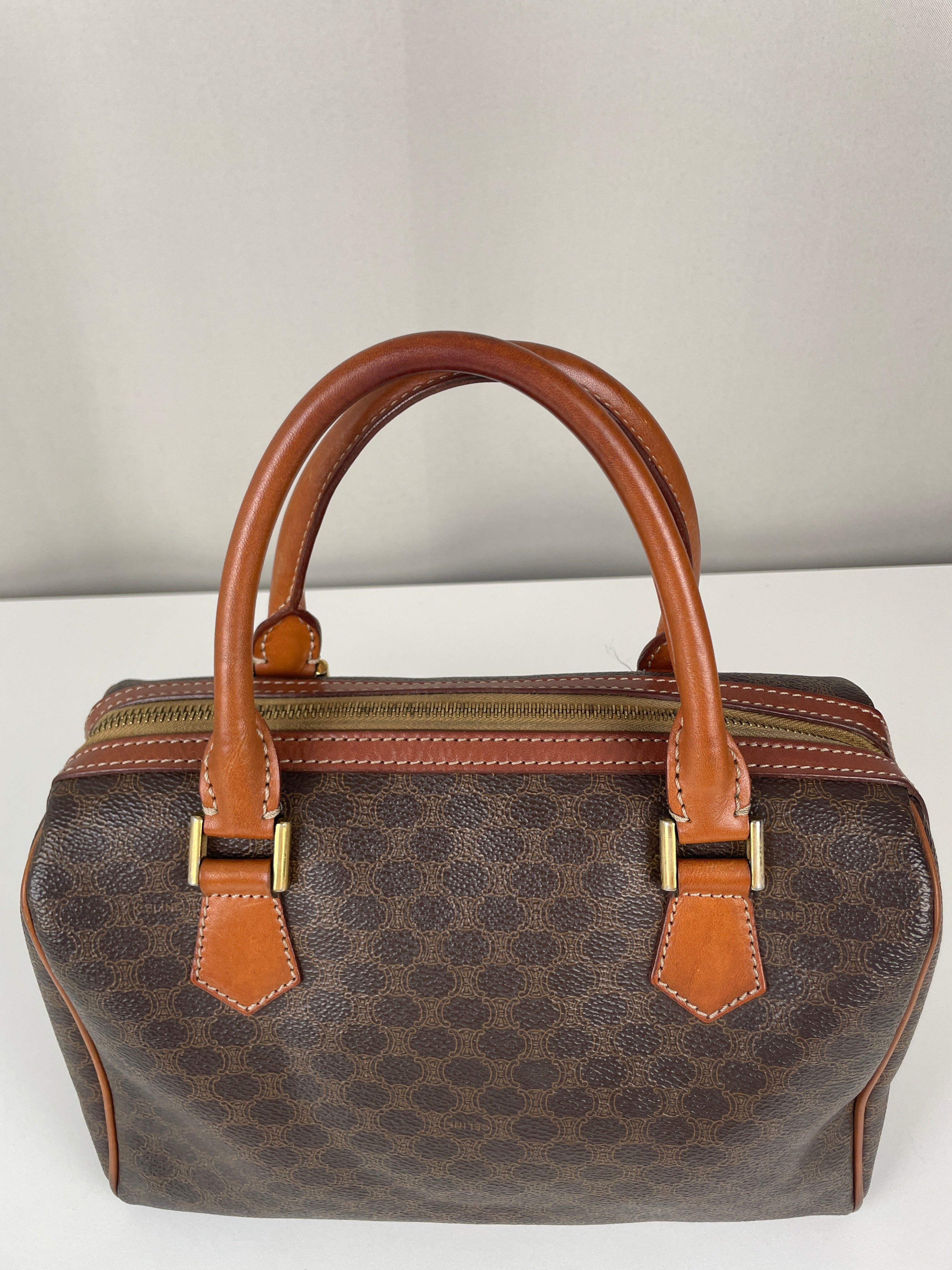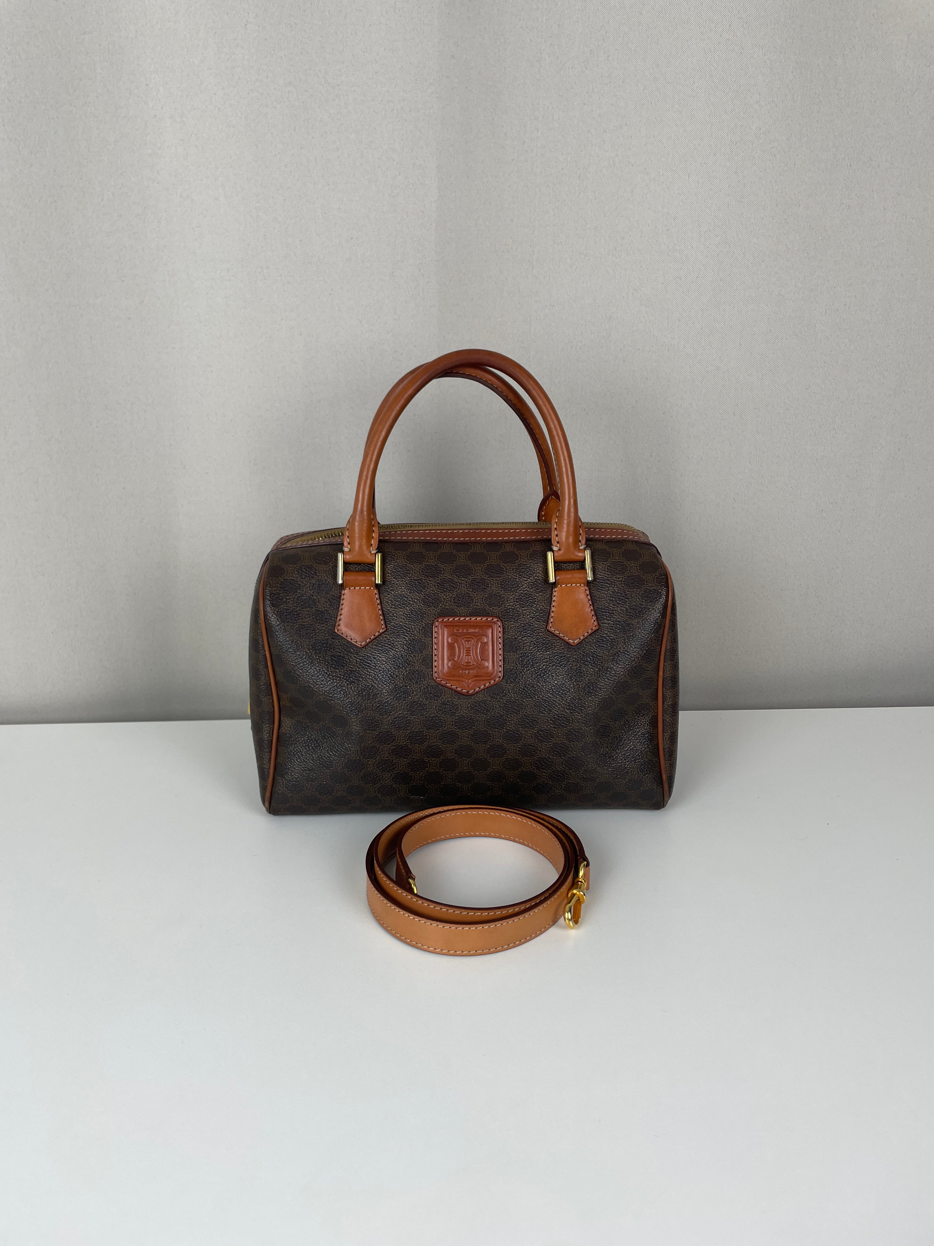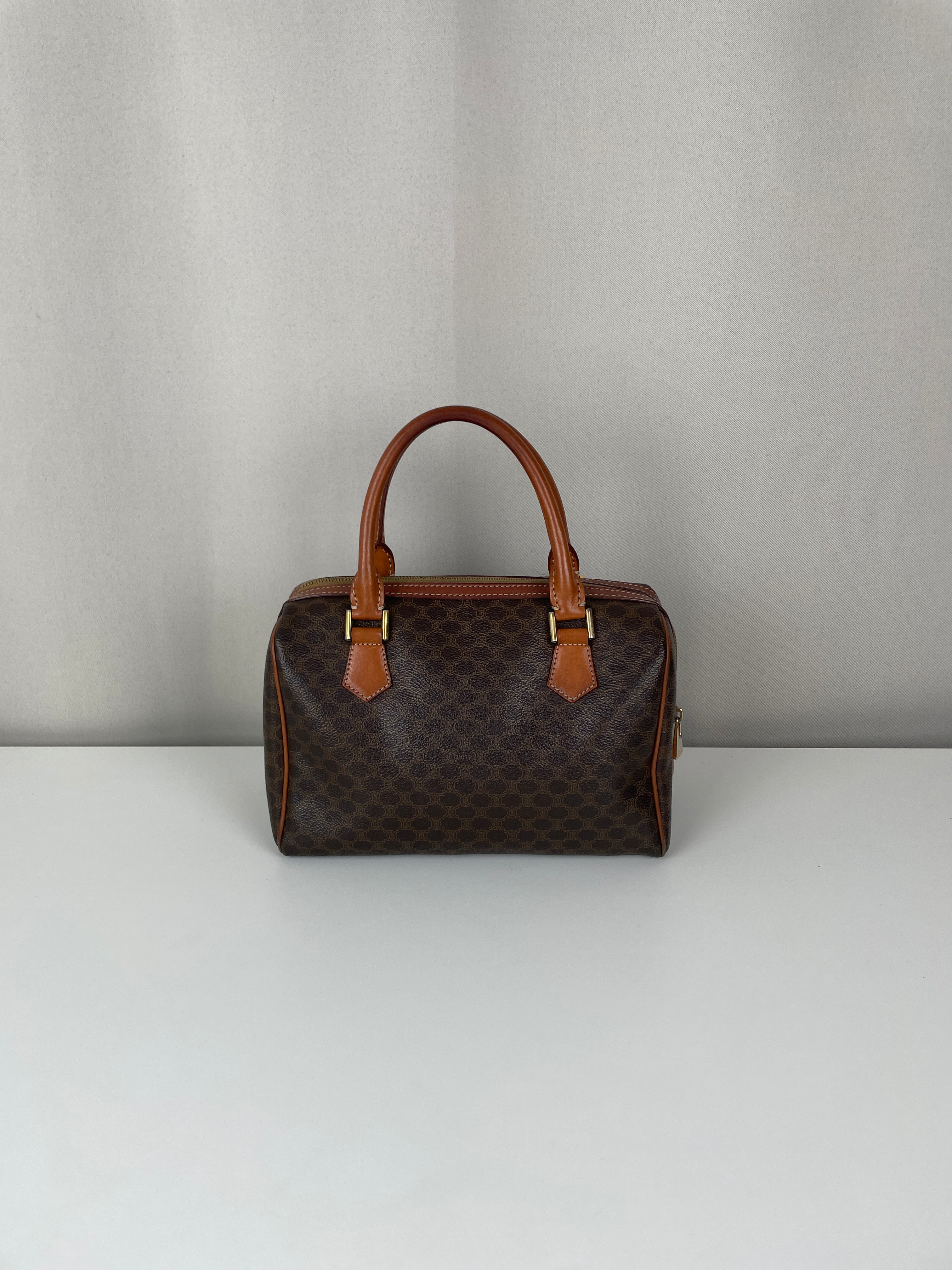 Le Mini Boston est l'un des modèles les plus pratiques et sophistiqués de Celine. Cette édition en toile marron illustre l'expertise de la maison en matière de matériaux mixtes et de luxe fonctionnel. Une pièce polyvalente qui incarne l'élégance discrète de Celine et représente le mélange parfait de sophistication décontractée avec un caractère authentique acquis par un usage délicat.