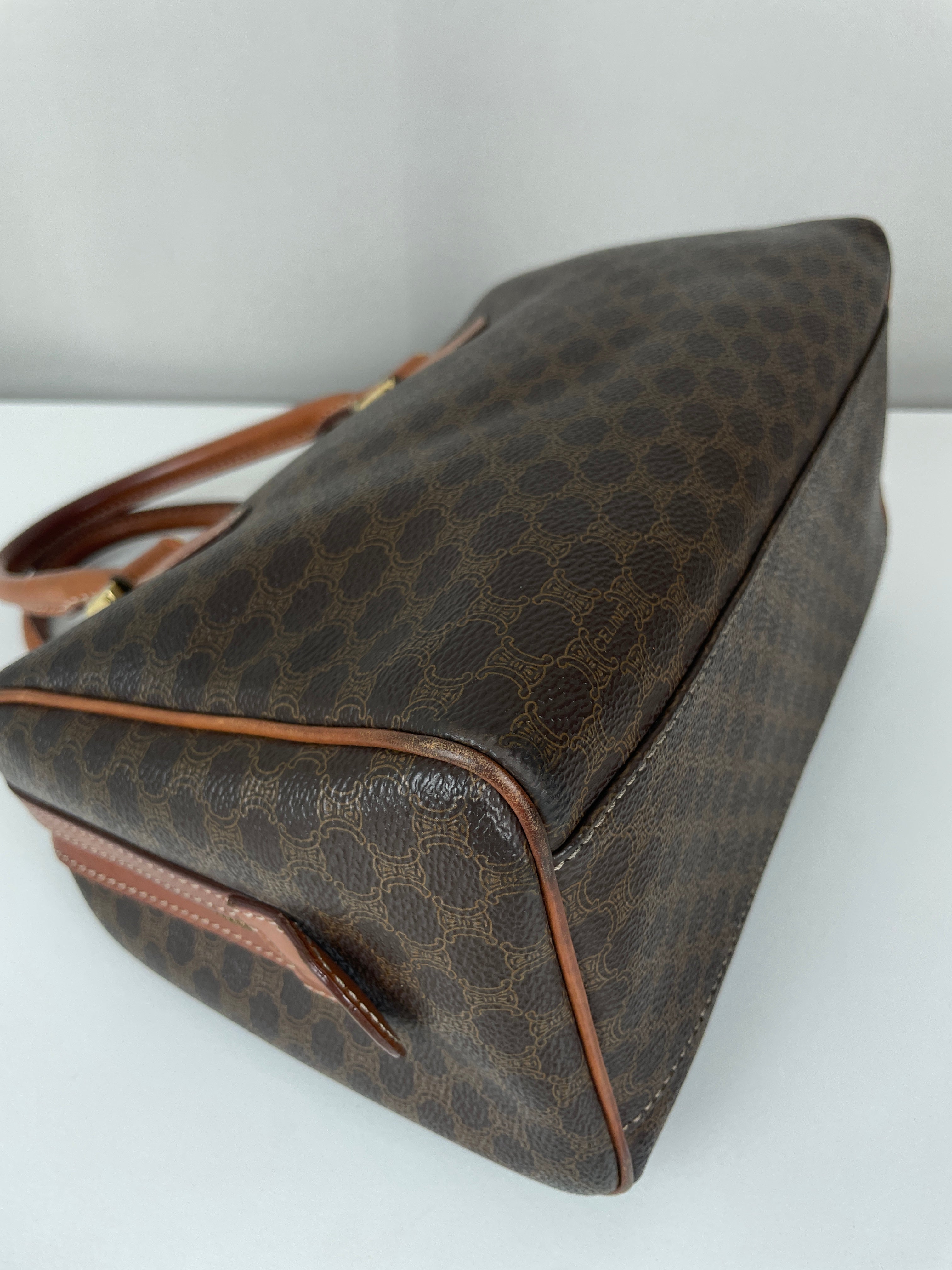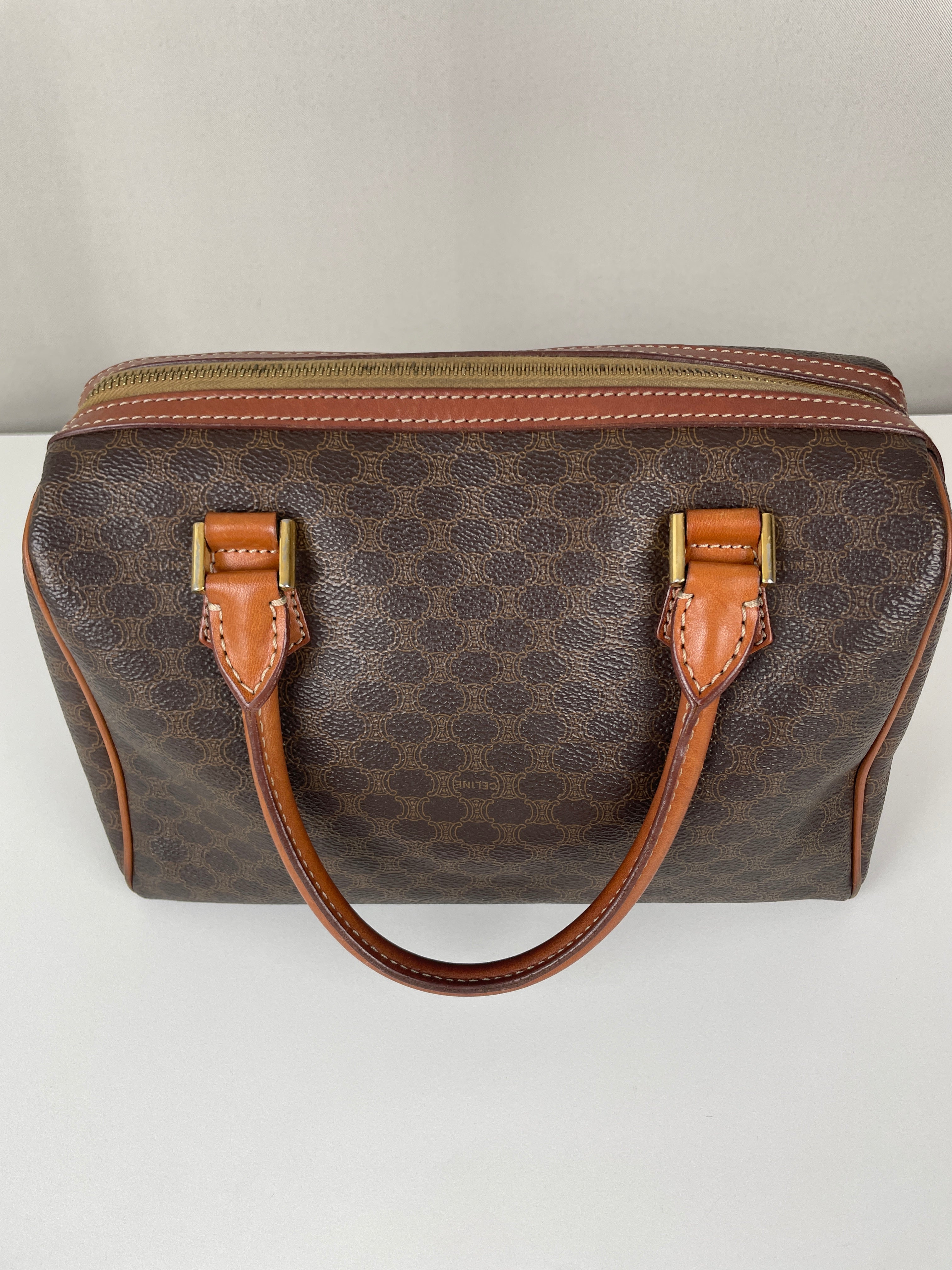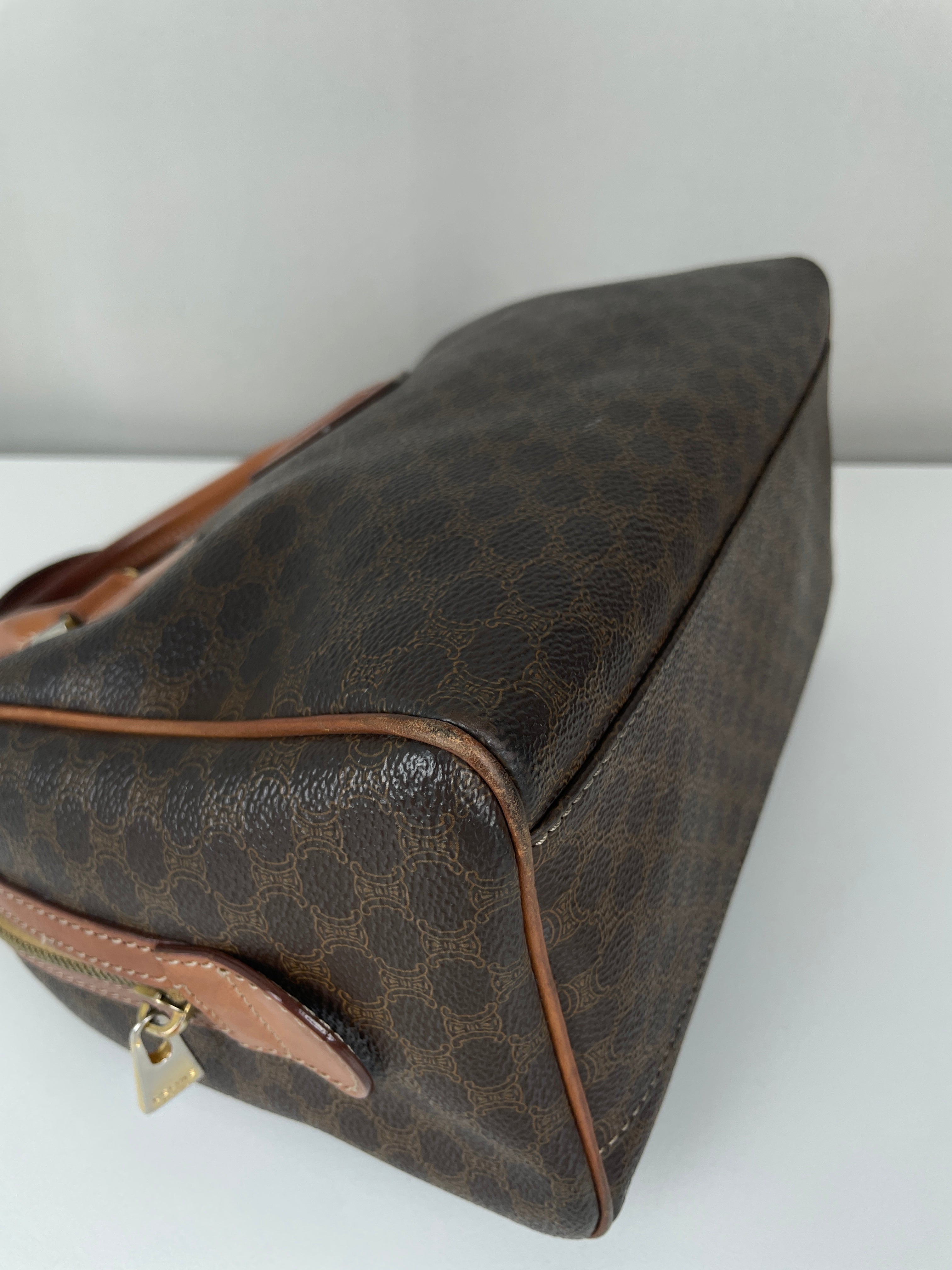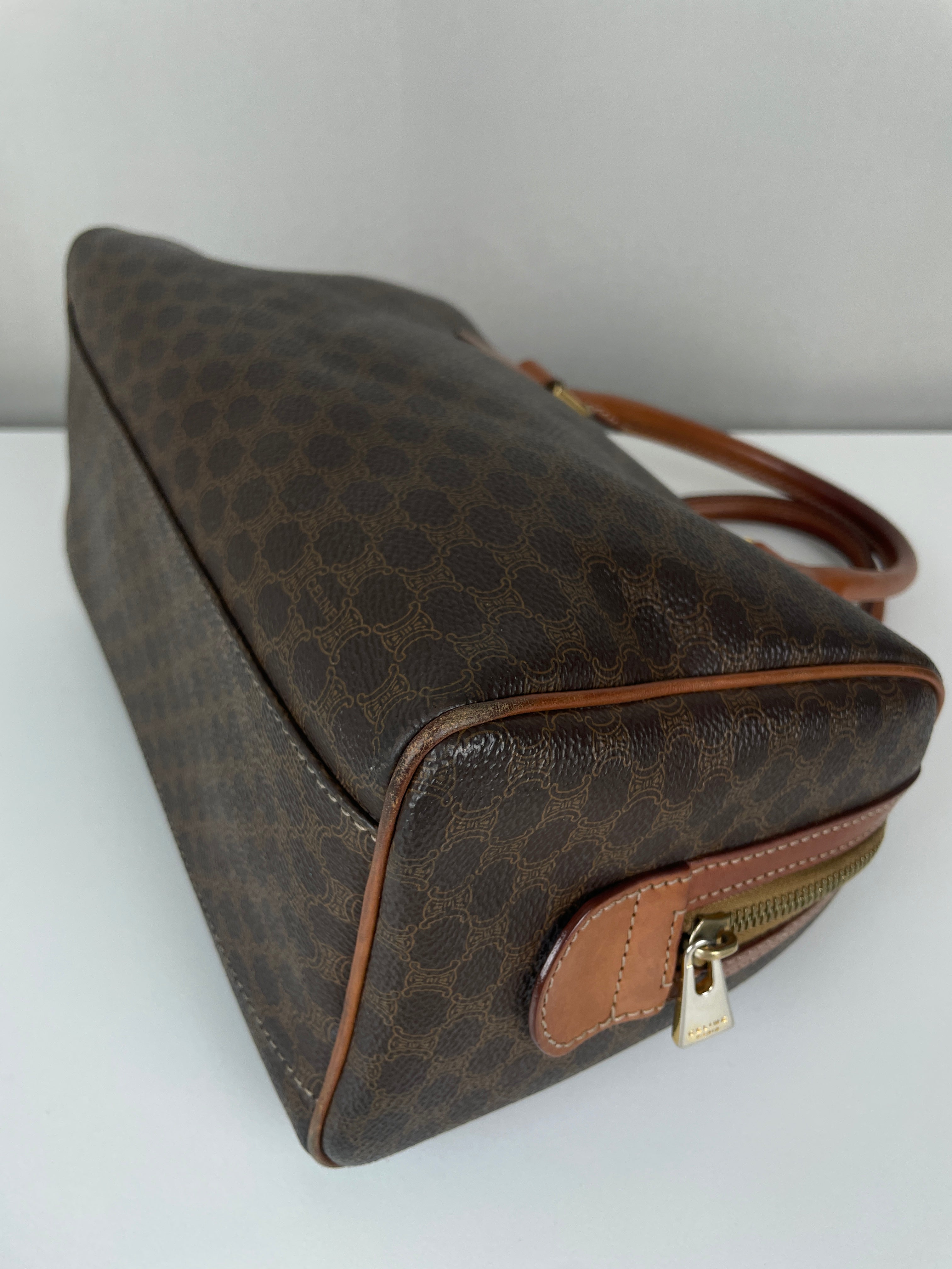 Le Mini Boston est l'un des modèles les plus pratiques et sophistiqués de Celine. Cette édition en toile marron illustre l'expertise de la maison en matière de matériaux mixtes et de luxe fonctionnel. Une pièce polyvalente qui incarne l'élégance discrète de Celine et représente le mélange parfait de sophistication décontractée avec un caractère authentique acquis par un usage délicat.