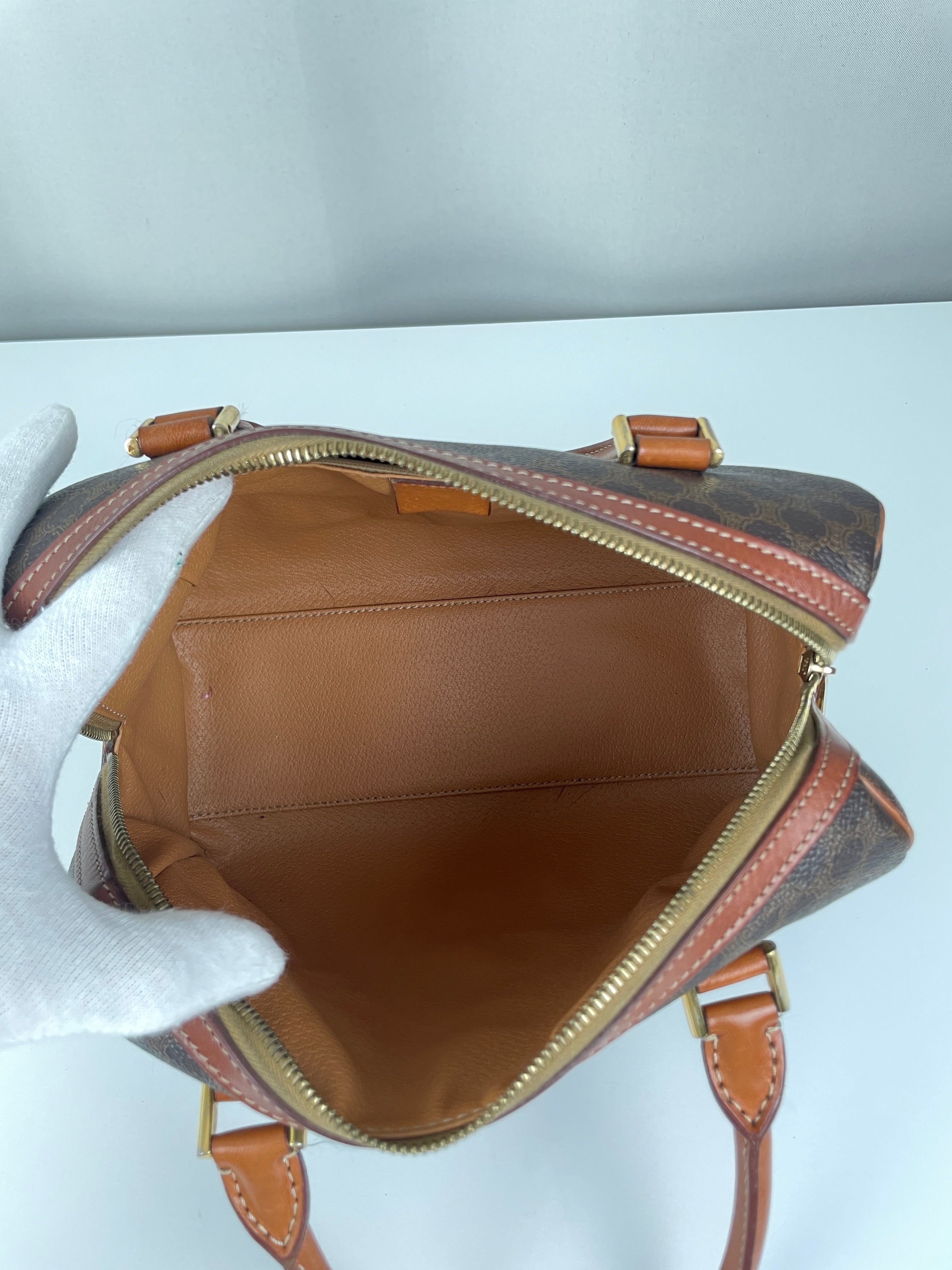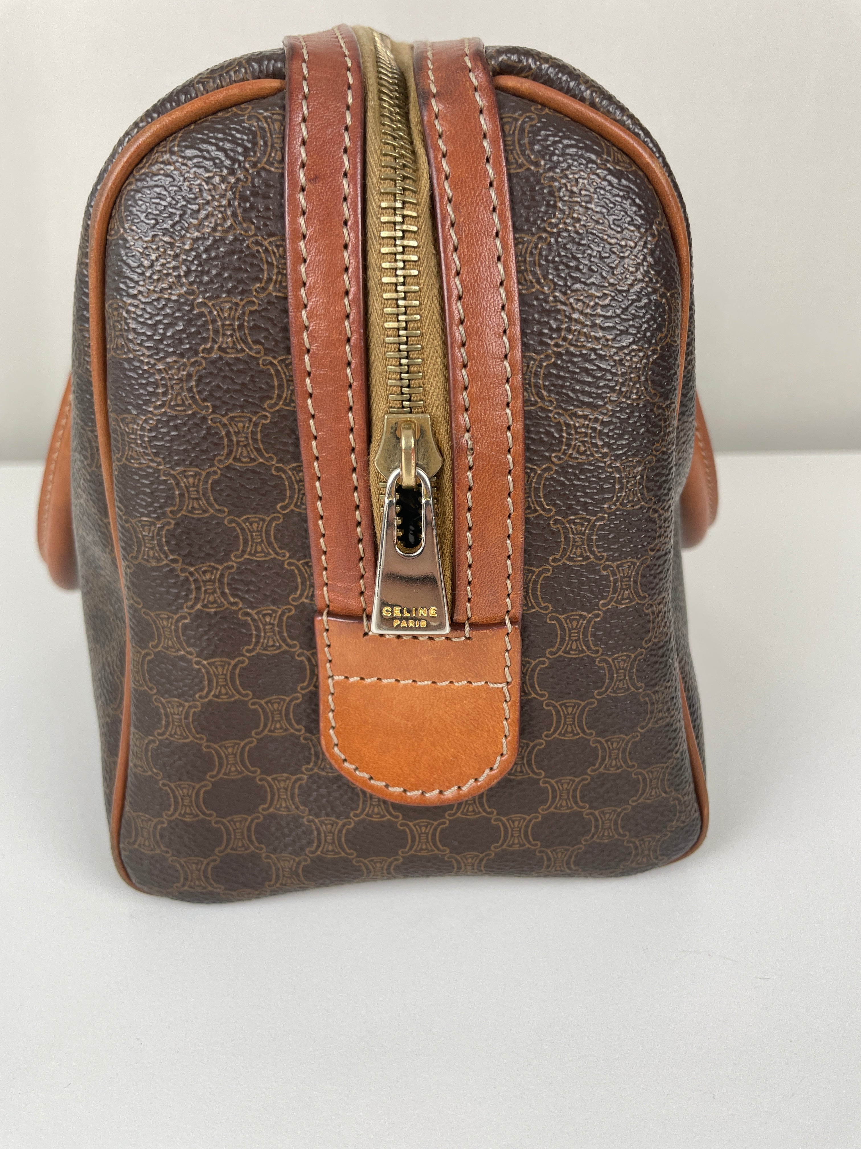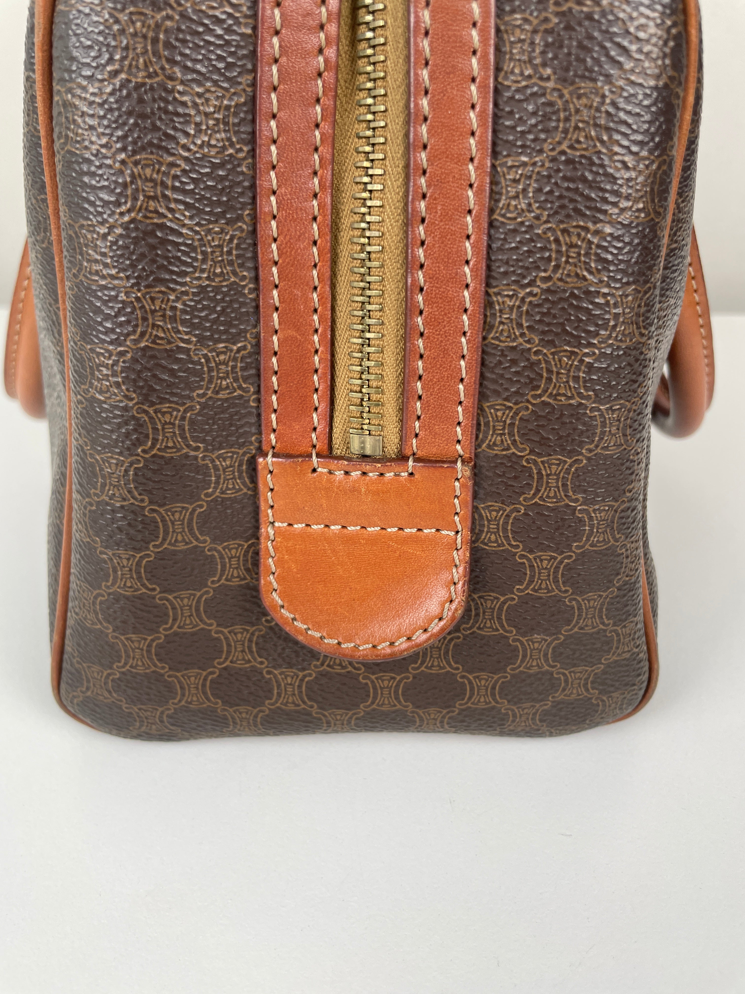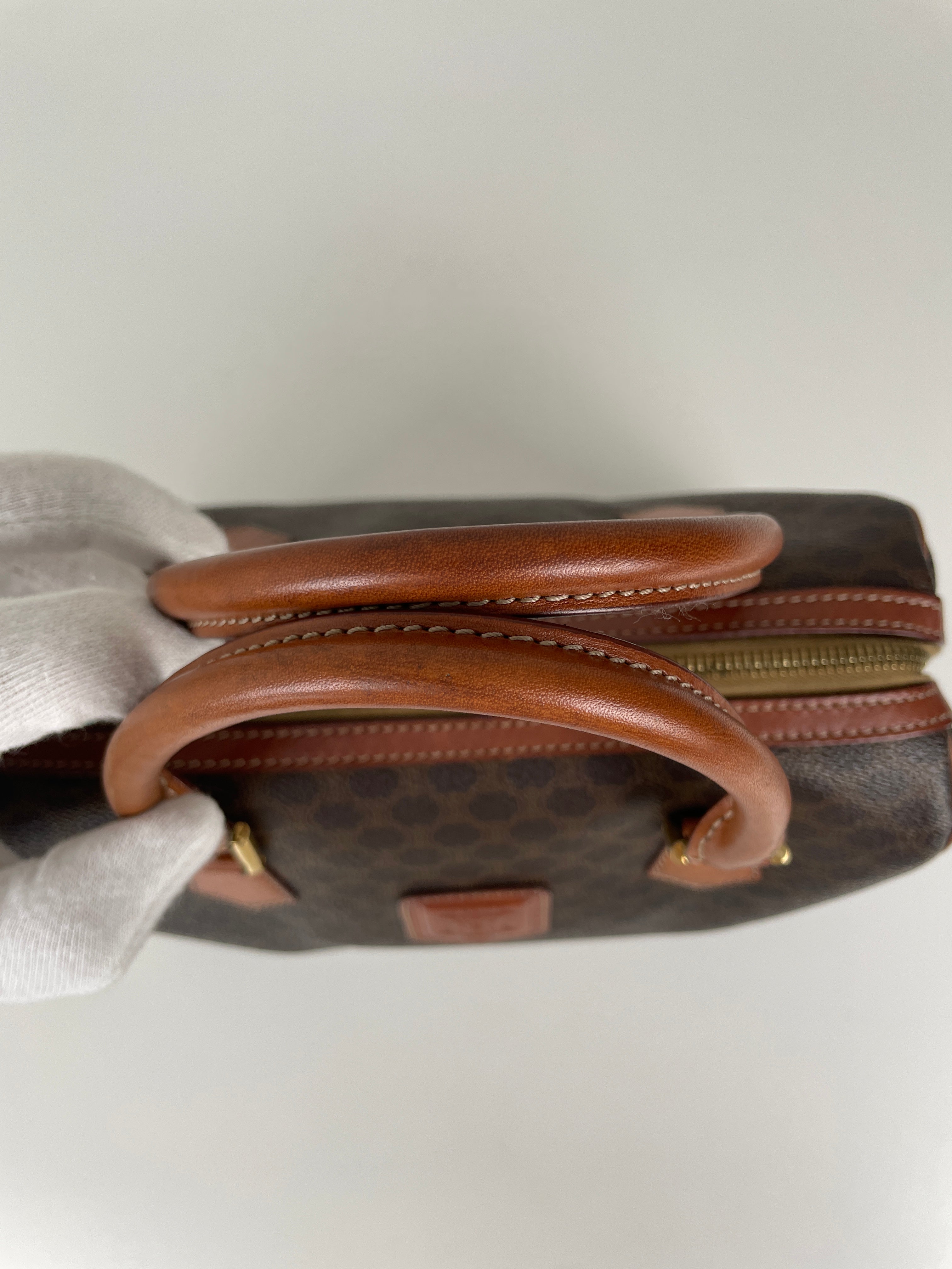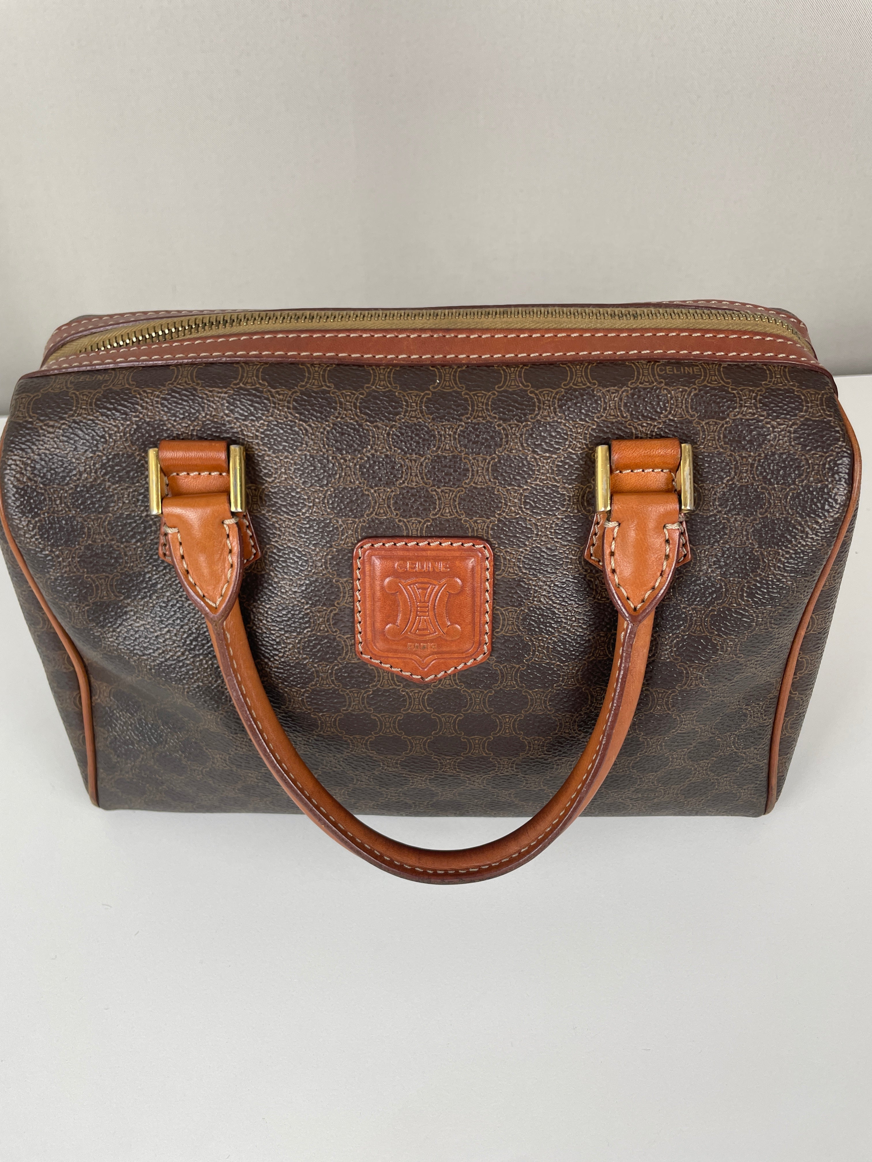 Le Mini Boston est l'un des modèles les plus pratiques et sophistiqués de Celine. Cette édition en toile marron illustre l'expertise de la maison en matière de matériaux mixtes et de luxe fonctionnel. Une pièce polyvalente qui incarne l'élégance discrète de Celine et représente le mélange parfait de sophistication décontractée avec un caractère authentique acquis par un usage délicat.
