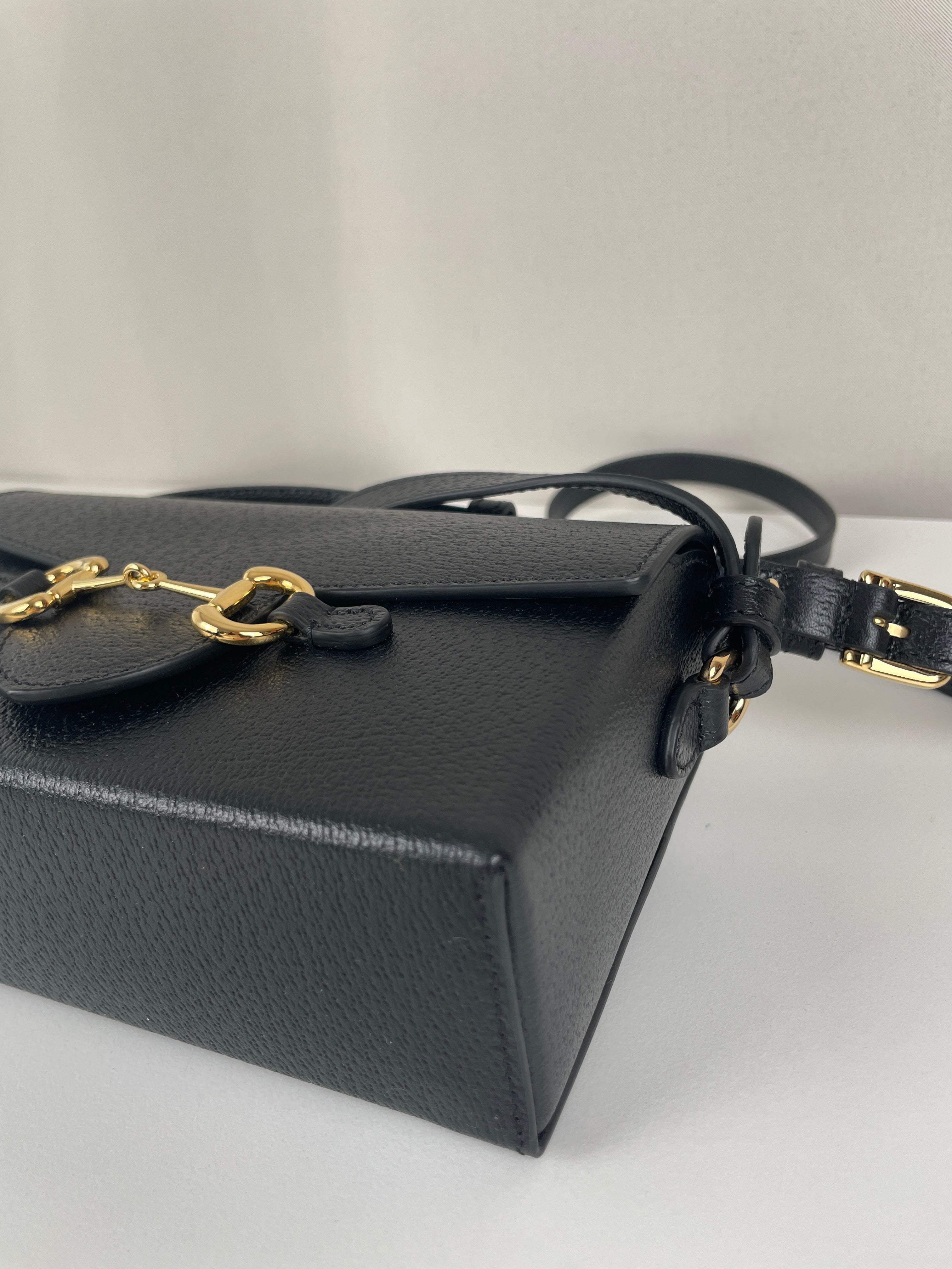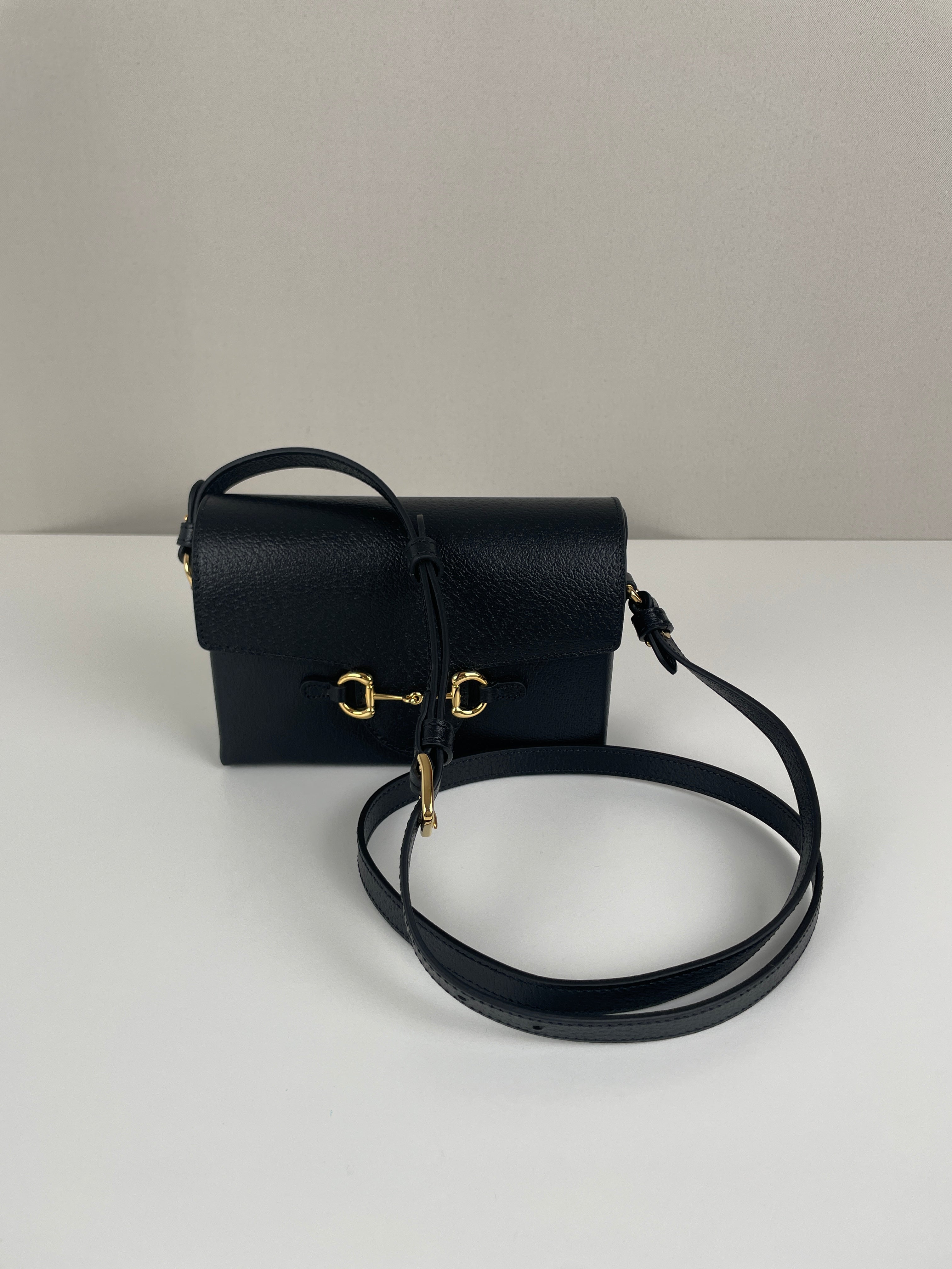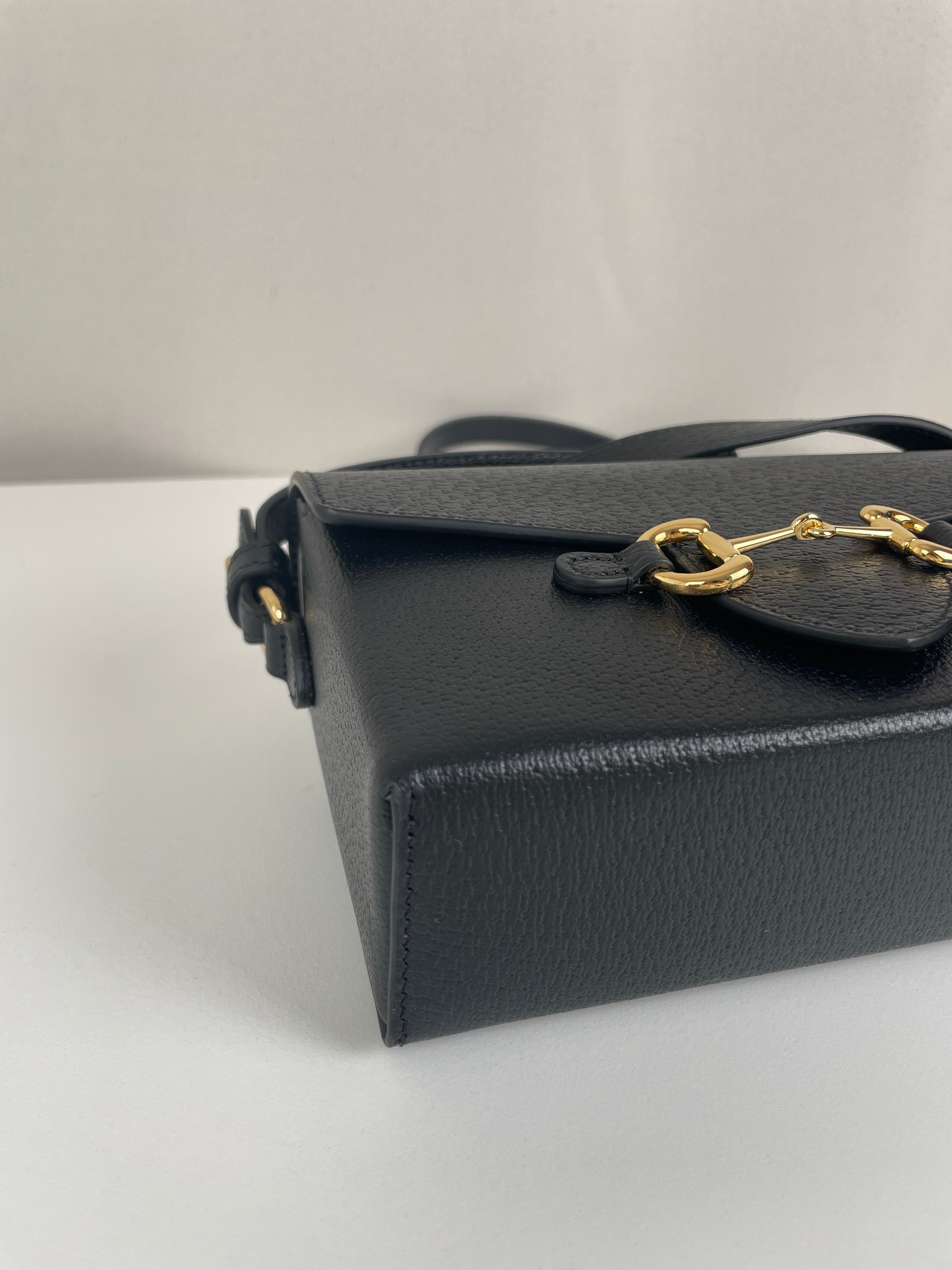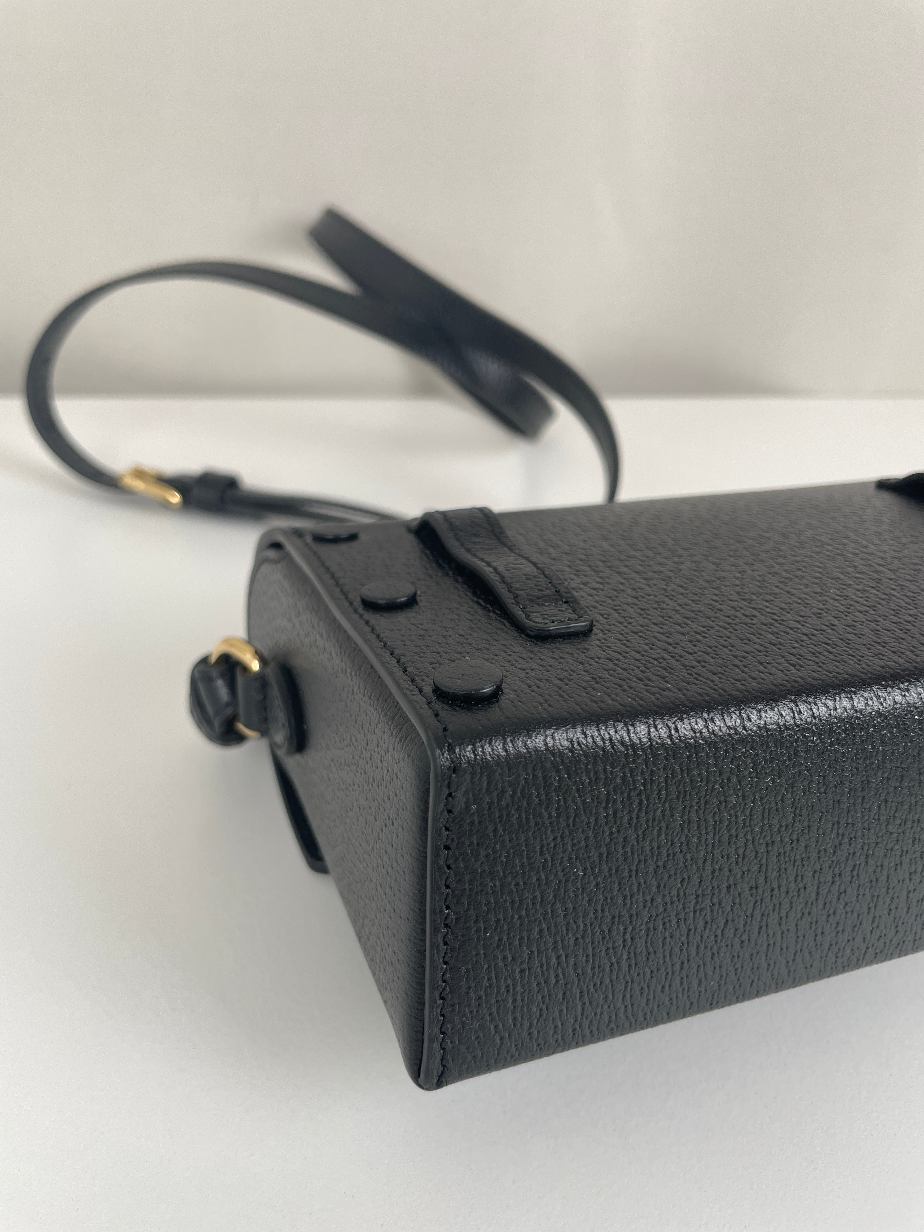 Ce sac Gucci Mini Horsebit en cuir noir est une pièce à la fois élégante et intemporelle. Sa silhouette structurée et son bijou emblématique doré en font un modèle chic, parfait du matin au soir. Son format mini et sa finition luxueuse séduisent les amateurs de sacs iconiques.