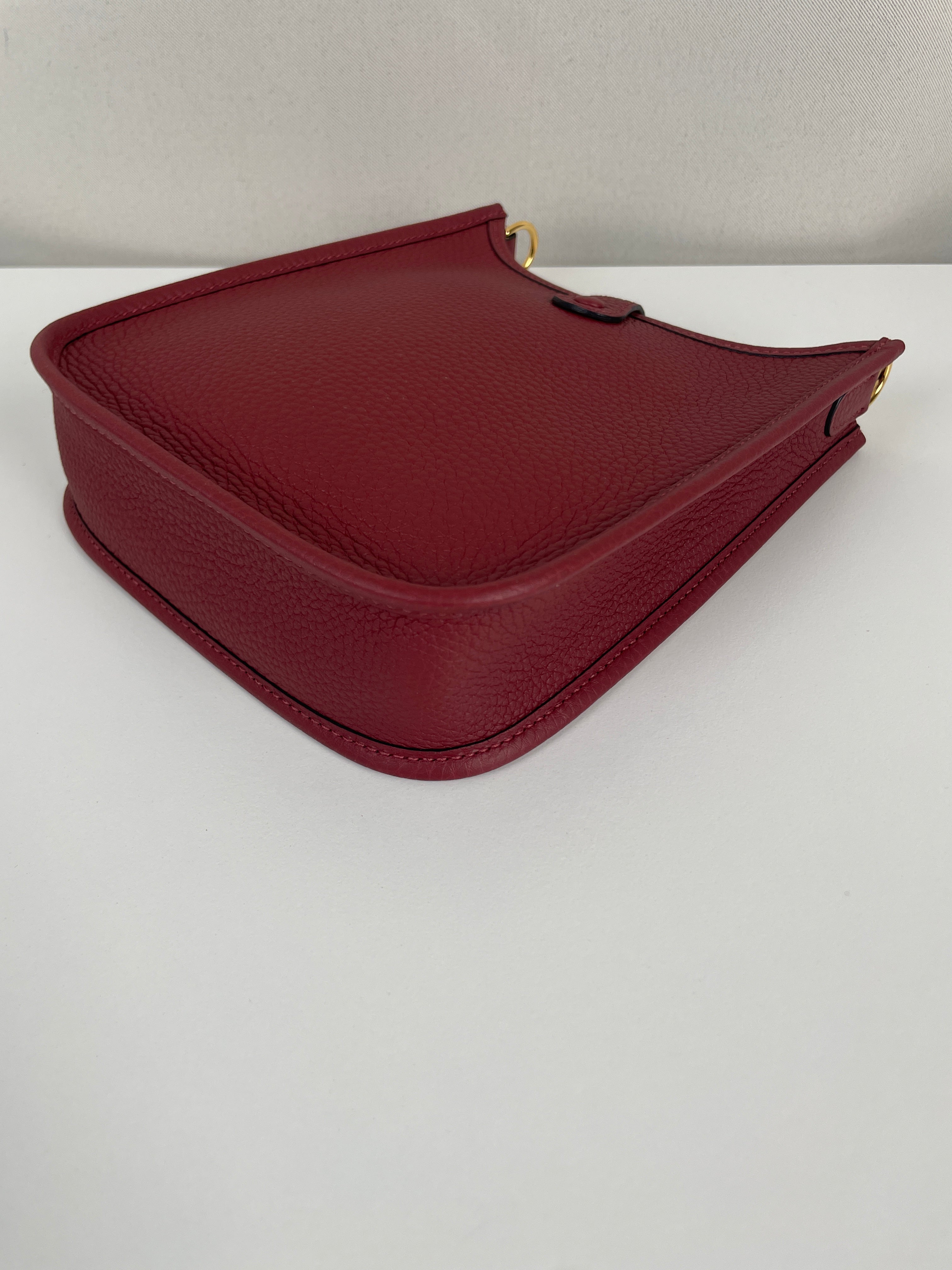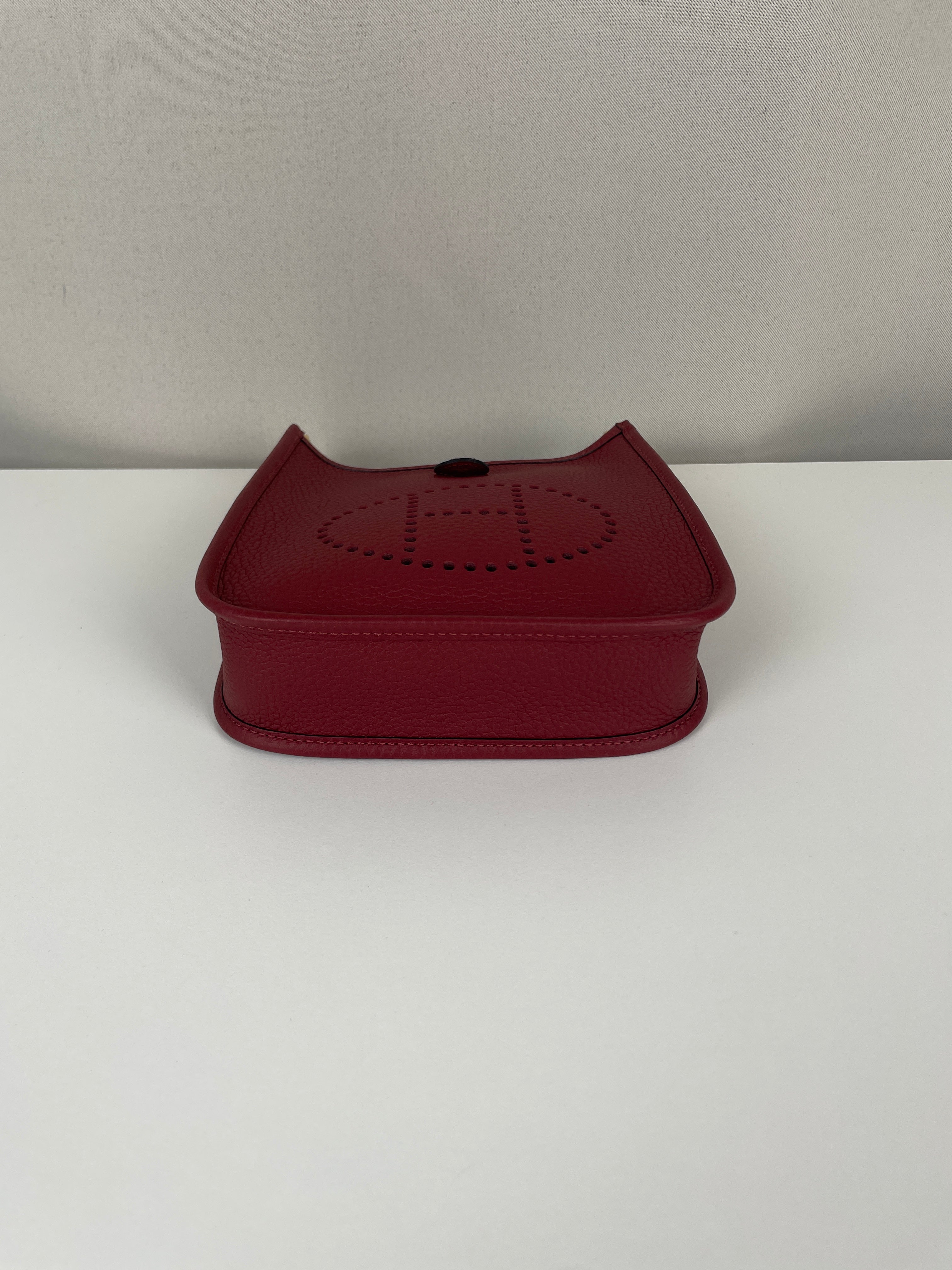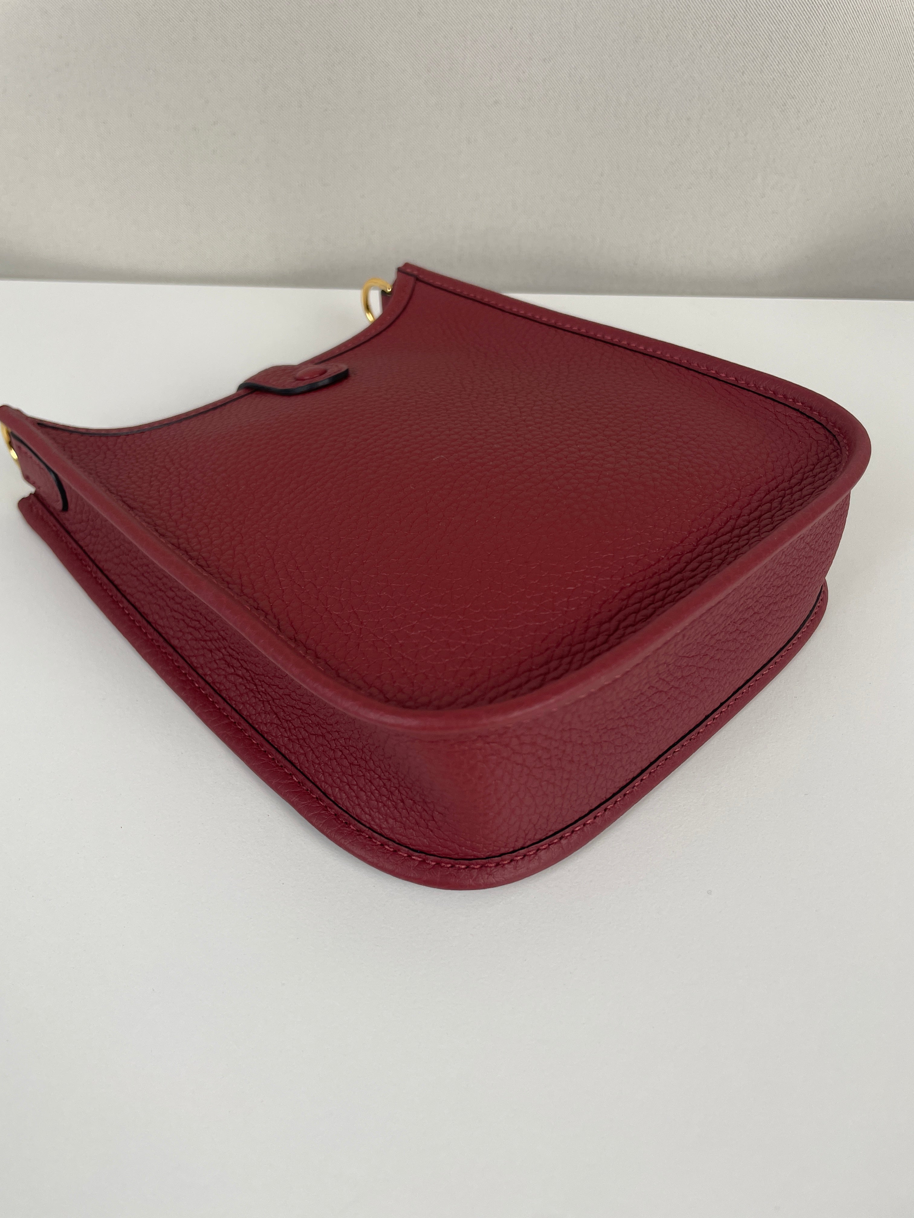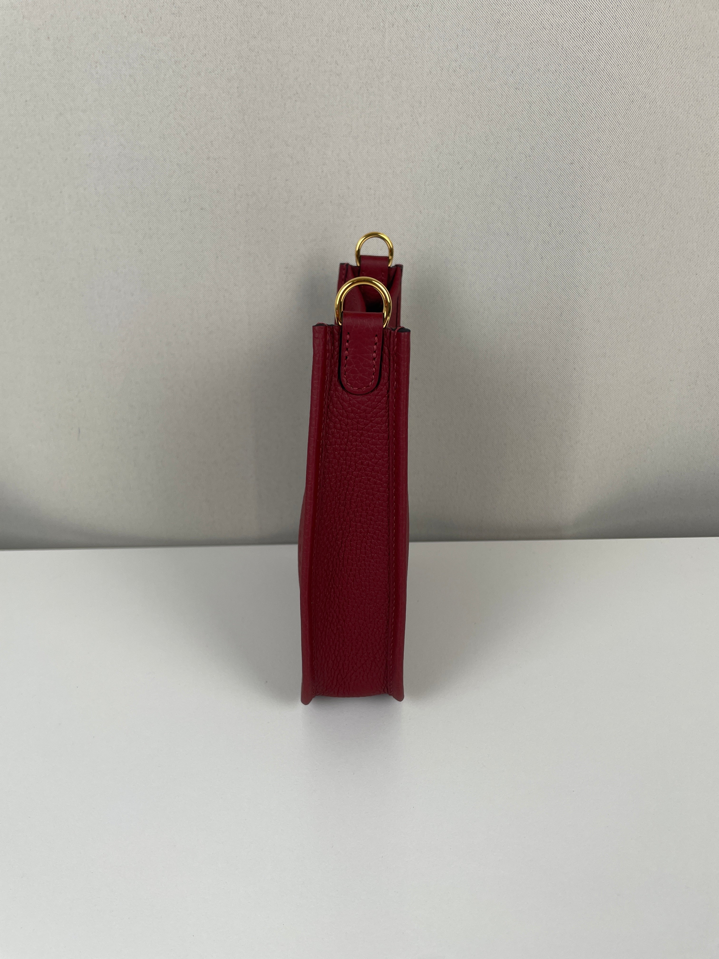 Ce sac Hermès Evelyne TPM 16 est neuf. L'extérieur est en parfait état. L'intérieur est en très bon état. La bandoulière est livrée avec les stickers de protection. C'est un sac neuf jamais utilisé. La couleur est rouge foncé type rouge H.