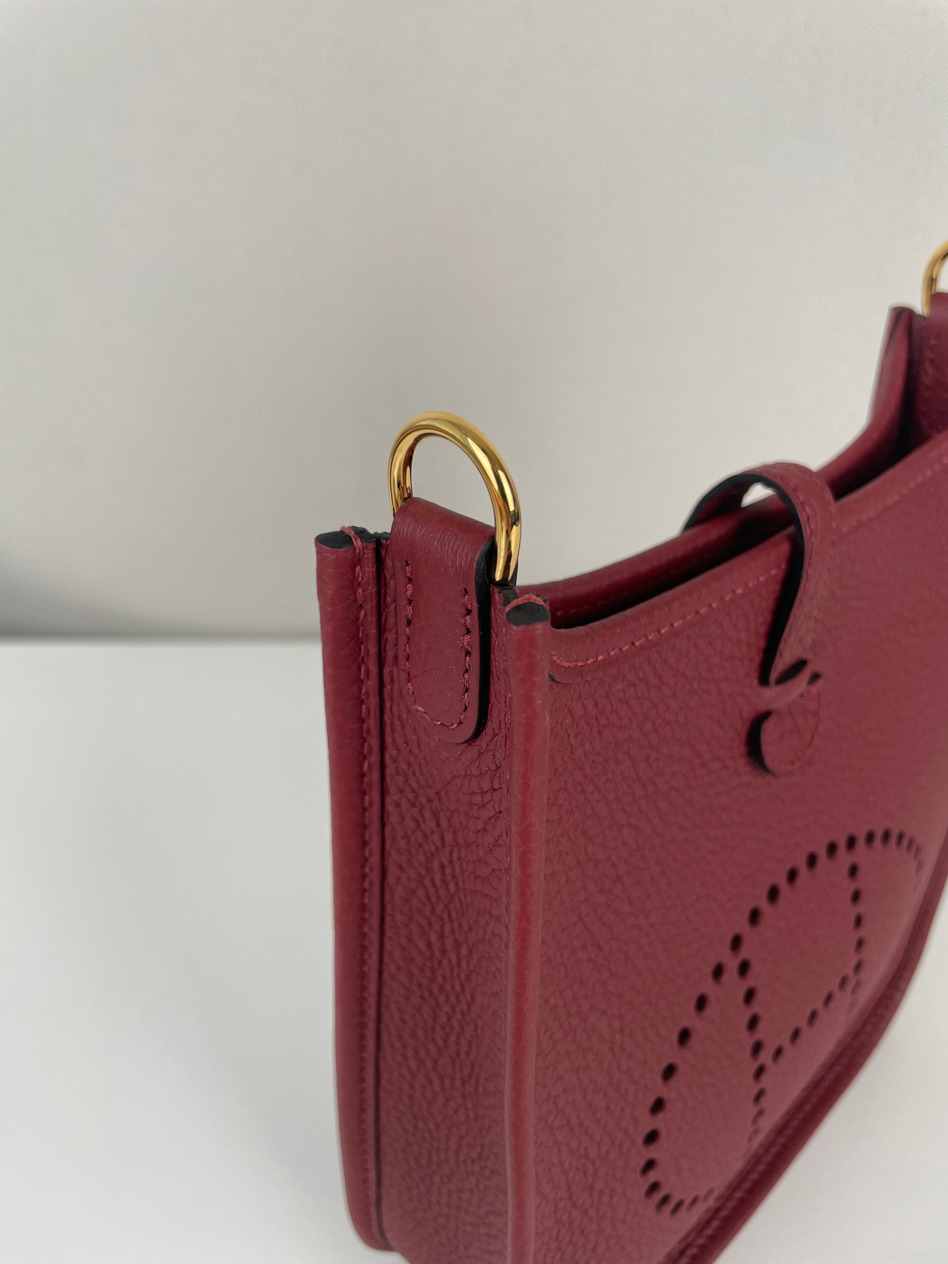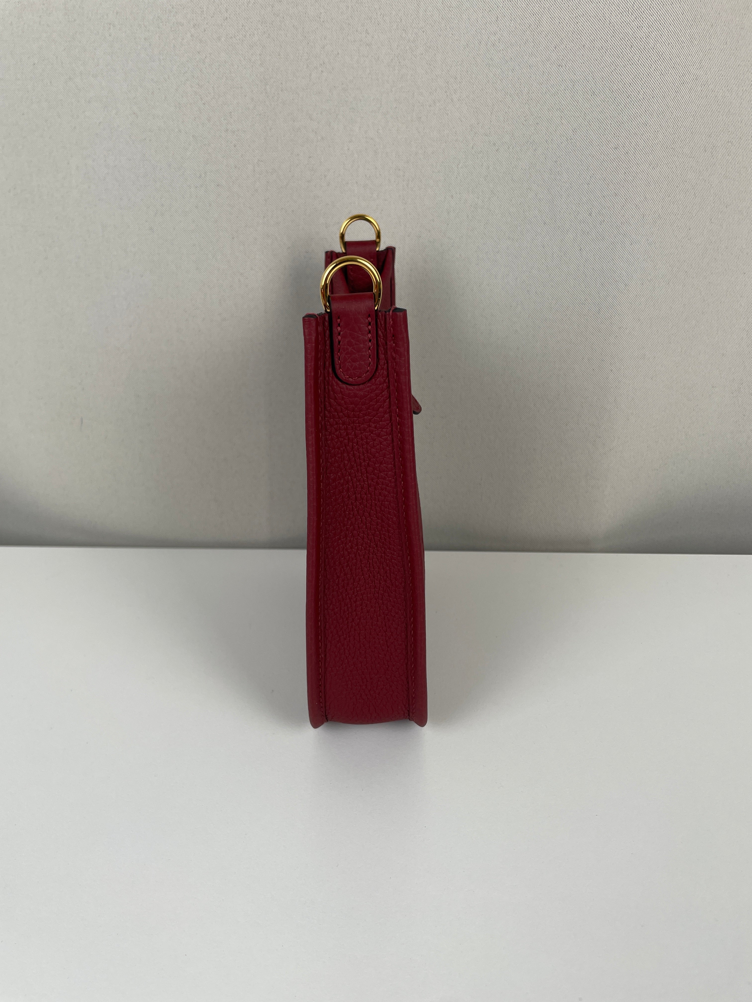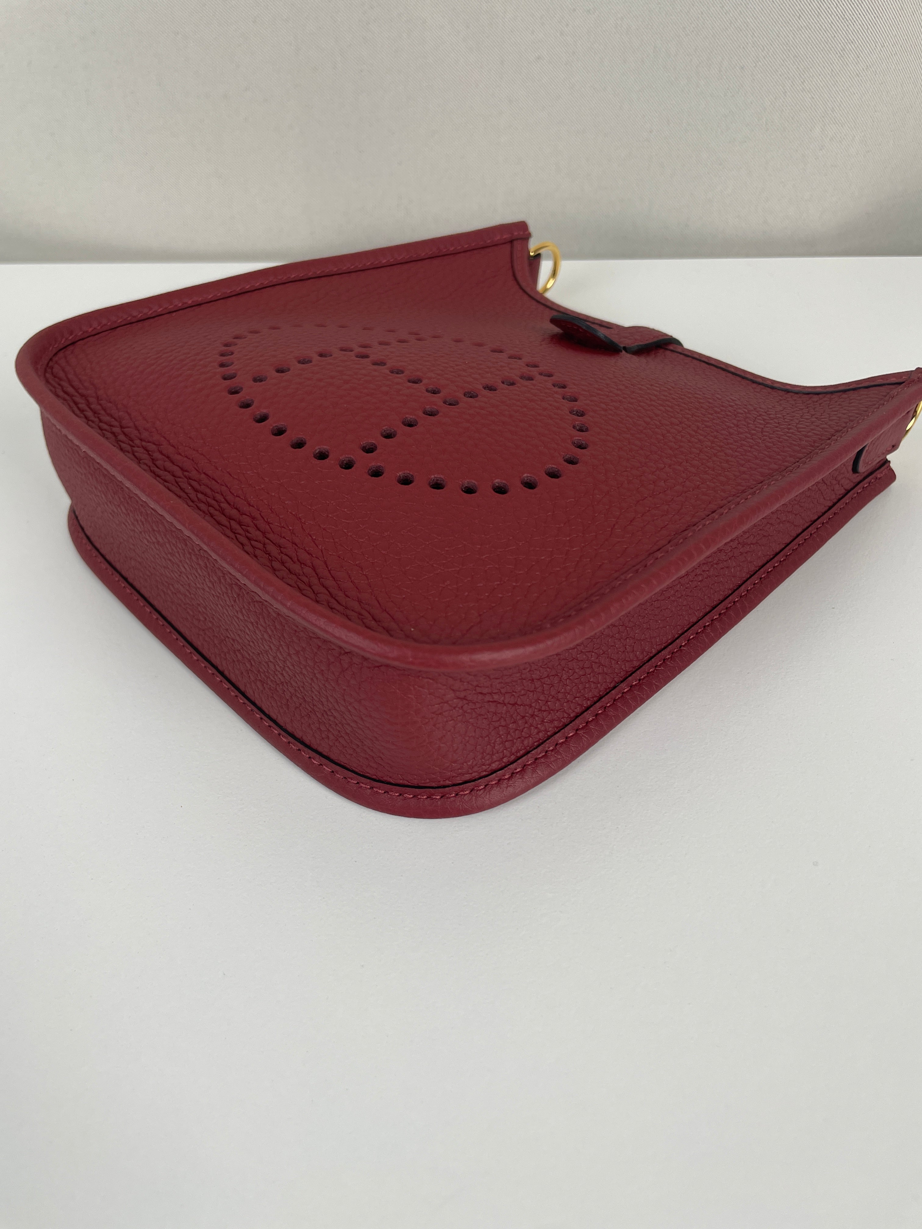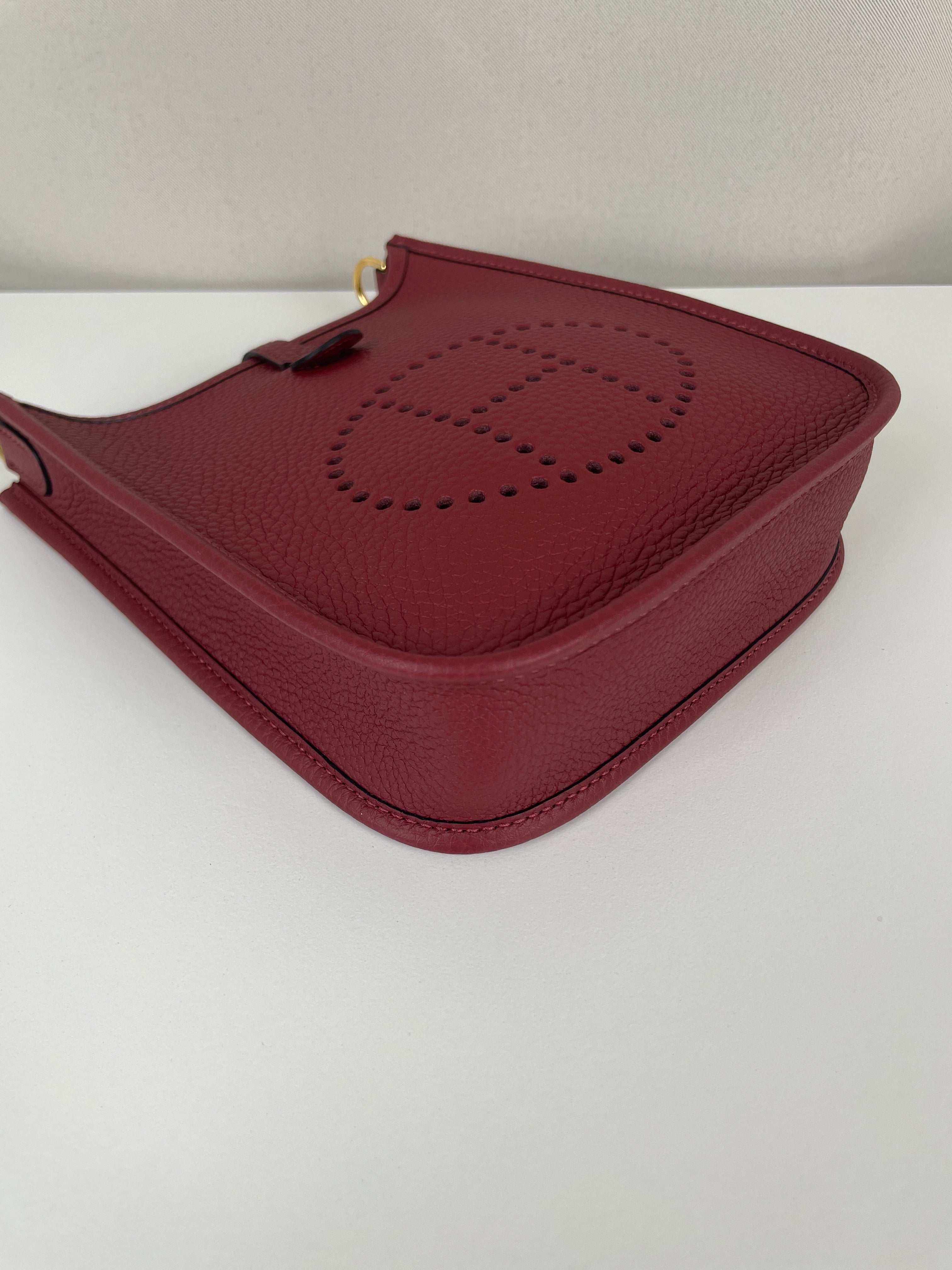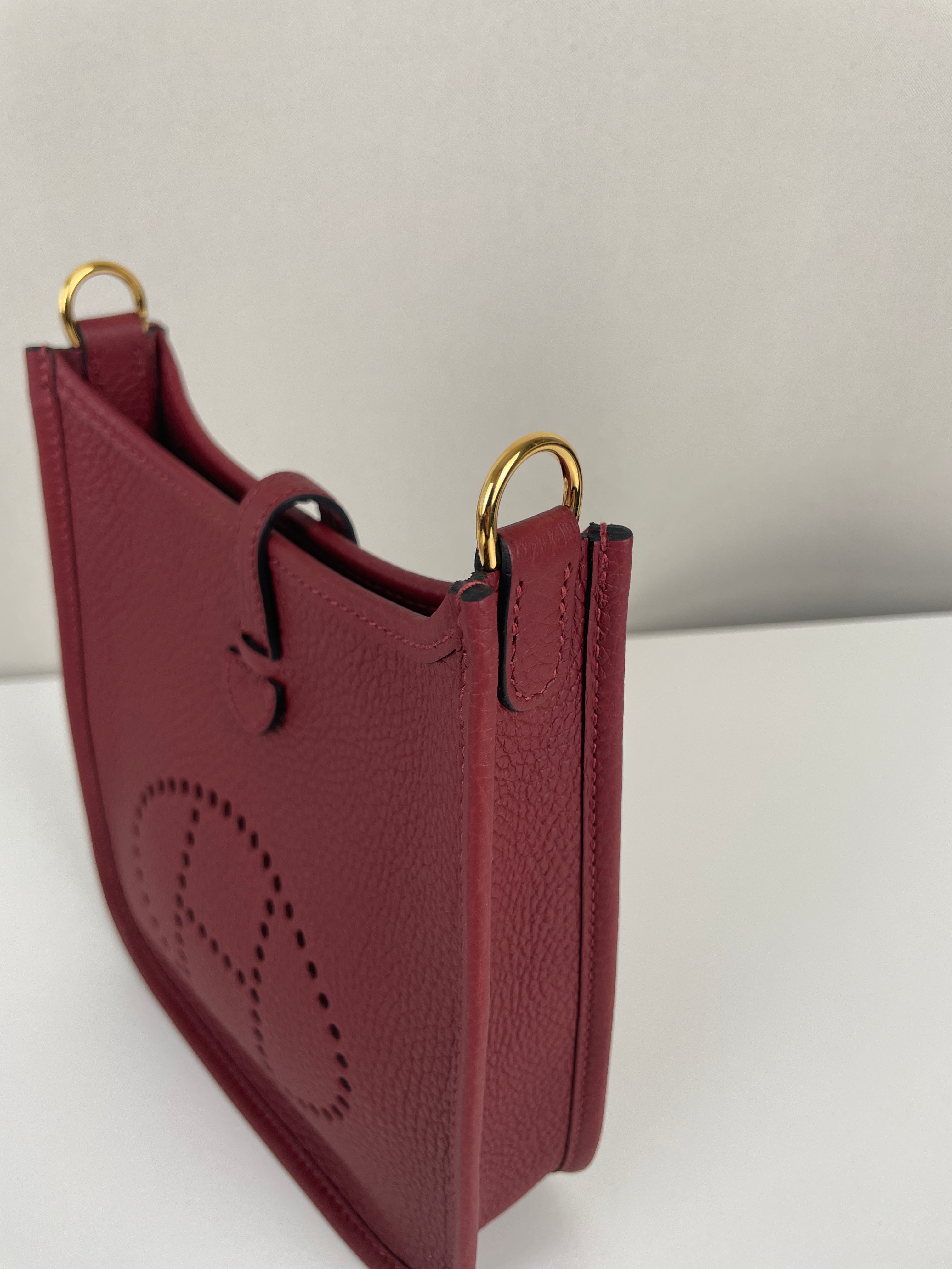 Ce sac Hermès Evelyne TPM 16 est neuf. L'extérieur est en parfait état. L'intérieur est en très bon état. La bandoulière est livrée avec les stickers de protection. C'est un sac neuf jamais utilisé. La couleur est rouge foncé type rouge H.