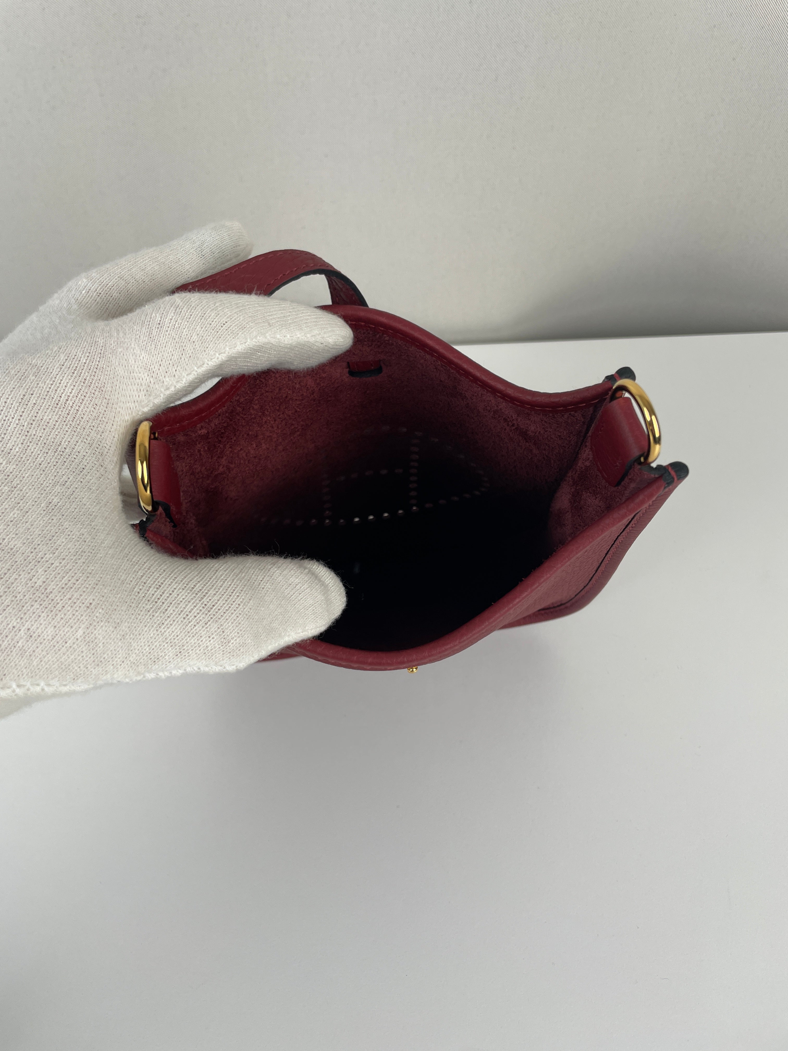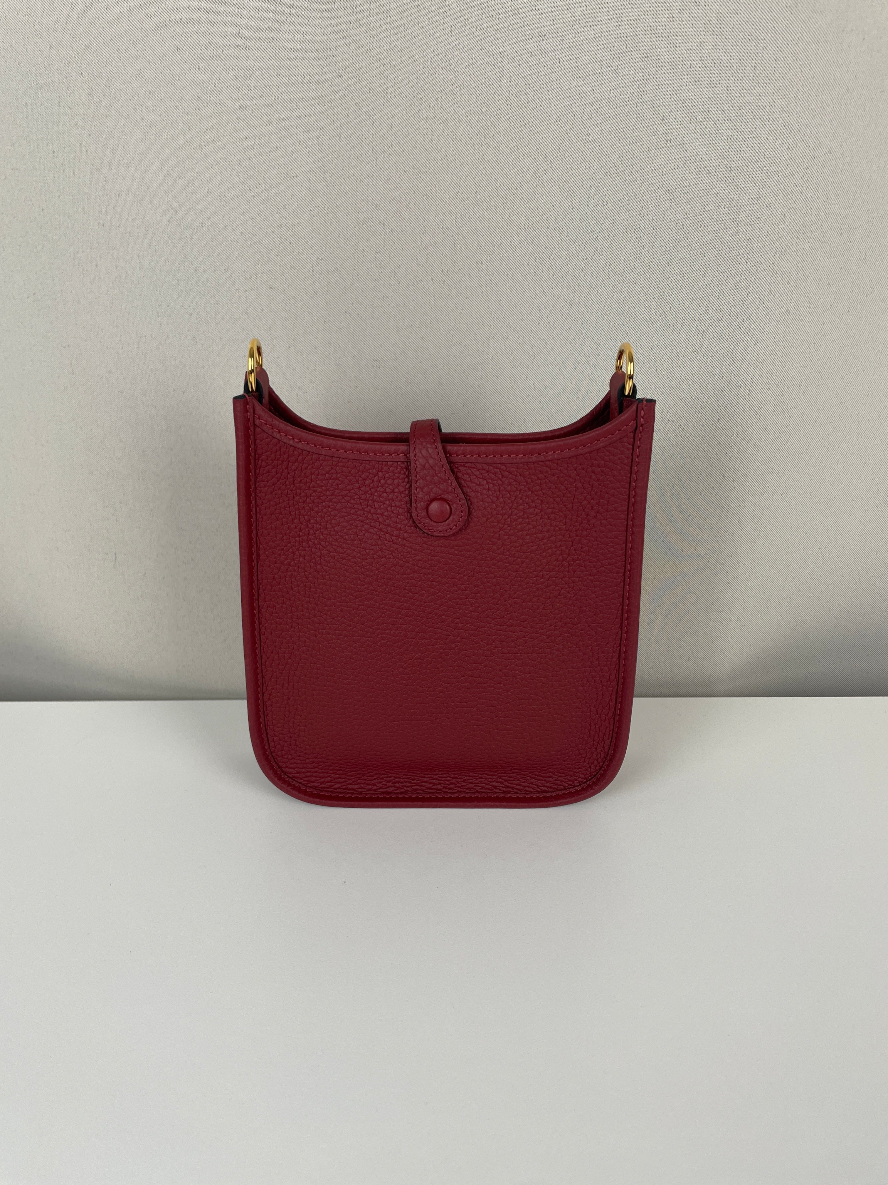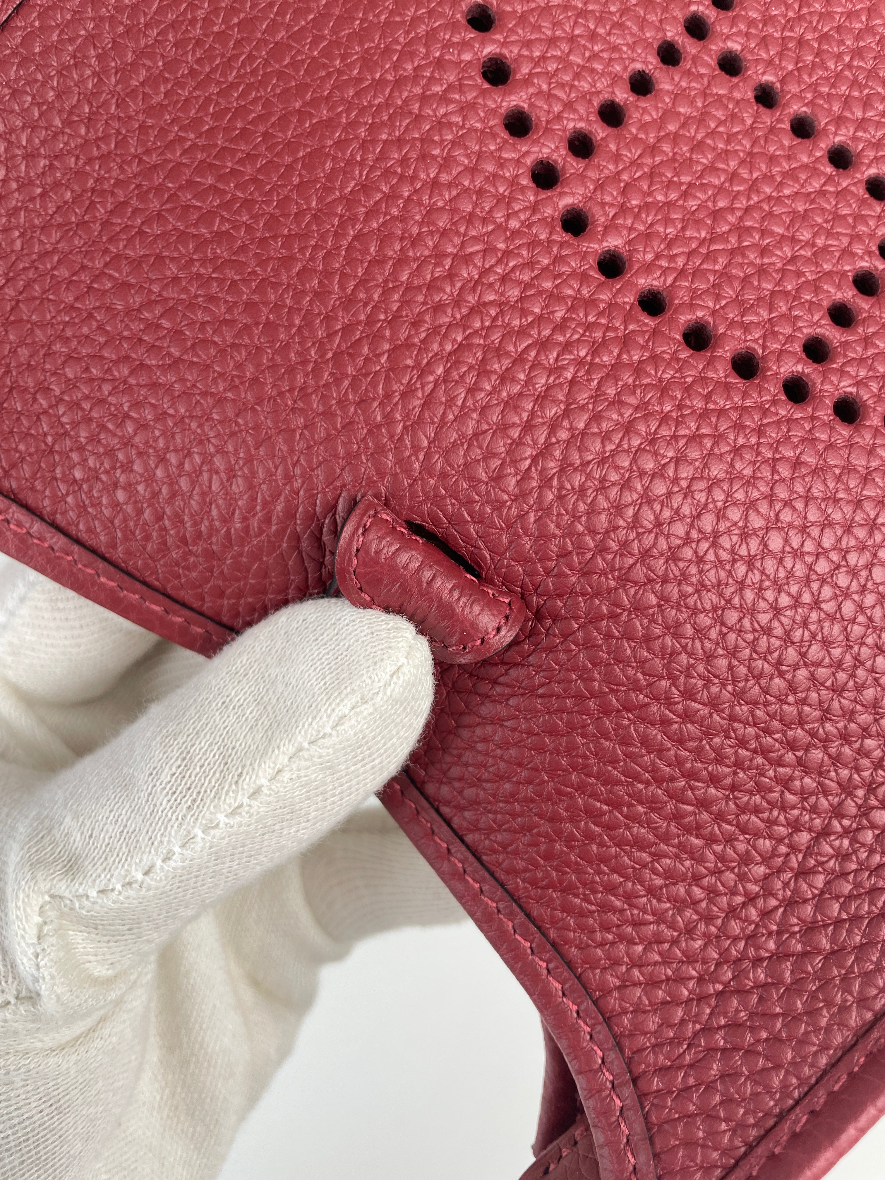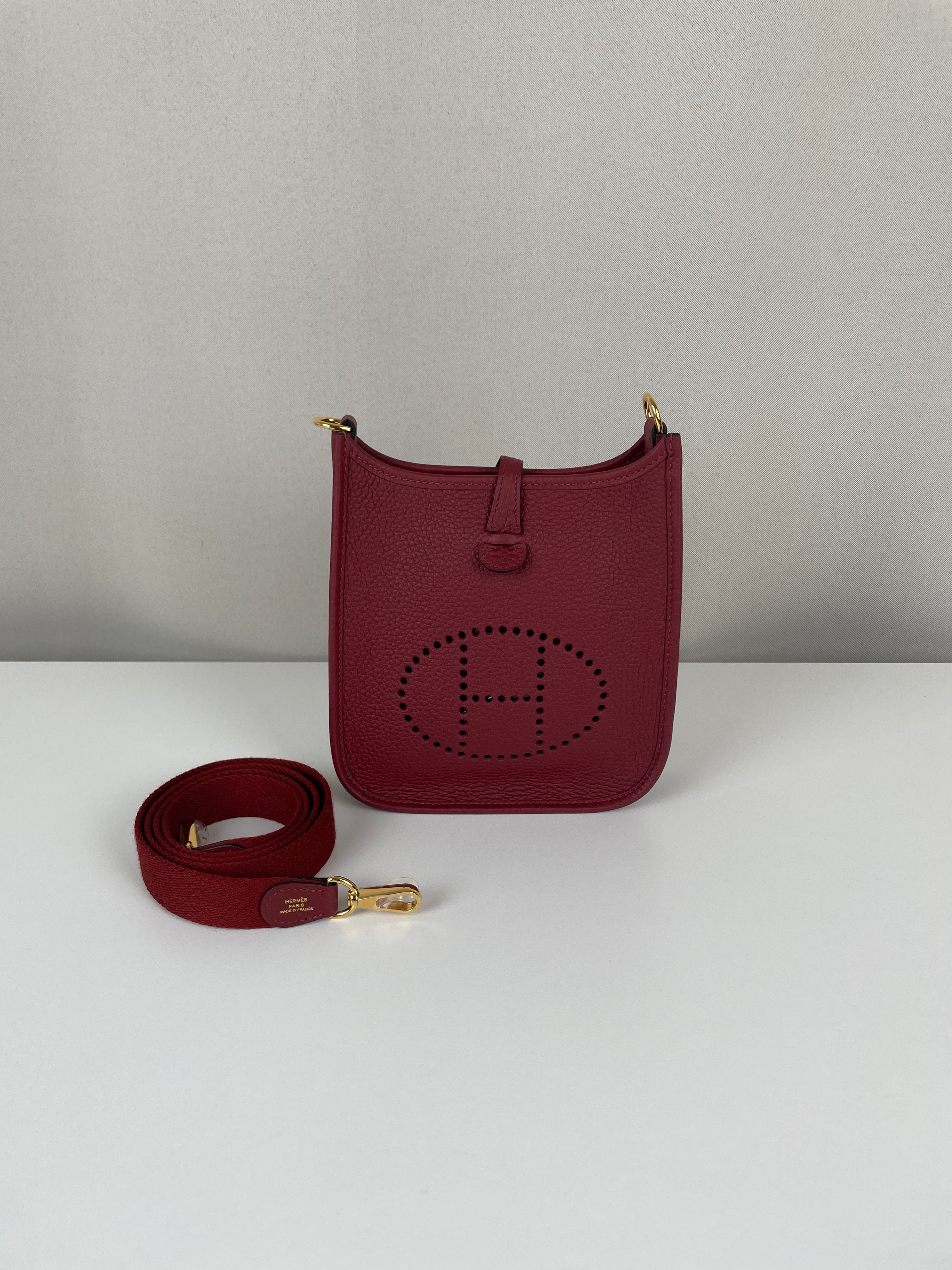 Ce sac Hermès Evelyne TPM 16 est neuf. L'extérieur est en parfait état. L'intérieur est en très bon état. La bandoulière est livrée avec les stickers de protection. C'est un sac neuf jamais utilisé. La couleur est rouge foncé type rouge H.