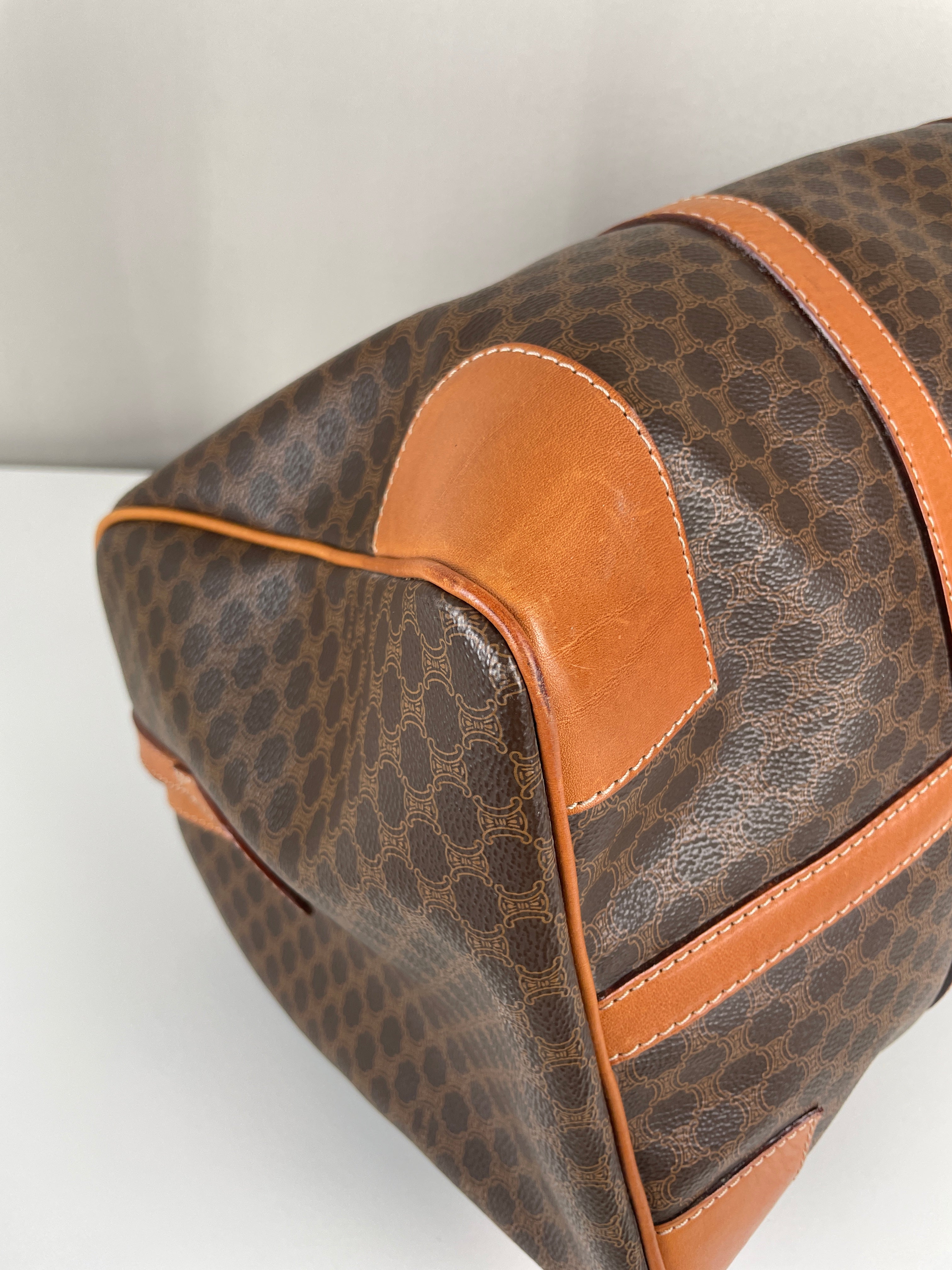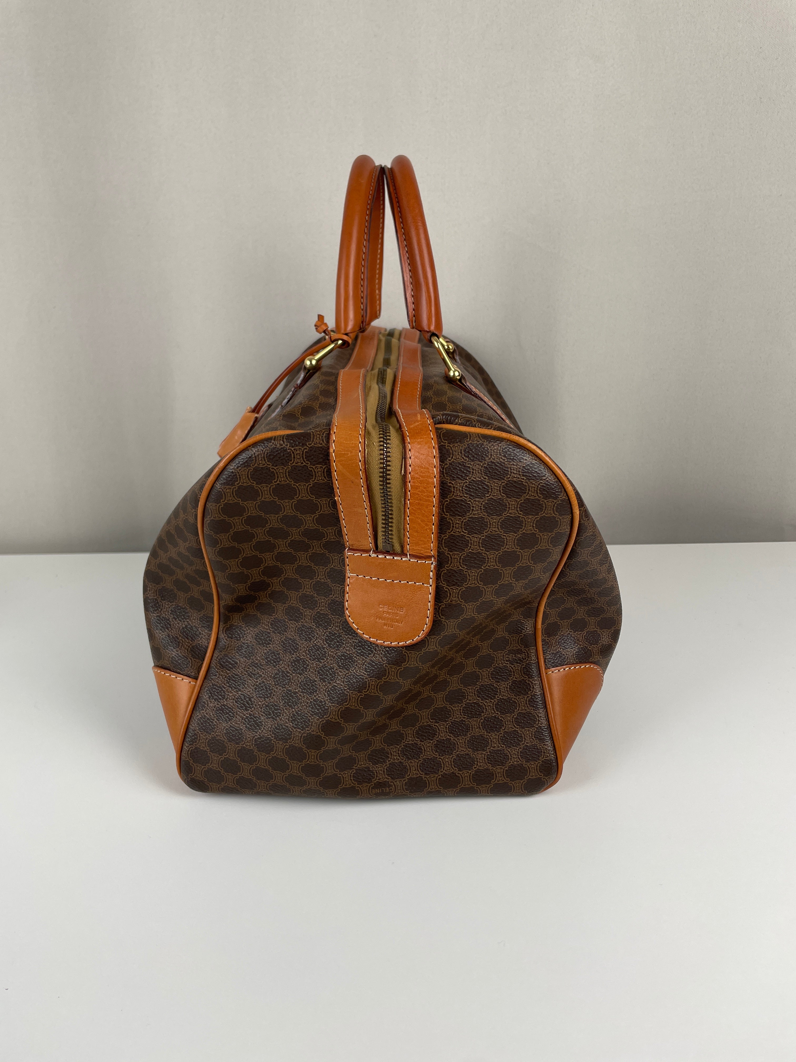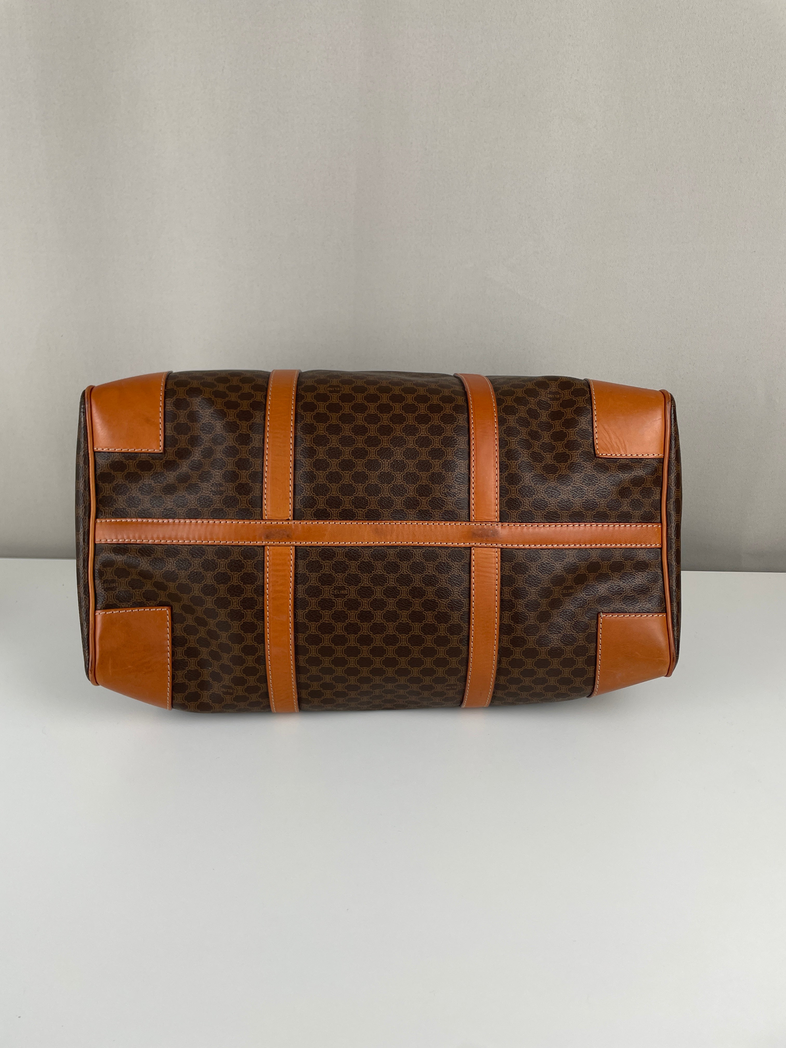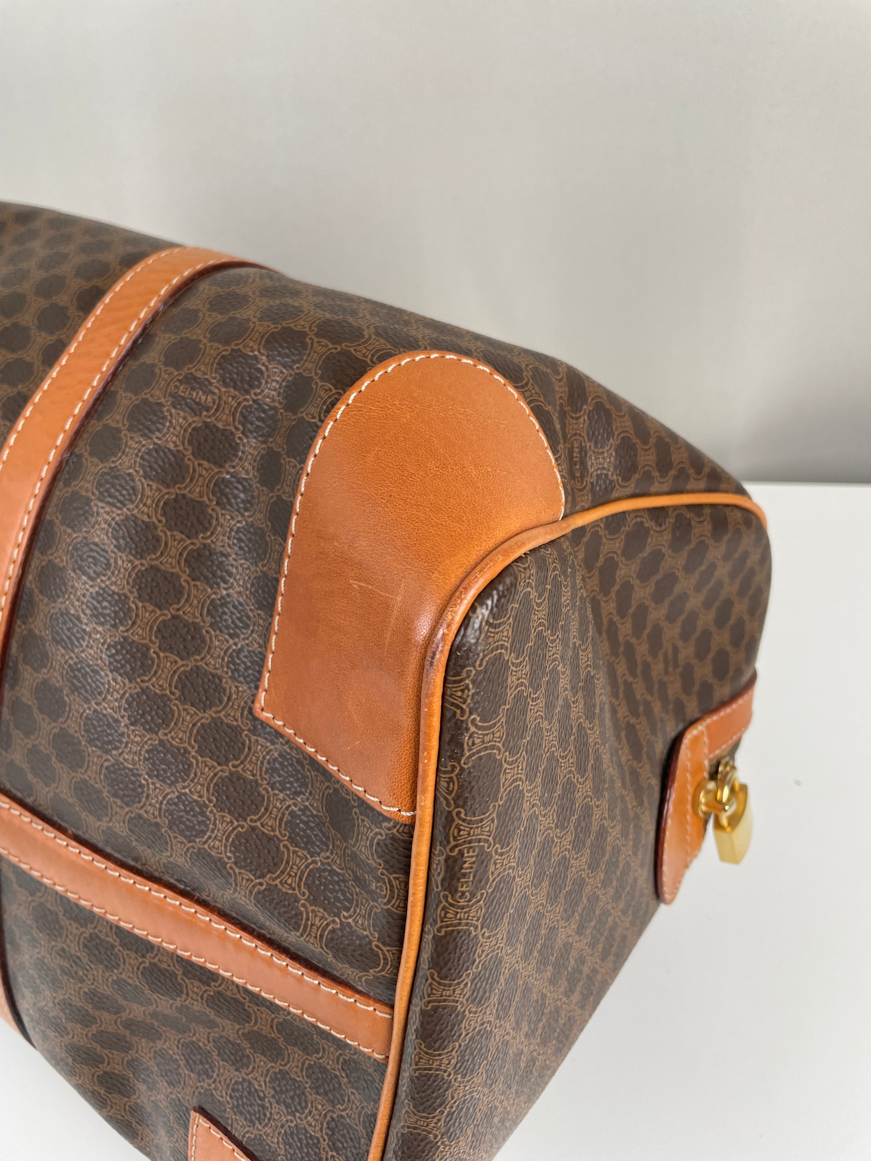 Ce sac de voyage Boston de la marque Céline est en très bon état. La toile macadam est en très bon état. Les coins sont un peu frottés. Le dessous du sac présente quelques traces d'usure. Les anses sont en très bon état. L'intérieur est en bon état, quelques petites traces mineures.