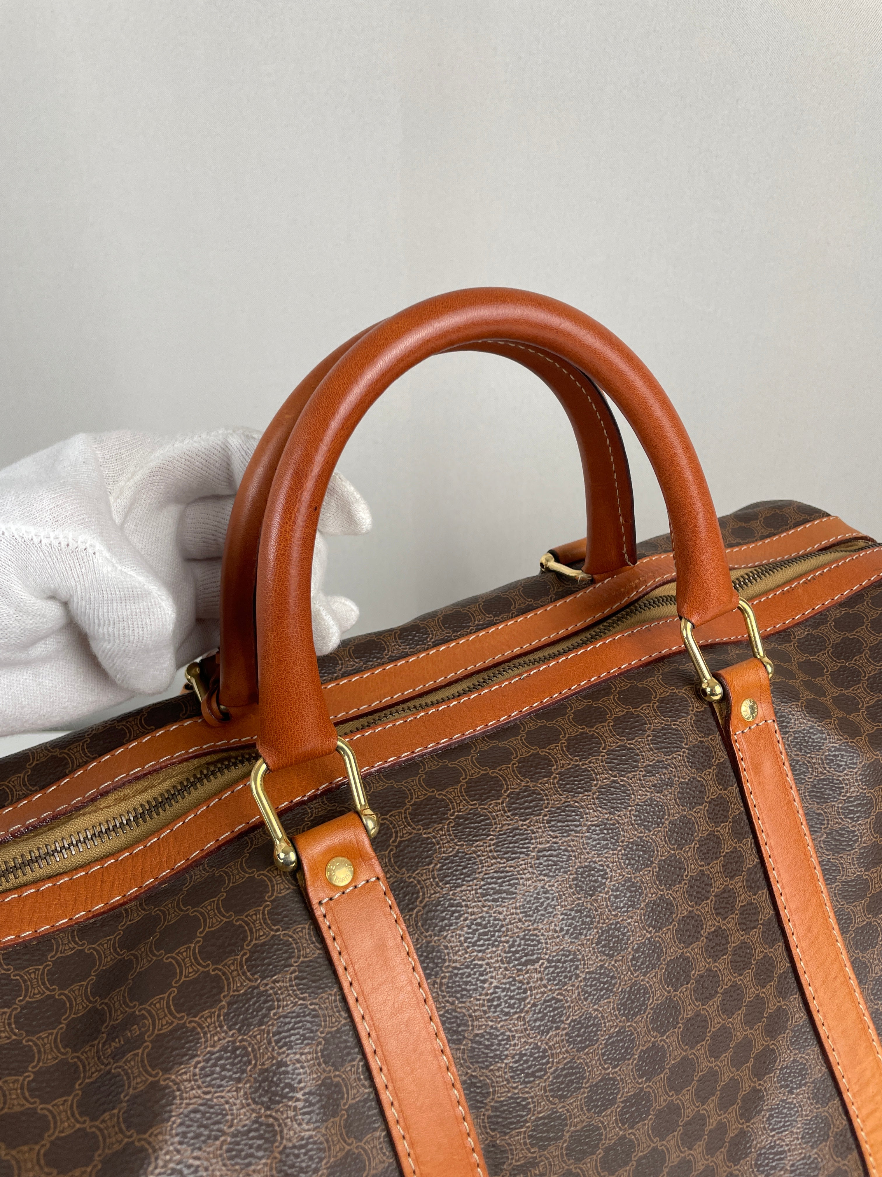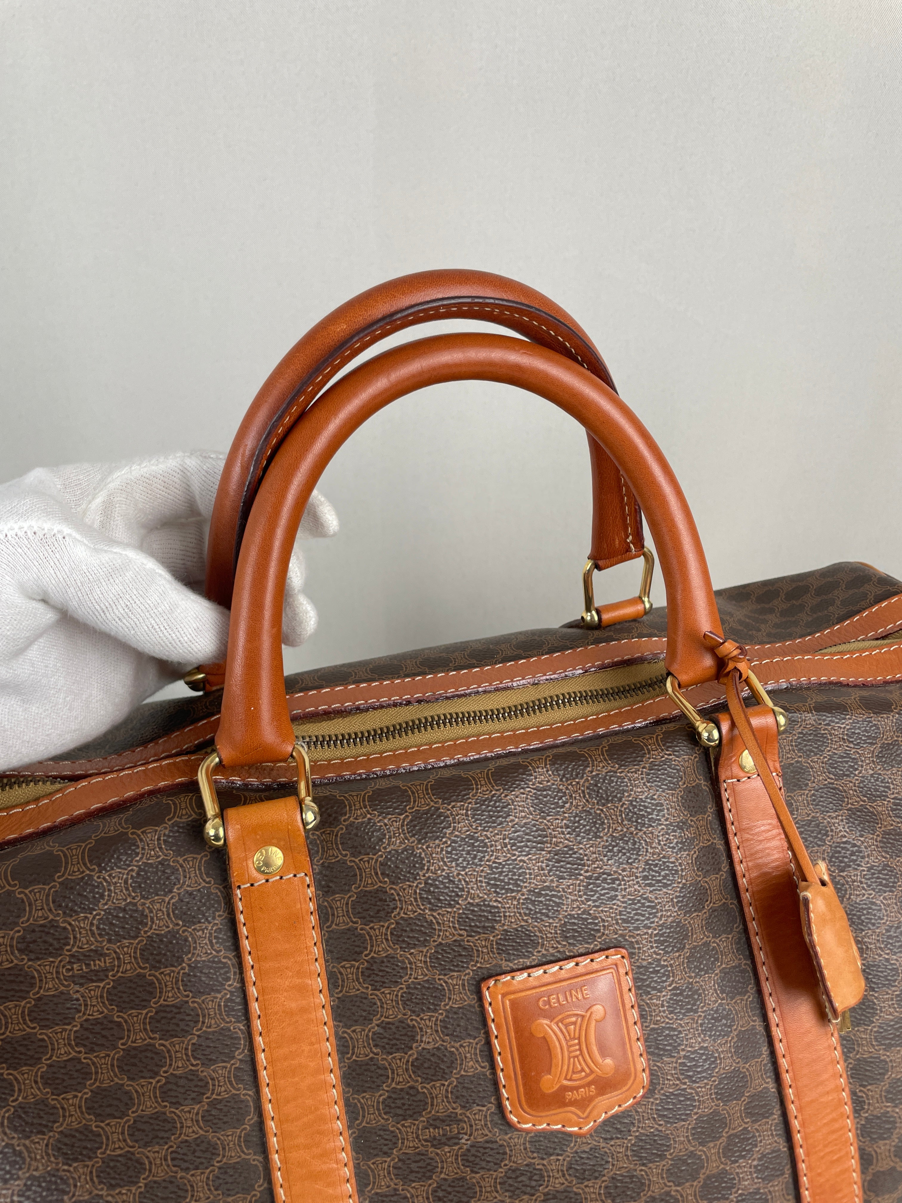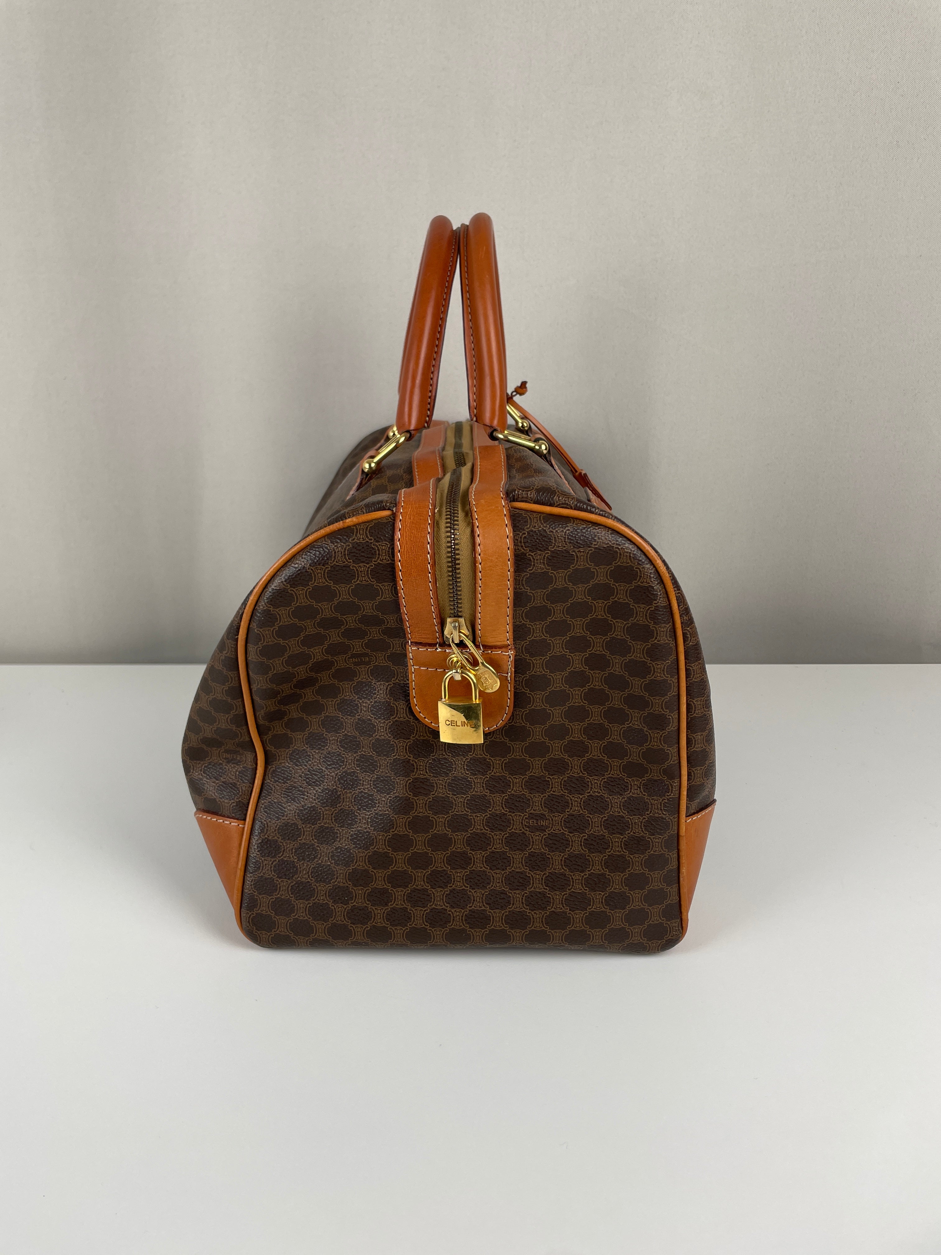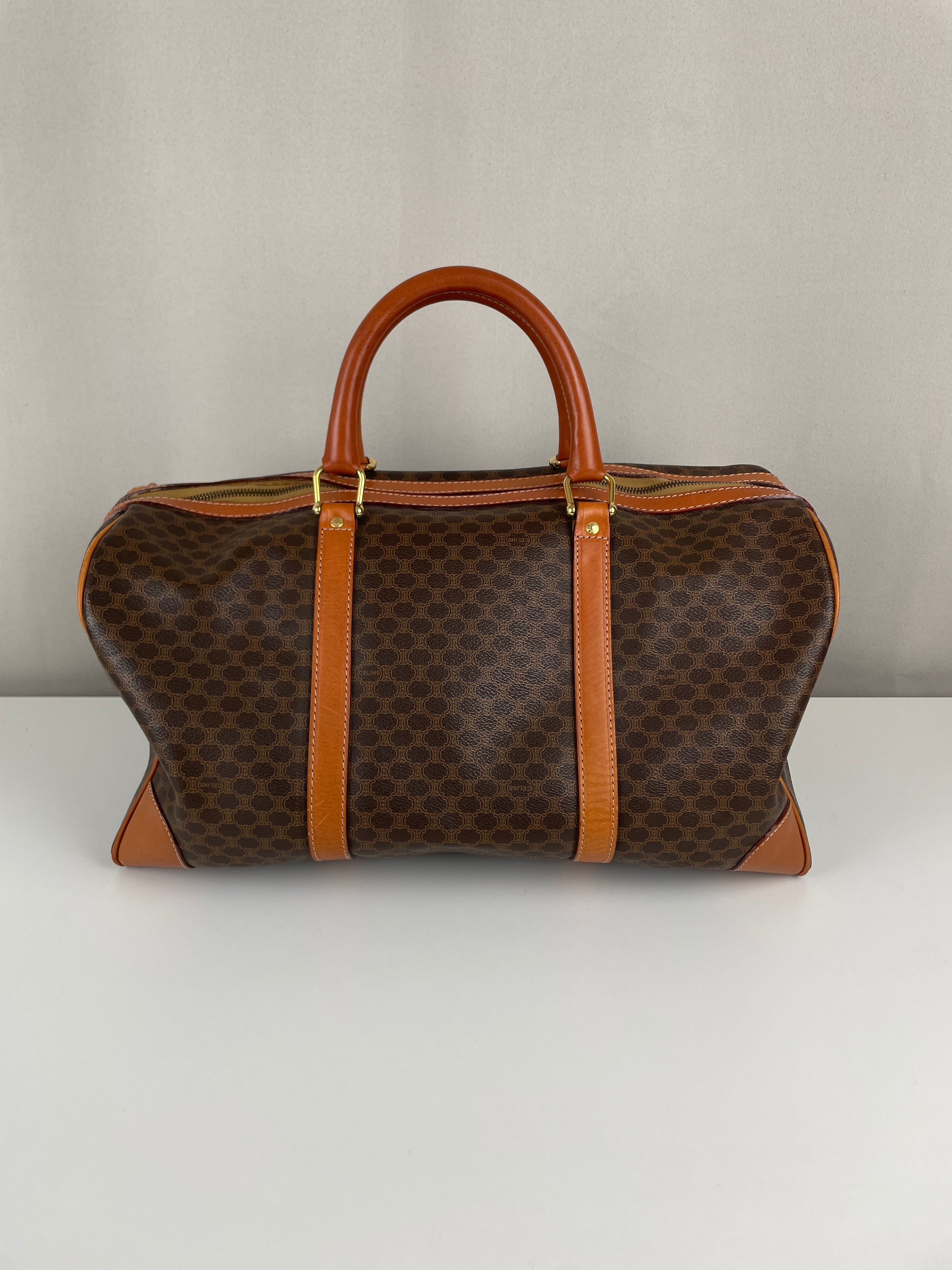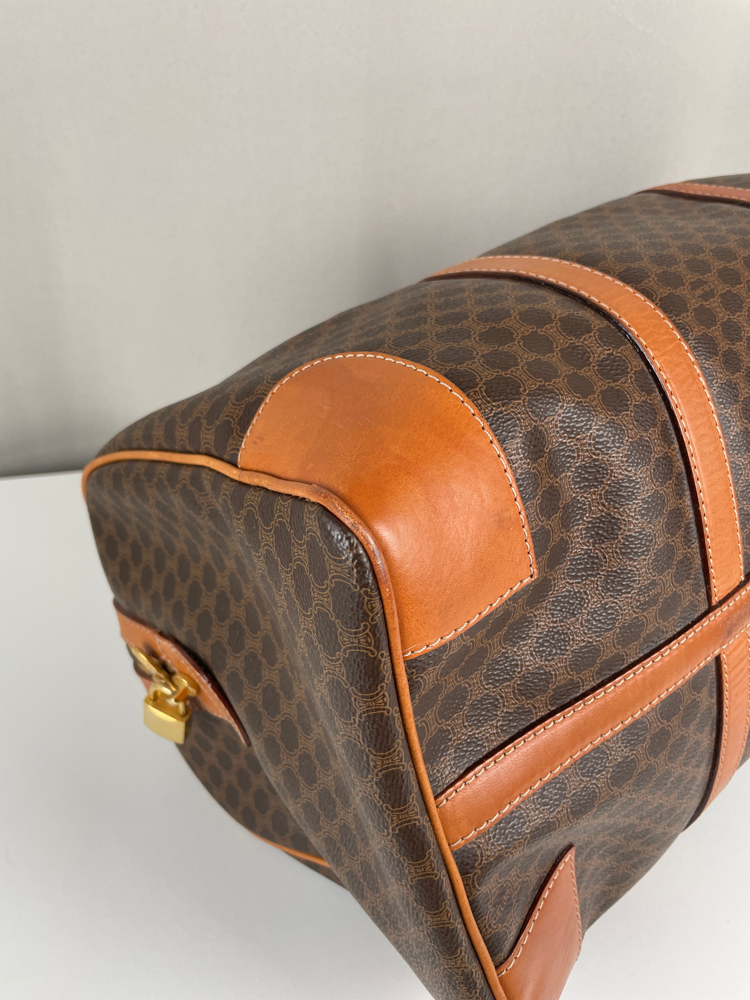 Ce sac de voyage Boston de la marque Céline est en très bon état. La toile macadam est en très bon état. Les coins sont un peu frottés. Le dessous du sac présente quelques traces d'usure. Les anses sont en très bon état. L'intérieur est en bon état, quelques petites traces mineures.