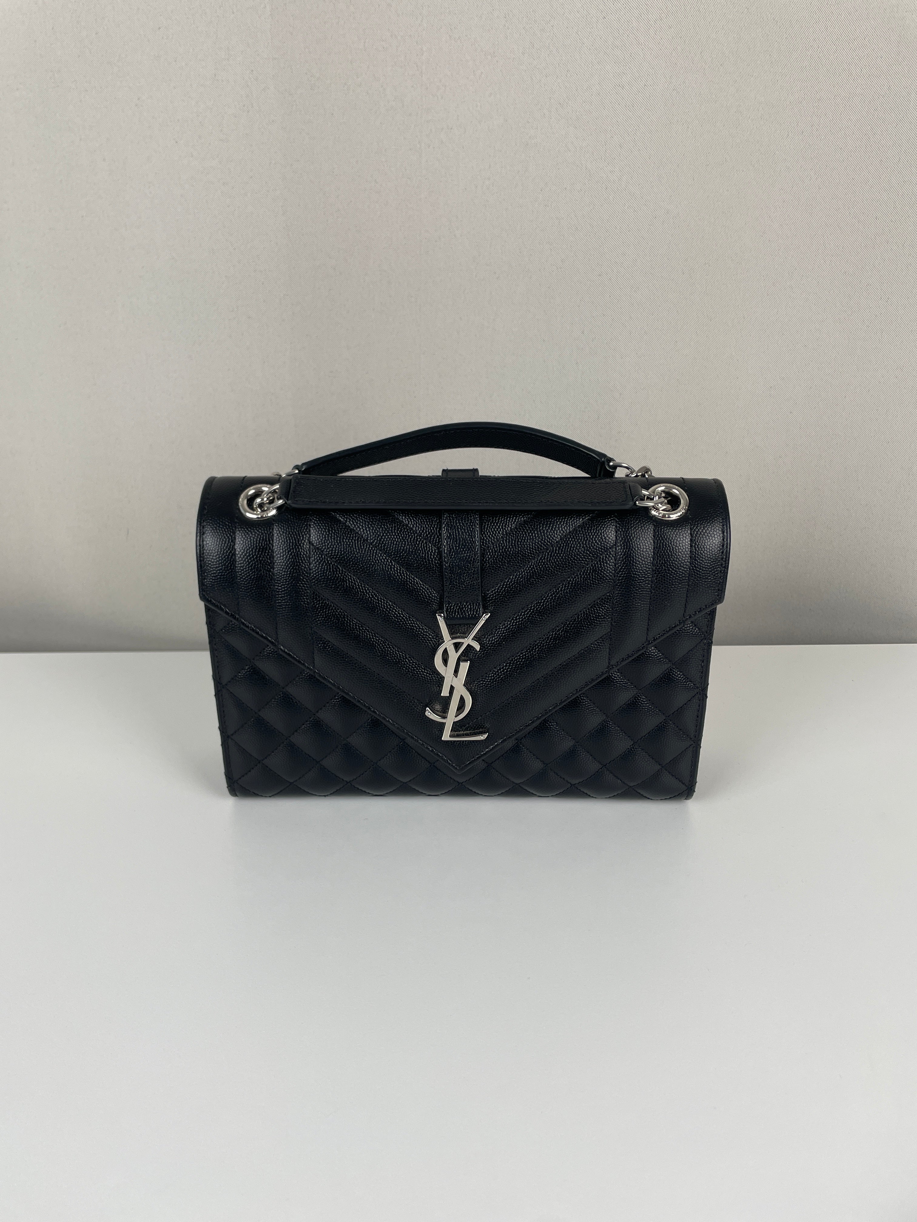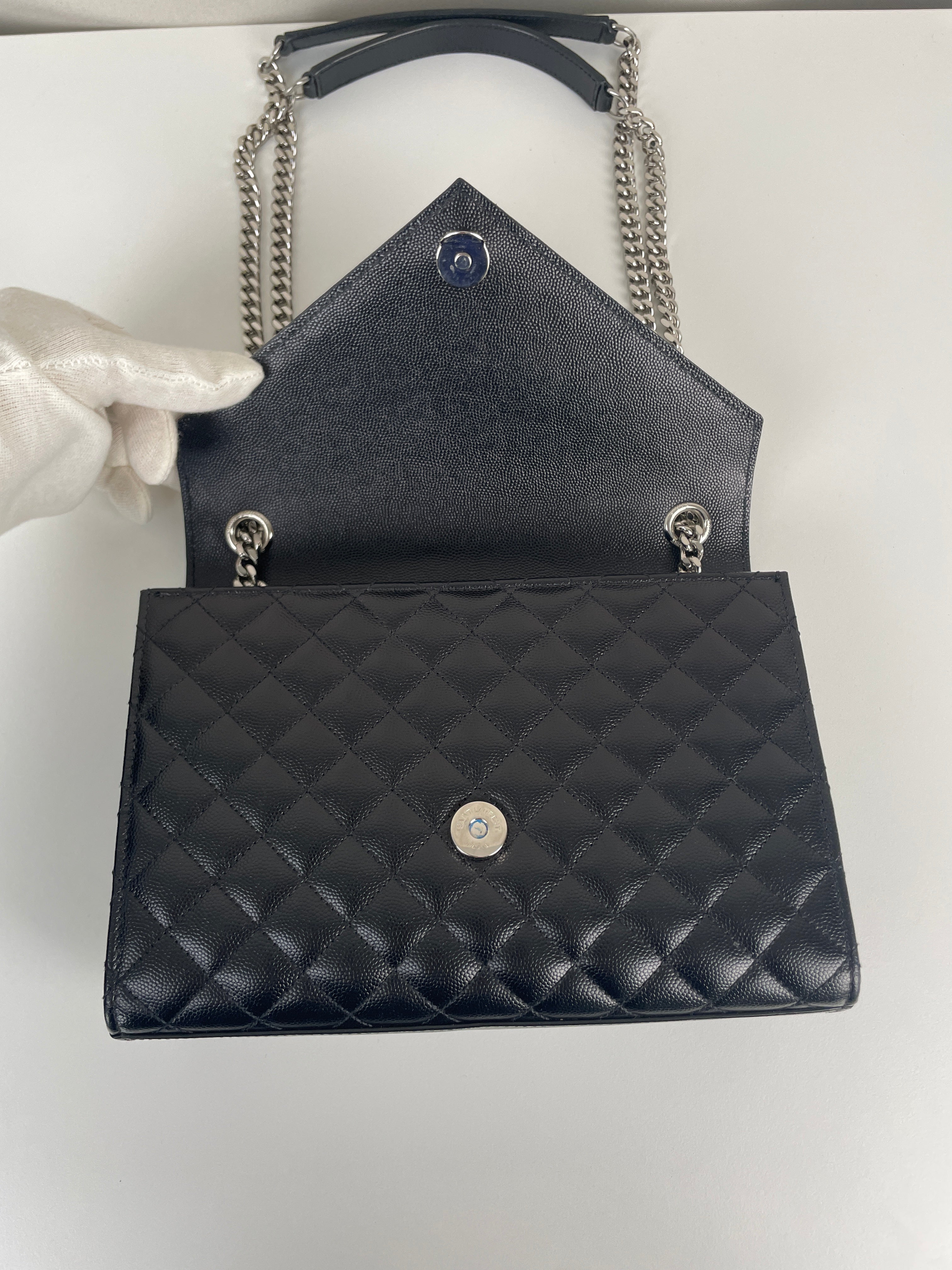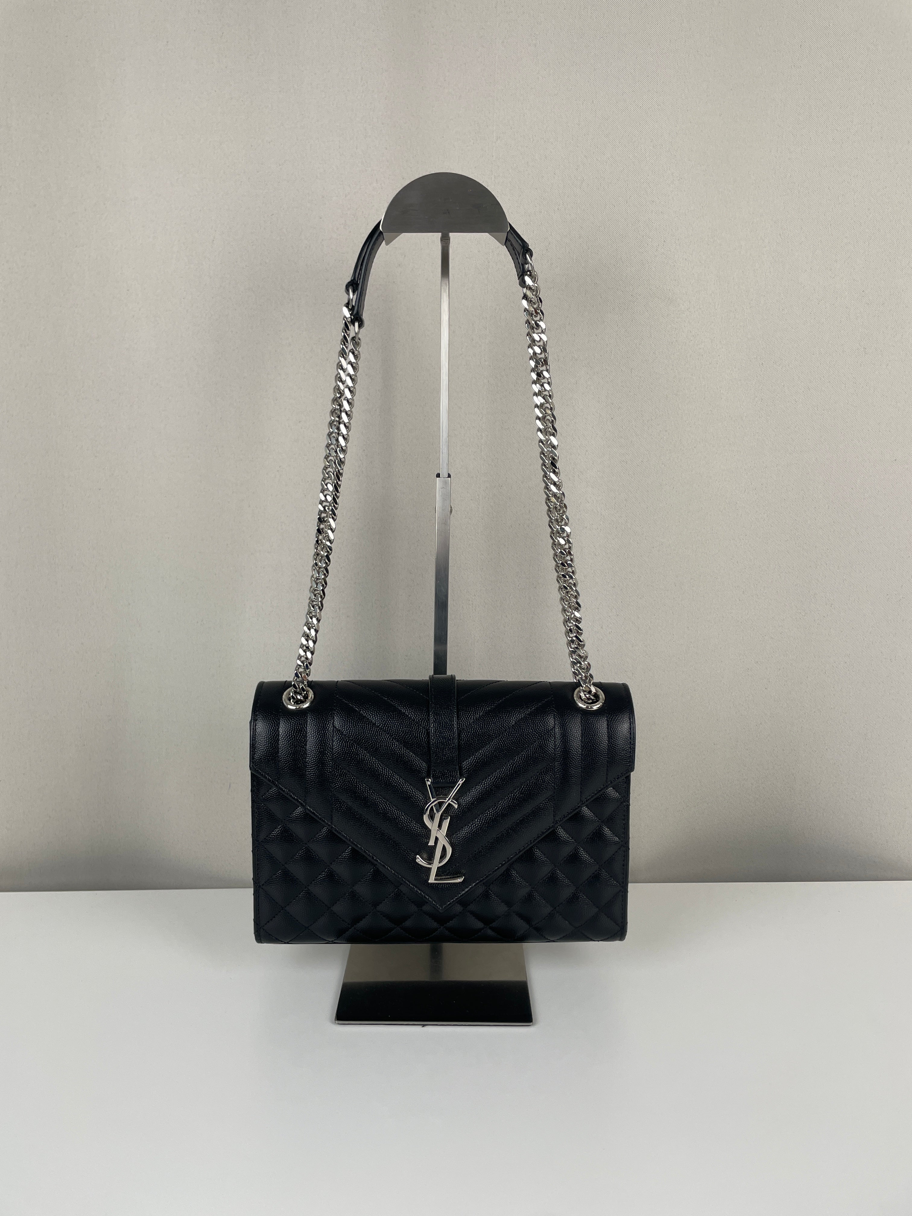 Ce sac bandoulière et porté épaule Enveloppe moyen Saint Laurent est en très bon état / parfait. Le cuir et les coins sont en parfait état. La bijouterie présente de mini rayures presque rien. L'intérieur est en parfait état.
