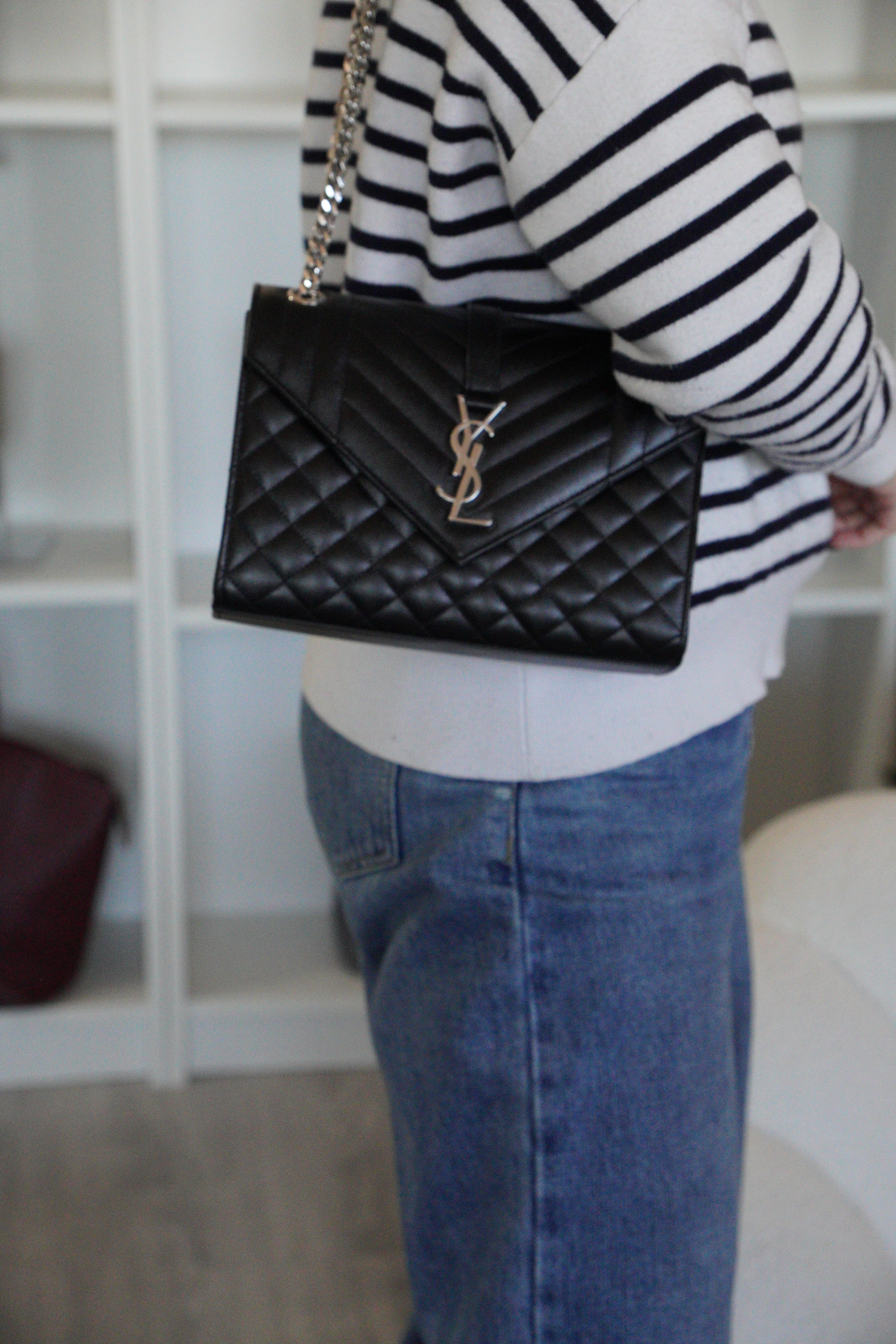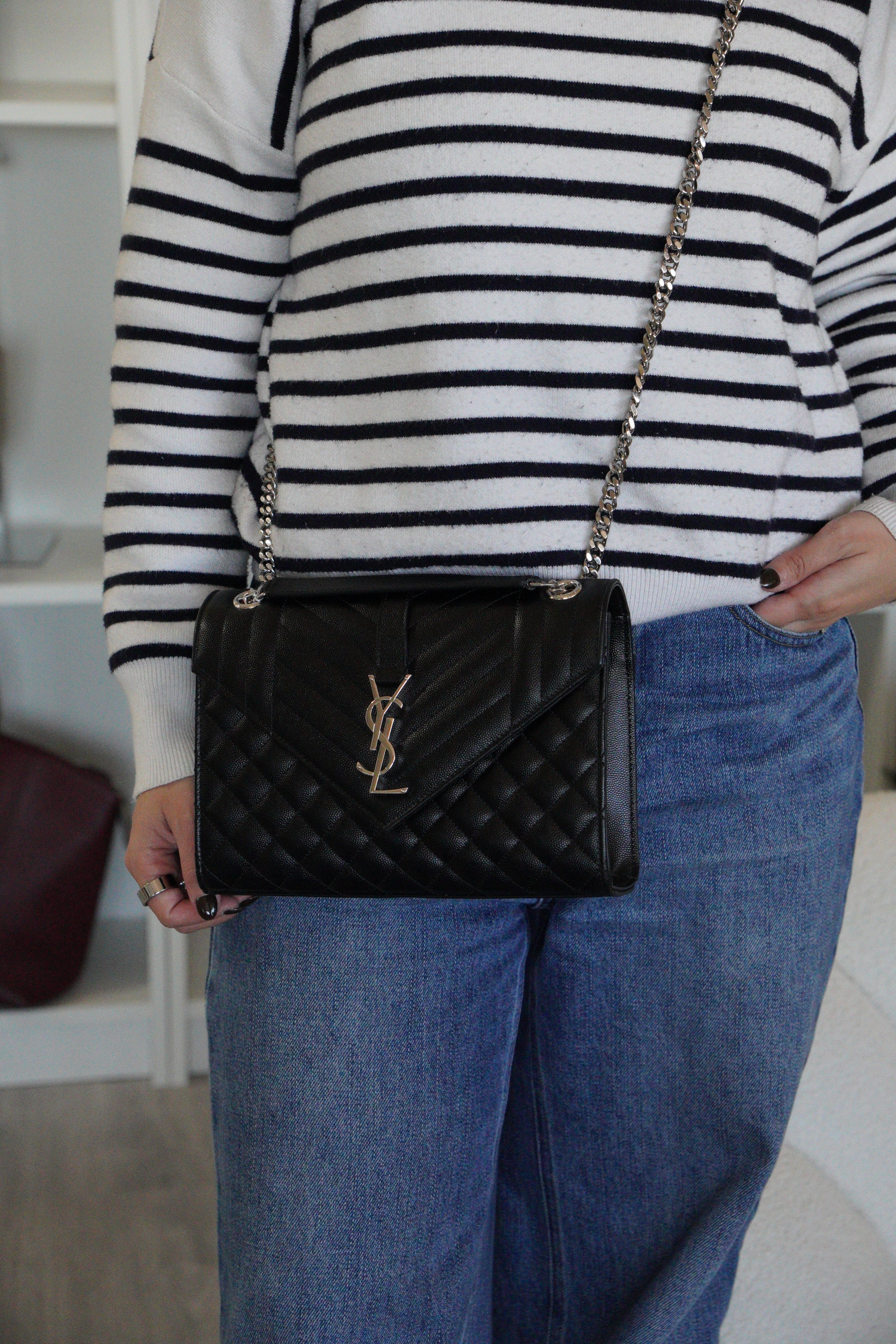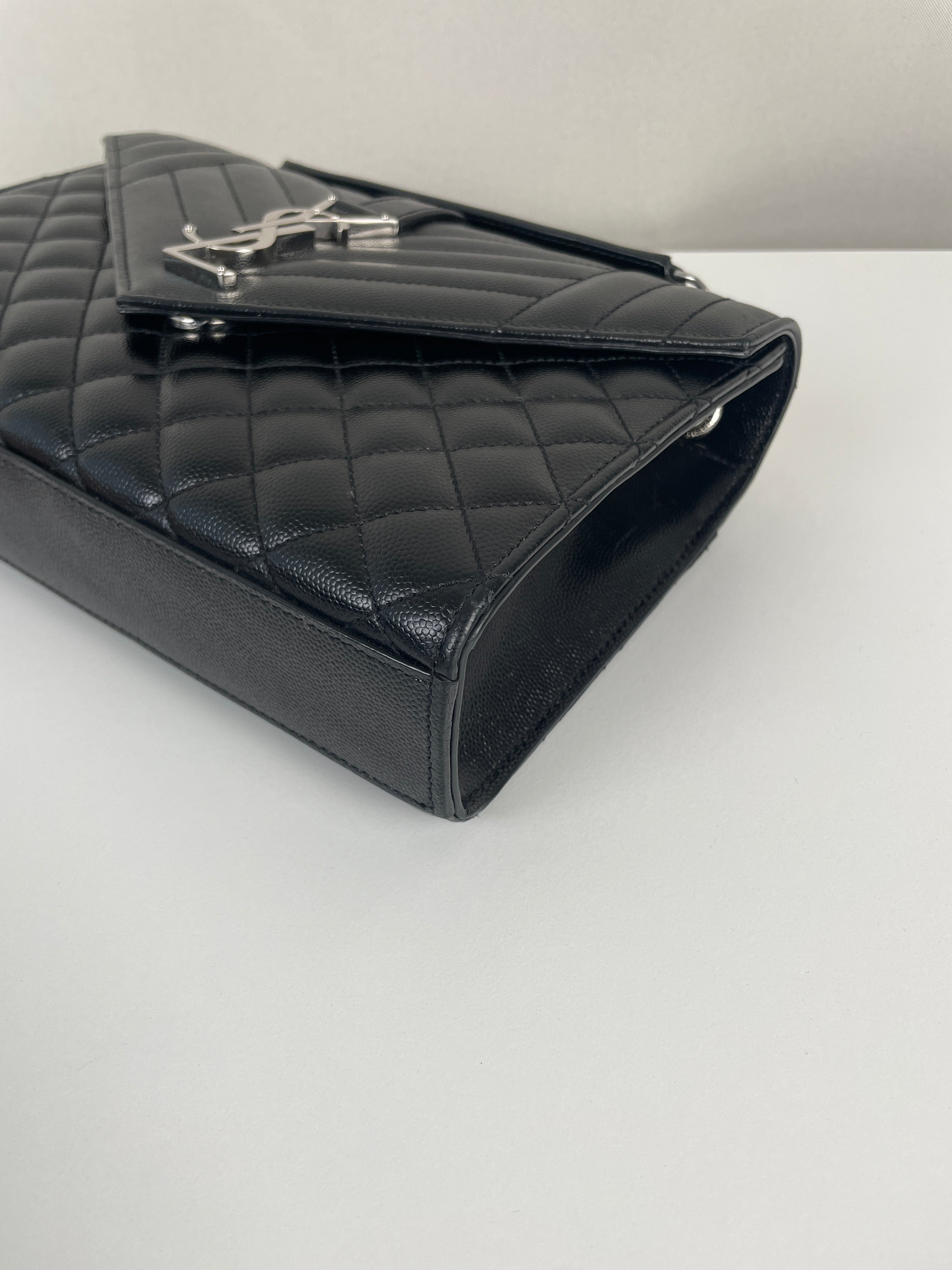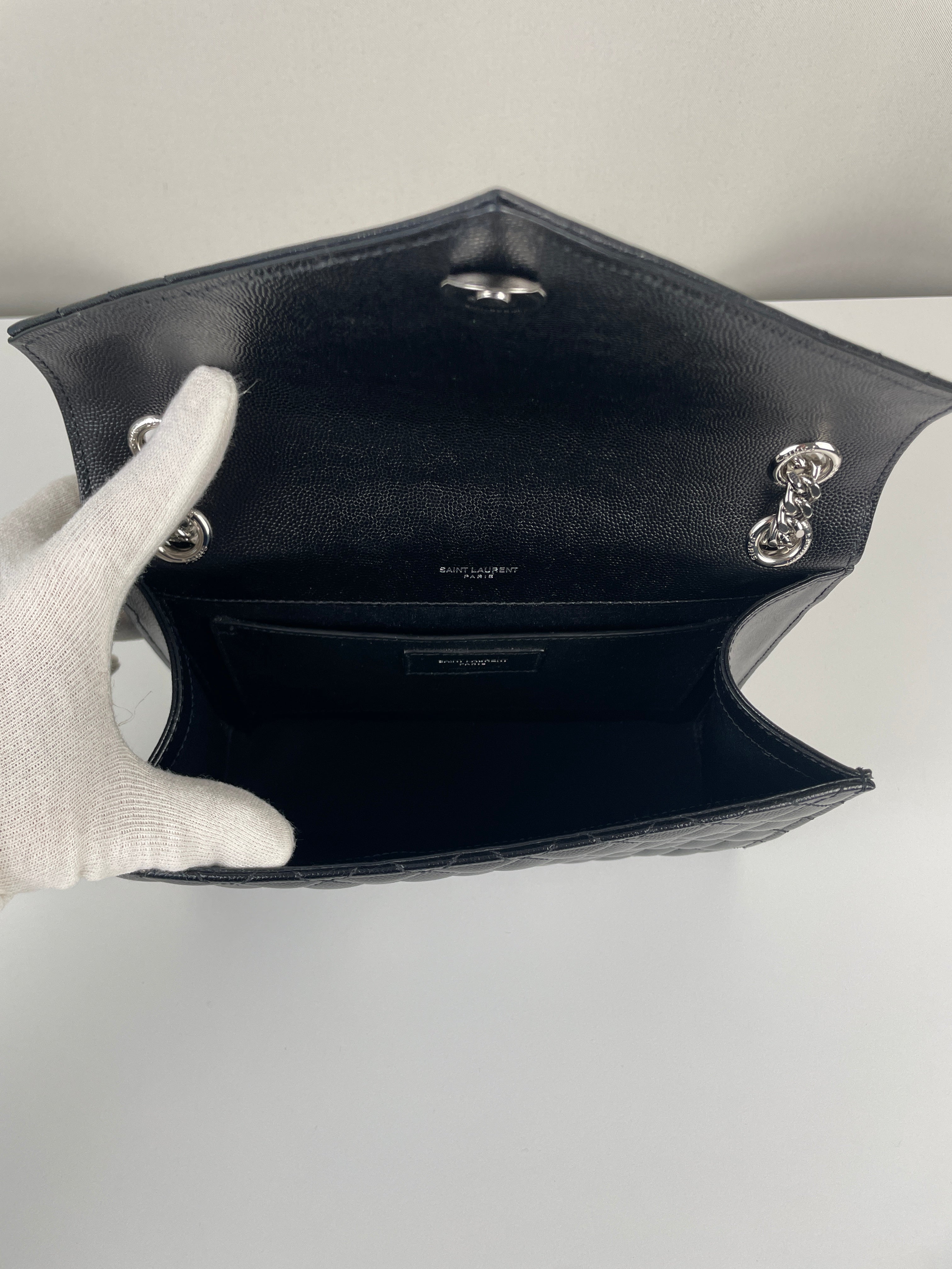 Ce sac bandoulière et porté épaule Enveloppe moyen Saint Laurent est en très bon état / parfait. Le cuir et les coins sont en parfait état. La bijouterie présente de mini rayures presque rien. L'intérieur est en parfait état.