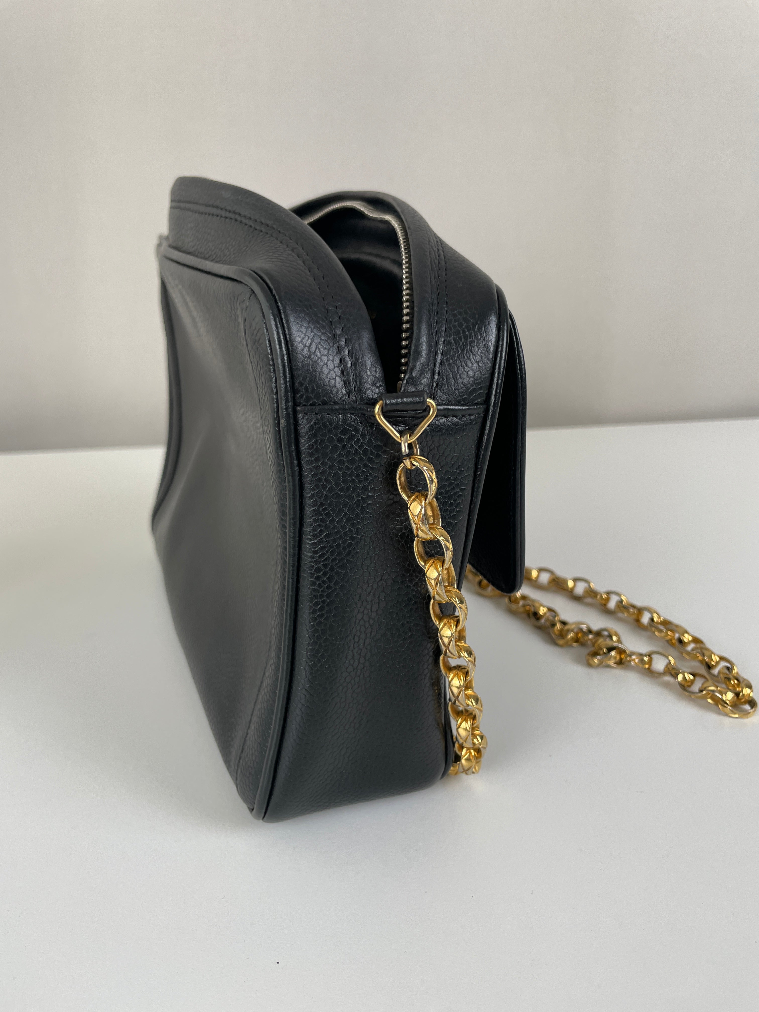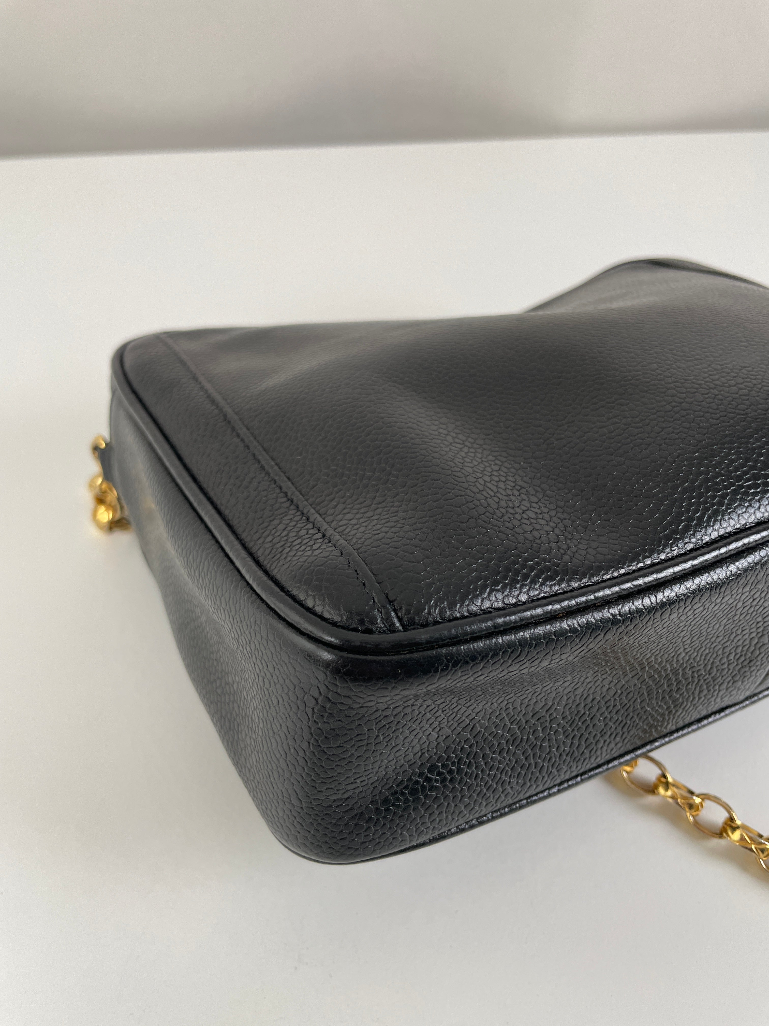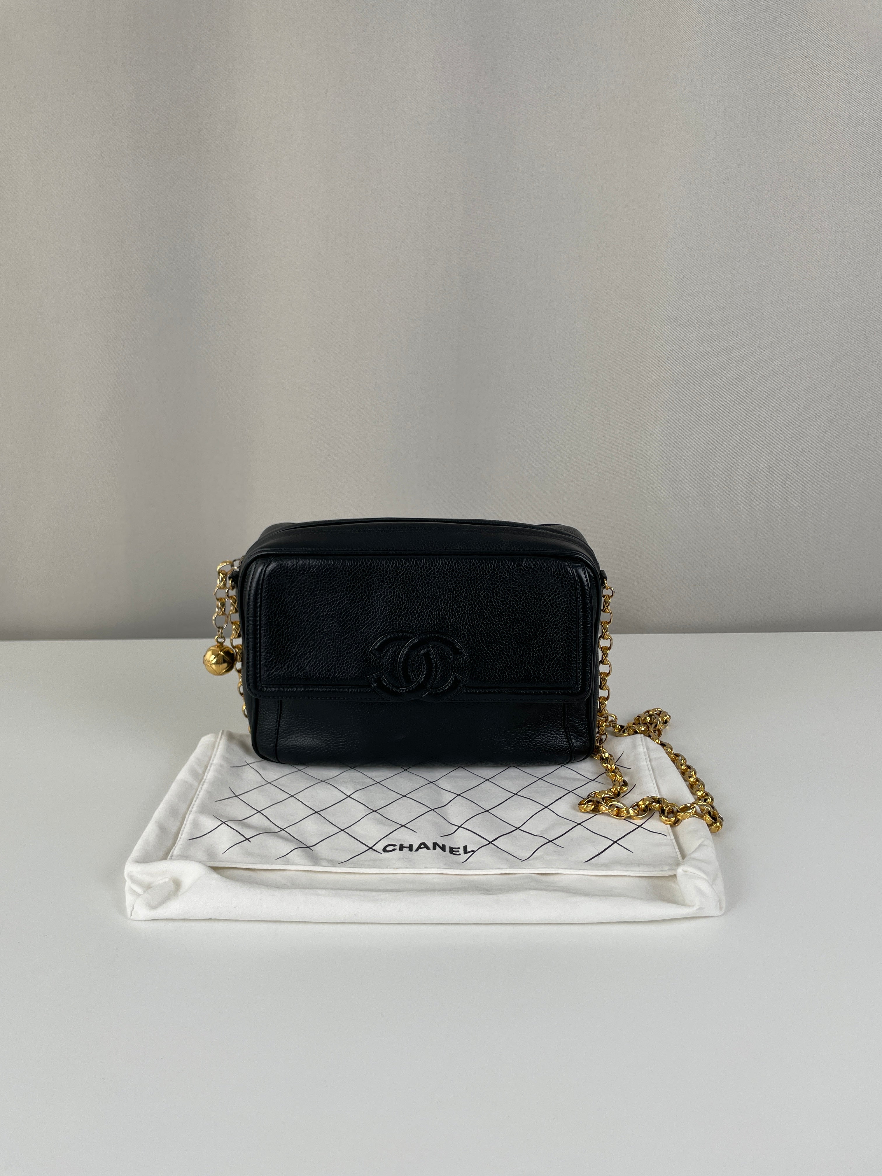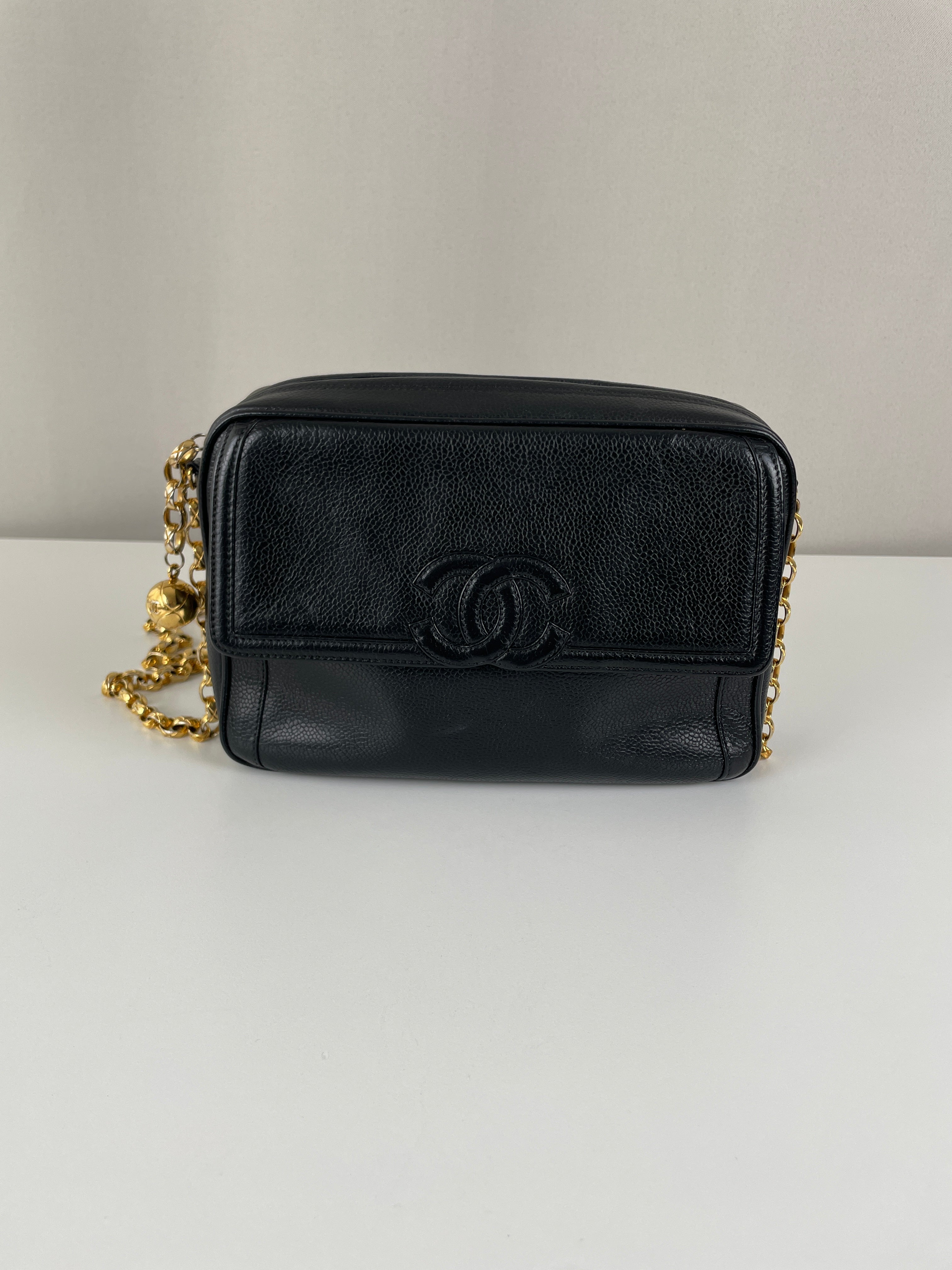 Ce sac caméra Chanel est en bon, voire très bon état. Il a été légèrement porté, le cuir est donc légèrement usé. L'intérieur est en bon état, il a été porté, et présentes des traces et est un peu abîmé mais léger.. Une pièce rare en cuir grainé. La bandoulière est légèrement terni de manière très naturel du à l'age du sac.
