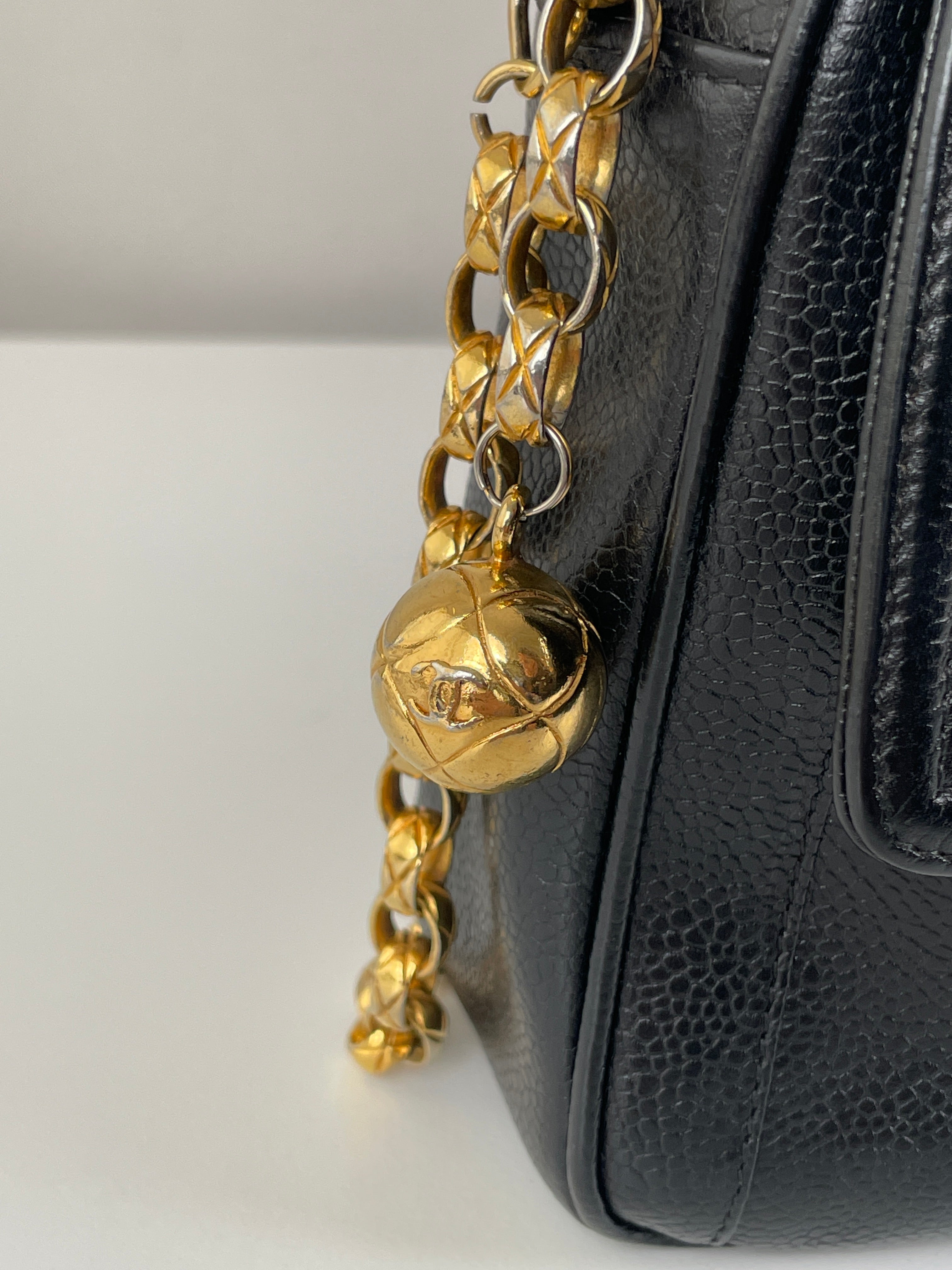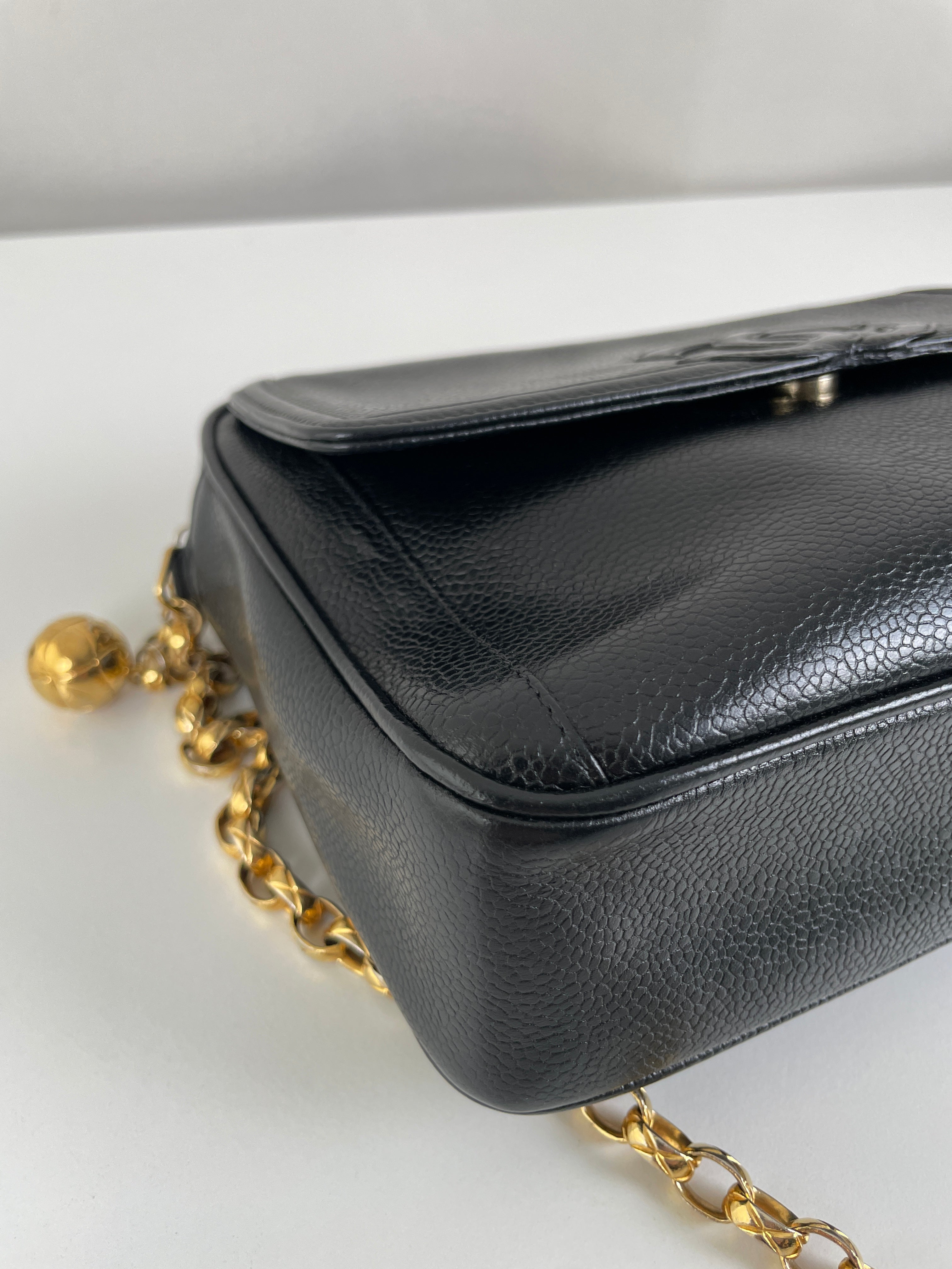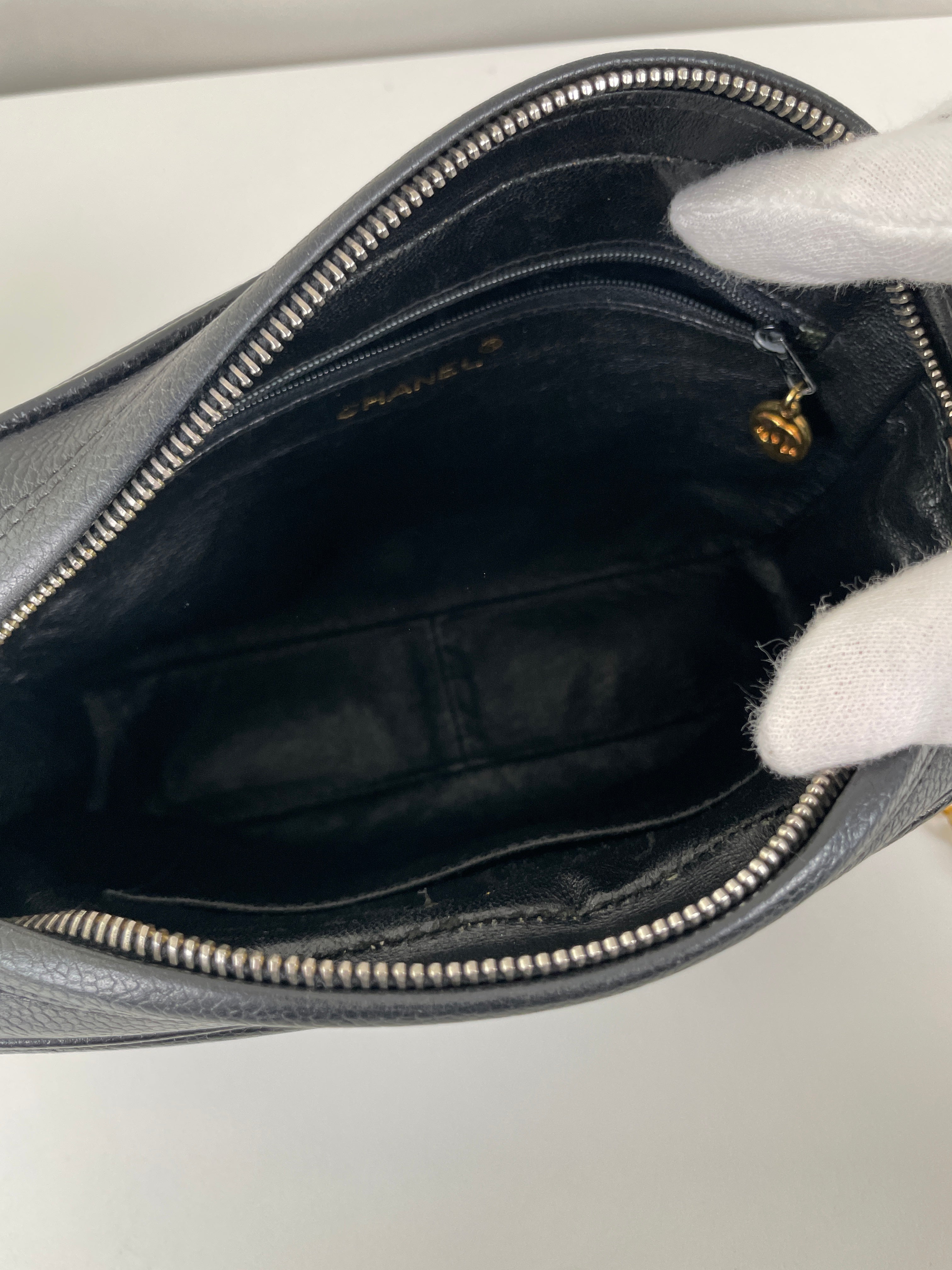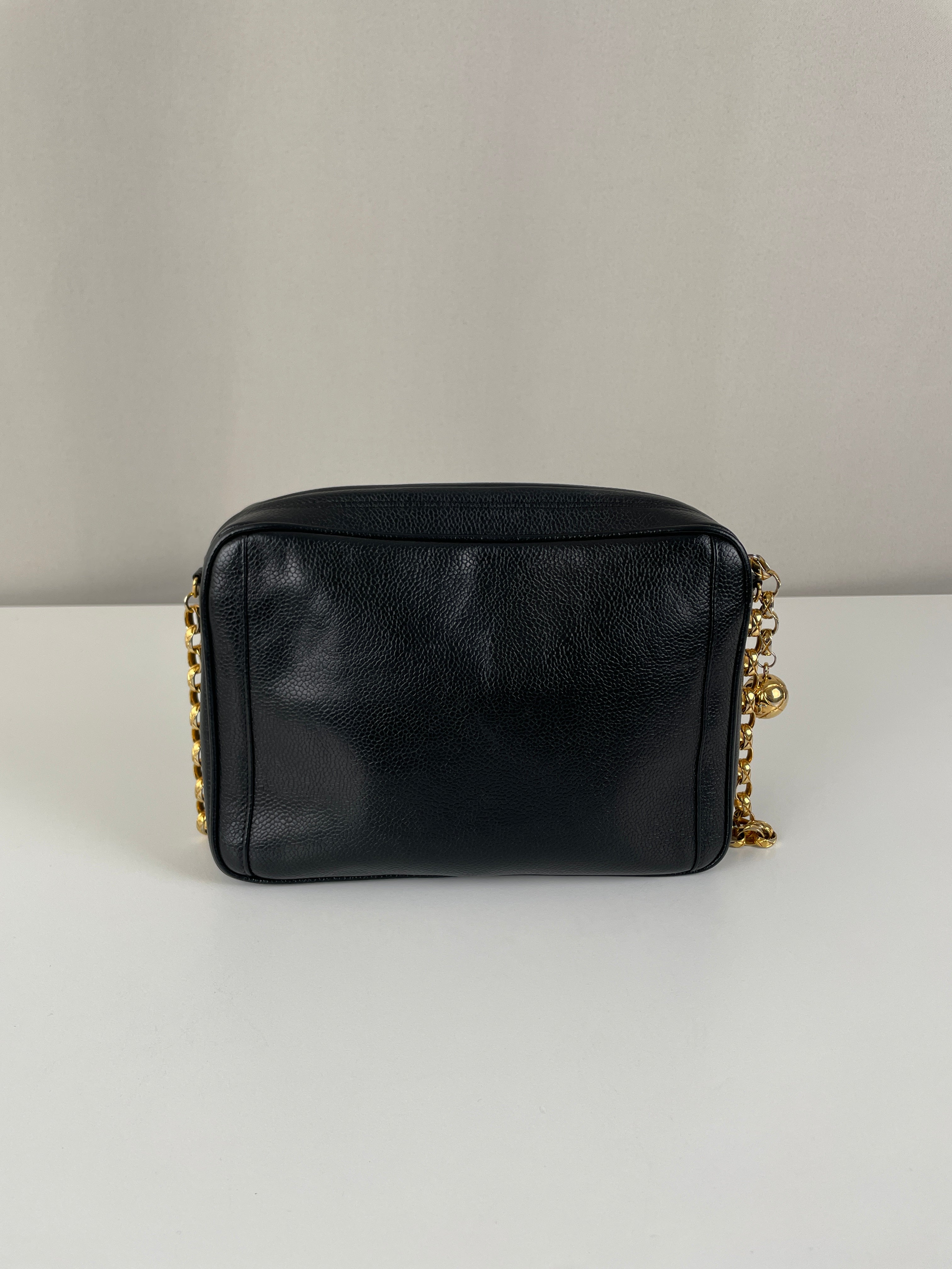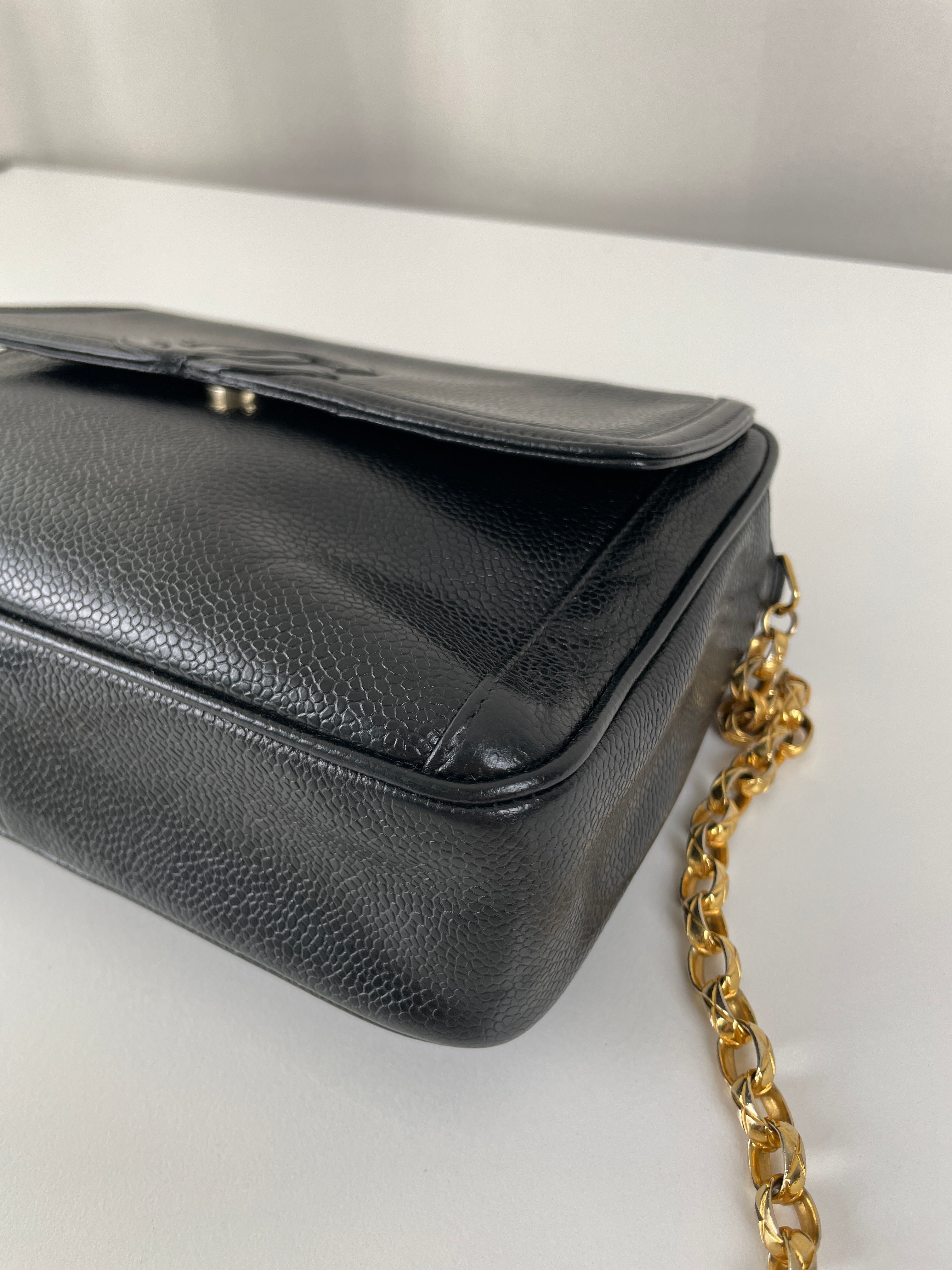 Ce sac caméra Chanel est en bon, voire très bon état. Il a été légèrement porté, le cuir est donc légèrement usé. L'intérieur est en bon état, il a été porté, et présentes des traces et est un peu abîmé mais léger.. Une pièce rare en cuir grainé. La bandoulière est légèrement terni de manière très naturel du à l'age du sac.