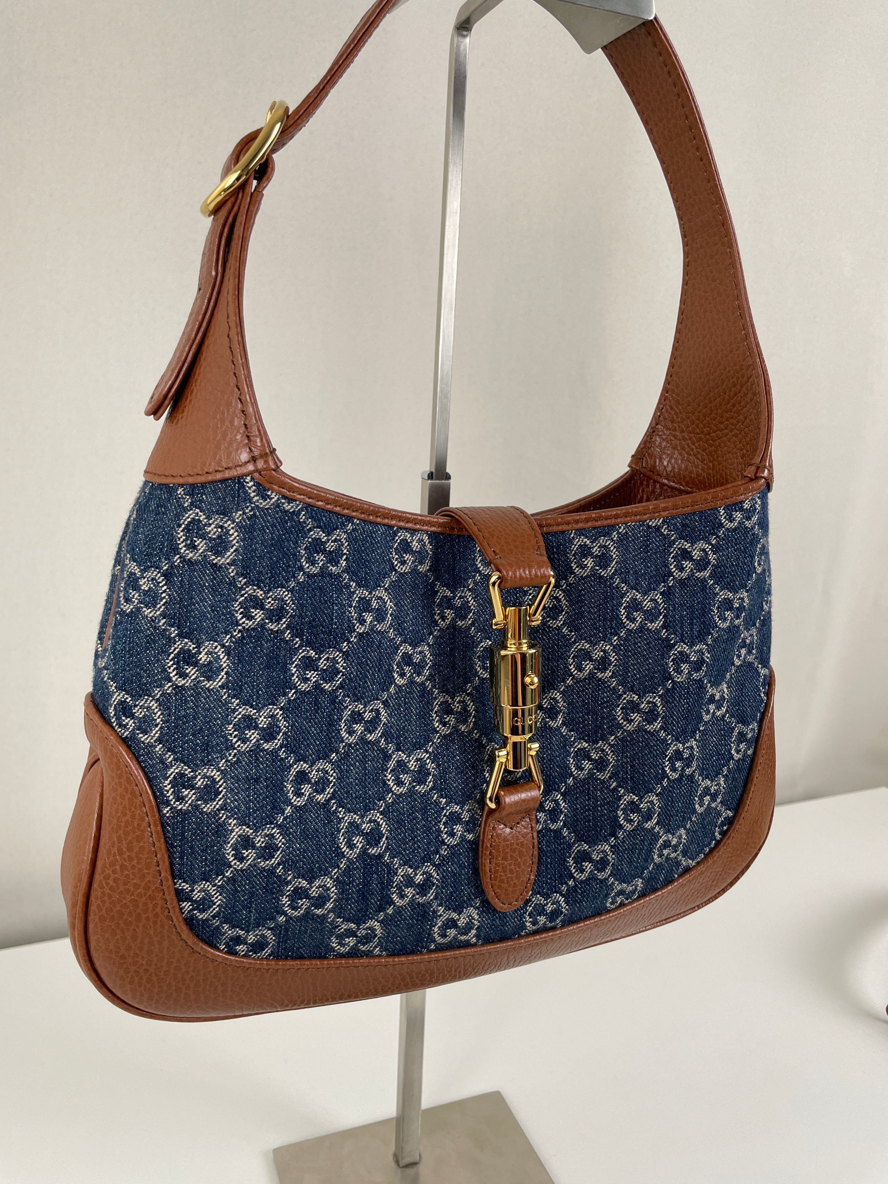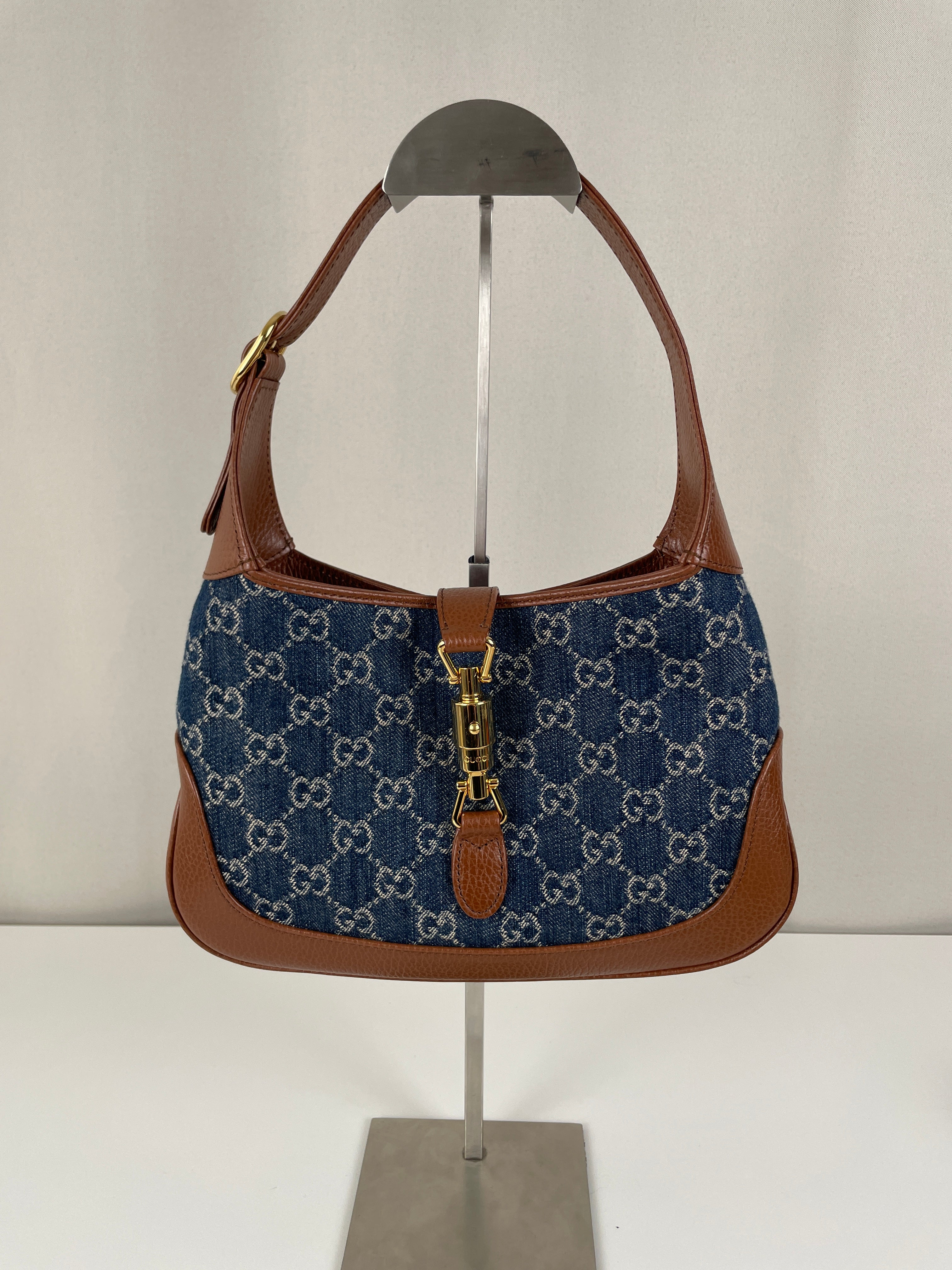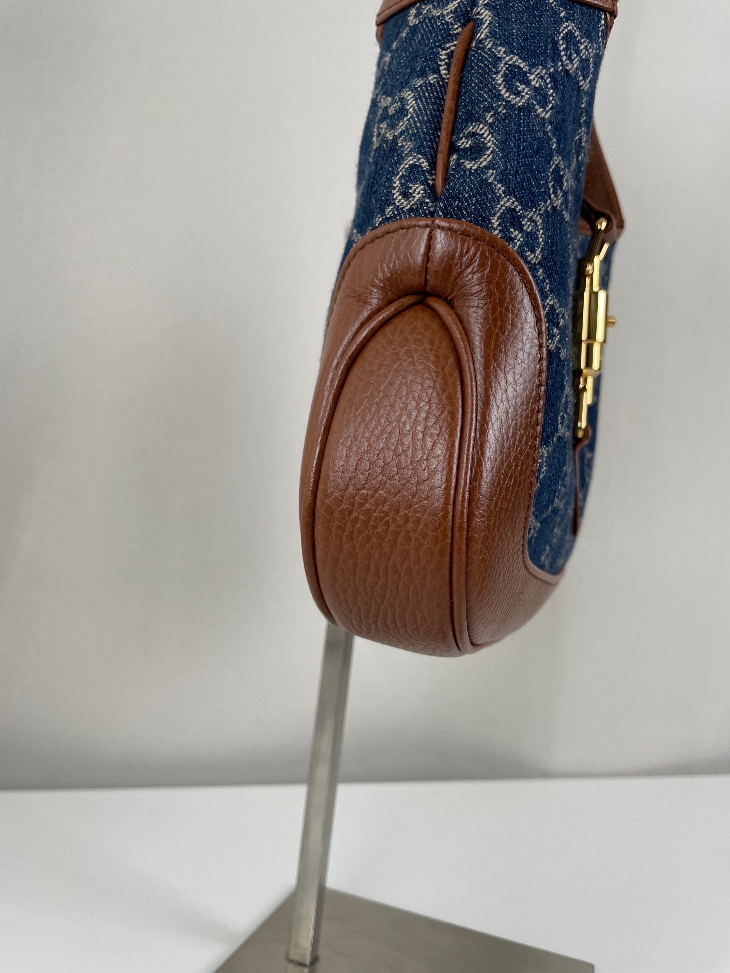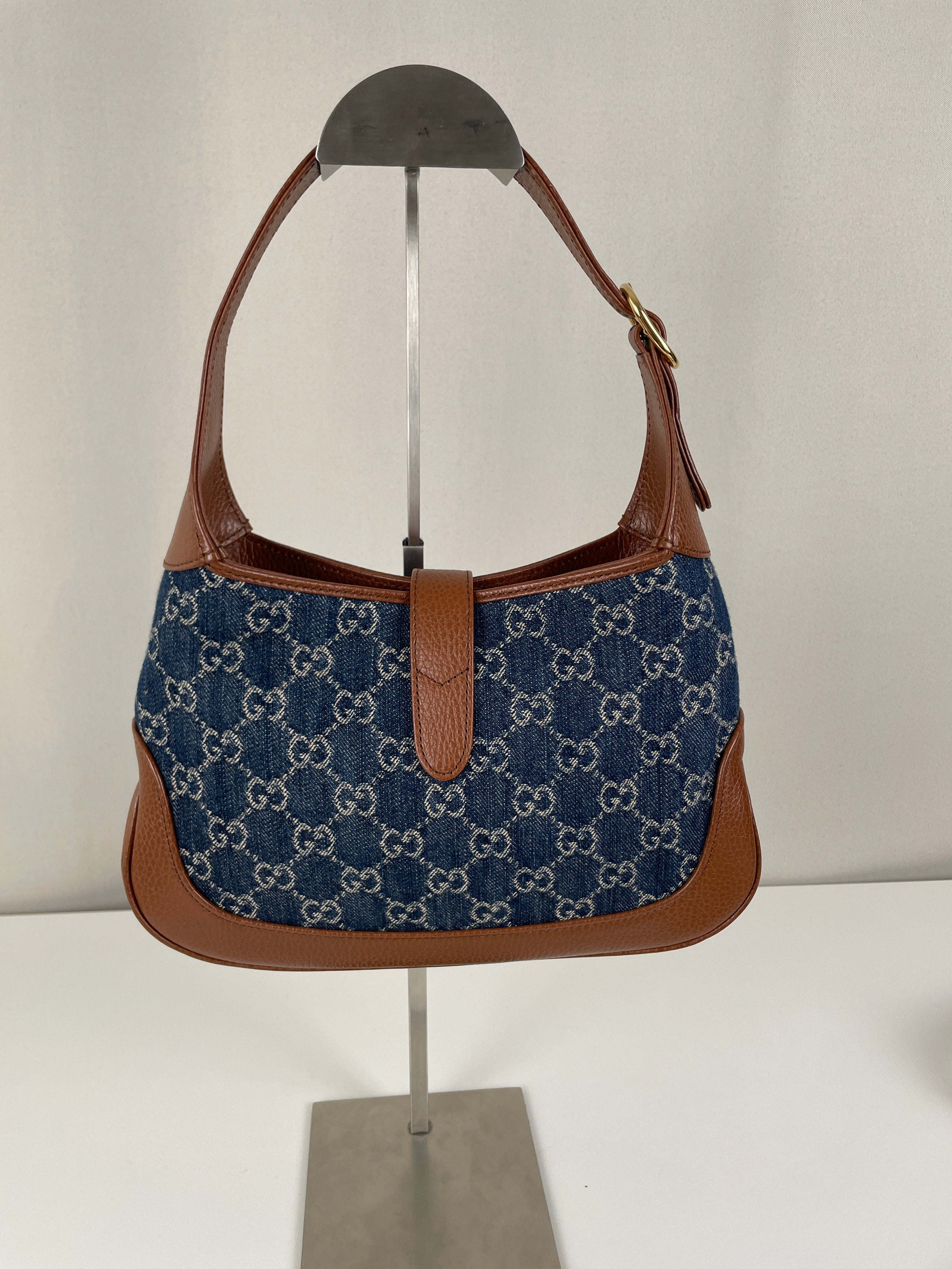 Ce sac en jean Gucci GG est comme neuf. Il est en très bon état, tout comme les parties en cuir. L'intérieur est également en très bon état. Il est doté d'une bandoulière réglable pour le porter en bandoulière.