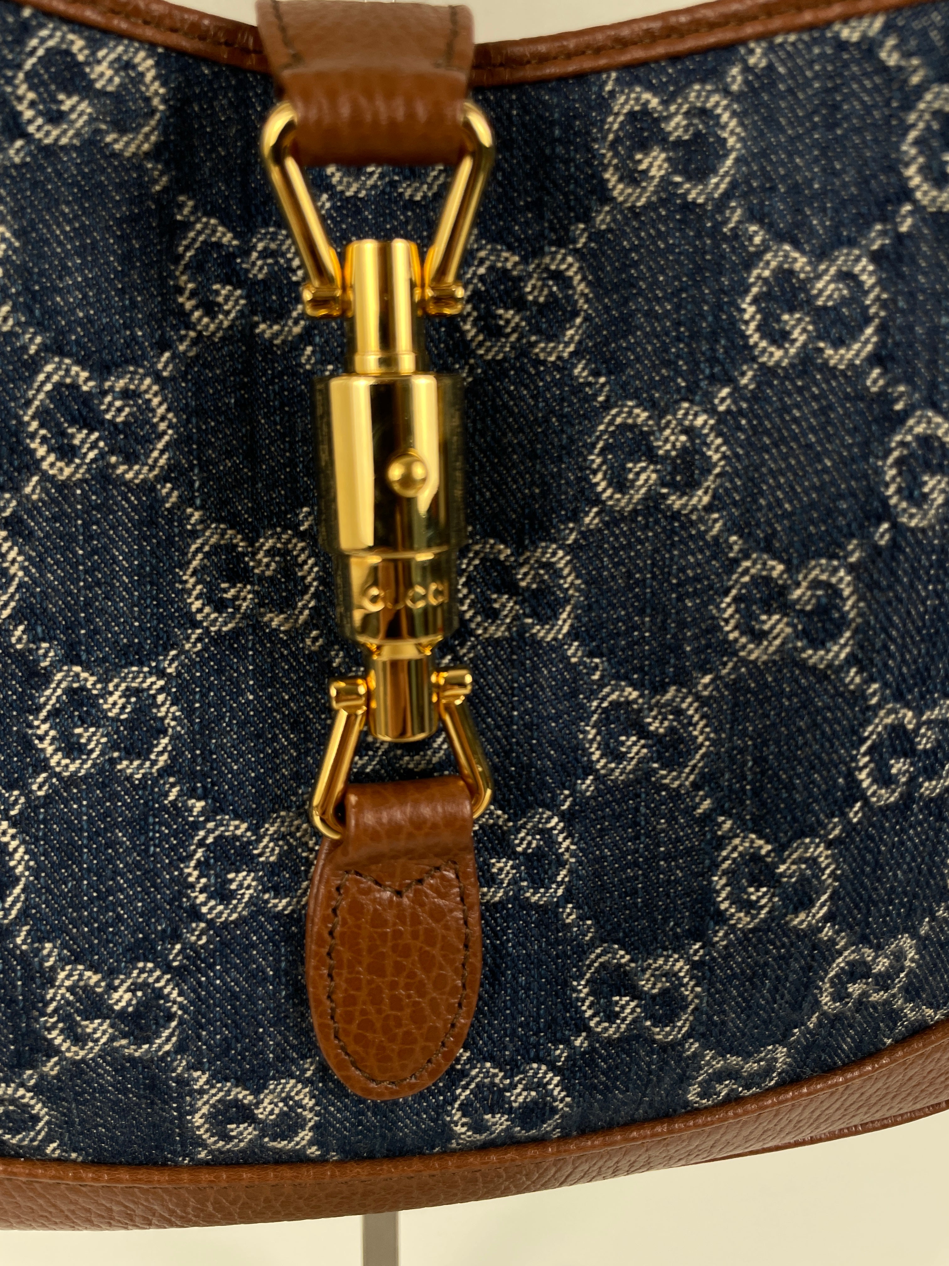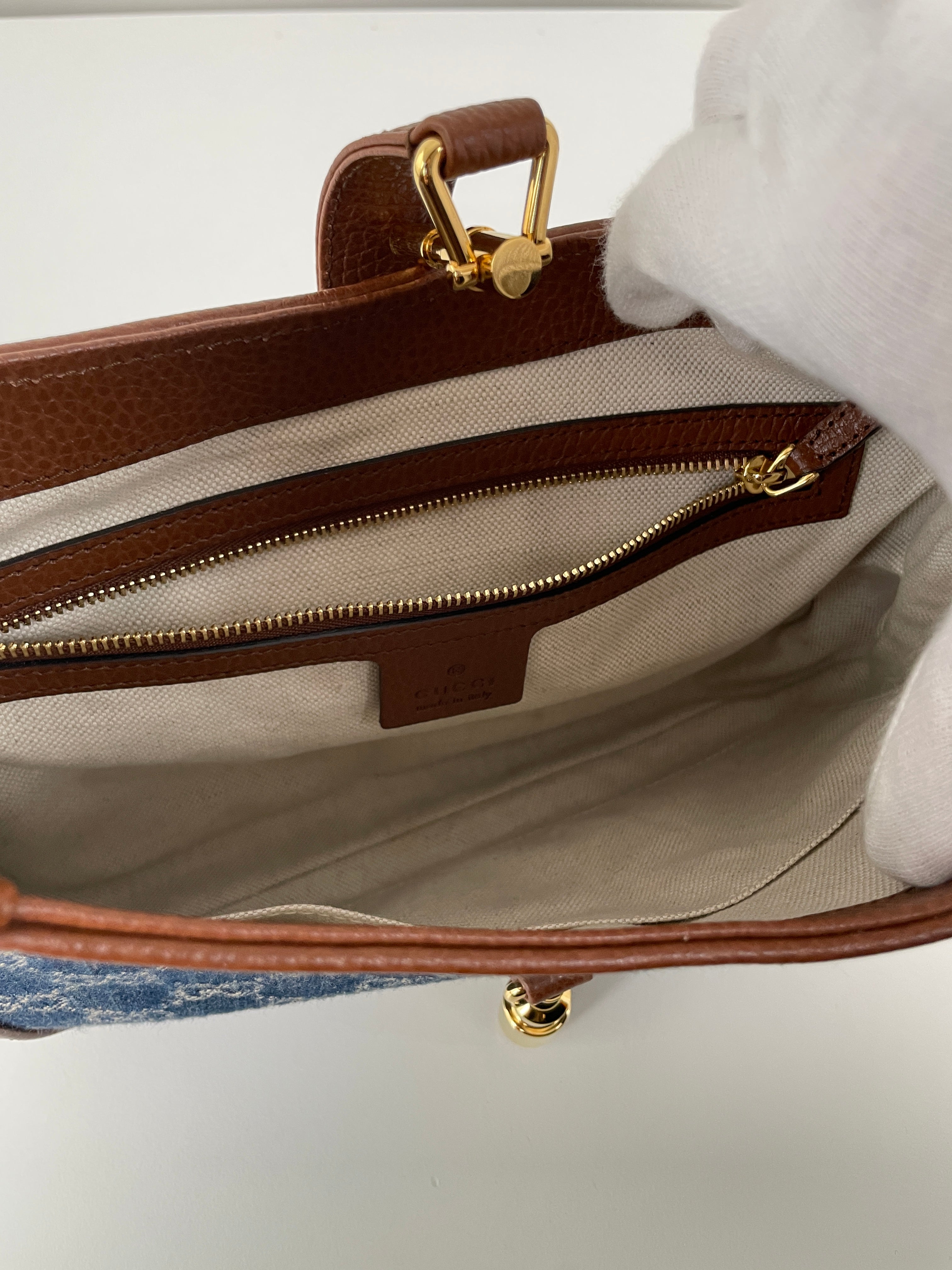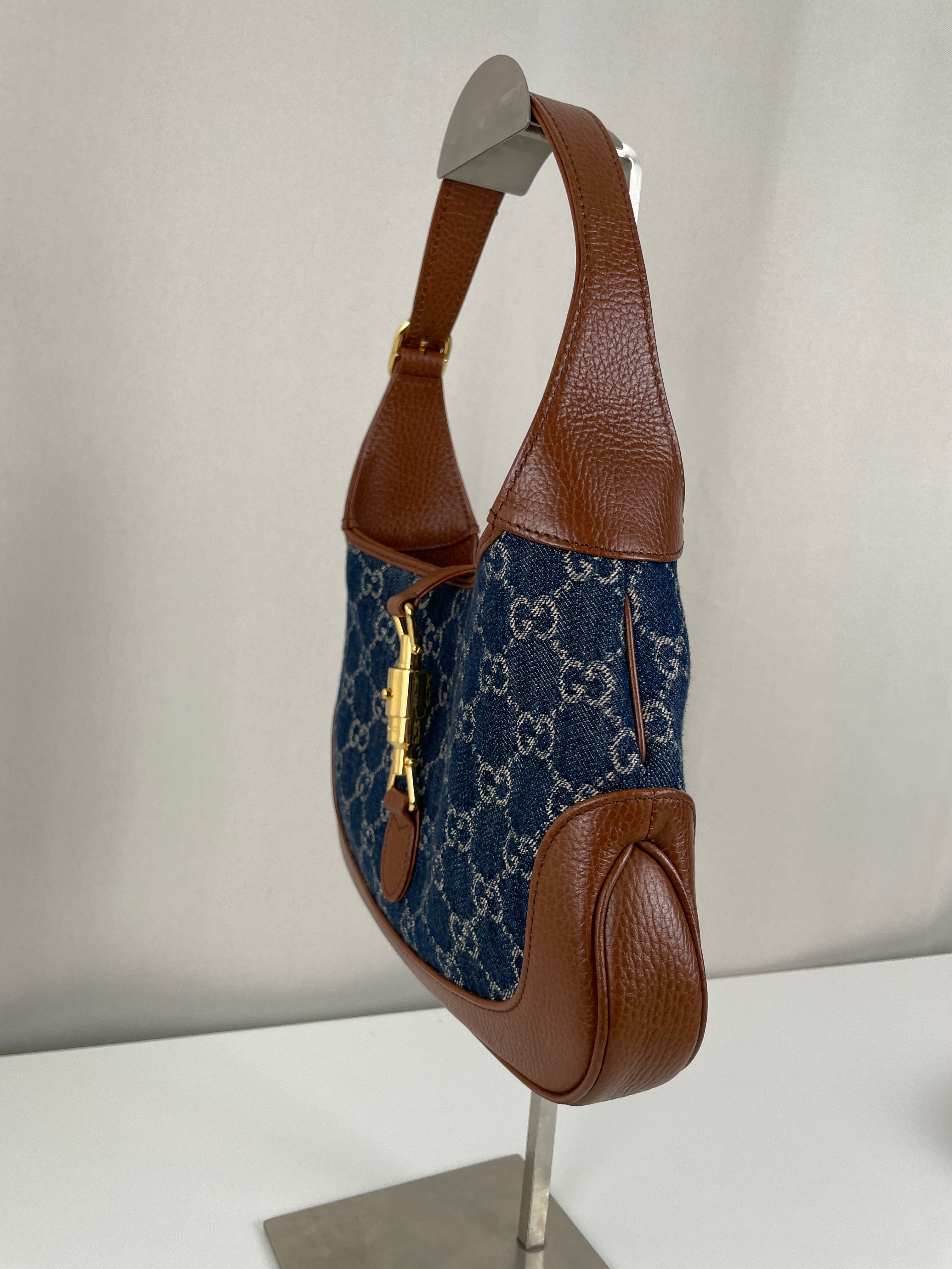 Ce sac en jean Gucci GG est comme neuf. Il est en très bon état, tout comme les parties en cuir. L'intérieur est également en très bon état. Il est doté d'une bandoulière réglable pour le porter en bandoulière.