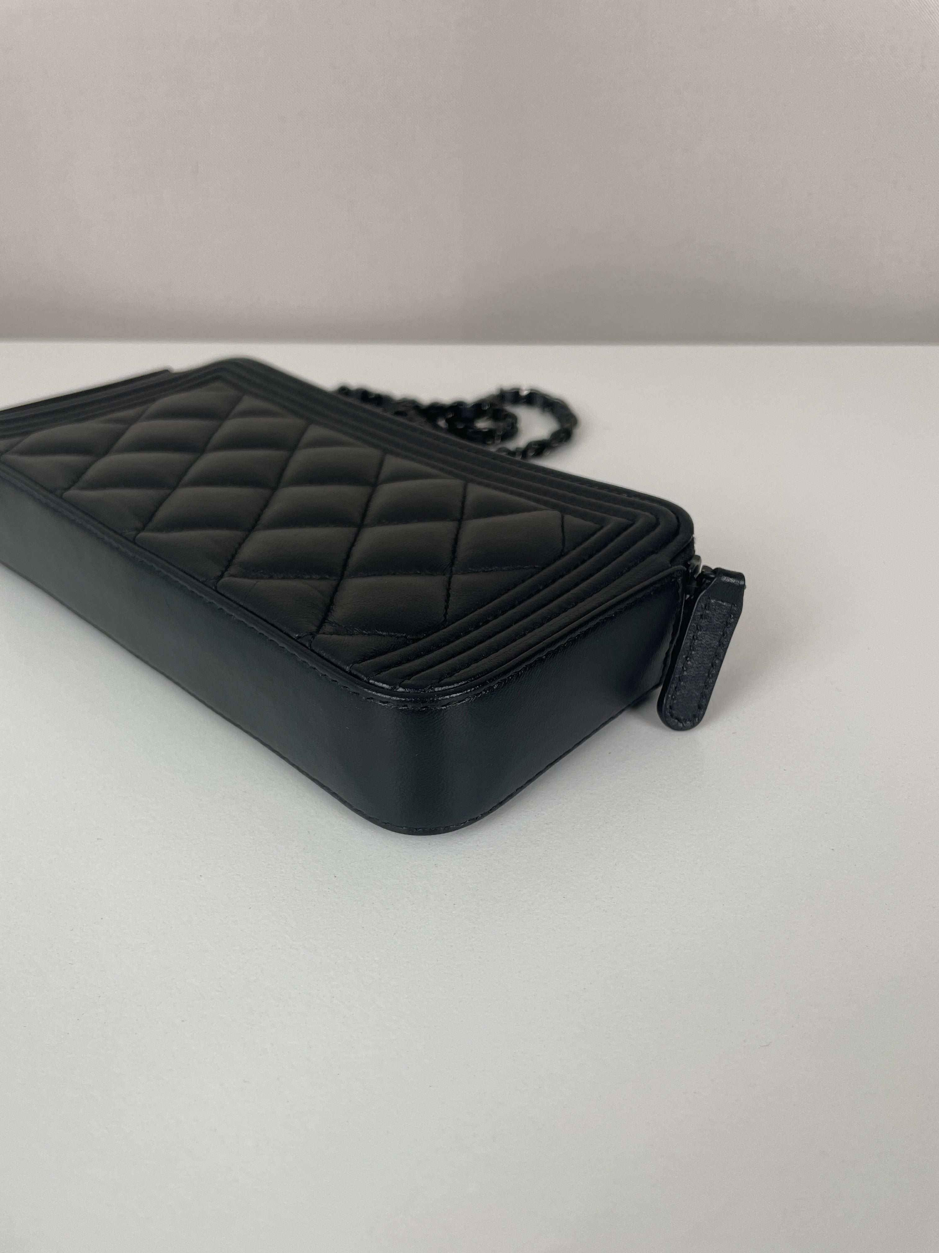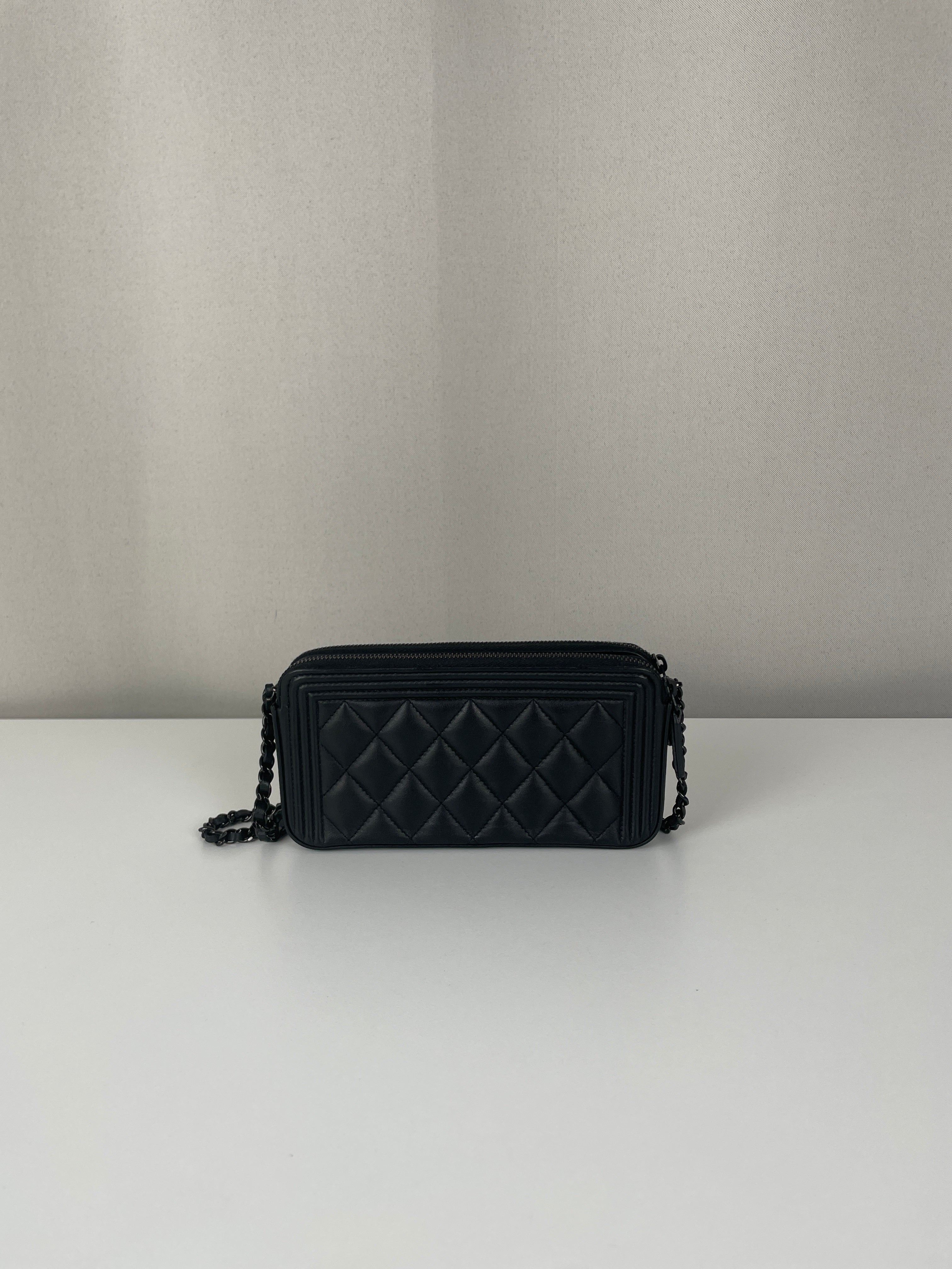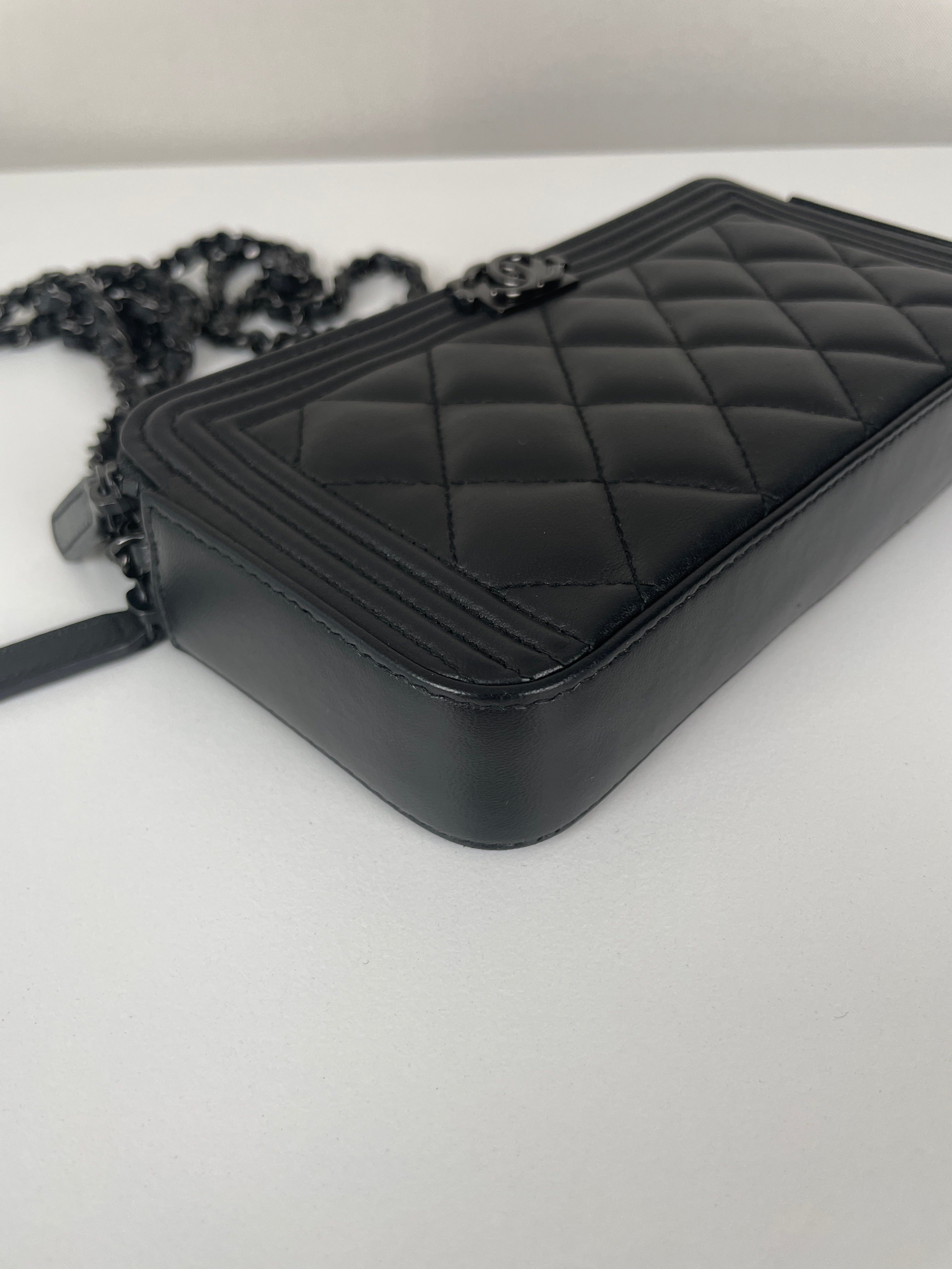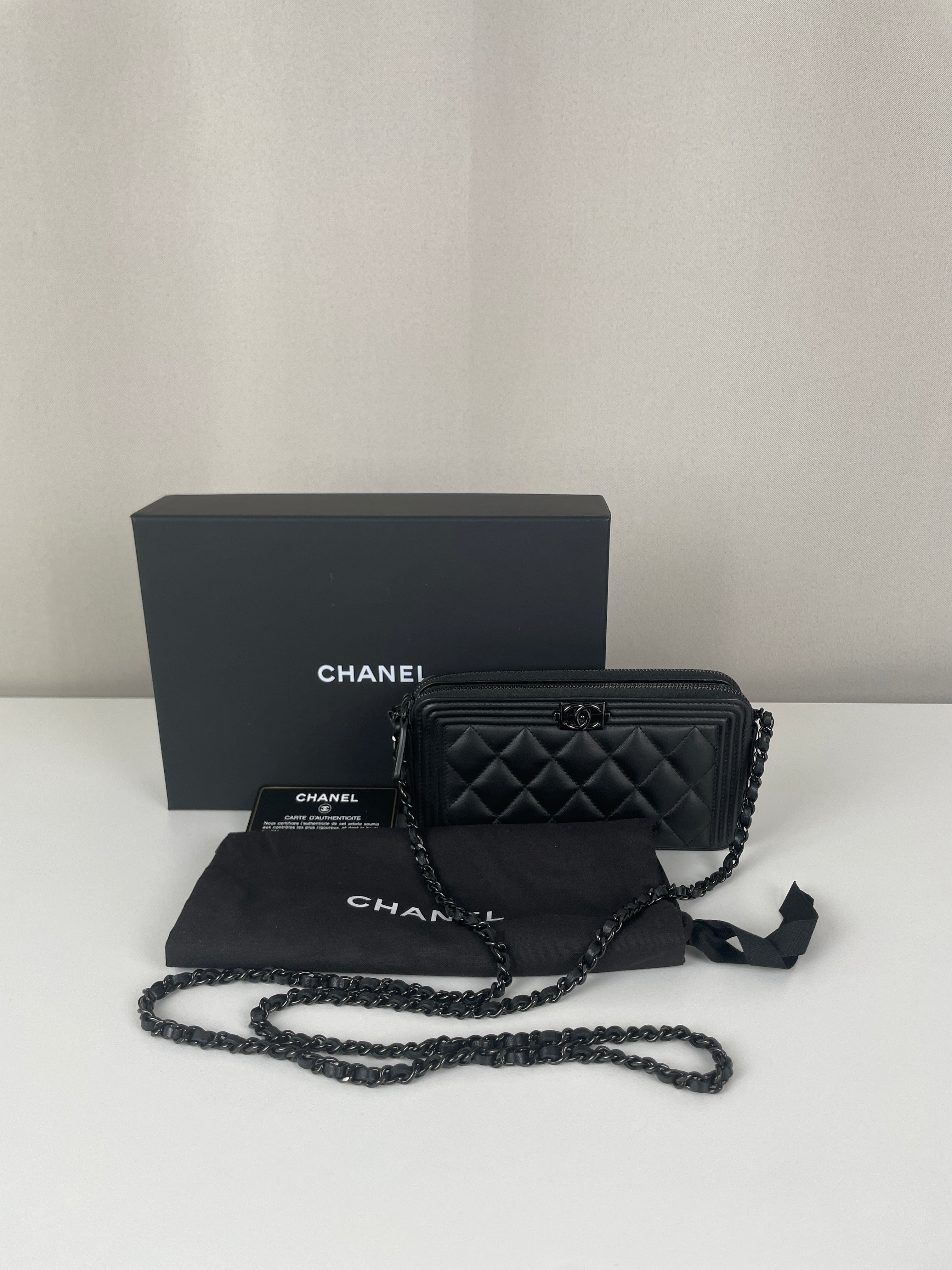 Ce Chanel WOC Boy en noir total de 2017-2018 est absolument magnifique - le design Boy apporte une touche si moderne et audacieuse au portefeuille sur chaîne classique. Le look tout noir avec bijouterie argentée est si chic et polyvalent, fonctionnant parfaitement pour les occasions de jour comme de nuit. Cette pièce vient avec le package complet incluant la carte rare et la certification Entrupy, ce qui est fantastique pour la tranquillité d'esprit.