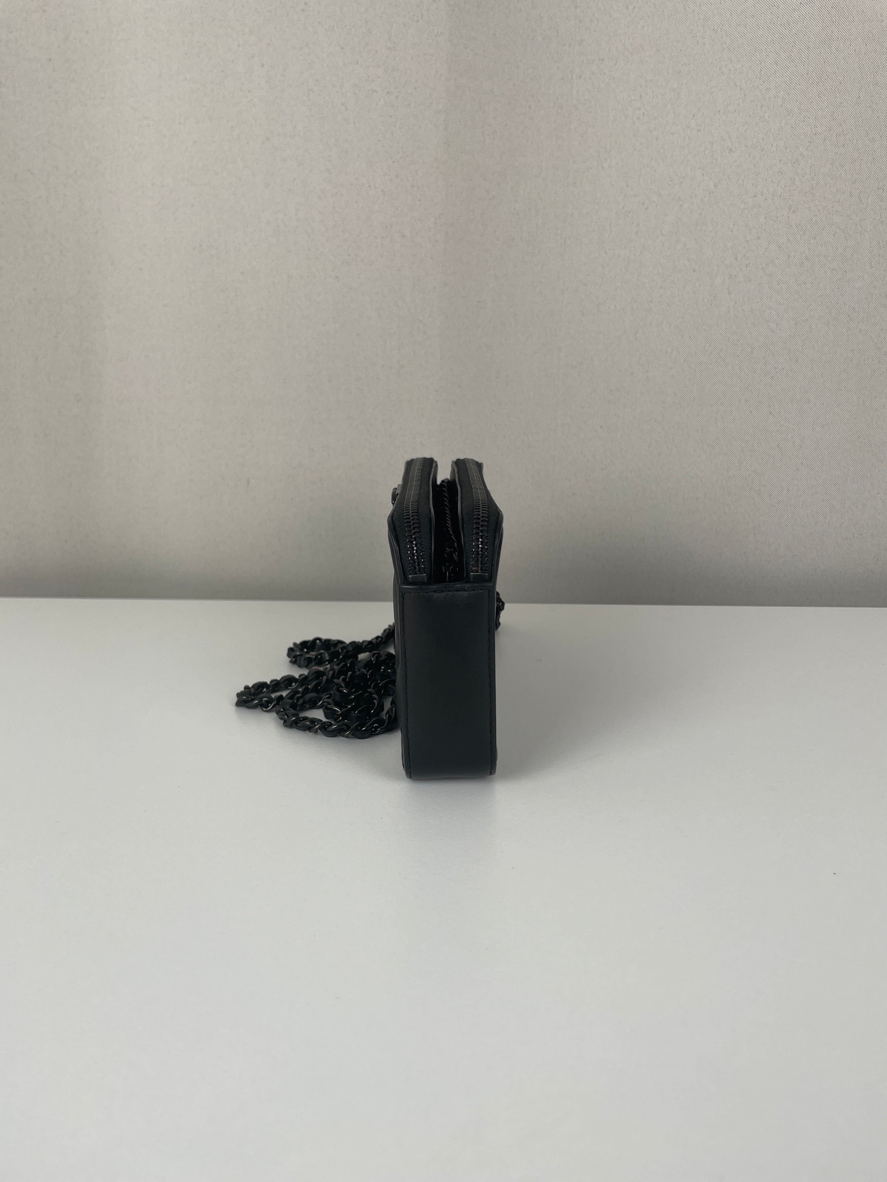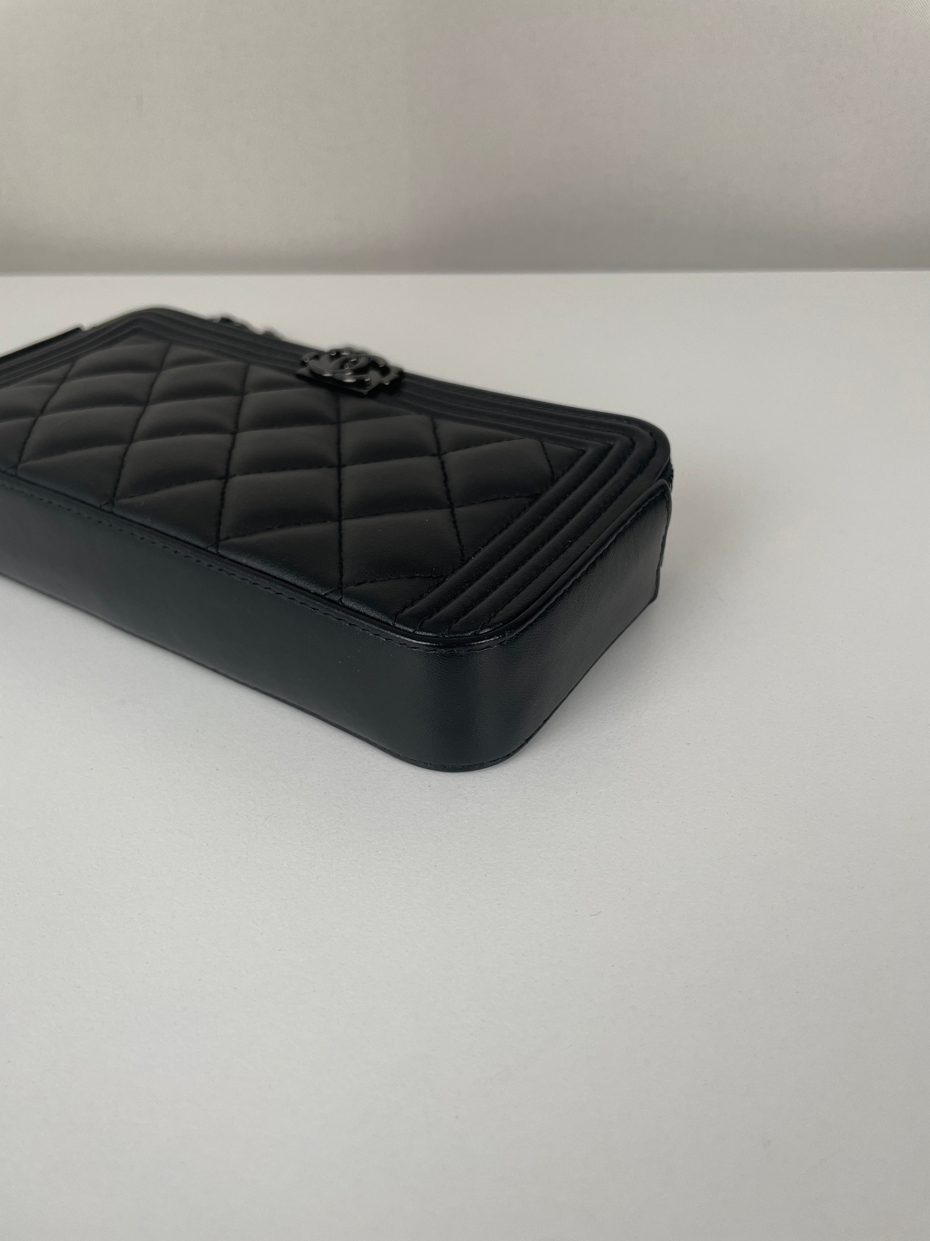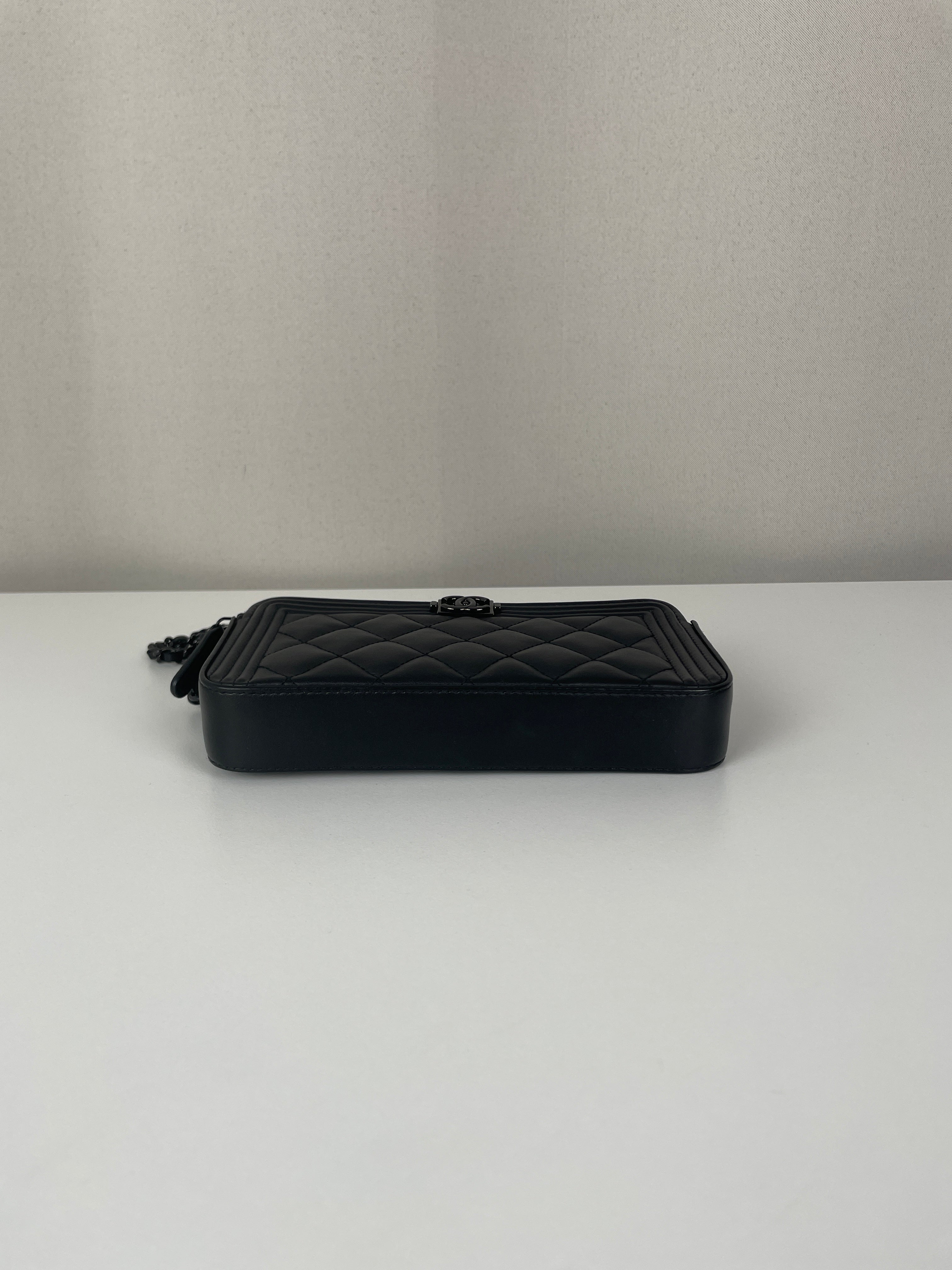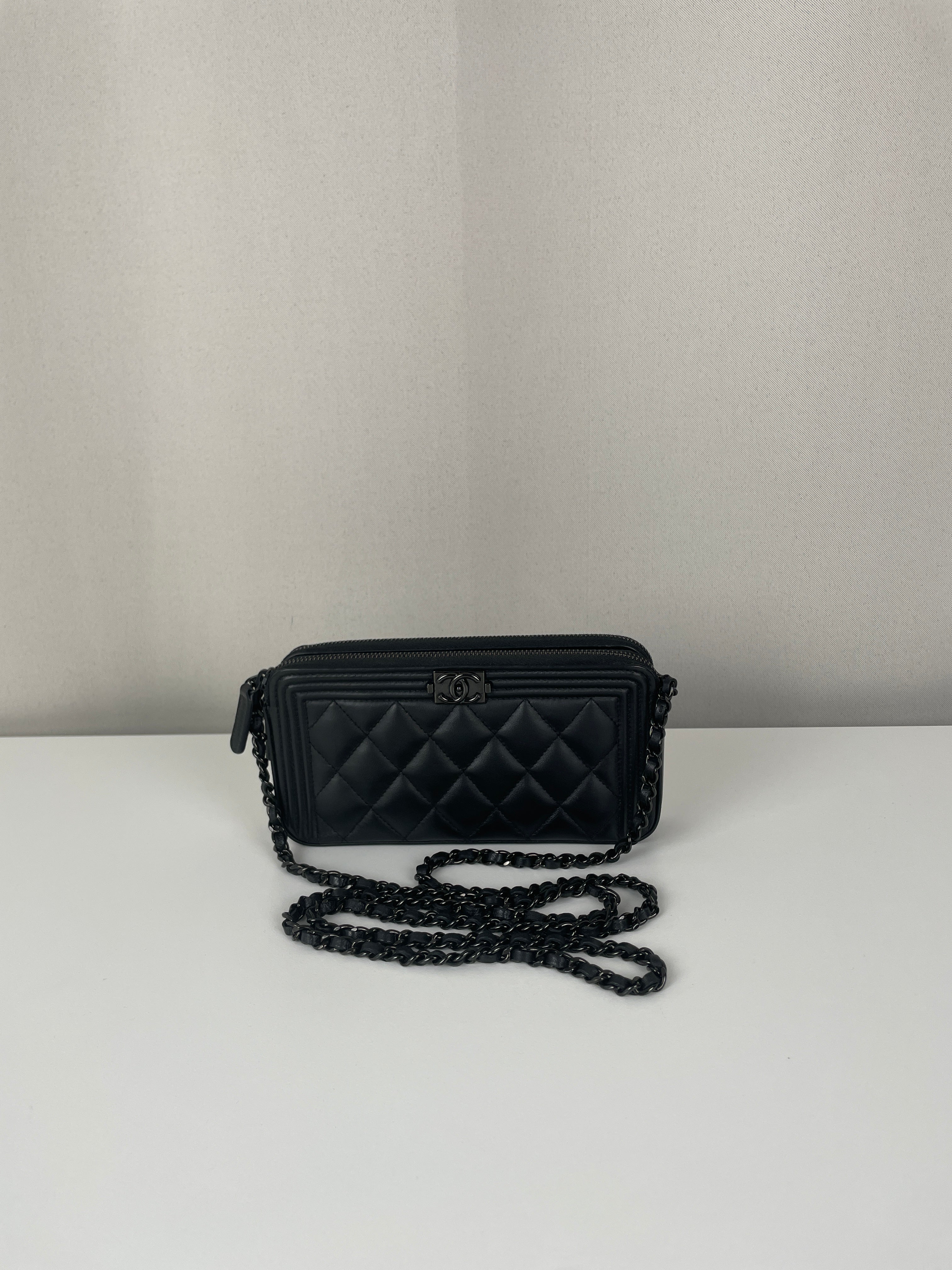 Ce Chanel WOC Boy en noir total de 2017-2018 est absolument magnifique - le design Boy apporte une touche si moderne et audacieuse au portefeuille sur chaîne classique. Le look tout noir avec bijouterie argentée est si chic et polyvalent, fonctionnant parfaitement pour les occasions de jour comme de nuit. Cette pièce vient avec le package complet incluant la carte rare et la certification Entrupy, ce qui est fantastique pour la tranquillité d'esprit.