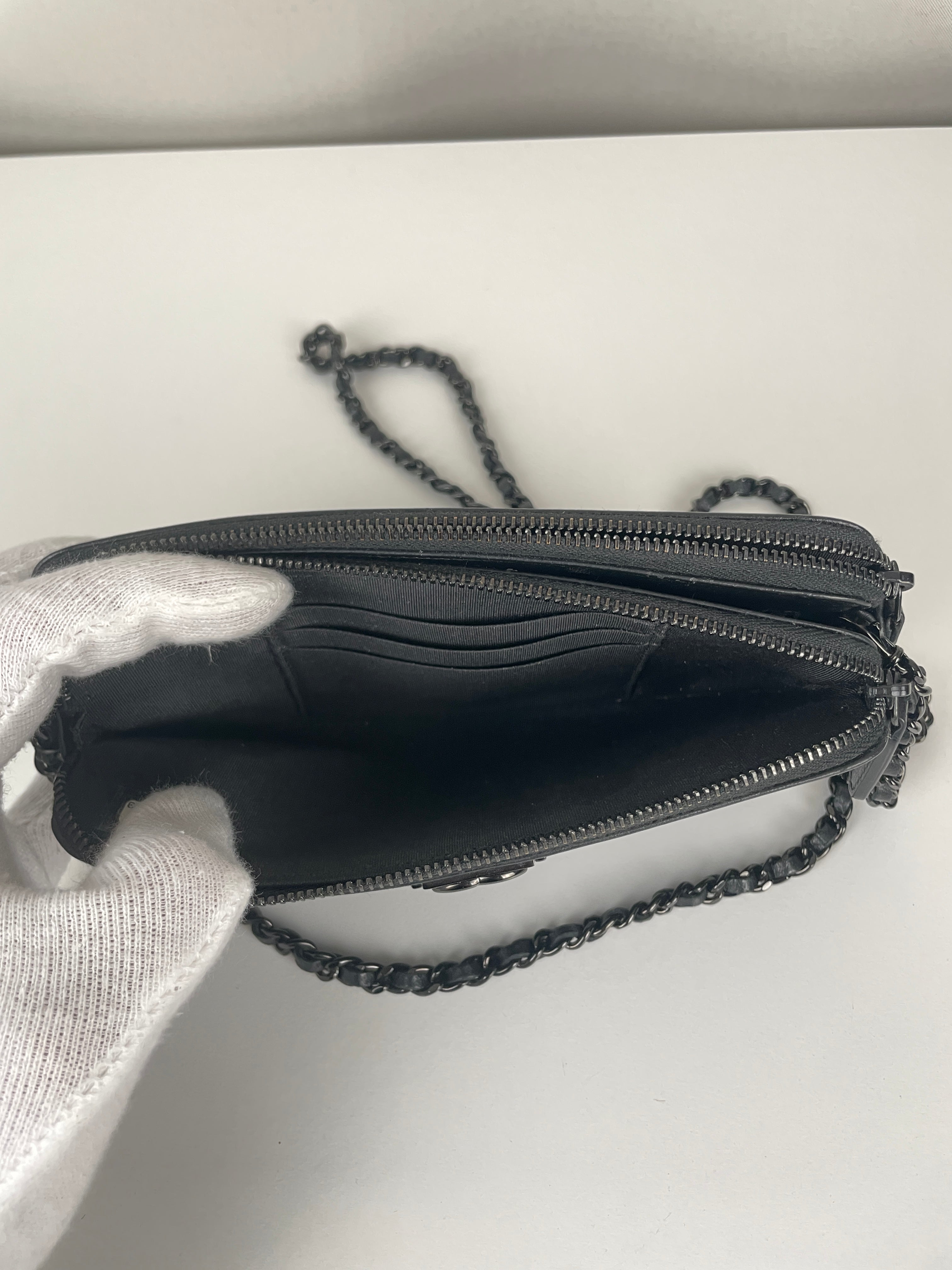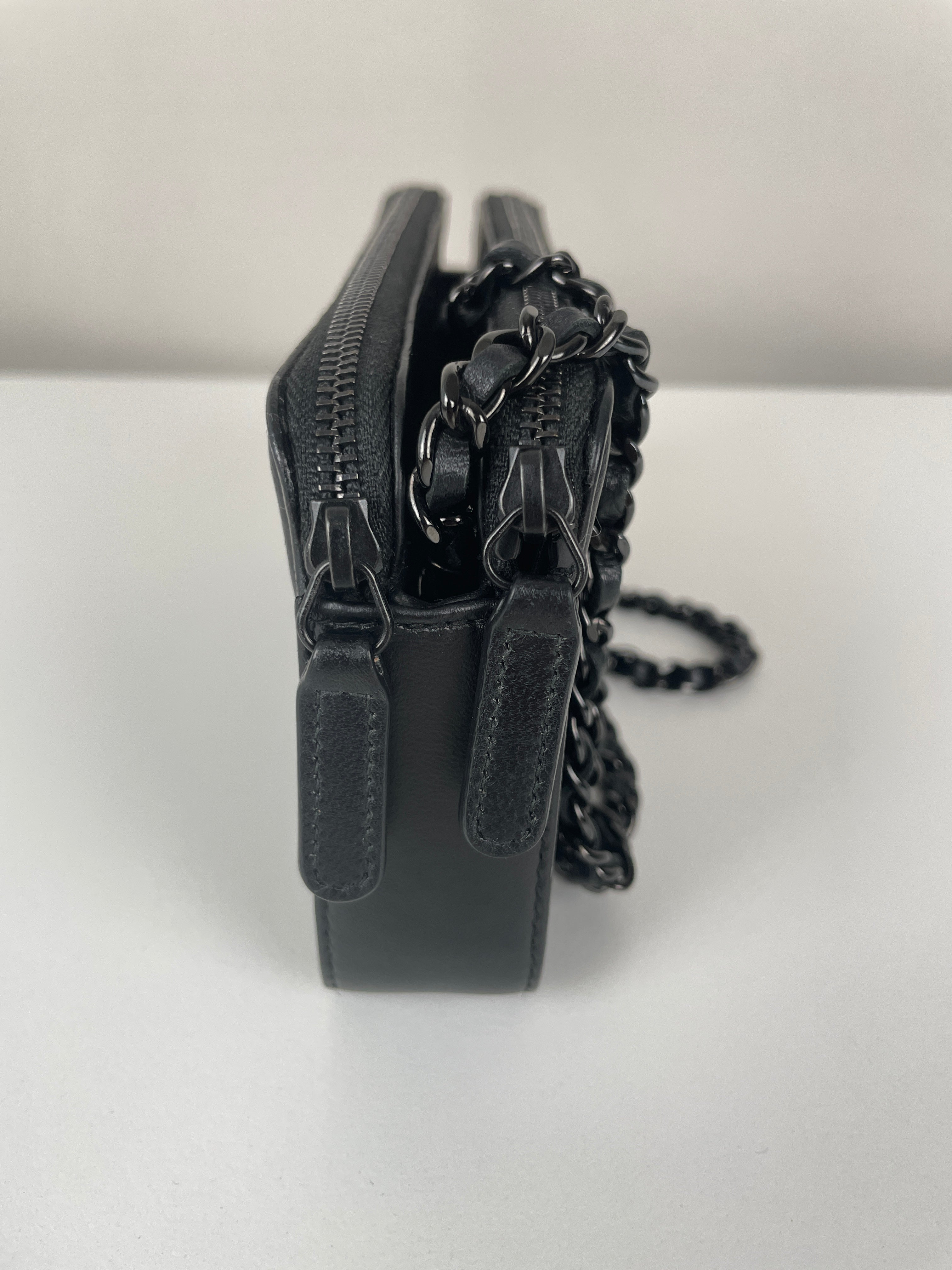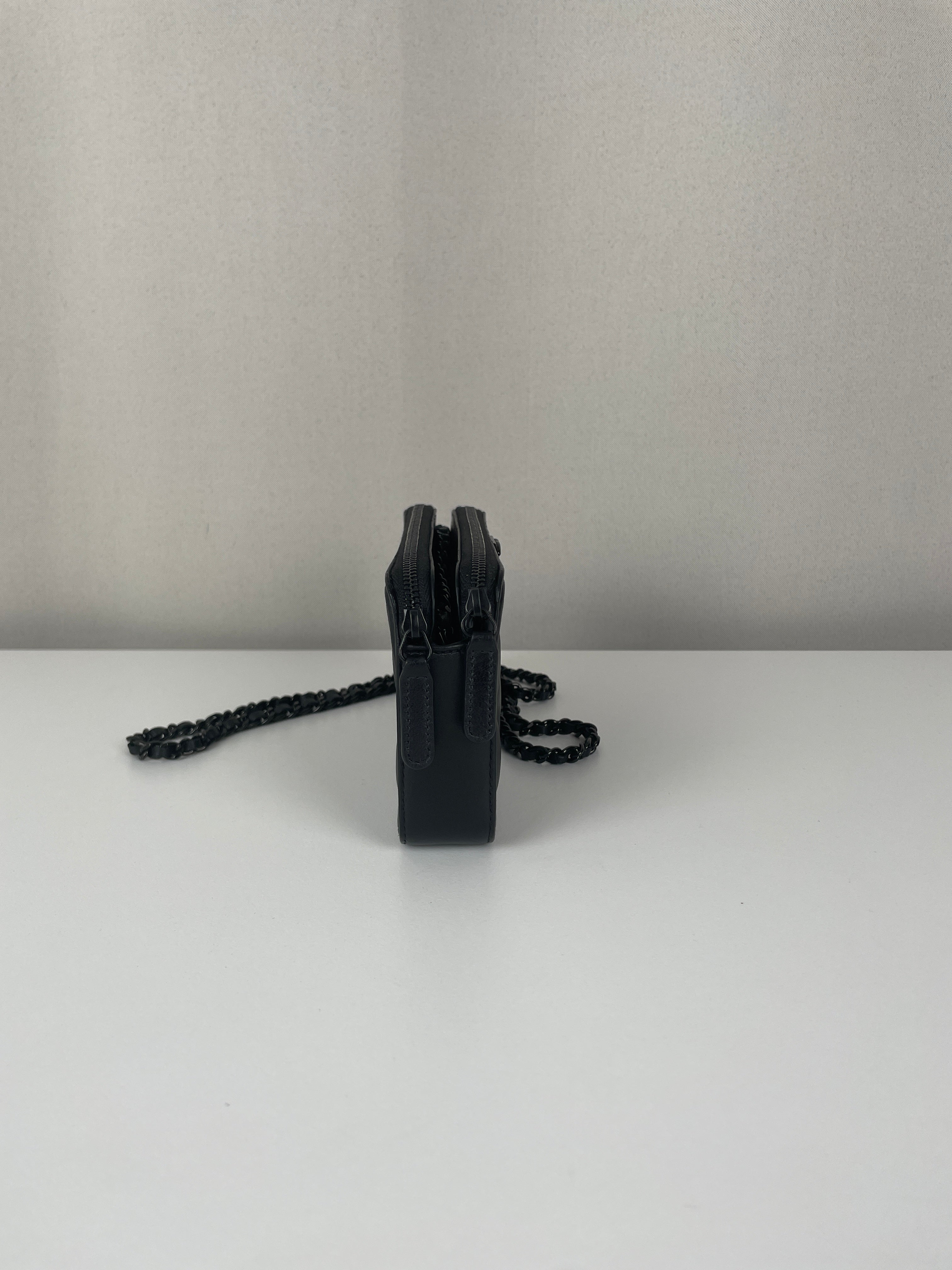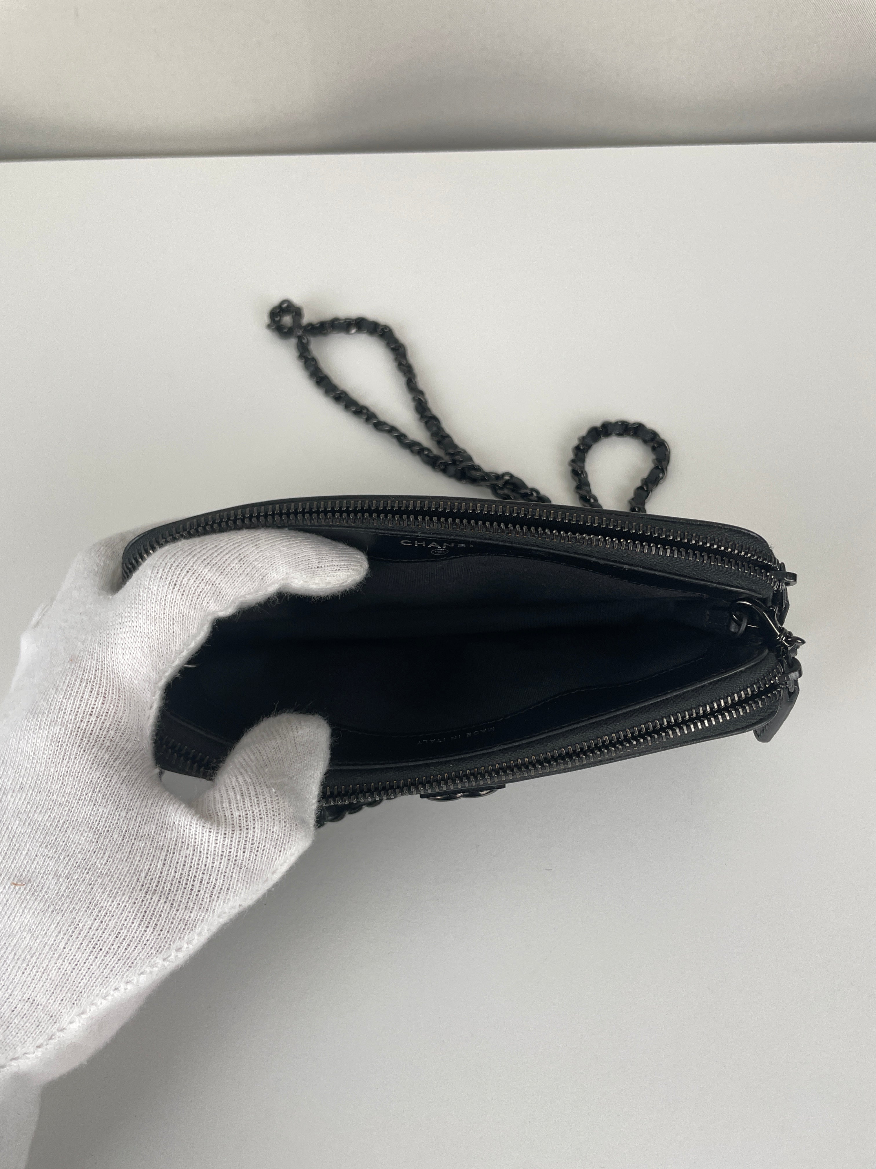 Ce Chanel WOC Boy en noir total de 2017-2018 est absolument magnifique - le design Boy apporte une touche si moderne et audacieuse au portefeuille sur chaîne classique. Le look tout noir avec bijouterie argentée est si chic et polyvalent, fonctionnant parfaitement pour les occasions de jour comme de nuit. Cette pièce vient avec le package complet incluant la carte rare et la certification Entrupy, ce qui est fantastique pour la tranquillité d'esprit.