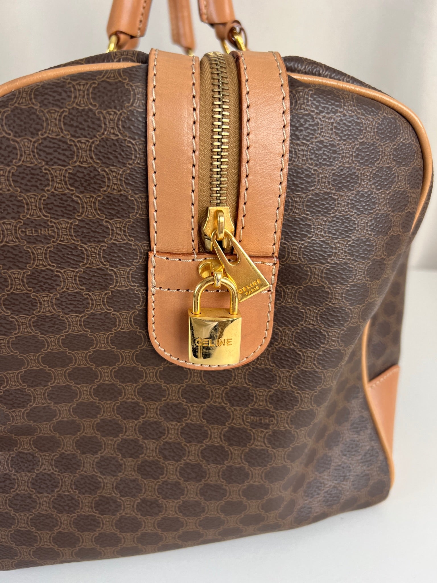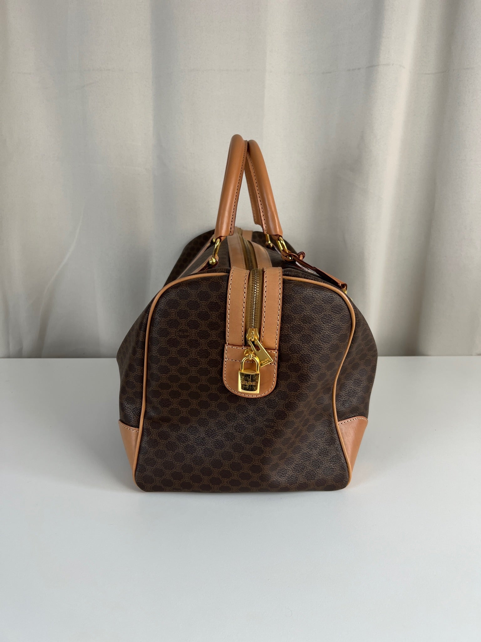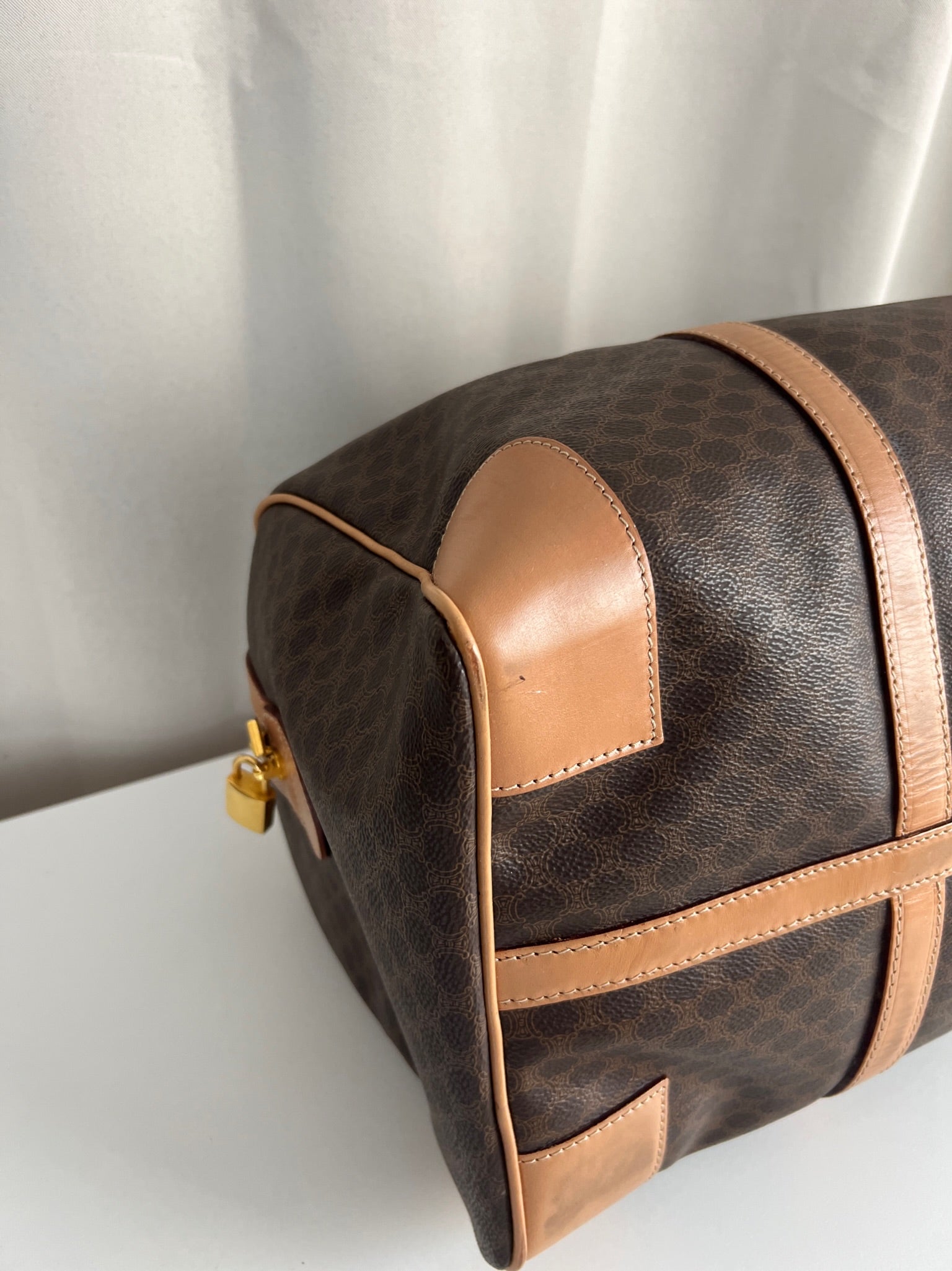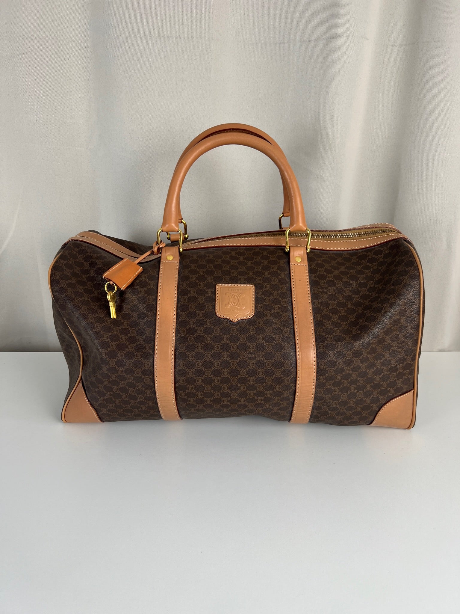 Le sac de voyage Céline Triomphe est en très bon état. Le cuir est en très bon état, sur le dessous vous avez des traces d'usure comme vous pouvez le voir sur les photos. Les poignées sont superbes et les coins présentent également des signes d'usure et sont un peu frottés. L'intérieur est en très bon état. Vous avez une poche zippée à l'intérieur. La bijouterie est légèrement utilisé. Il est livré avec un cadenas et des clés.