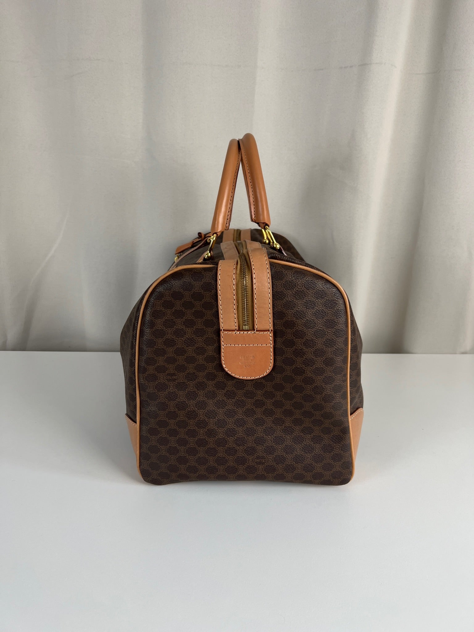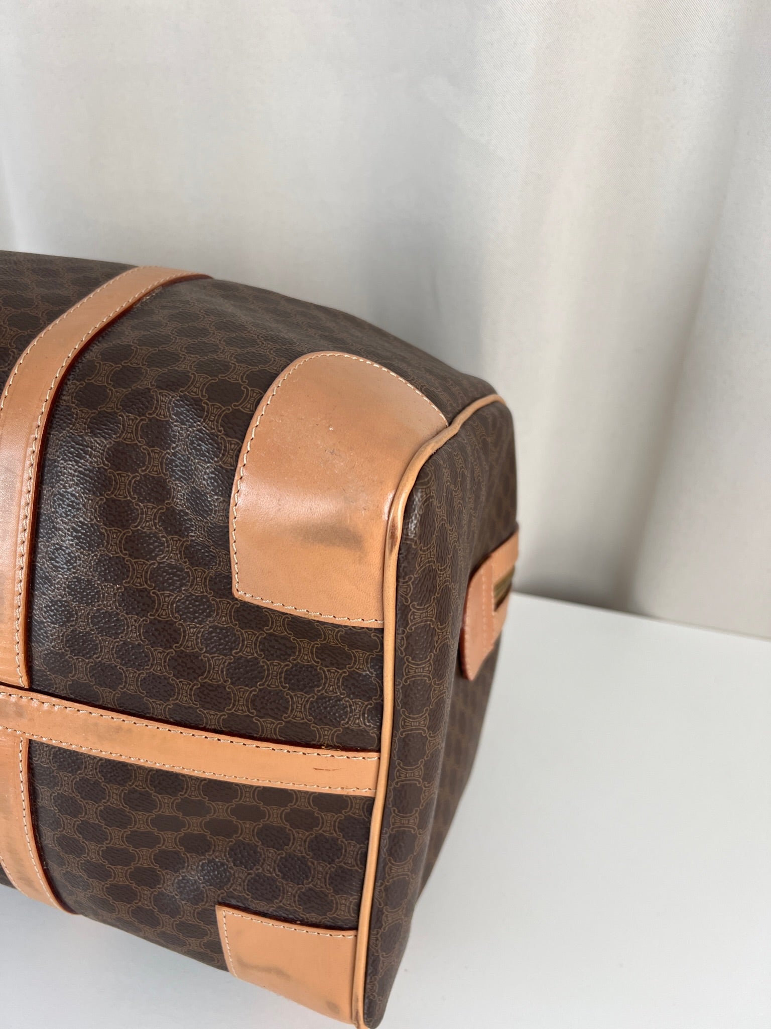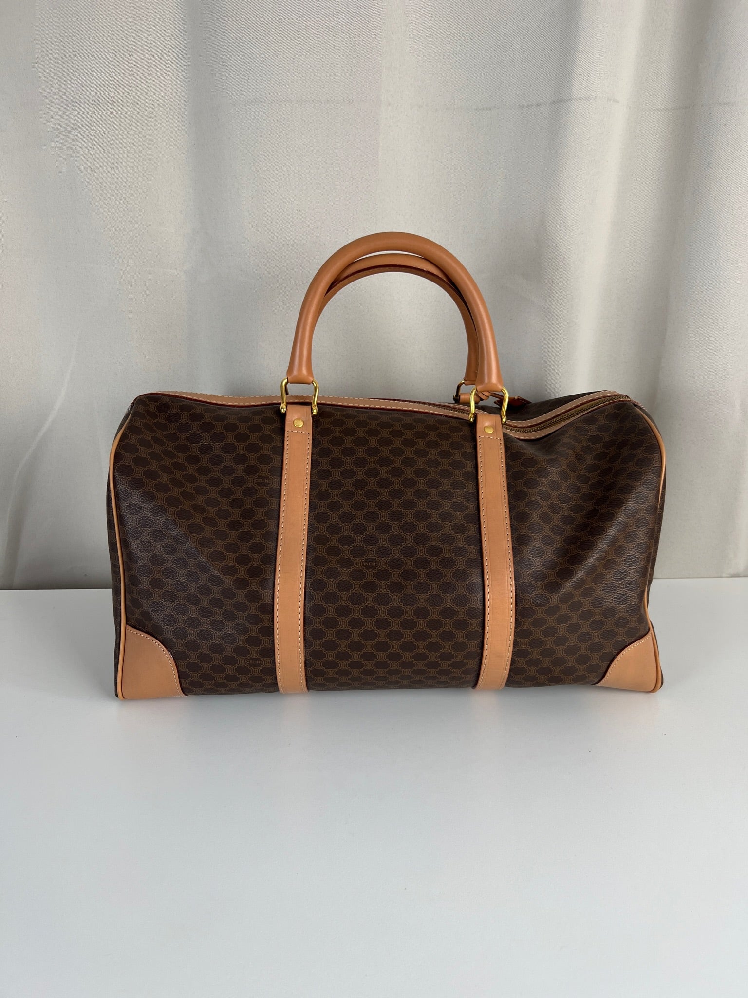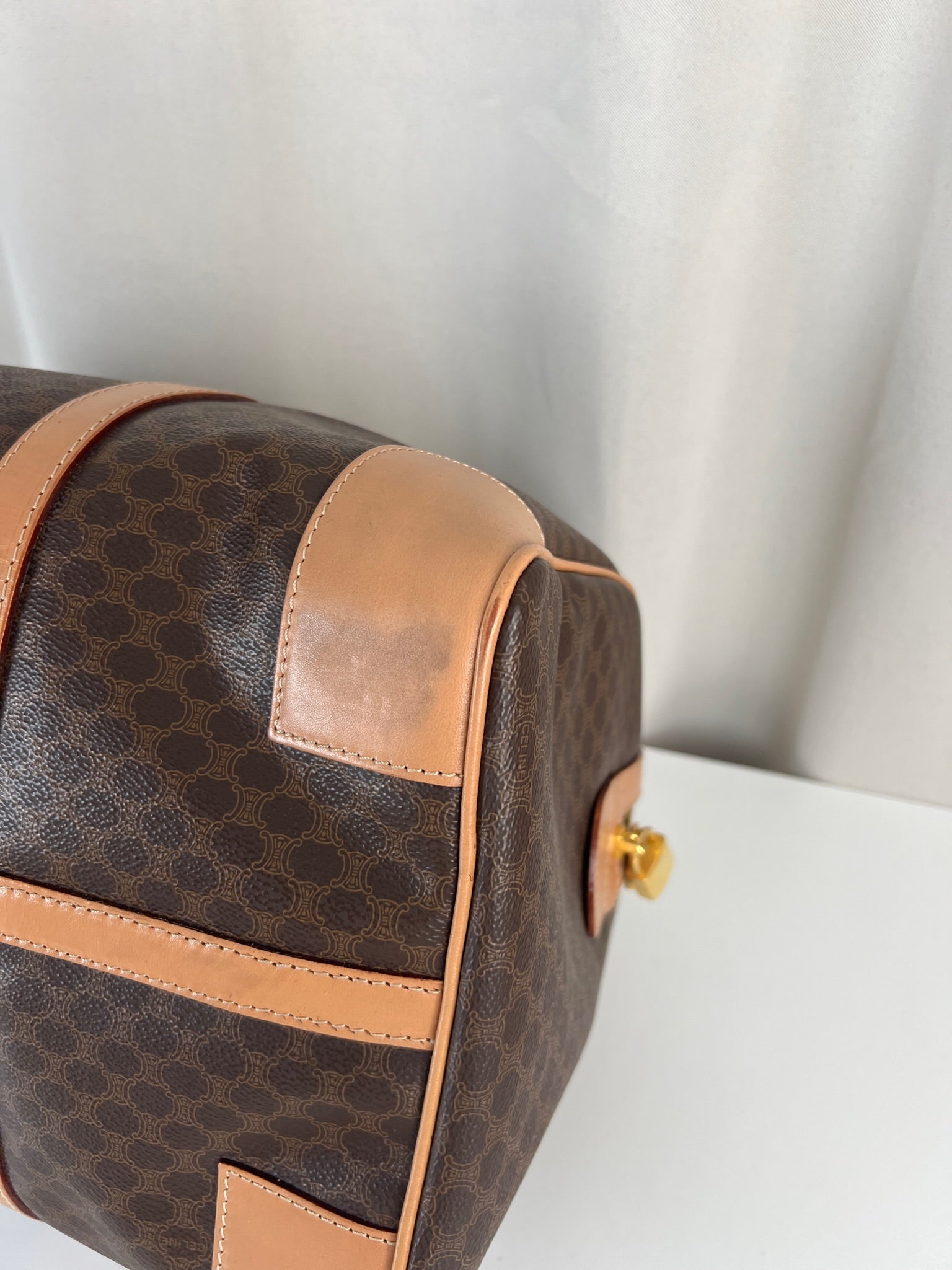 Le sac de voyage Céline Triomphe est en très bon état. Le cuir est en très bon état, sur le dessous vous avez des traces d'usure comme vous pouvez le voir sur les photos. Les poignées sont superbes et les coins présentent également des signes d'usure et sont un peu frottés. L'intérieur est en très bon état. Vous avez une poche zippée à l'intérieur. La bijouterie est légèrement utilisé. Il est livré avec un cadenas et des clés.
