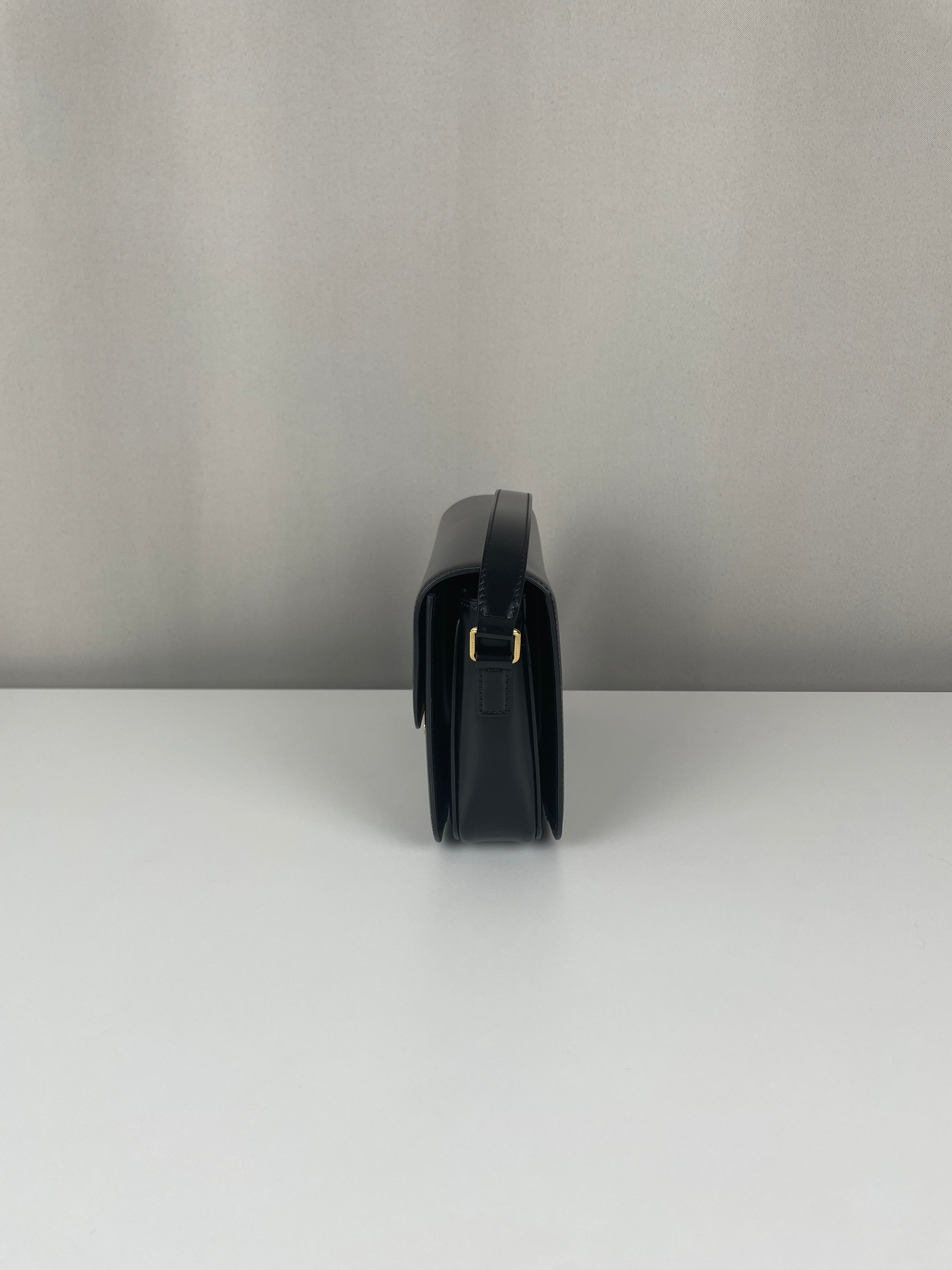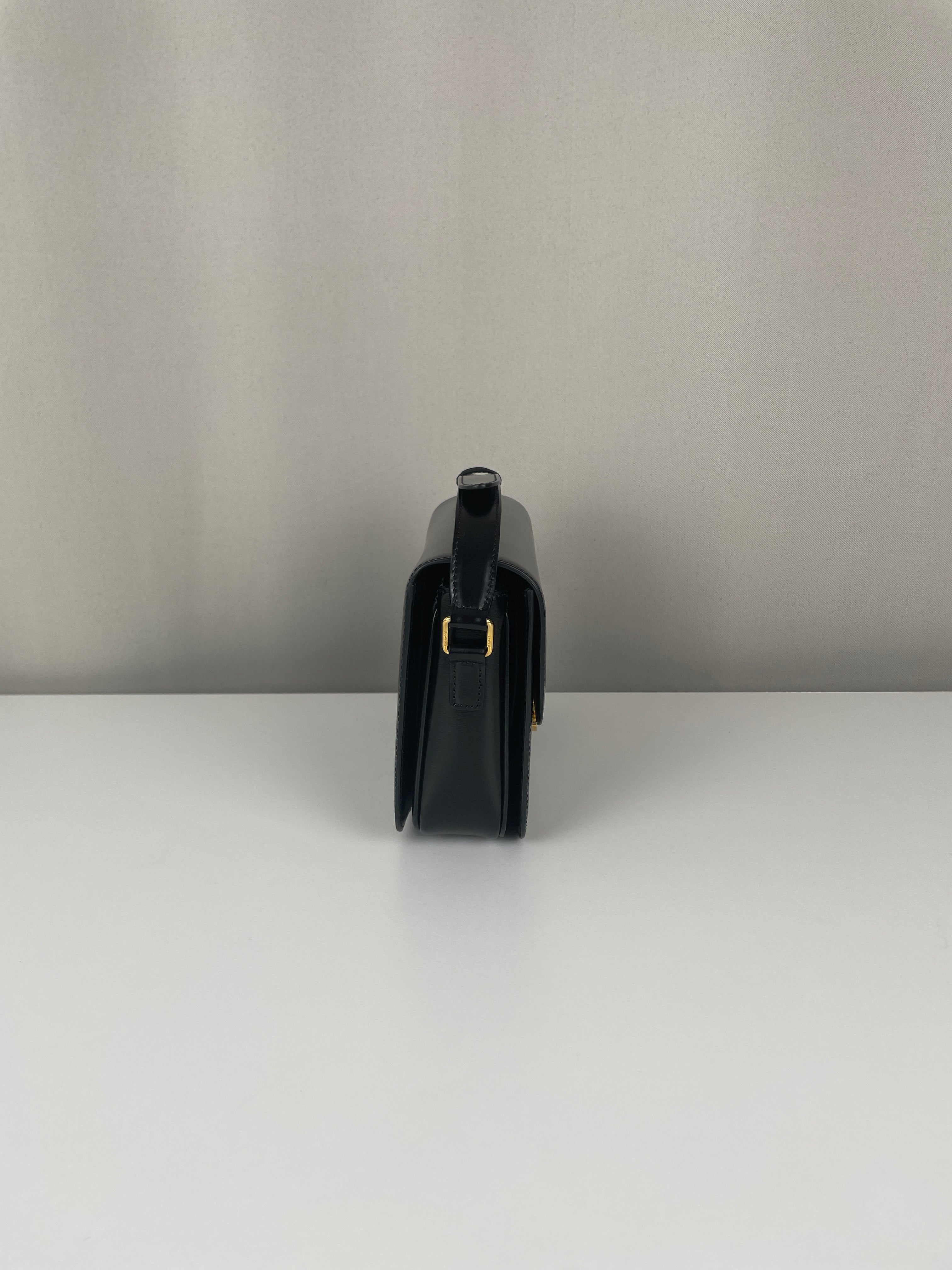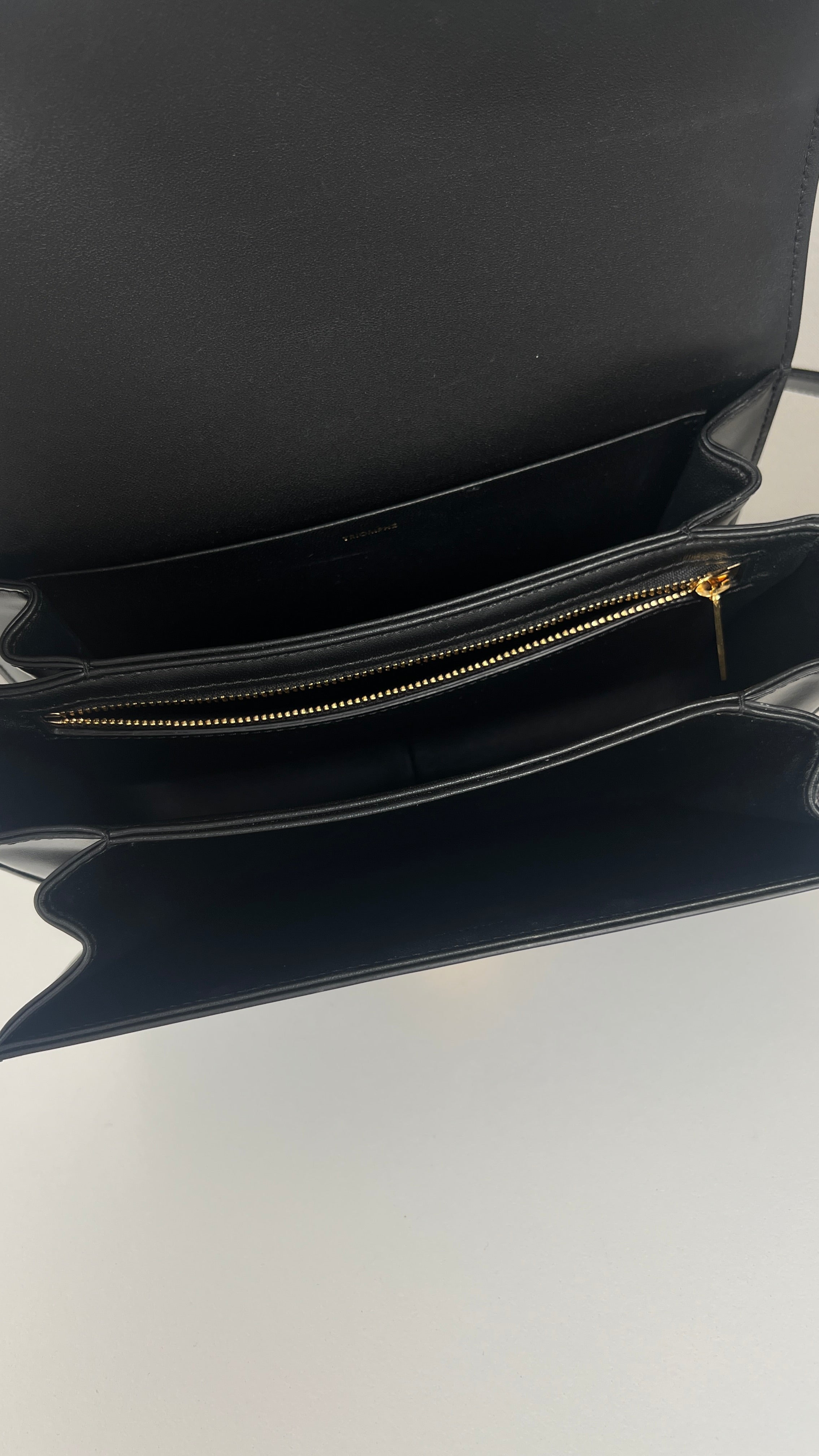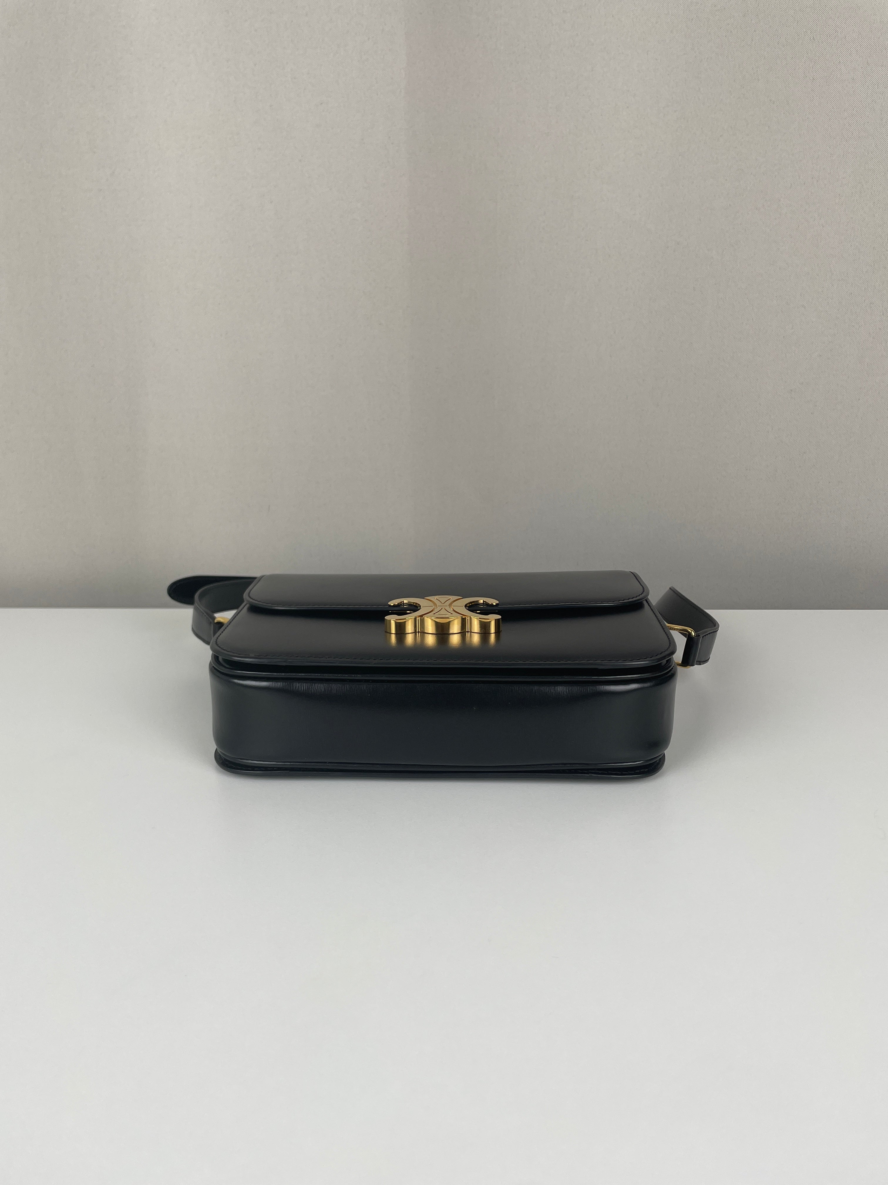 Ce sac Céline Triomphe en cuir noir est en état quasi neuf. Élégant, compact et intemporel, c’est la pièce de luxe parfaite au quotidien. Son fermoir emblématique Triomphe doré lui apporte une touche signature audacieuse. Un classique moderne de la maison Céline.
