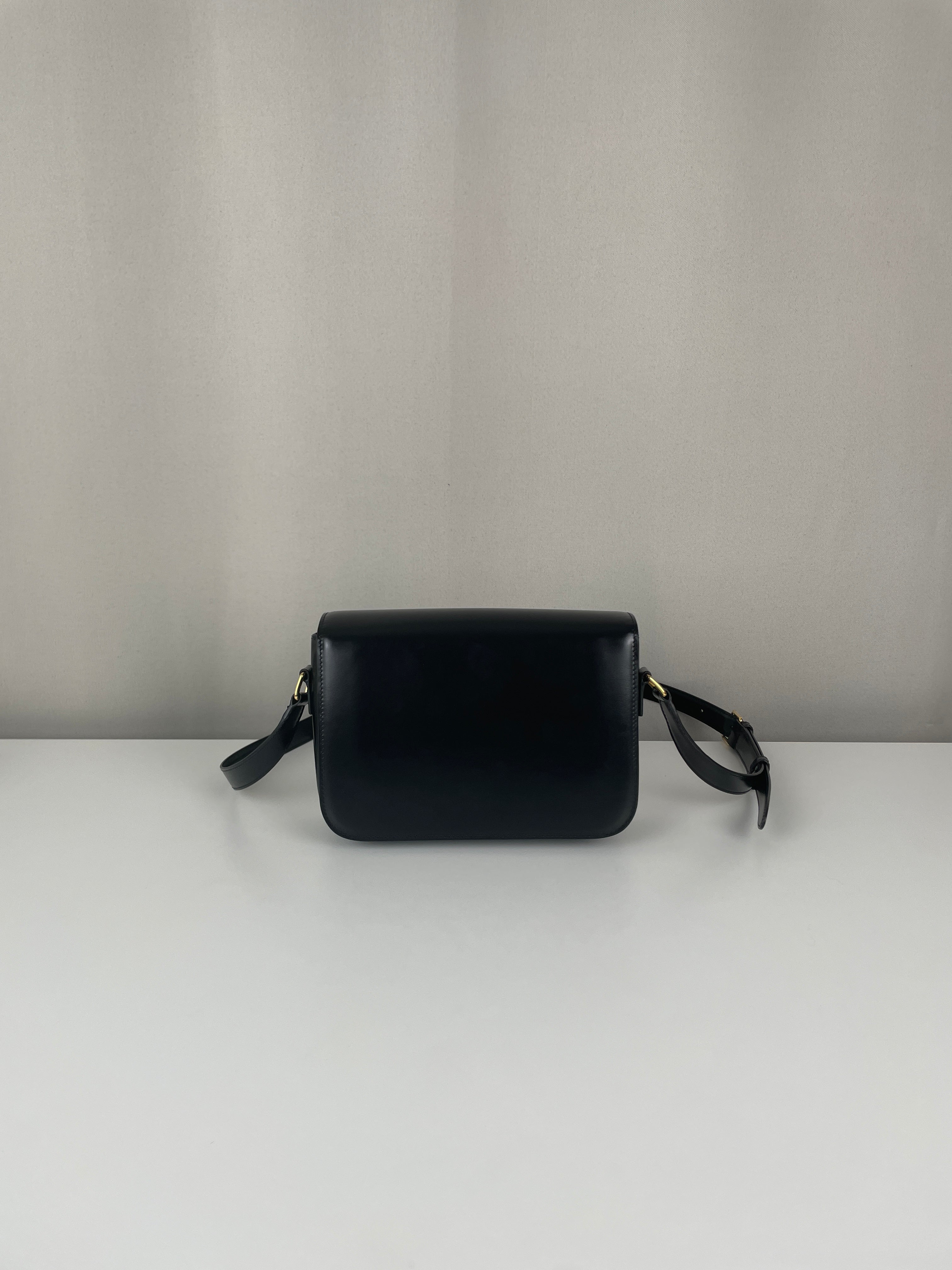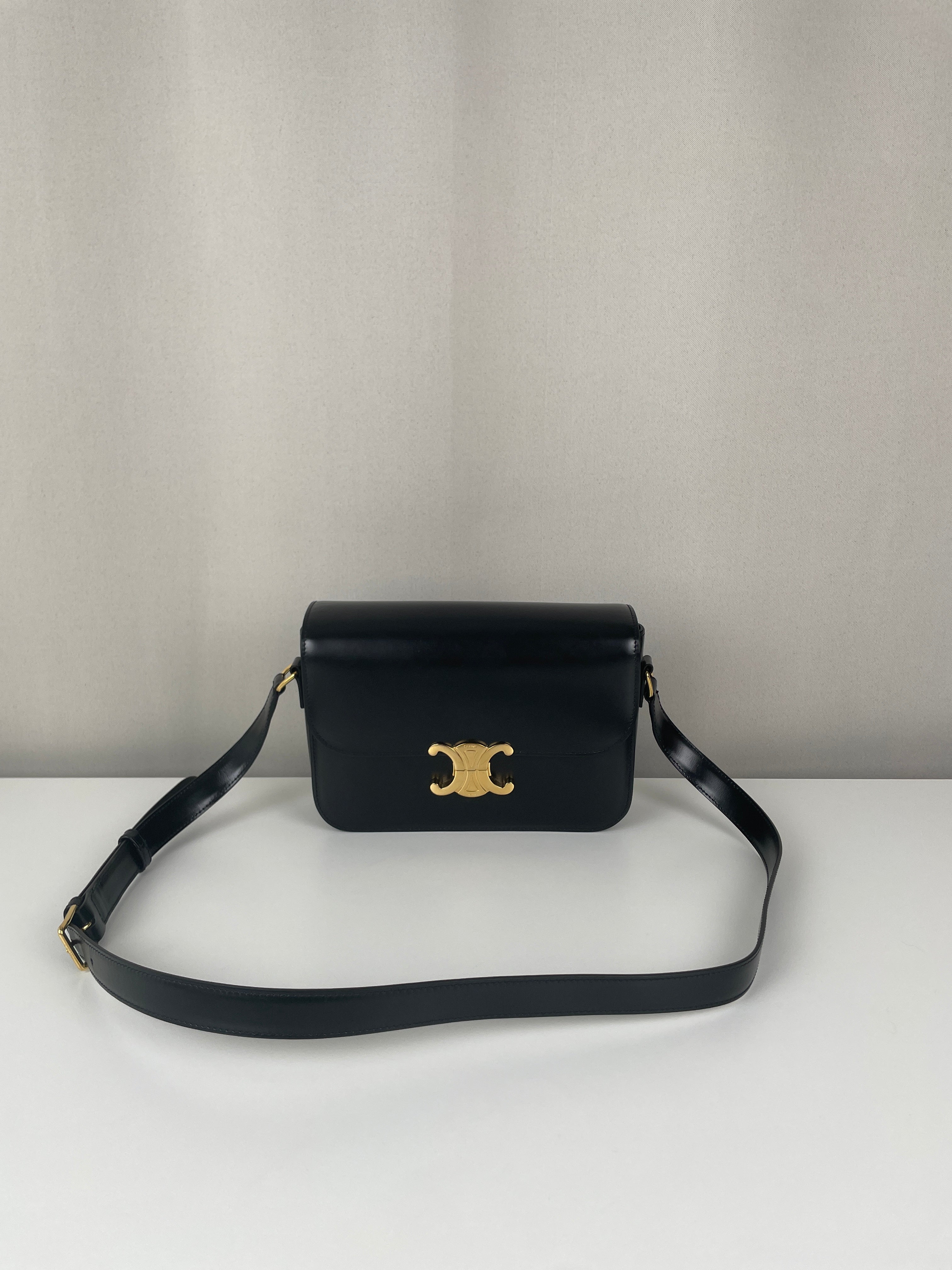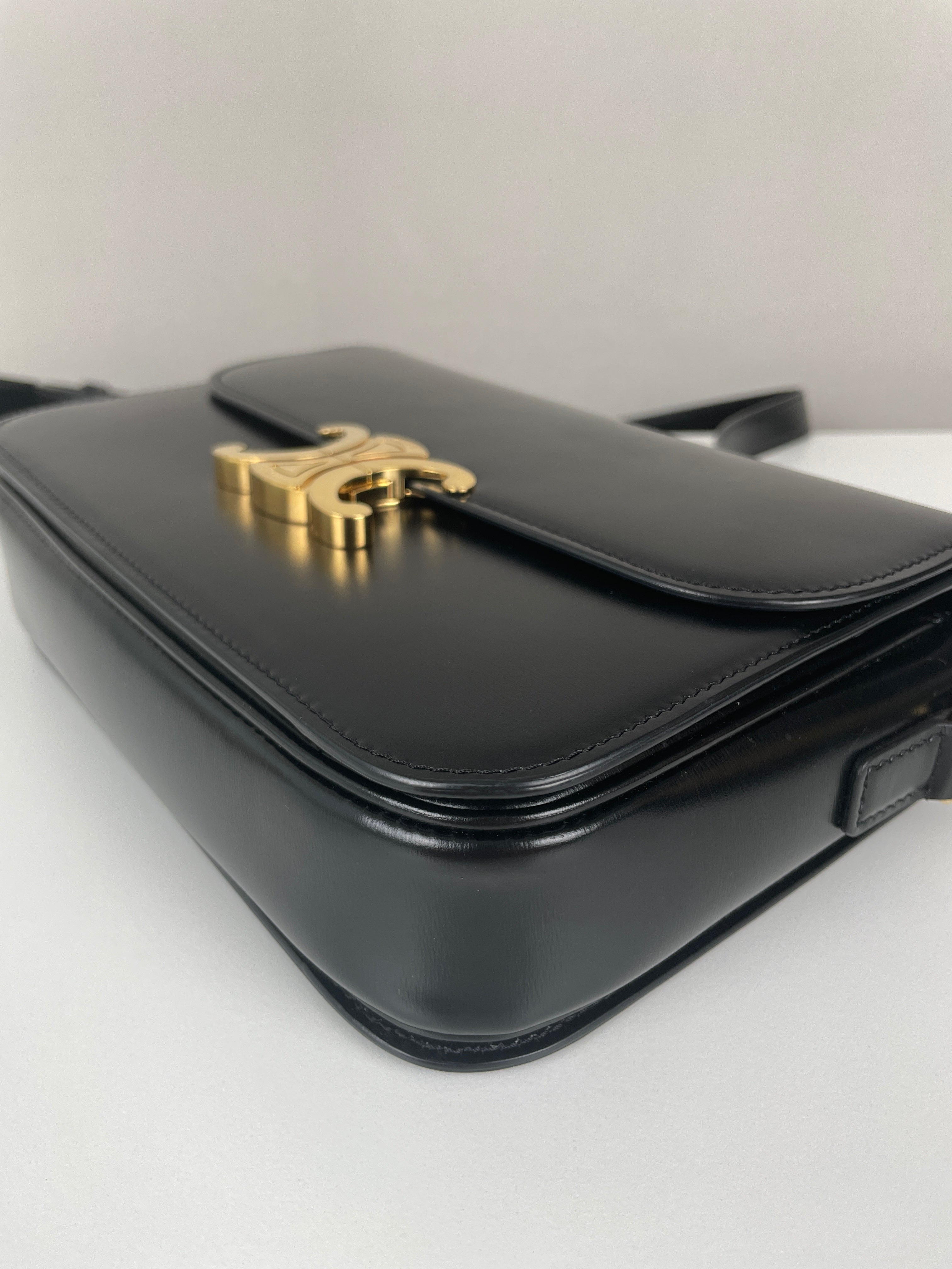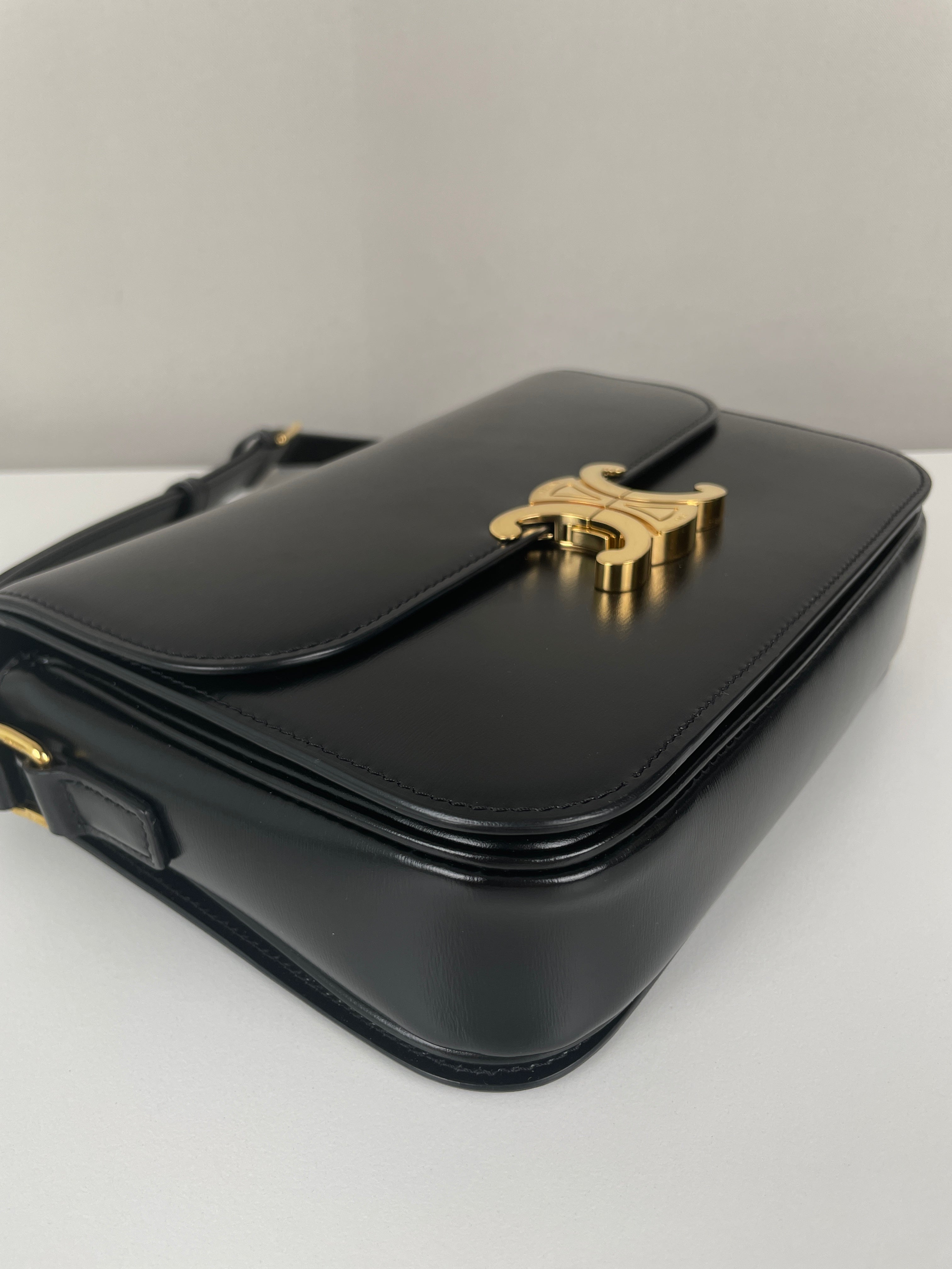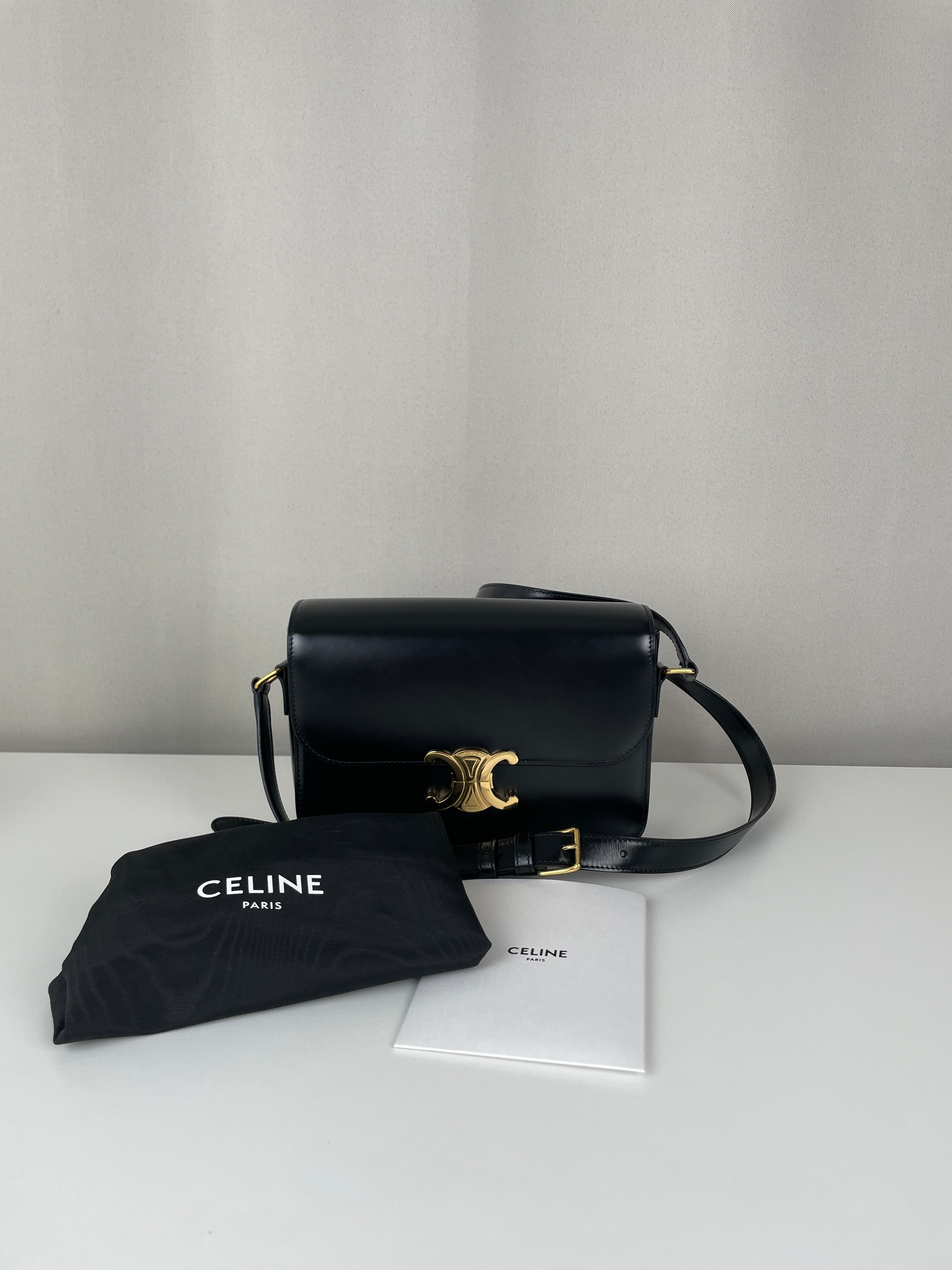 Ce sac Céline Triomphe en cuir noir est en état quasi neuf. Élégant, compact et intemporel, c’est la pièce de luxe parfaite au quotidien. Son fermoir emblématique Triomphe doré lui apporte une touche signature audacieuse. Un classique moderne de la maison Céline.
