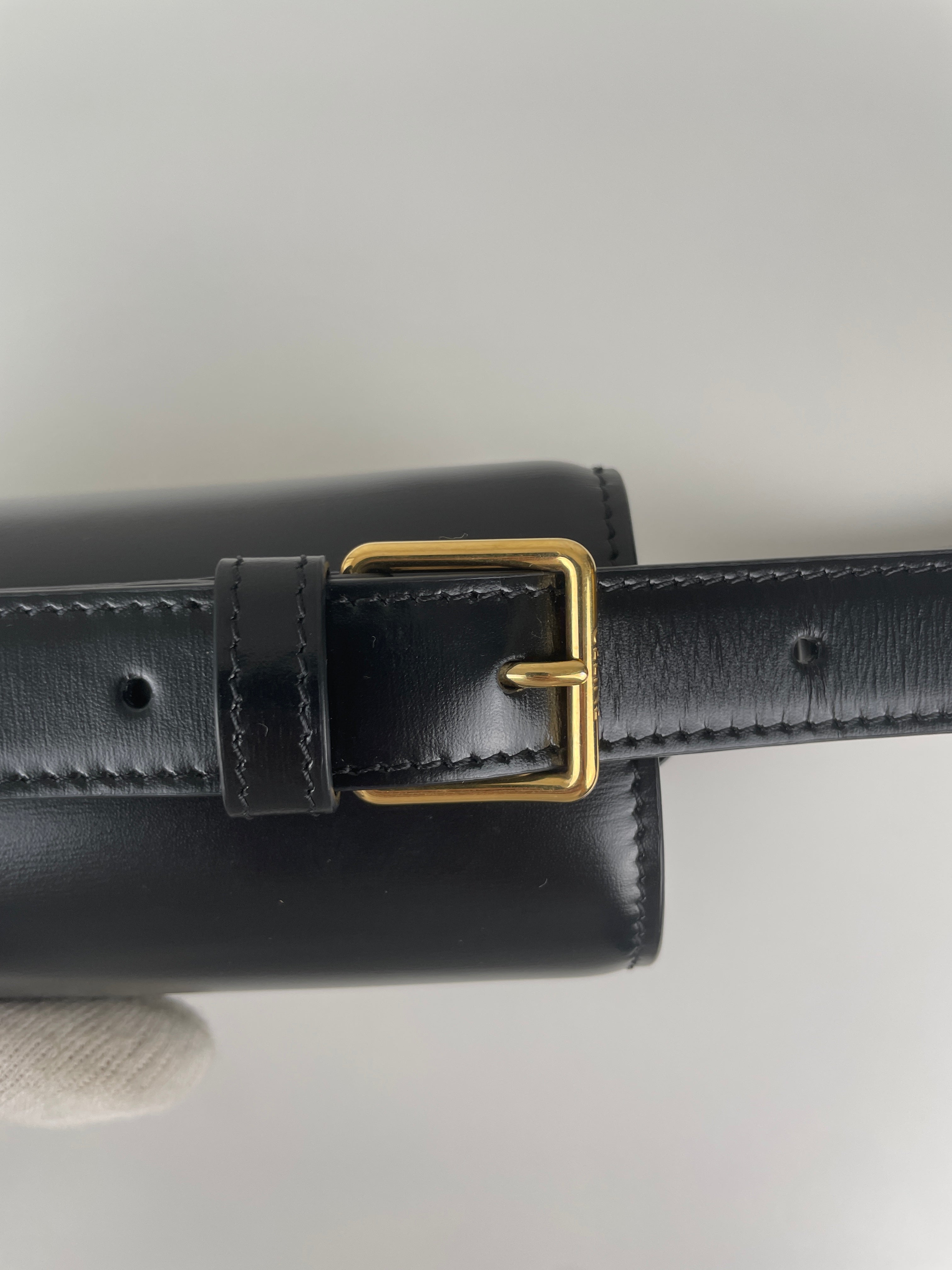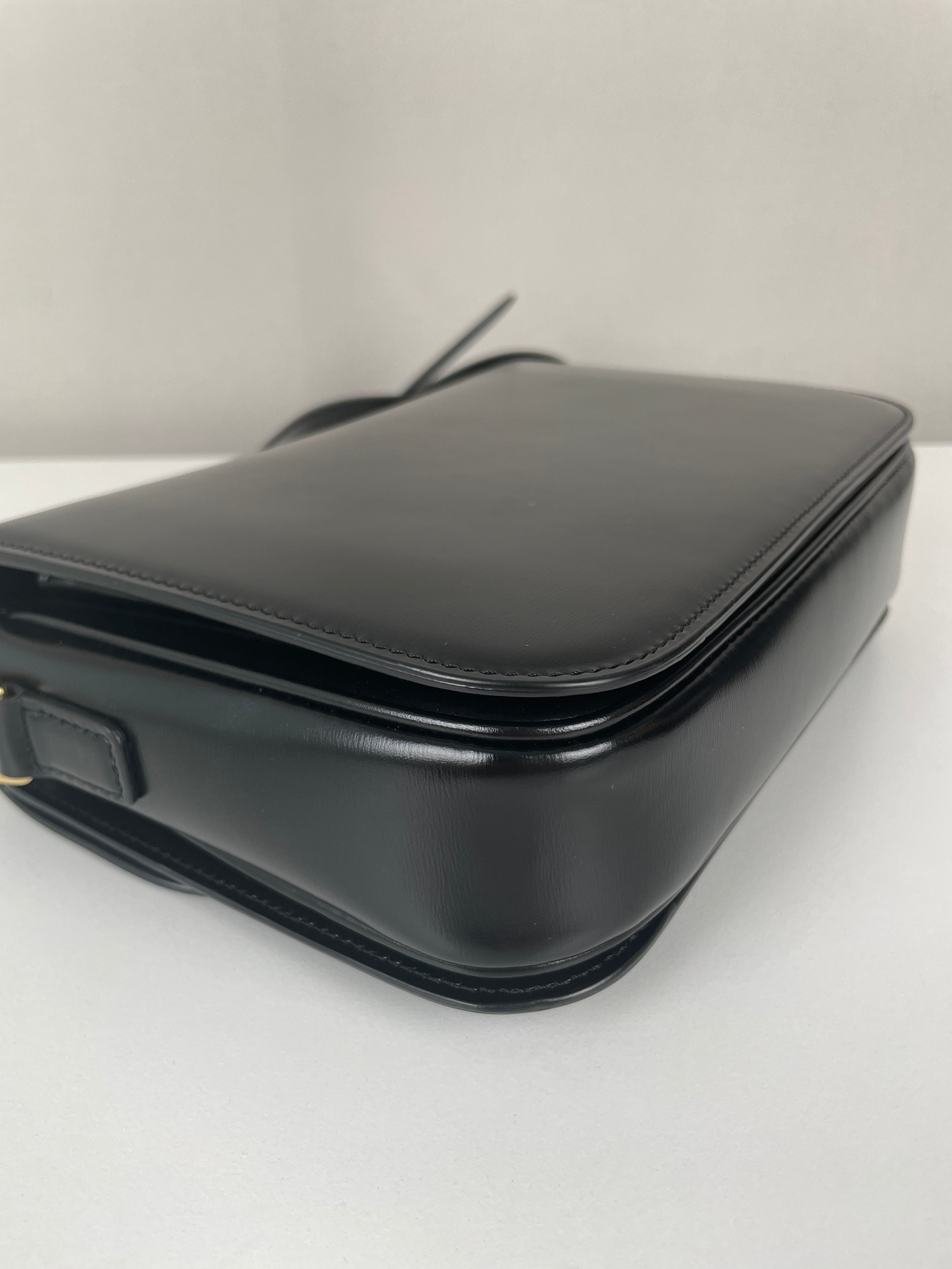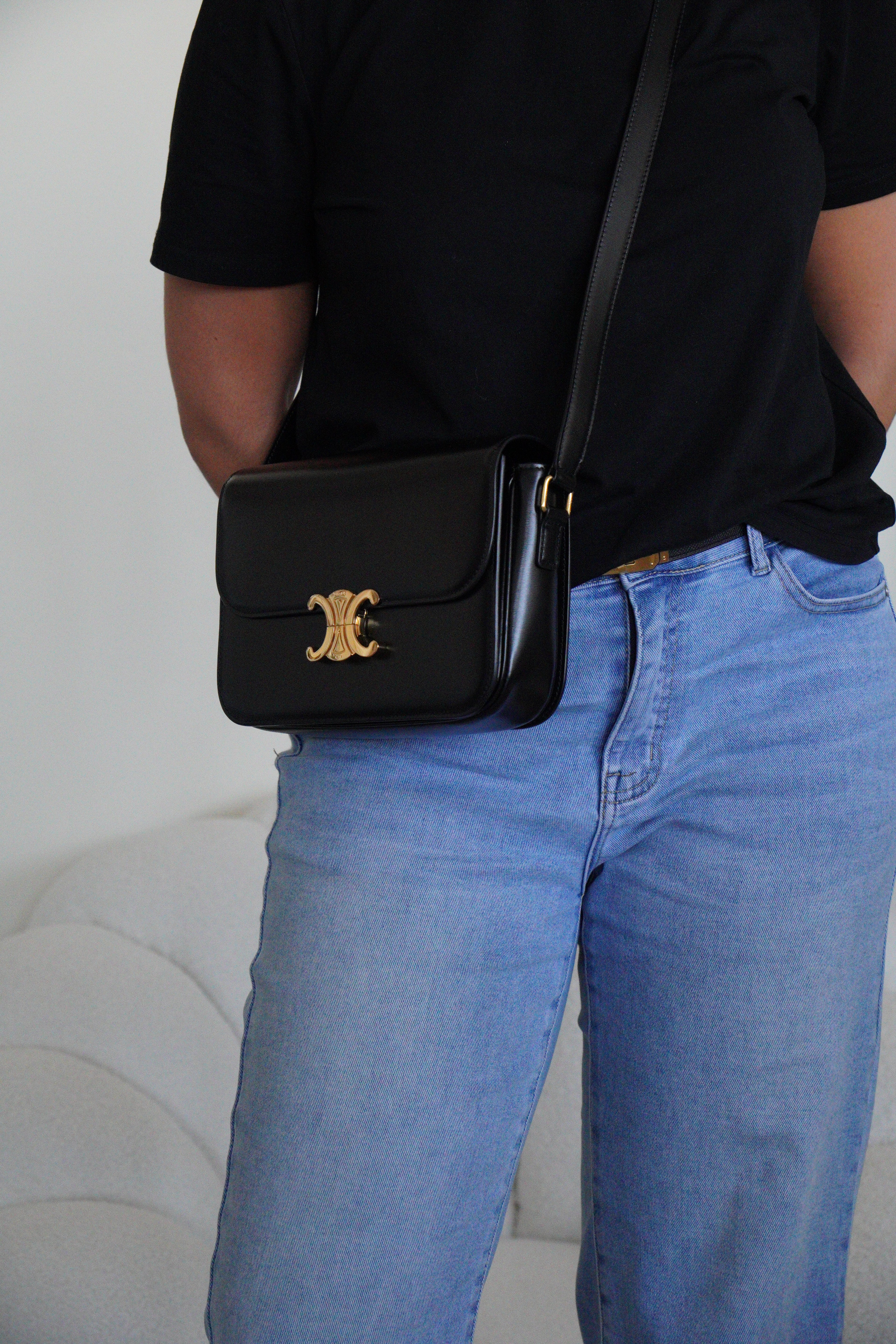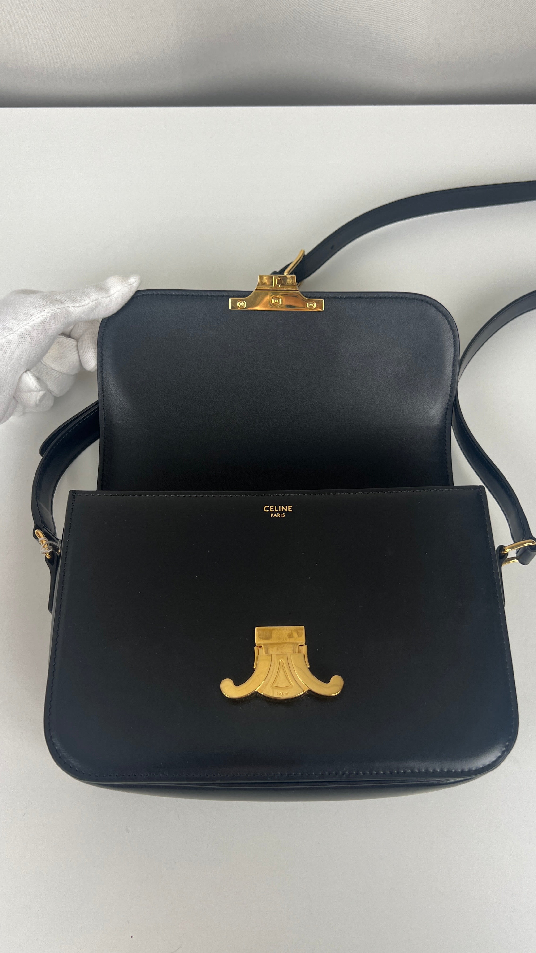 Ce sac Céline Triomphe en cuir noir est en état quasi neuf. Élégant, compact et intemporel, c’est la pièce de luxe parfaite au quotidien. Son fermoir emblématique Triomphe doré lui apporte une touche signature audacieuse. Un classique moderne de la maison Céline.
