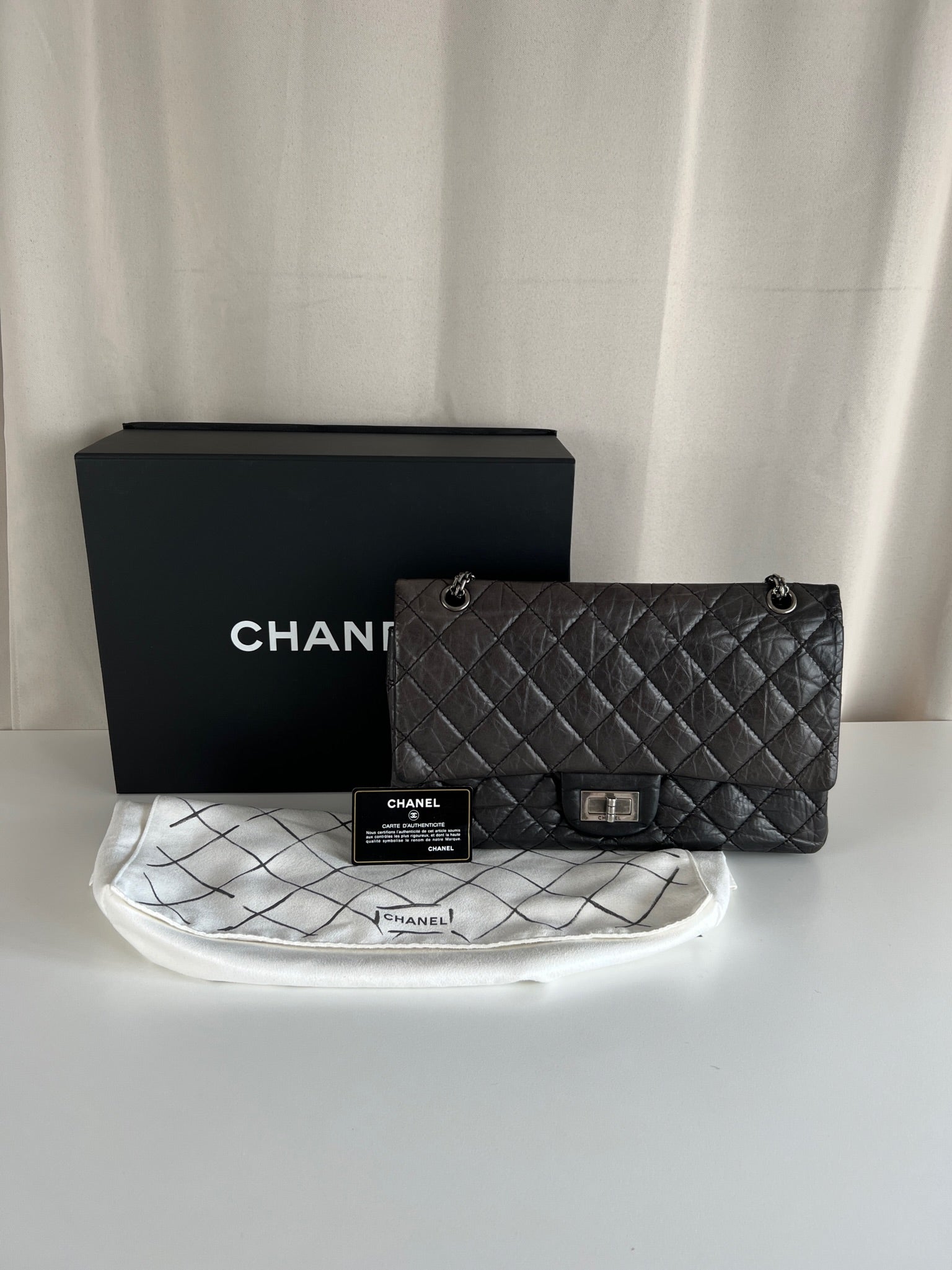 Sac Chanel 2.55 Maxi en Cuir Gris / Noir Bijouterie Argenté Foncé