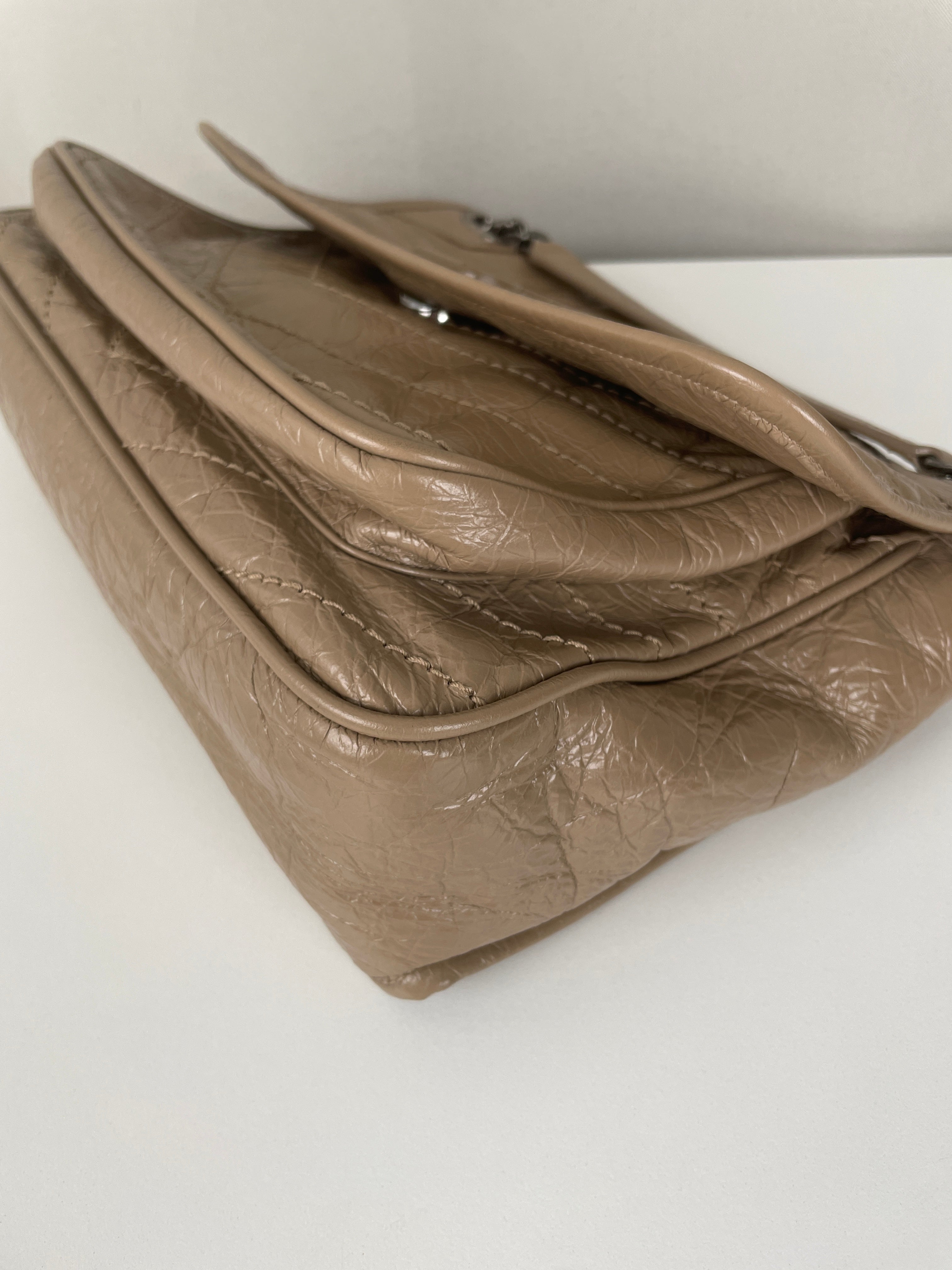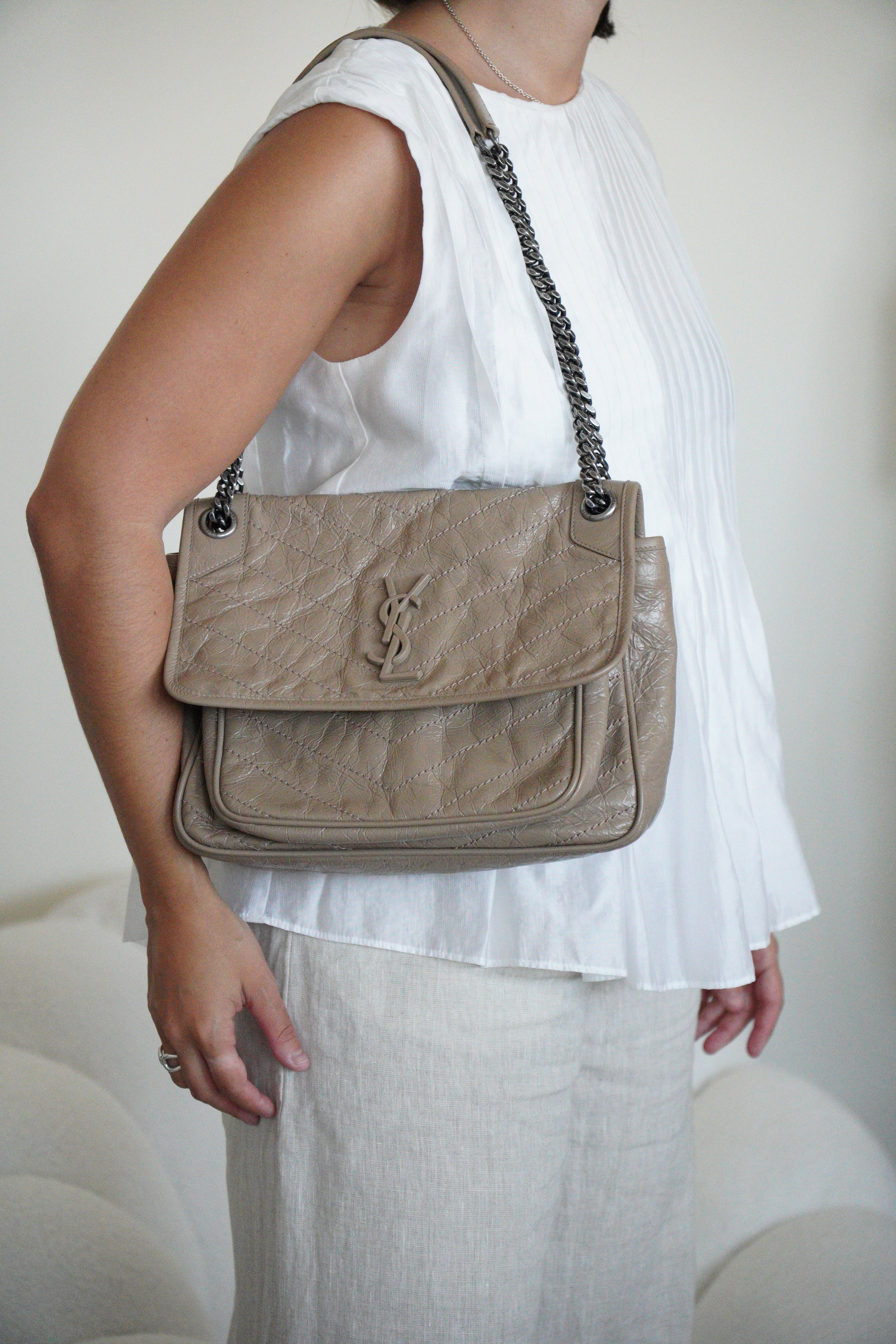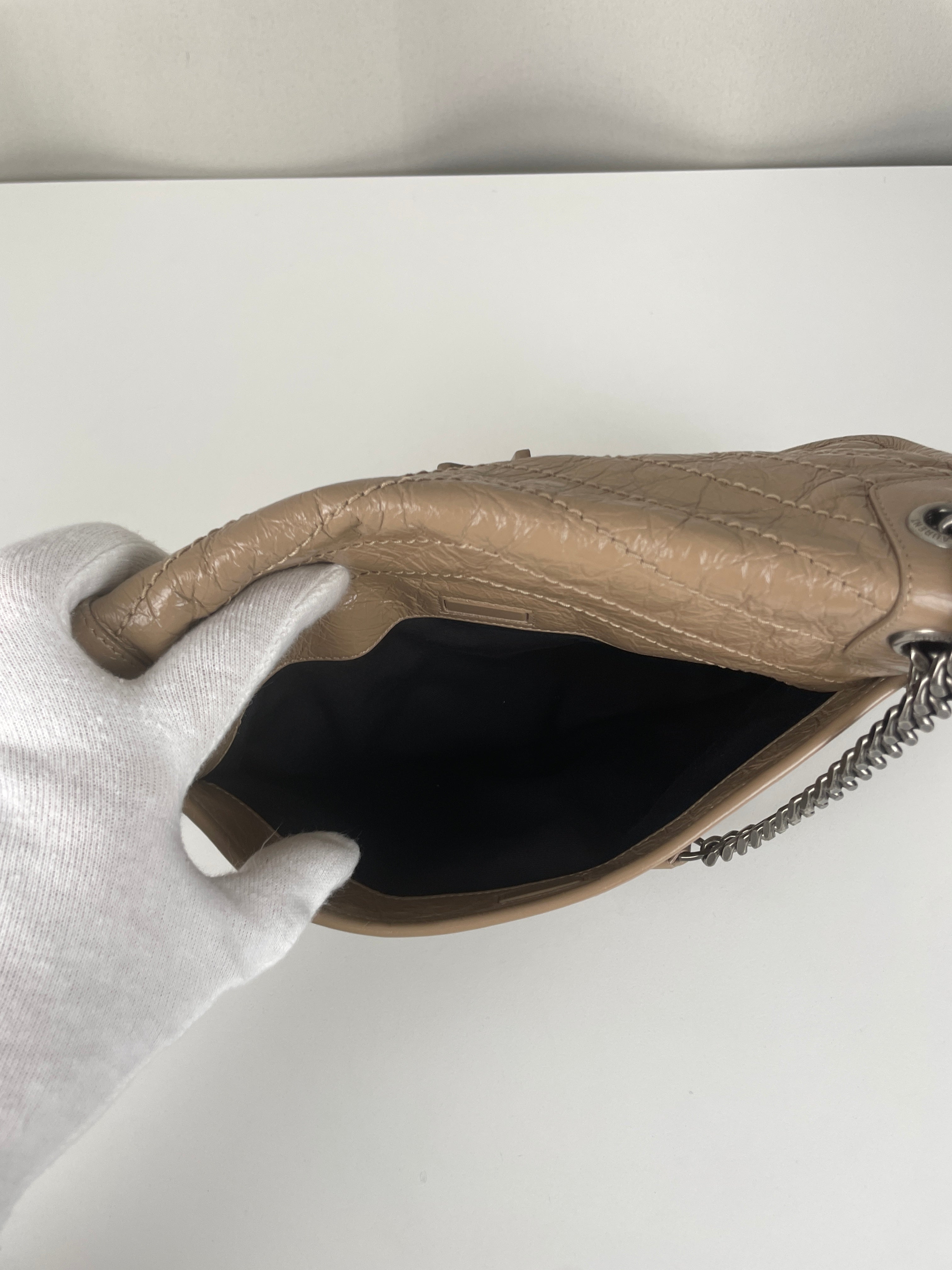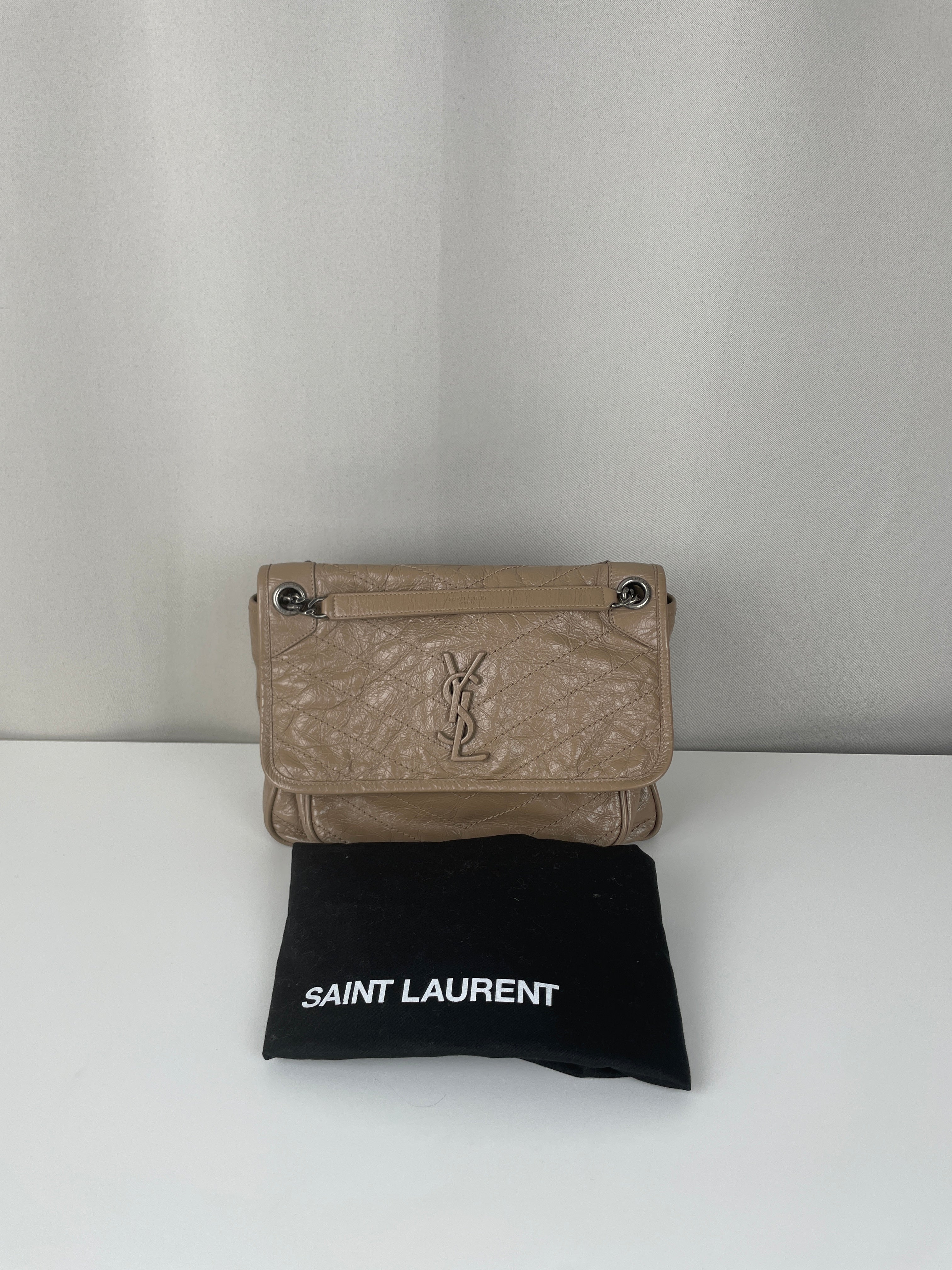 Le Niki Medium est l'un des modèles les plus contemporains et distinctifs de Saint Laurent. Cette édition en cuir beige illustre l'approche moderne du luxe de la maison avec une sophistication décontractée et un caractère authentique acquis par un usage délicat. Une pièce polyvalente qui incarne l'élégance sans effort de Saint Laurent et représente le mélange parfait entre chic décontracté et savoir-faire raffiné.