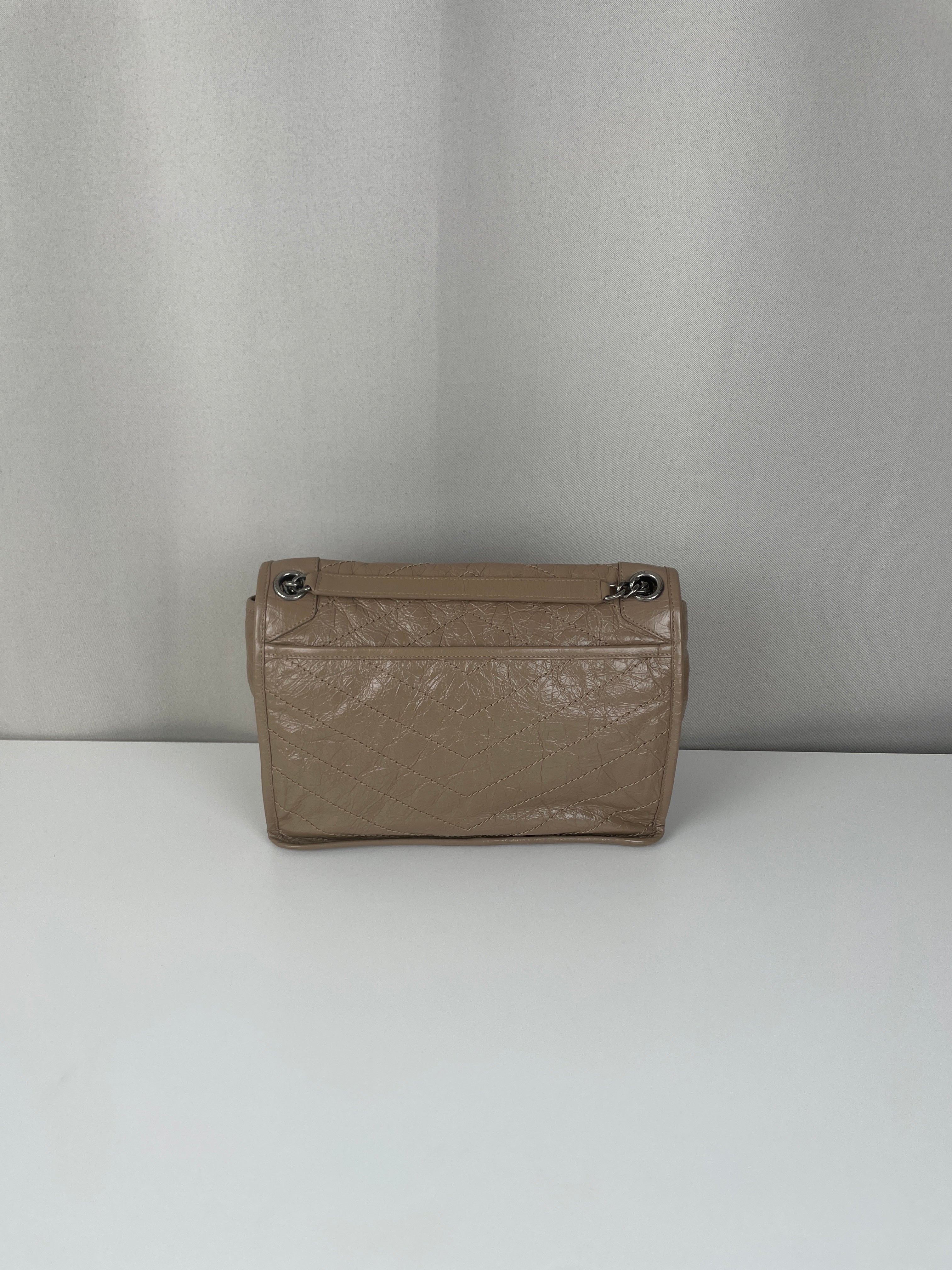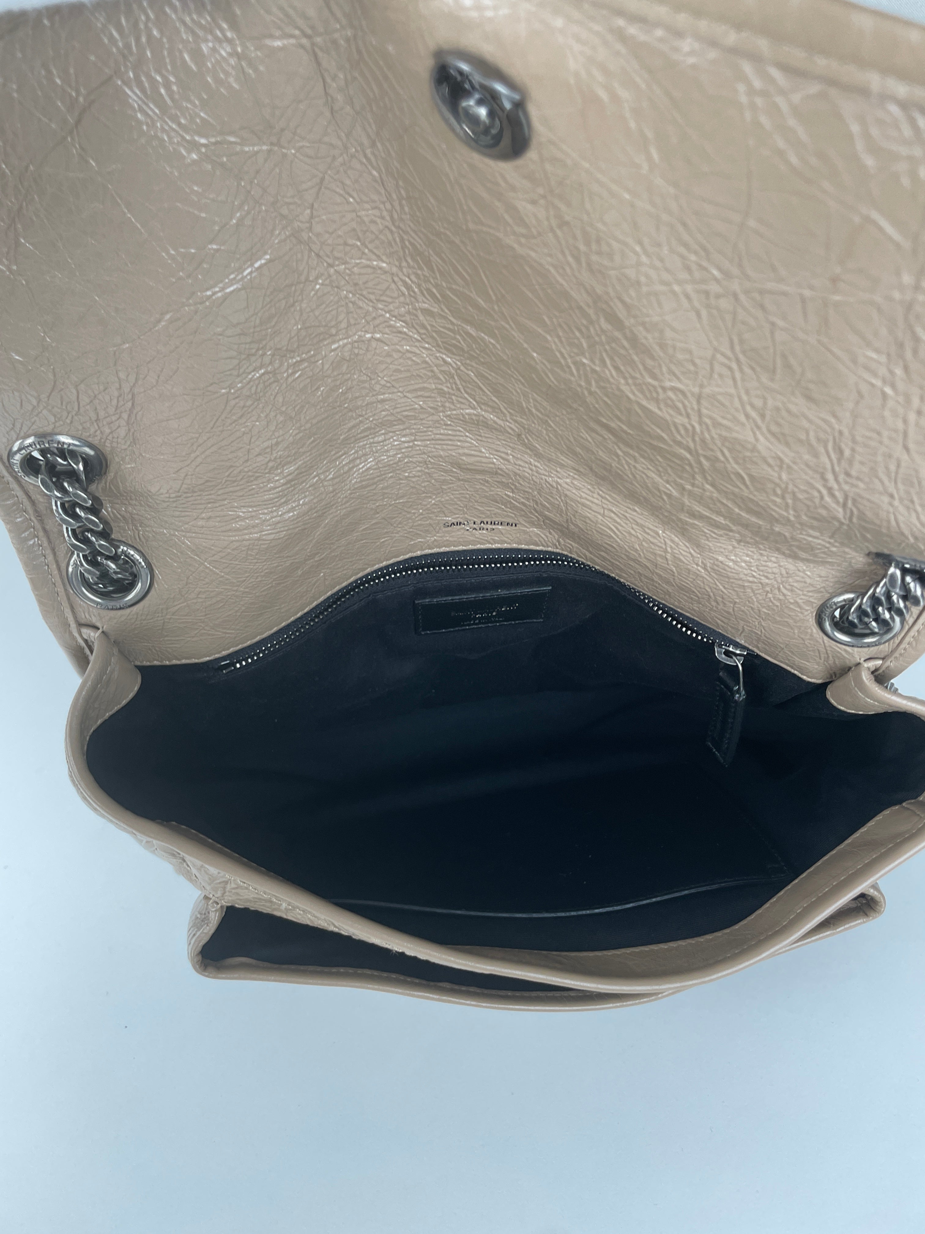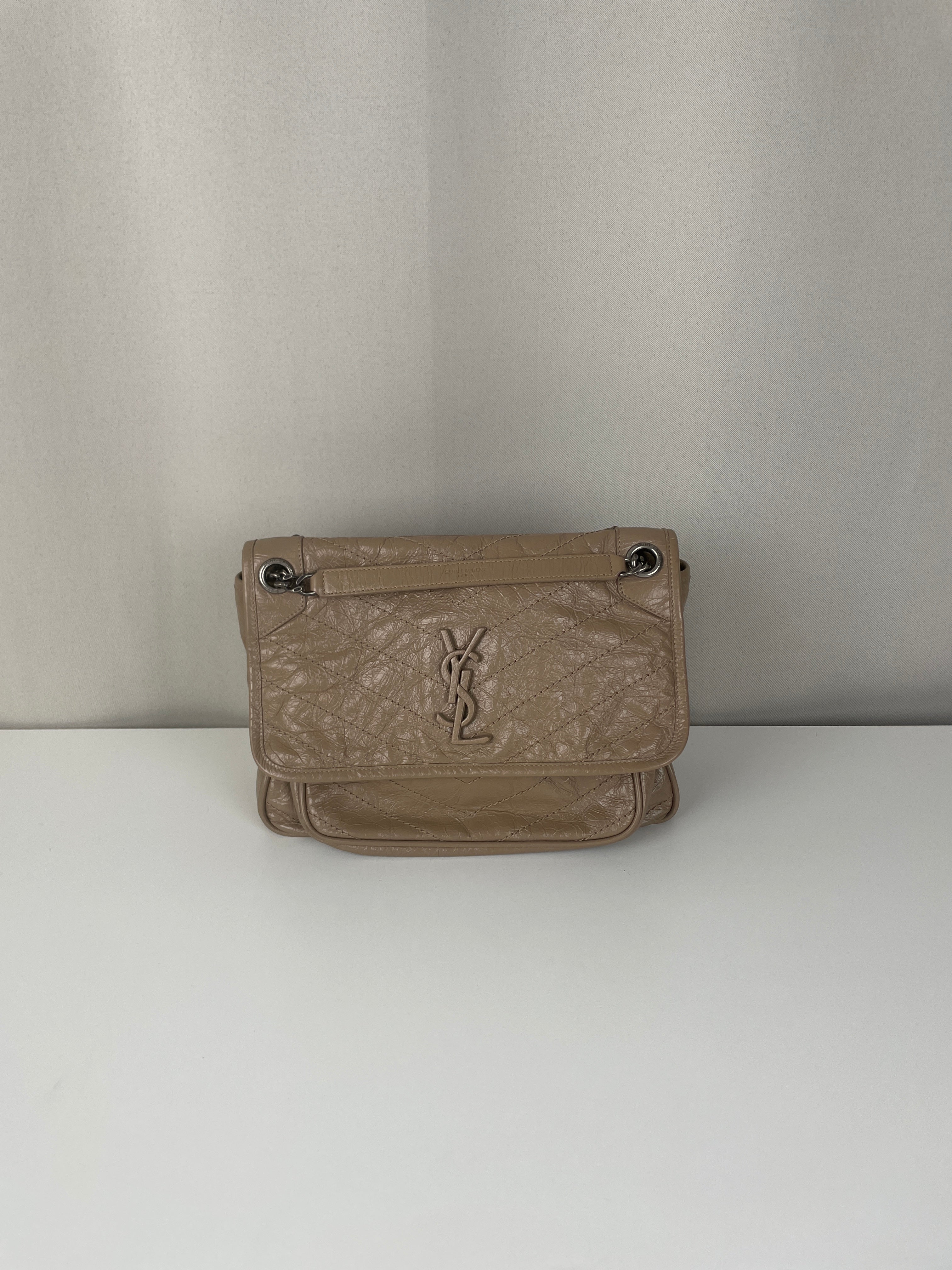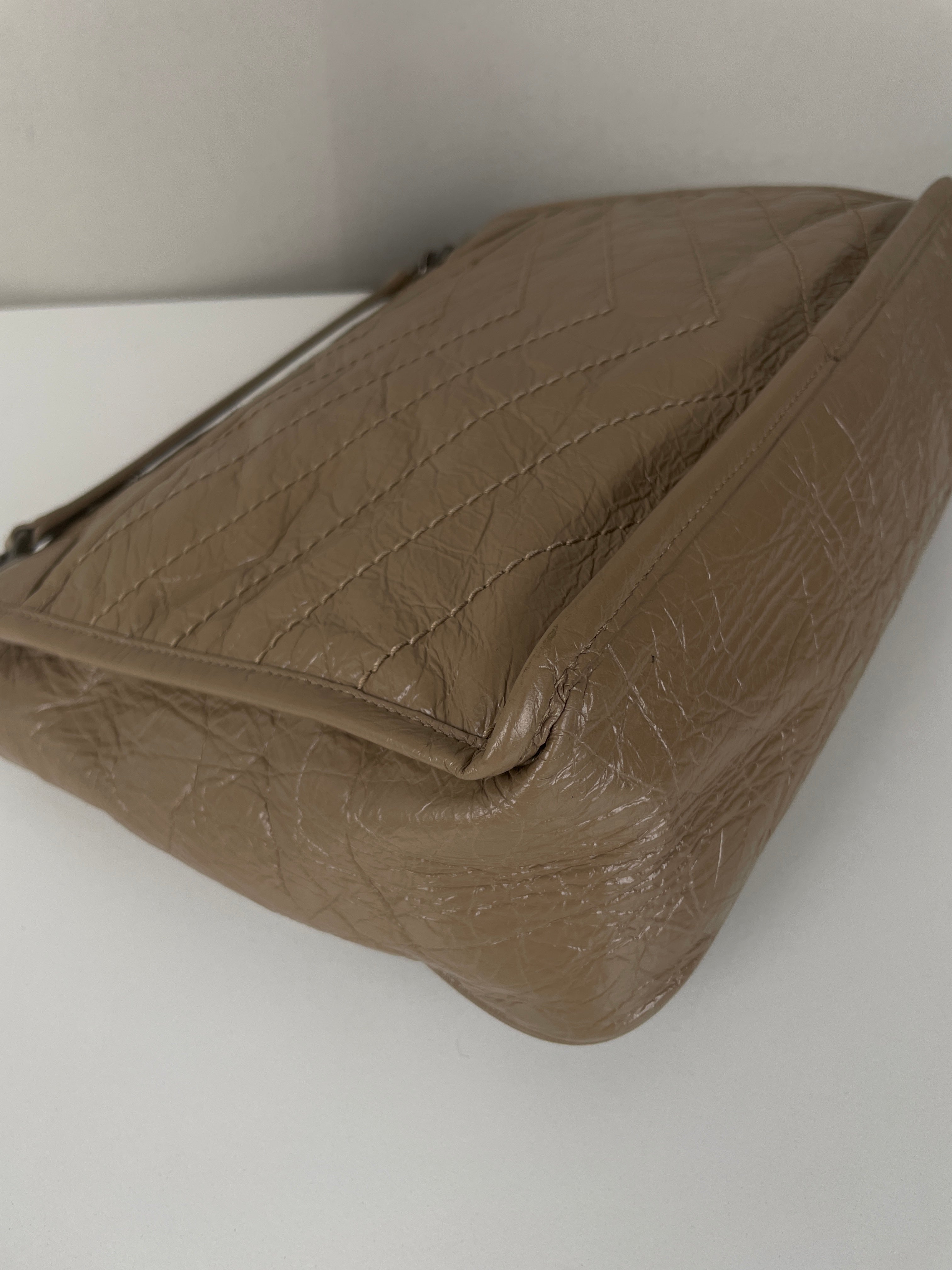 Le Niki Medium est l'un des modèles les plus contemporains et distinctifs de Saint Laurent. Cette édition en cuir beige illustre l'approche moderne du luxe de la maison avec une sophistication décontractée et un caractère authentique acquis par un usage délicat. Une pièce polyvalente qui incarne l'élégance sans effort de Saint Laurent et représente le mélange parfait entre chic décontracté et savoir-faire raffiné.