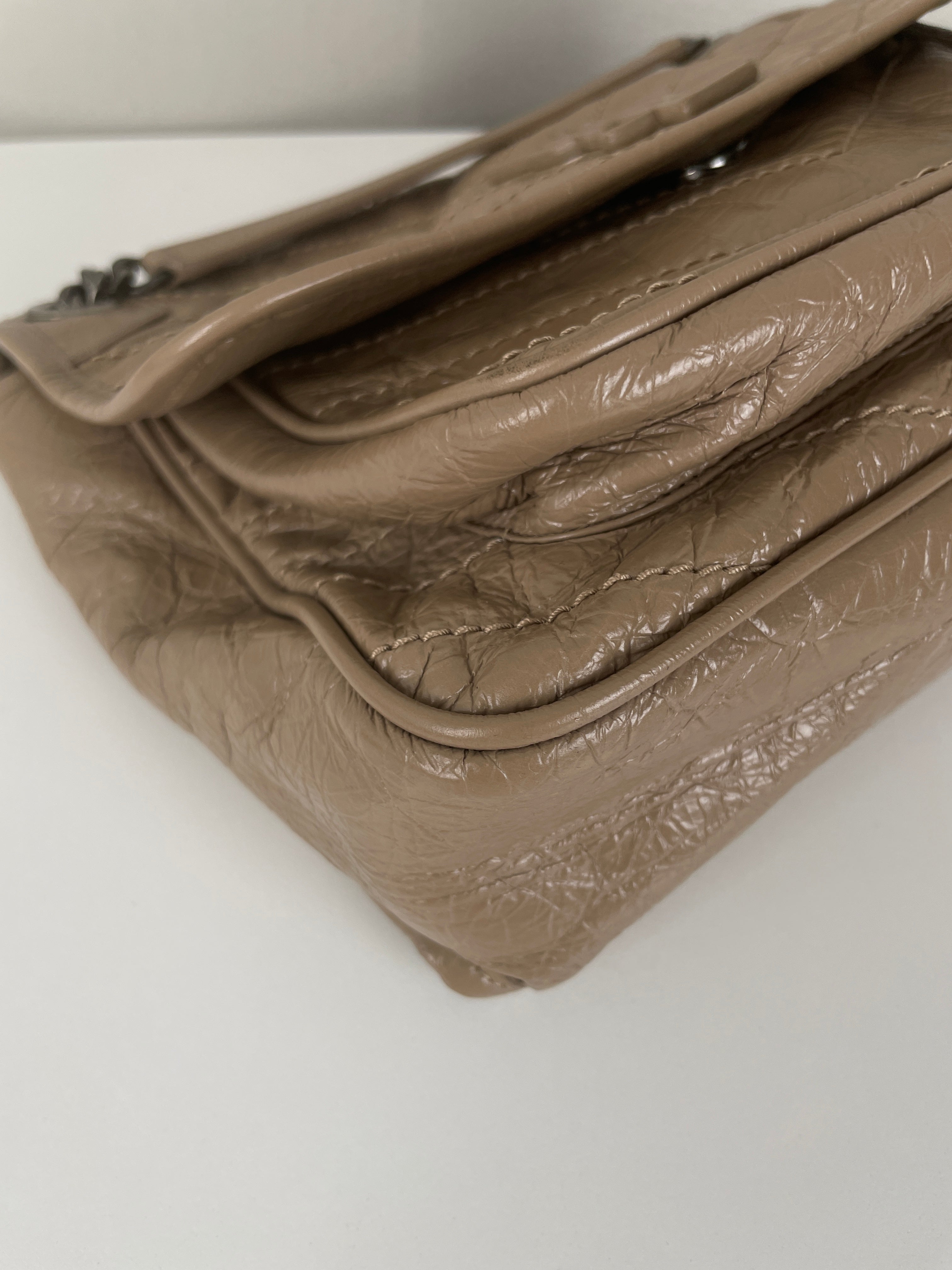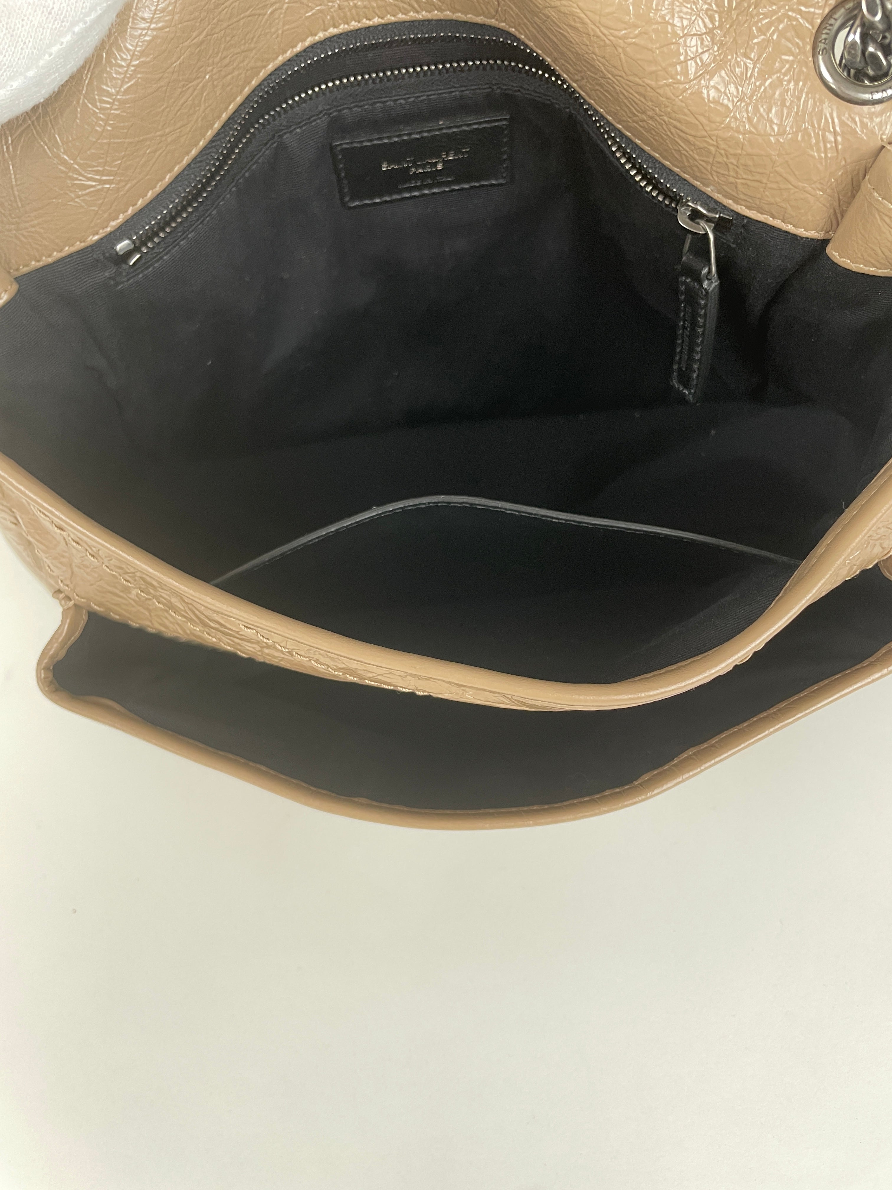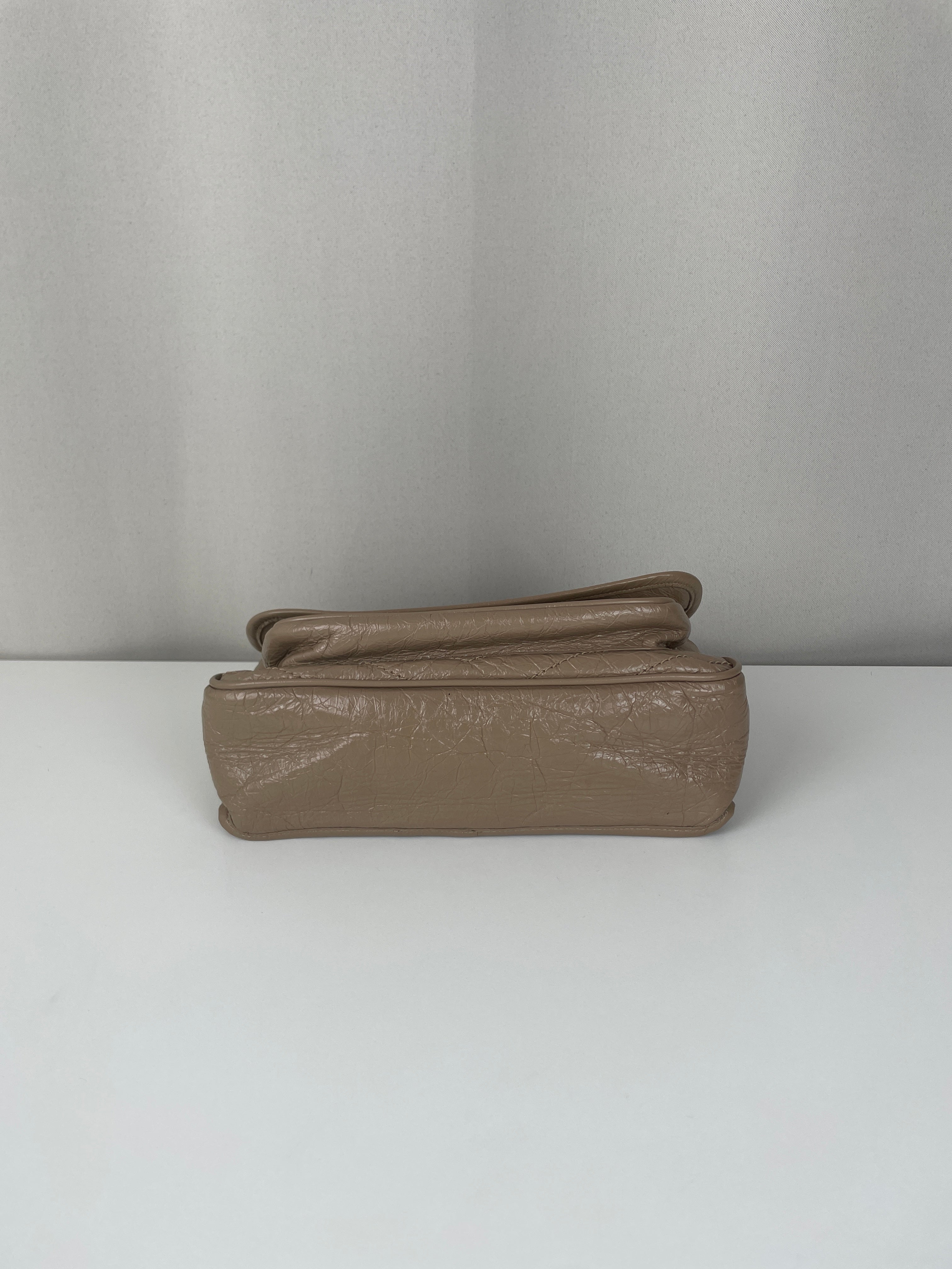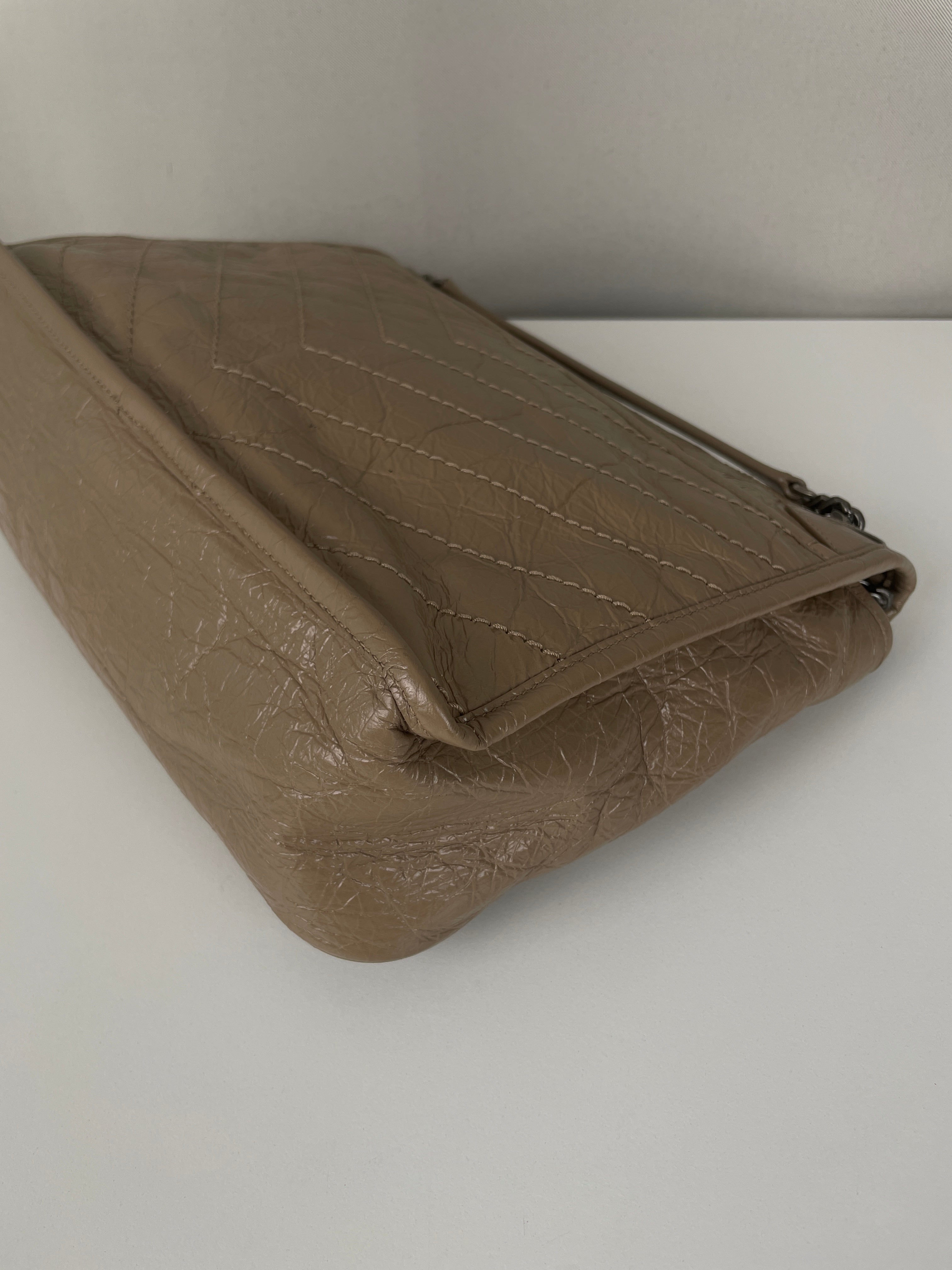 Le Niki Medium est l'un des modèles les plus contemporains et distinctifs de Saint Laurent. Cette édition en cuir beige illustre l'approche moderne du luxe de la maison avec une sophistication décontractée et un caractère authentique acquis par un usage délicat. Une pièce polyvalente qui incarne l'élégance sans effort de Saint Laurent et représente le mélange parfait entre chic décontracté et savoir-faire raffiné.