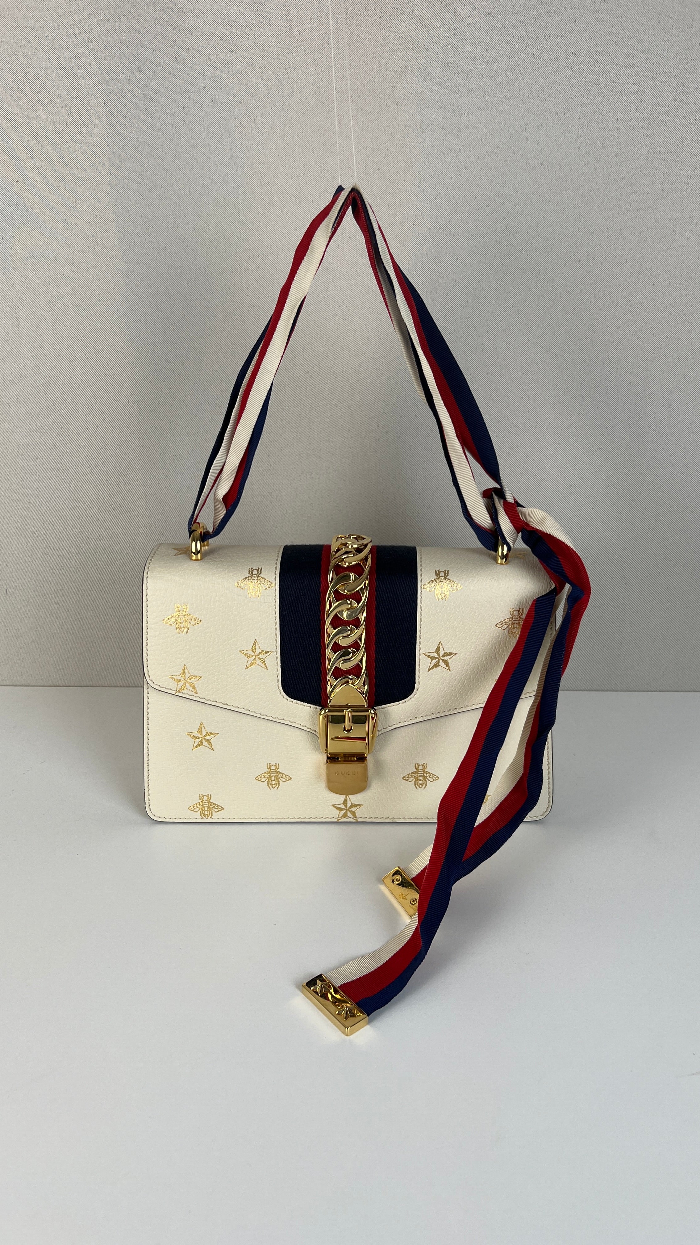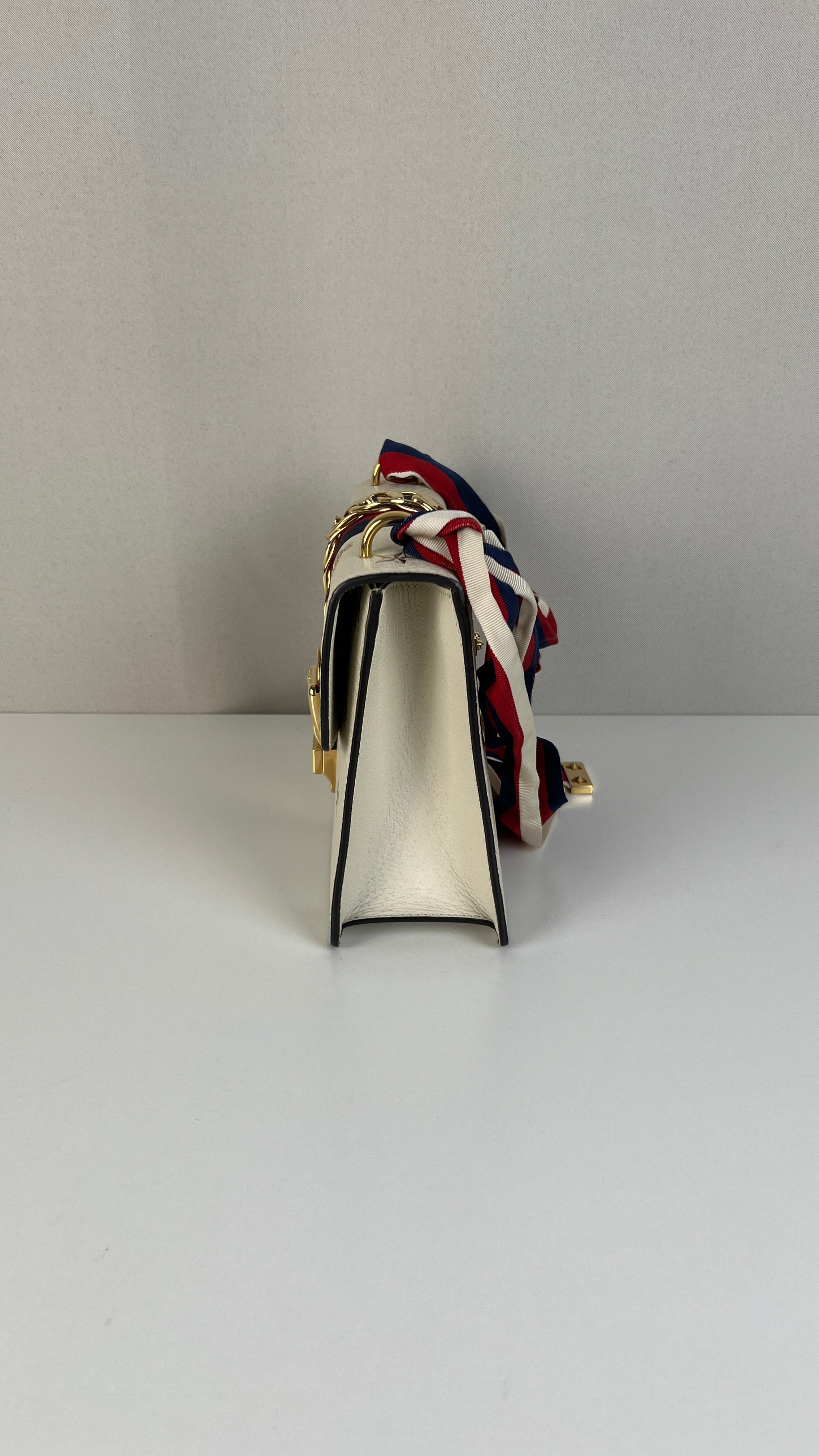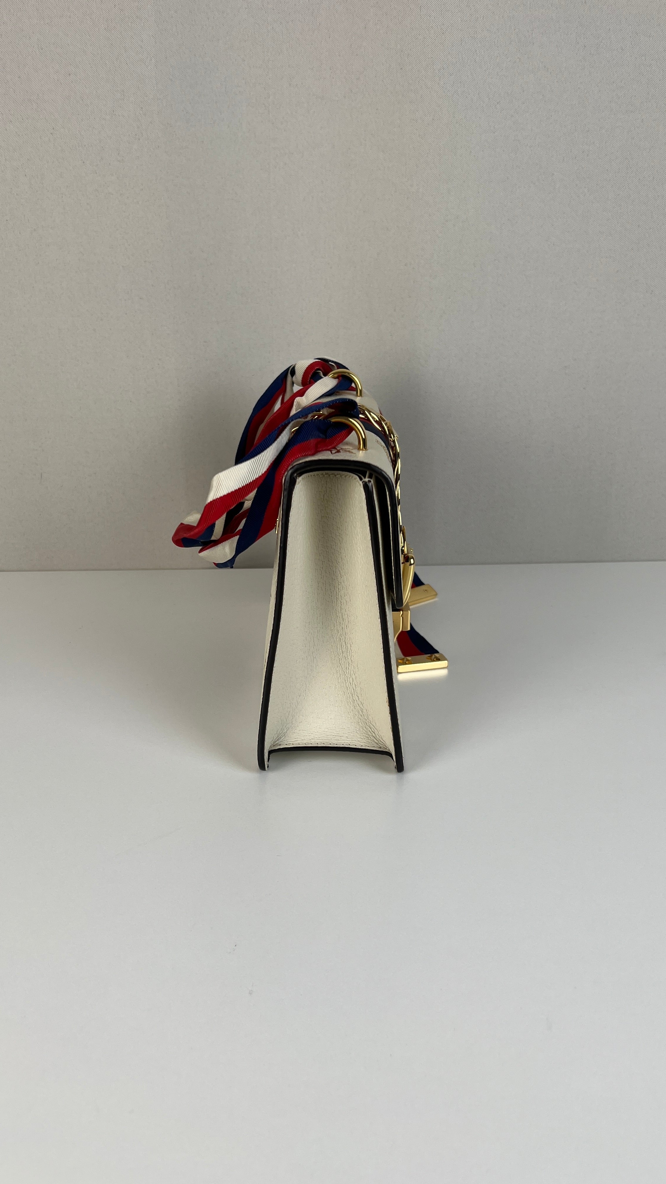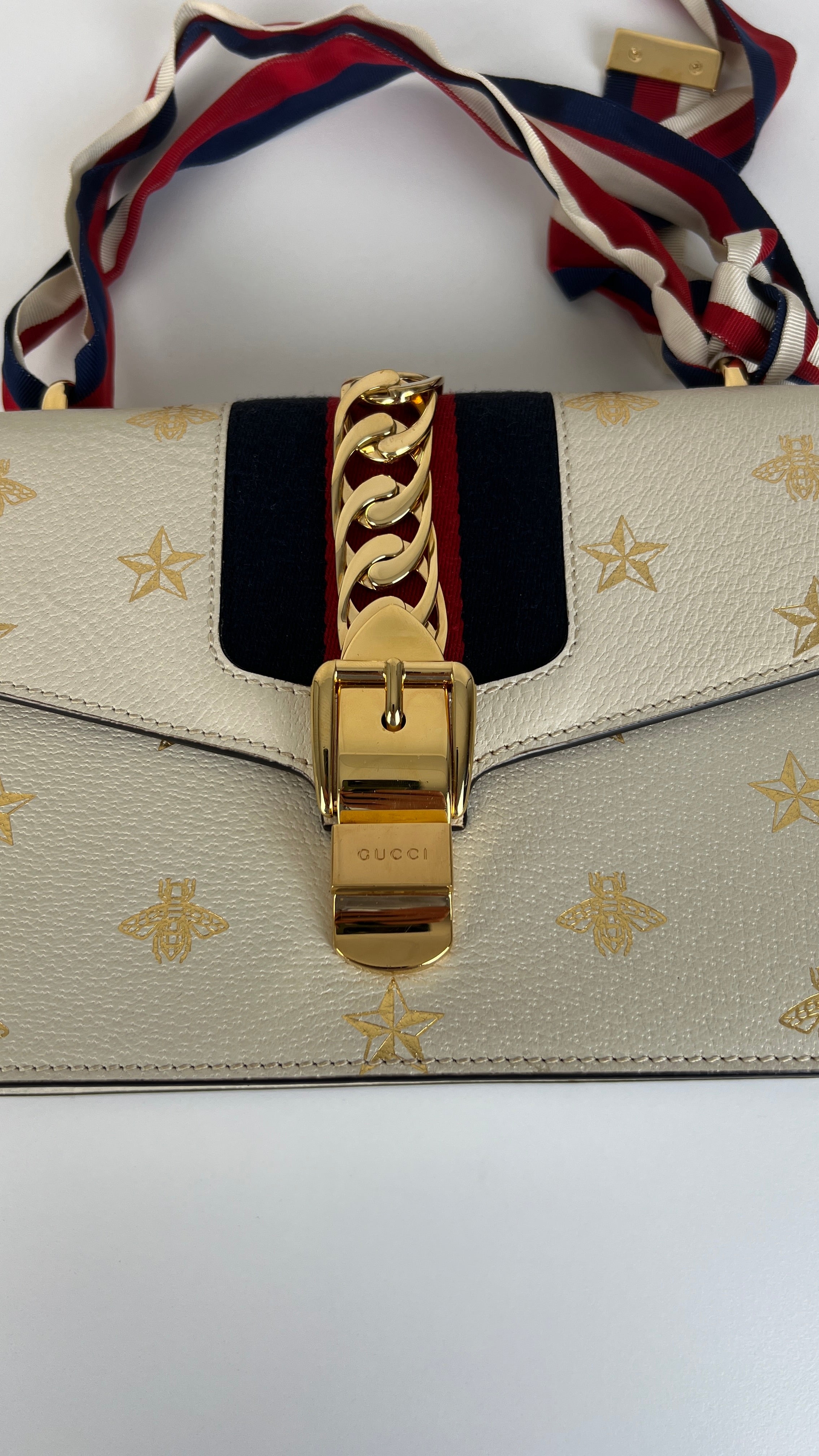 Ce sac Gucci Sylvie en cuir crème est en excellent état. Le cuir est en très bon état. Les coins sont en très bon état. La lanière est en excellent état, vous avez la lanière en cuir et celle en tissu en bleu, blanc et rouge. La quincaillerie est en très bon état, quelques rayures mineures. L'intérieur est en très bon état.