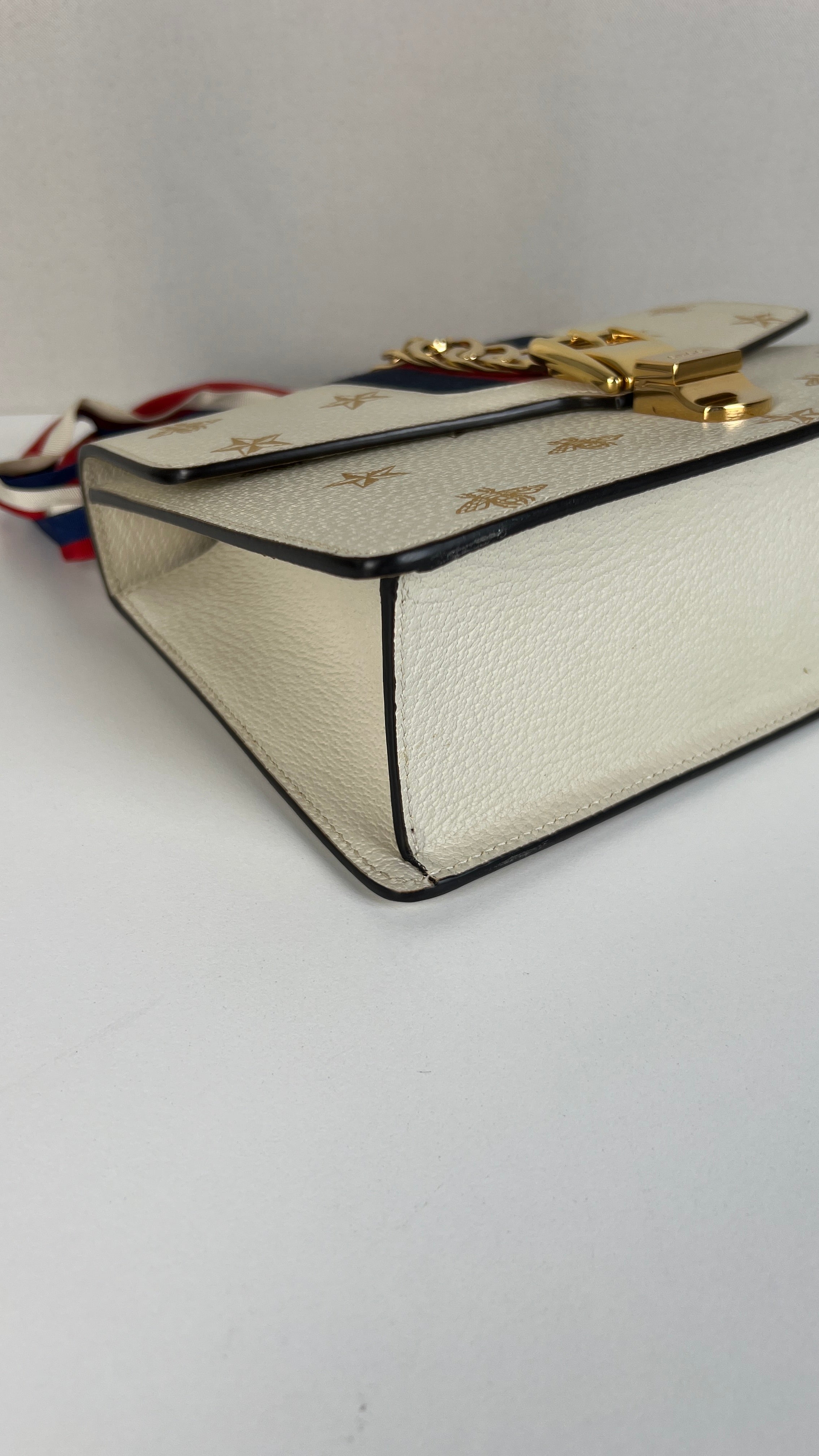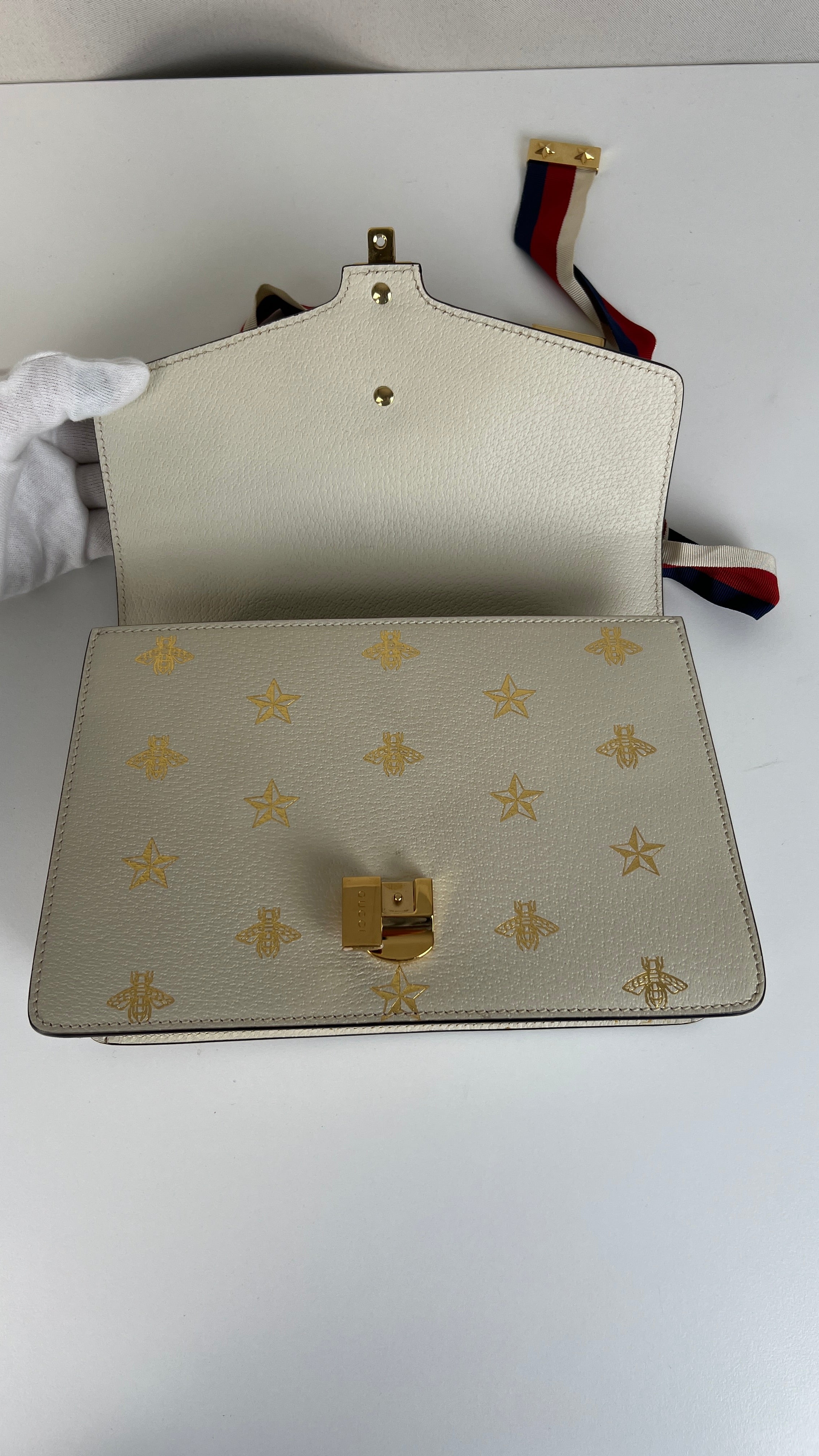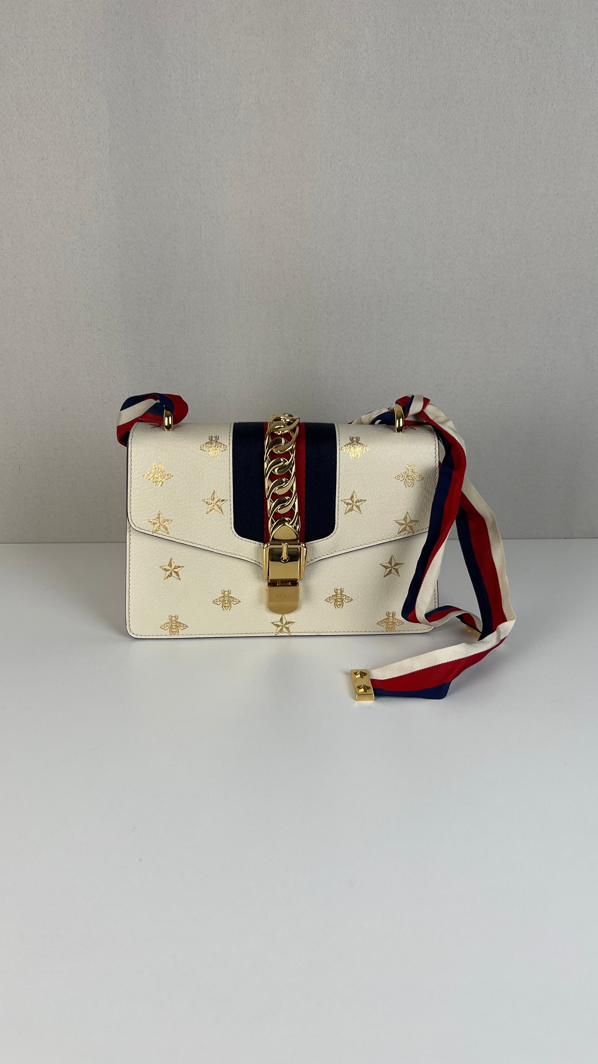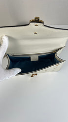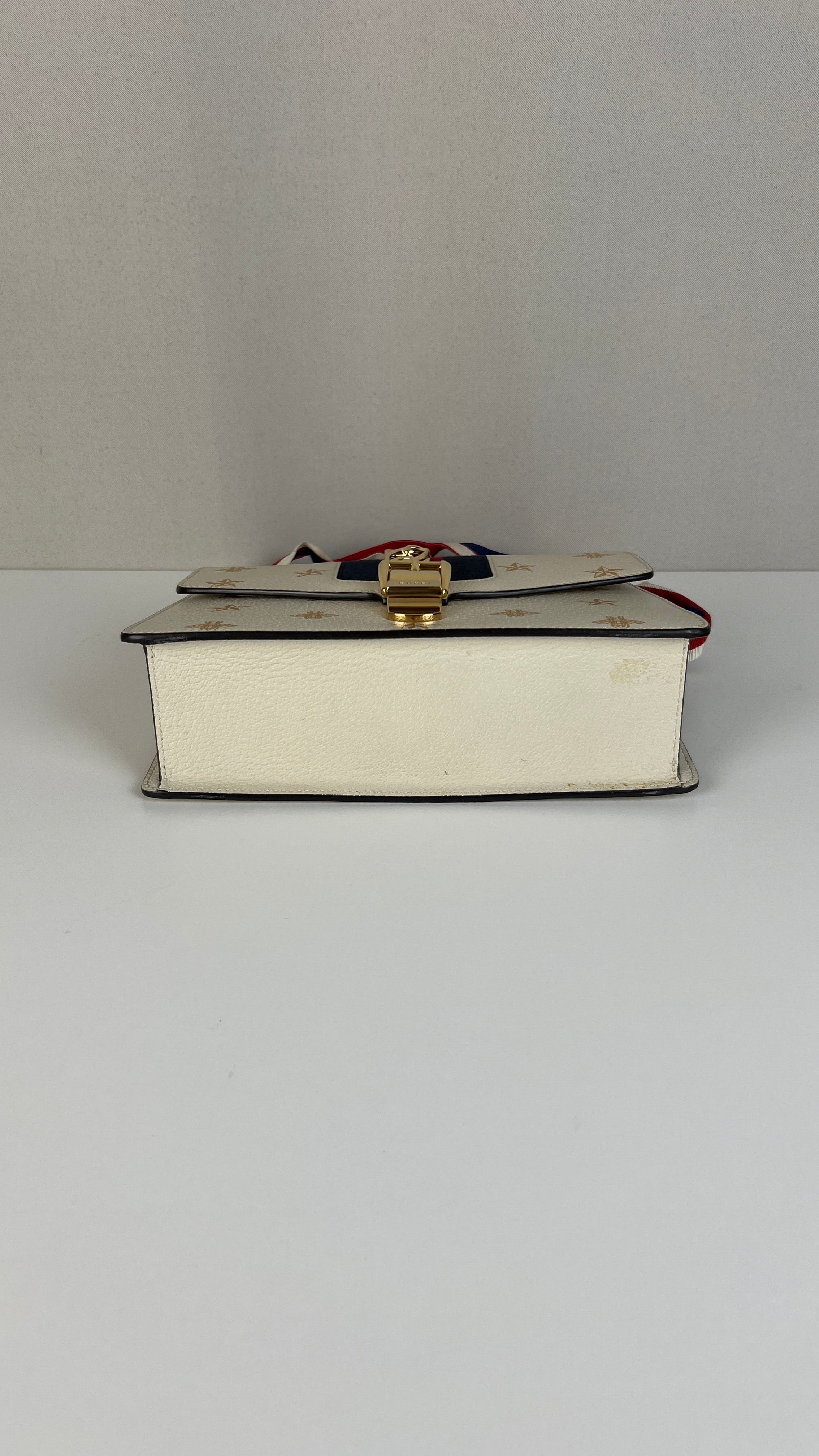 Ce sac Gucci Sylvie en cuir crème est en excellent état. Le cuir est en très bon état. Les coins sont en très bon état. La lanière est en excellent état, vous avez la lanière en cuir et celle en tissu en bleu, blanc et rouge. La quincaillerie est en très bon état, quelques rayures mineures. L'intérieur est en très bon état.