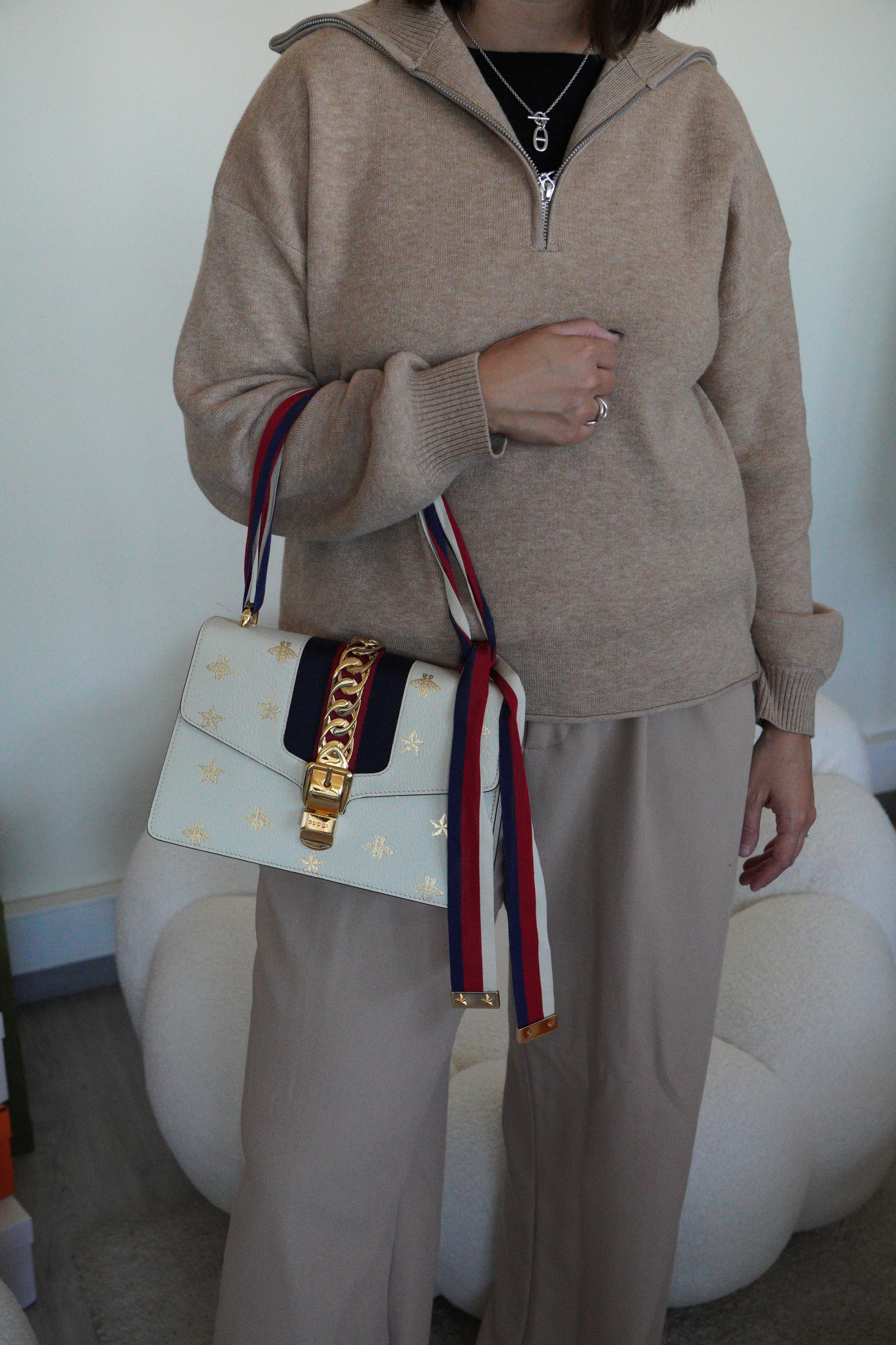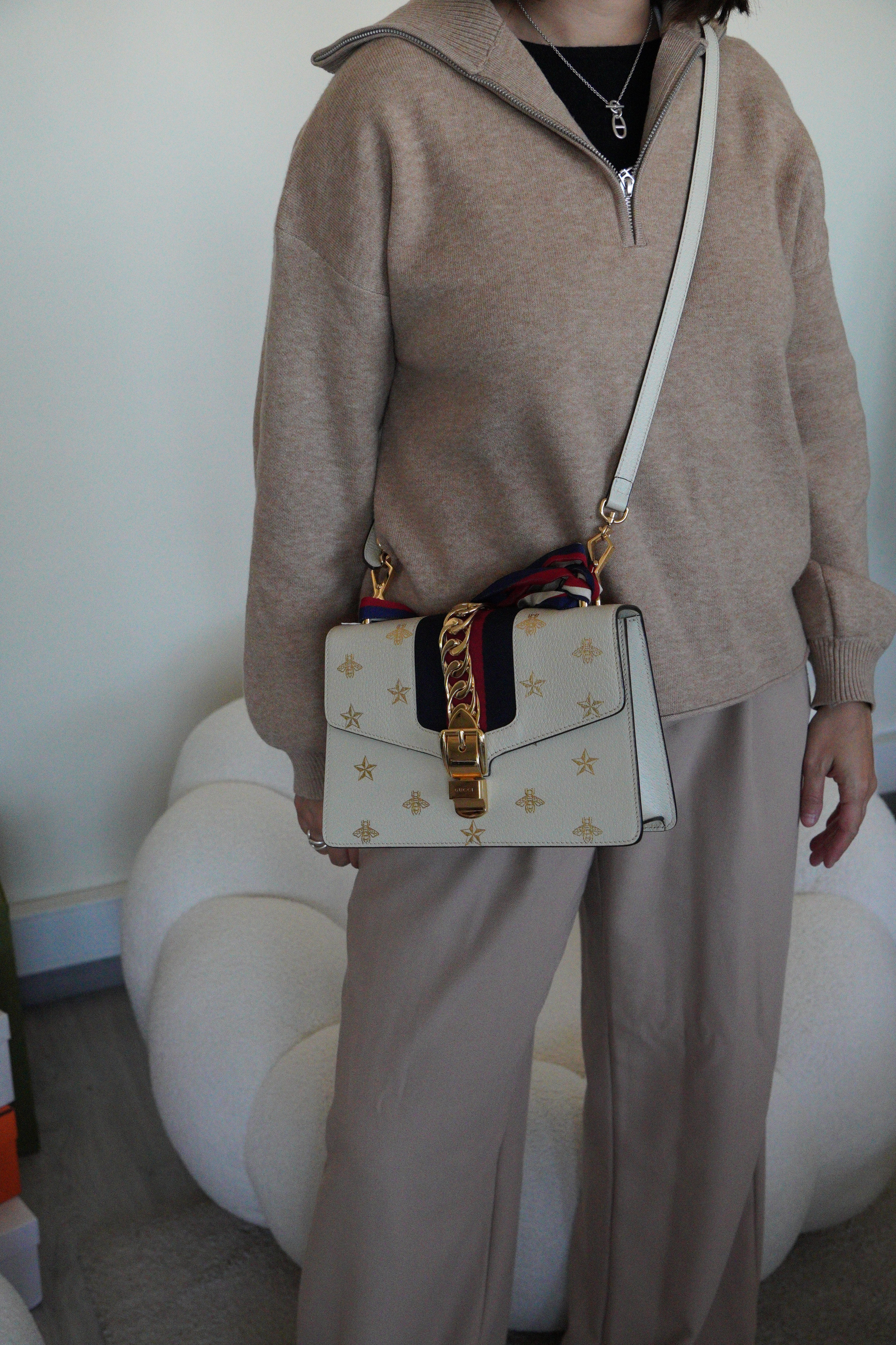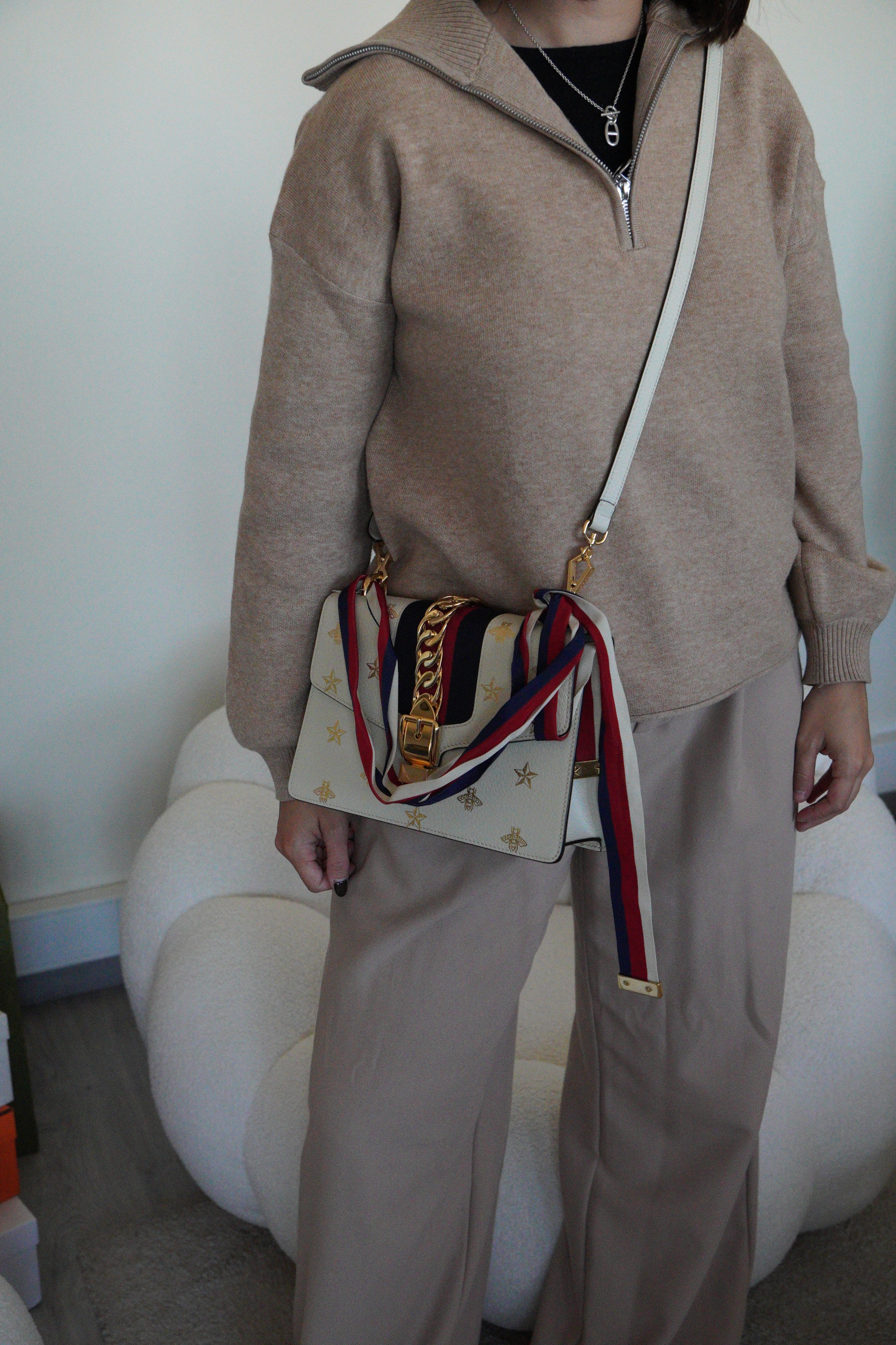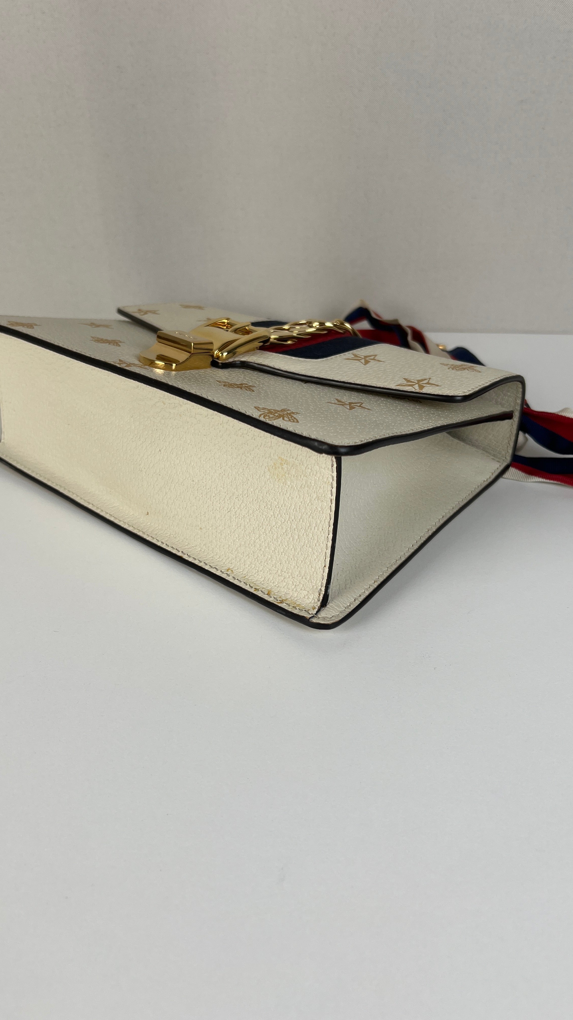 Ce sac Gucci Sylvie en cuir crème est en excellent état. Le cuir est en très bon état. Les coins sont en très bon état. La lanière est en excellent état, vous avez la lanière en cuir et celle en tissu en bleu, blanc et rouge. La quincaillerie est en très bon état, quelques rayures mineures. L'intérieur est en très bon état.