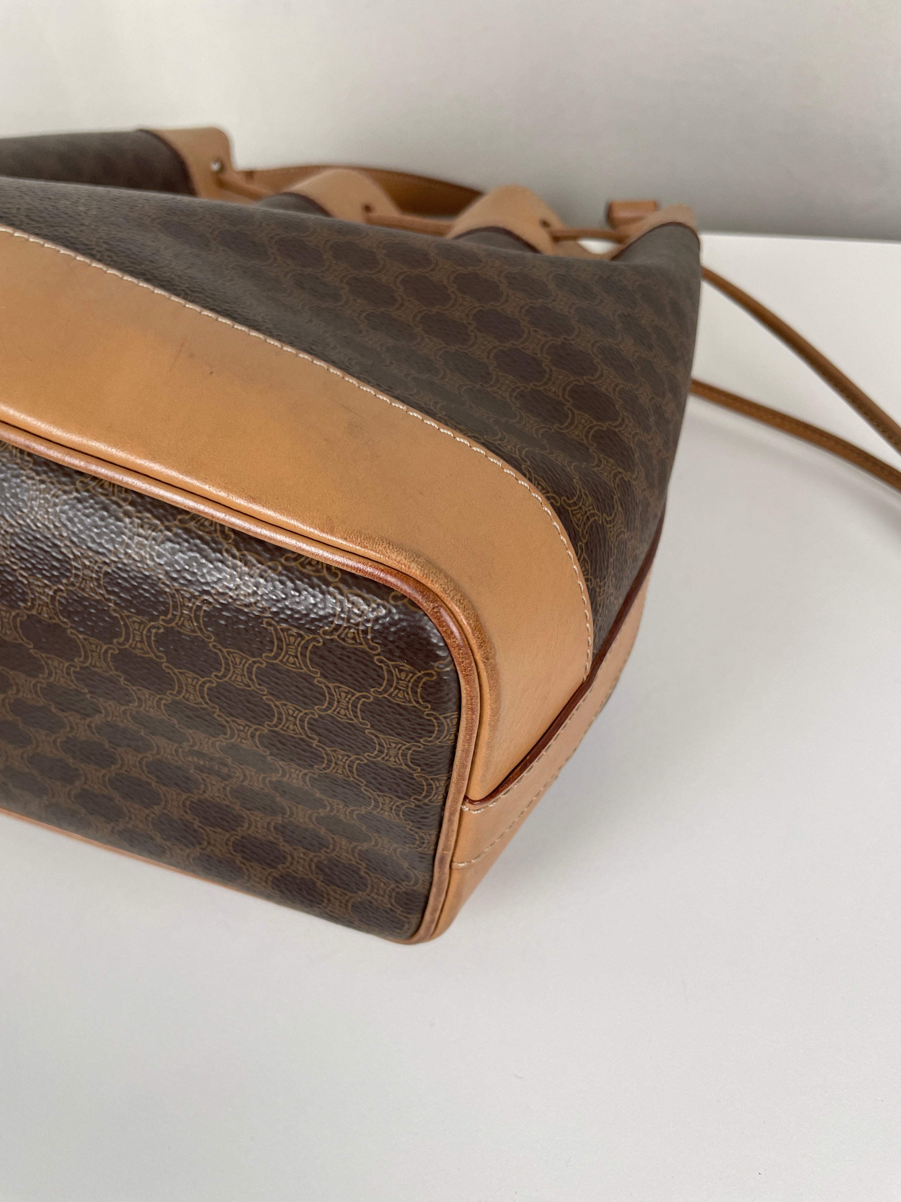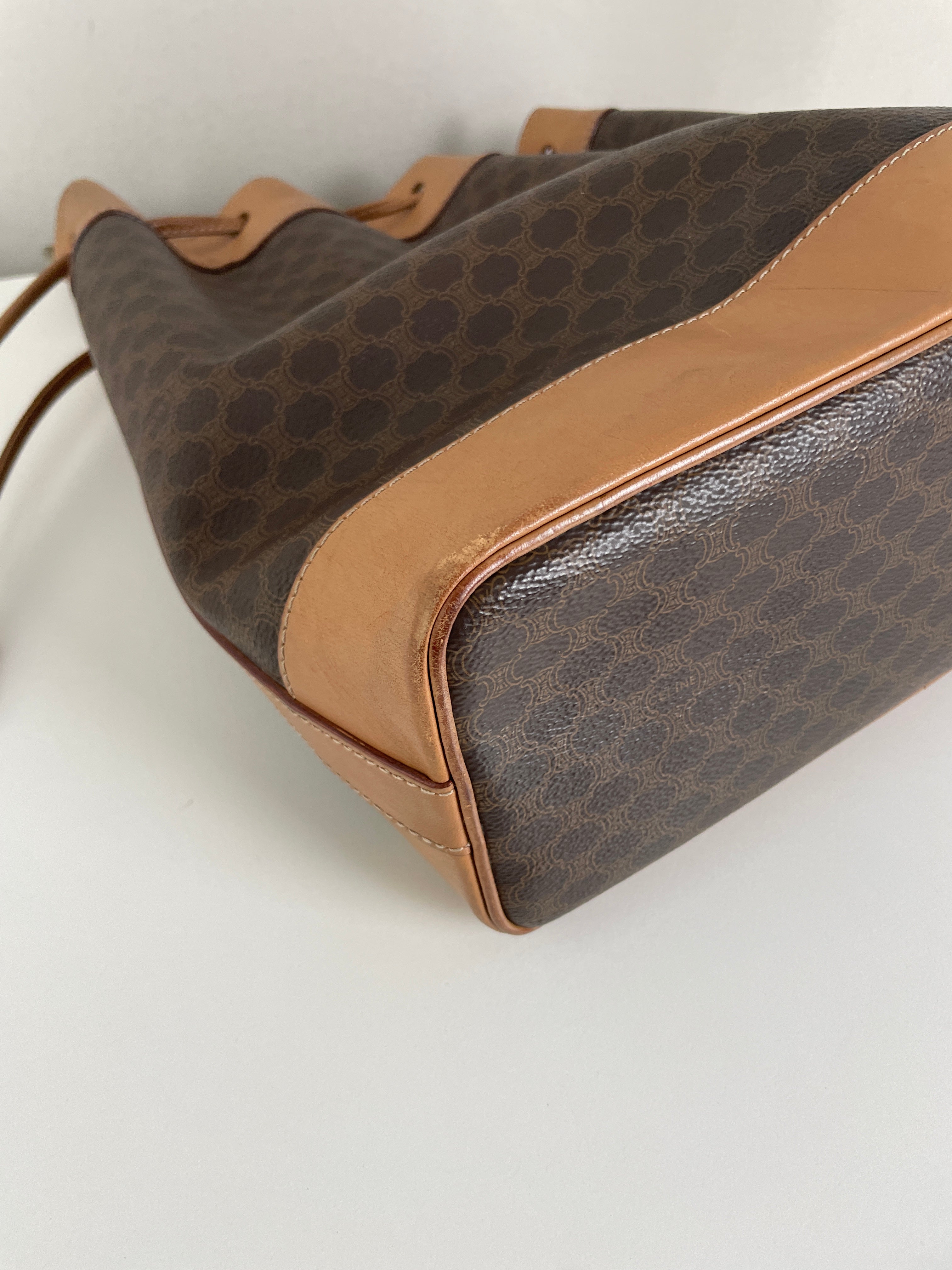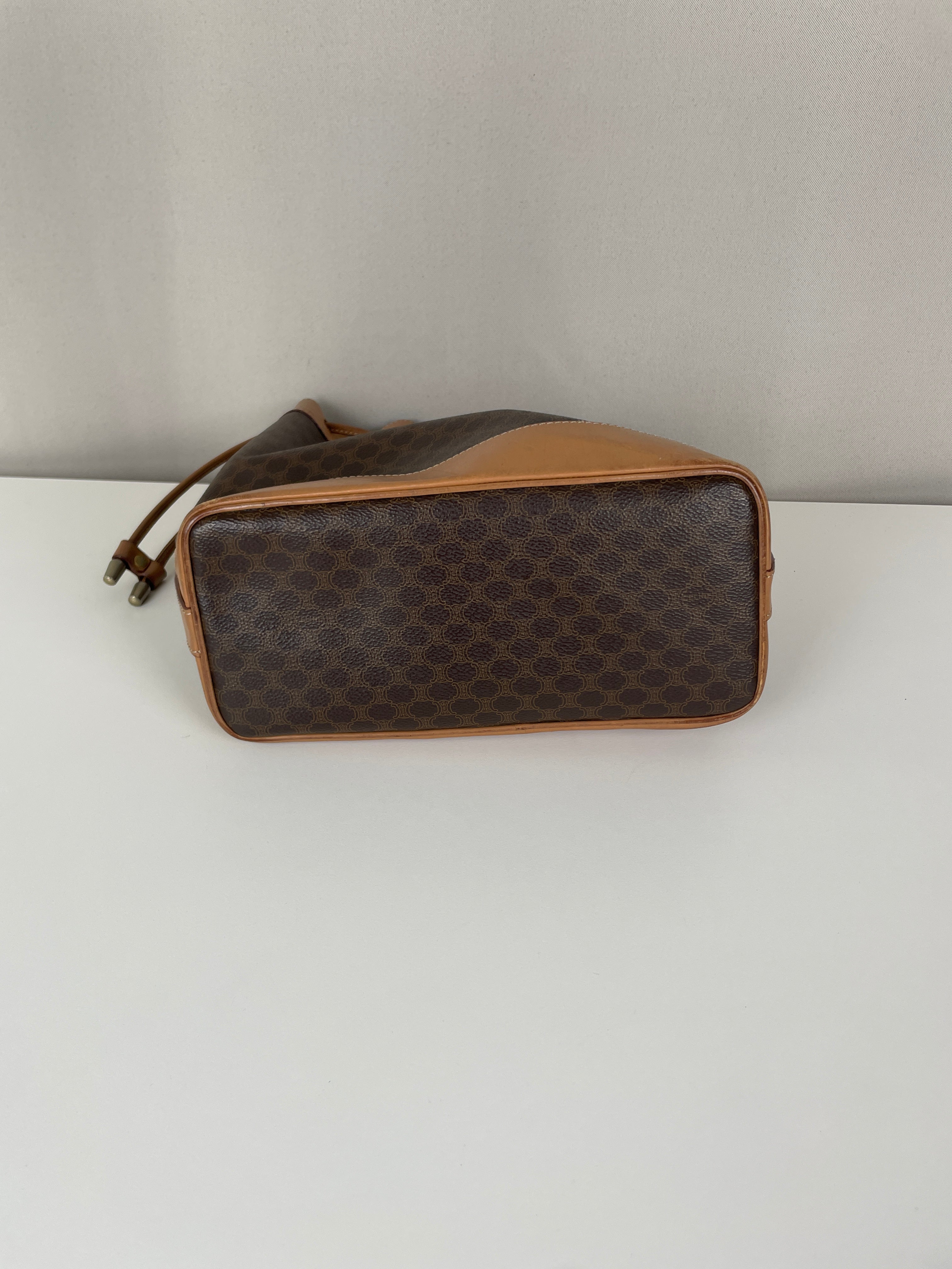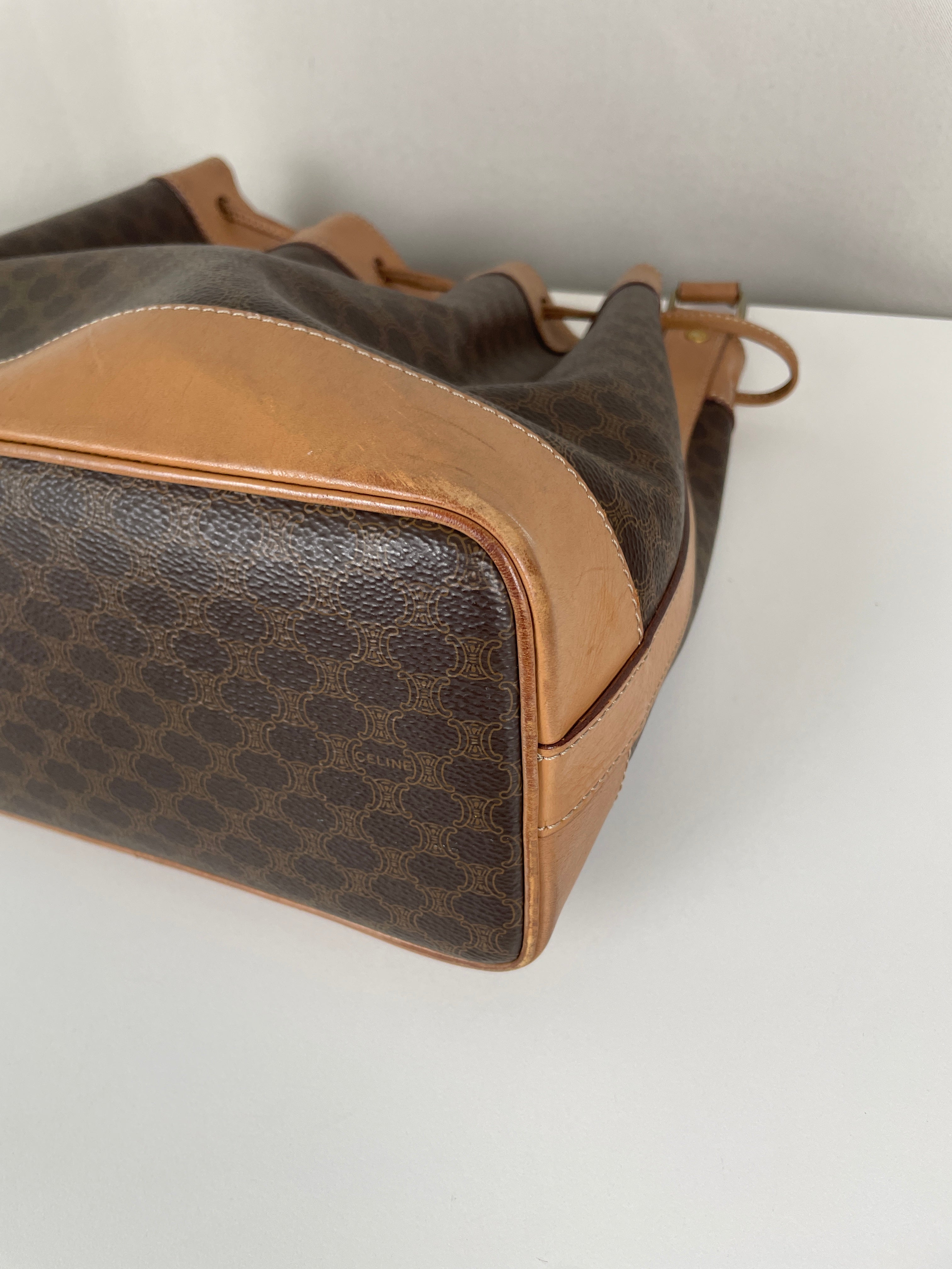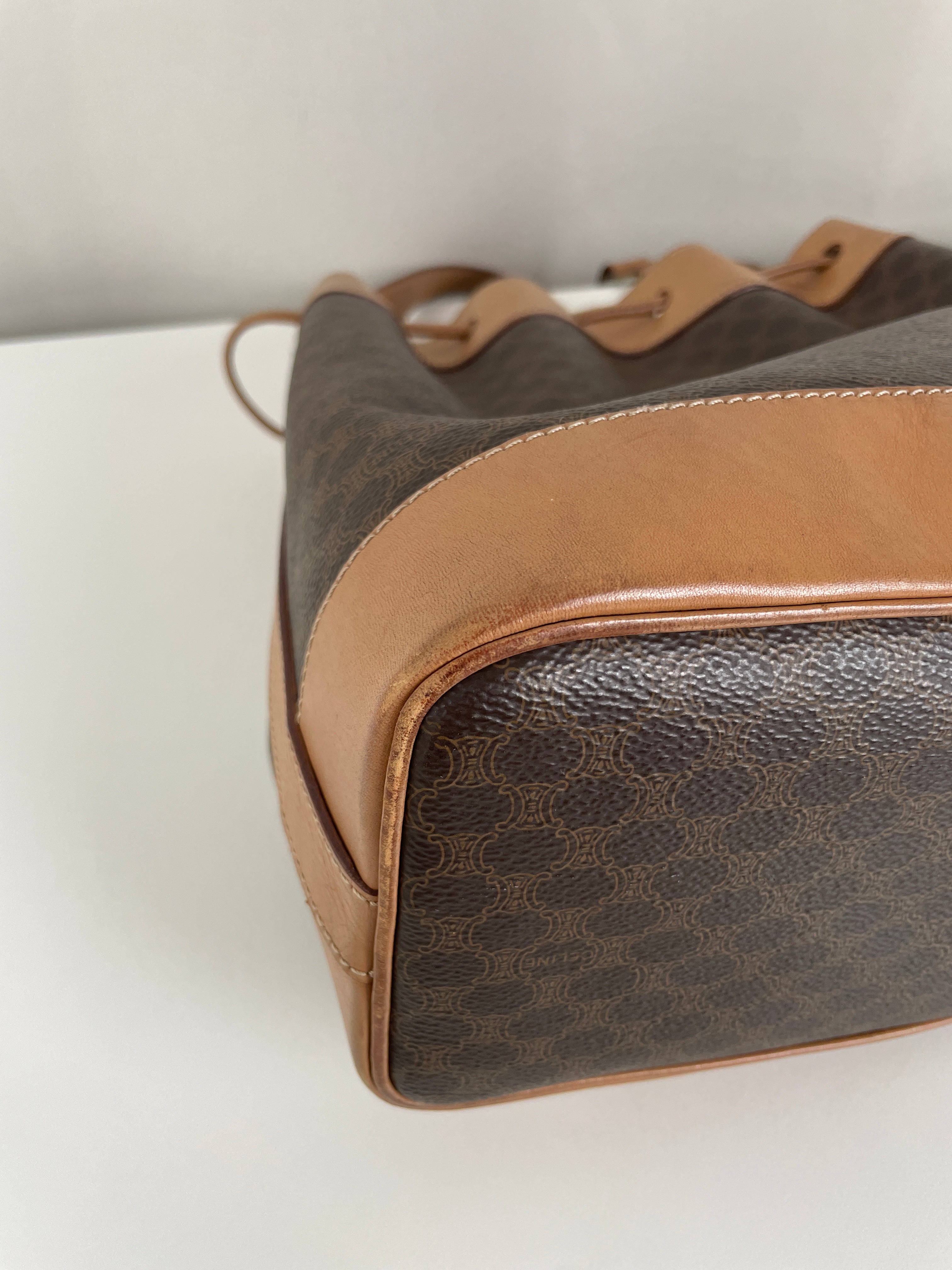 Ce sac Céline seau en toile macadam est en bon état. L'intérieur est en très bon état. Les passants sont légèrement abîmés. Les coins et le haut du sac sont abîmés, légèrement frottés.