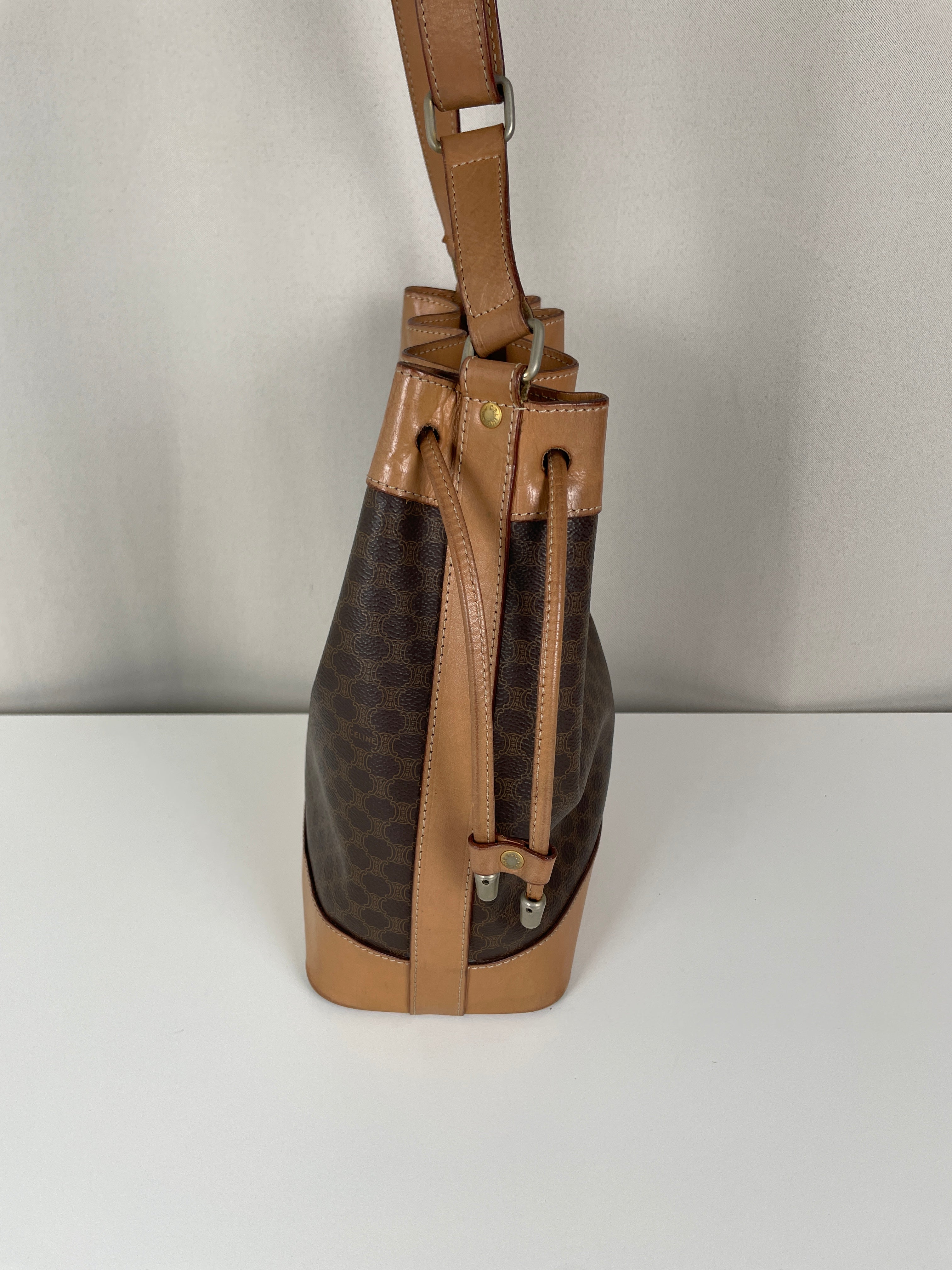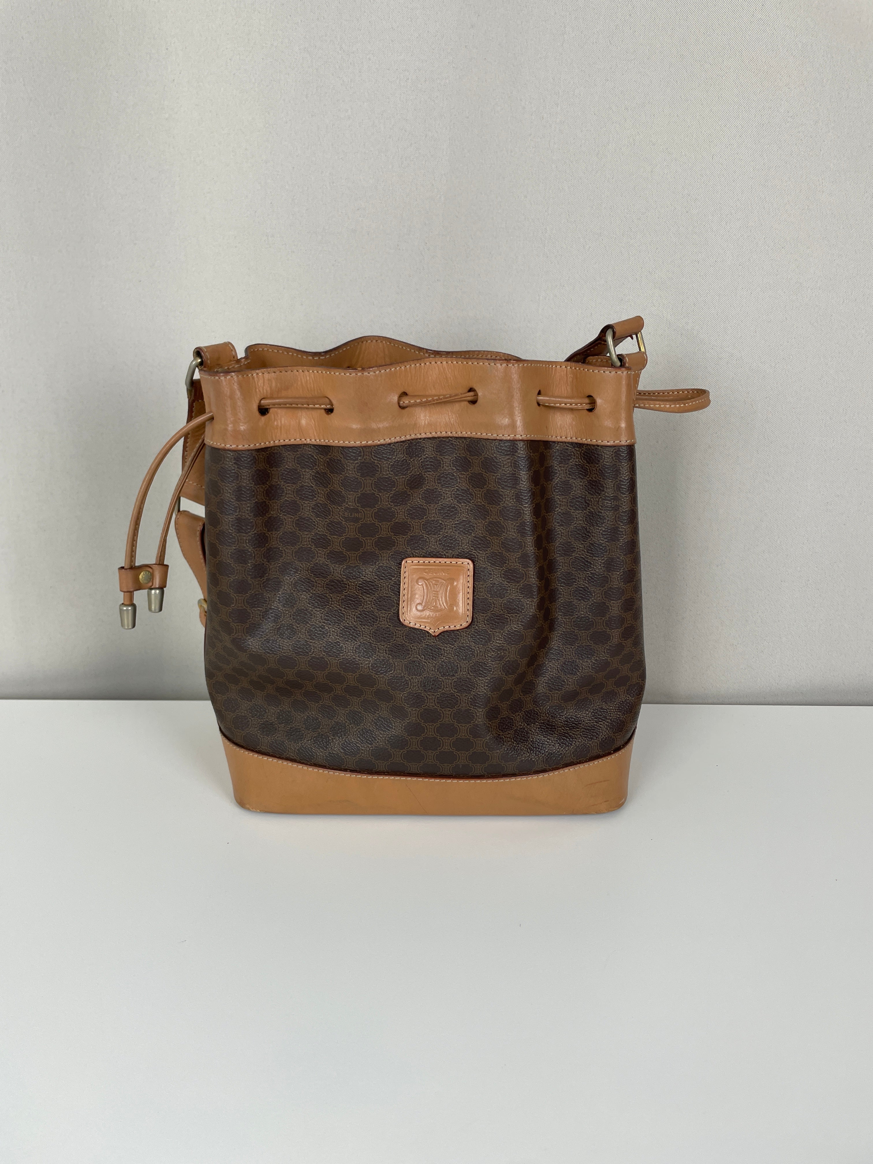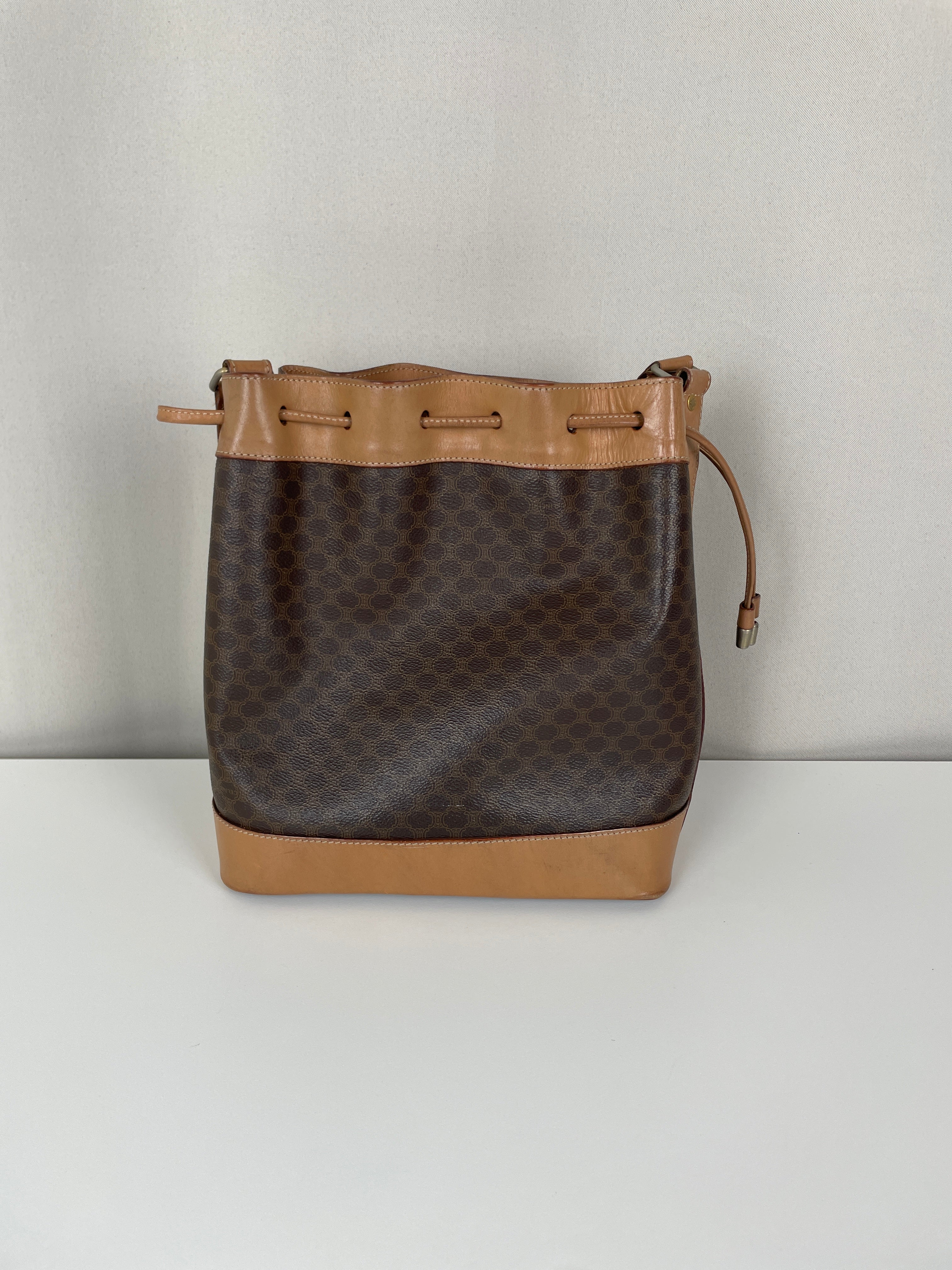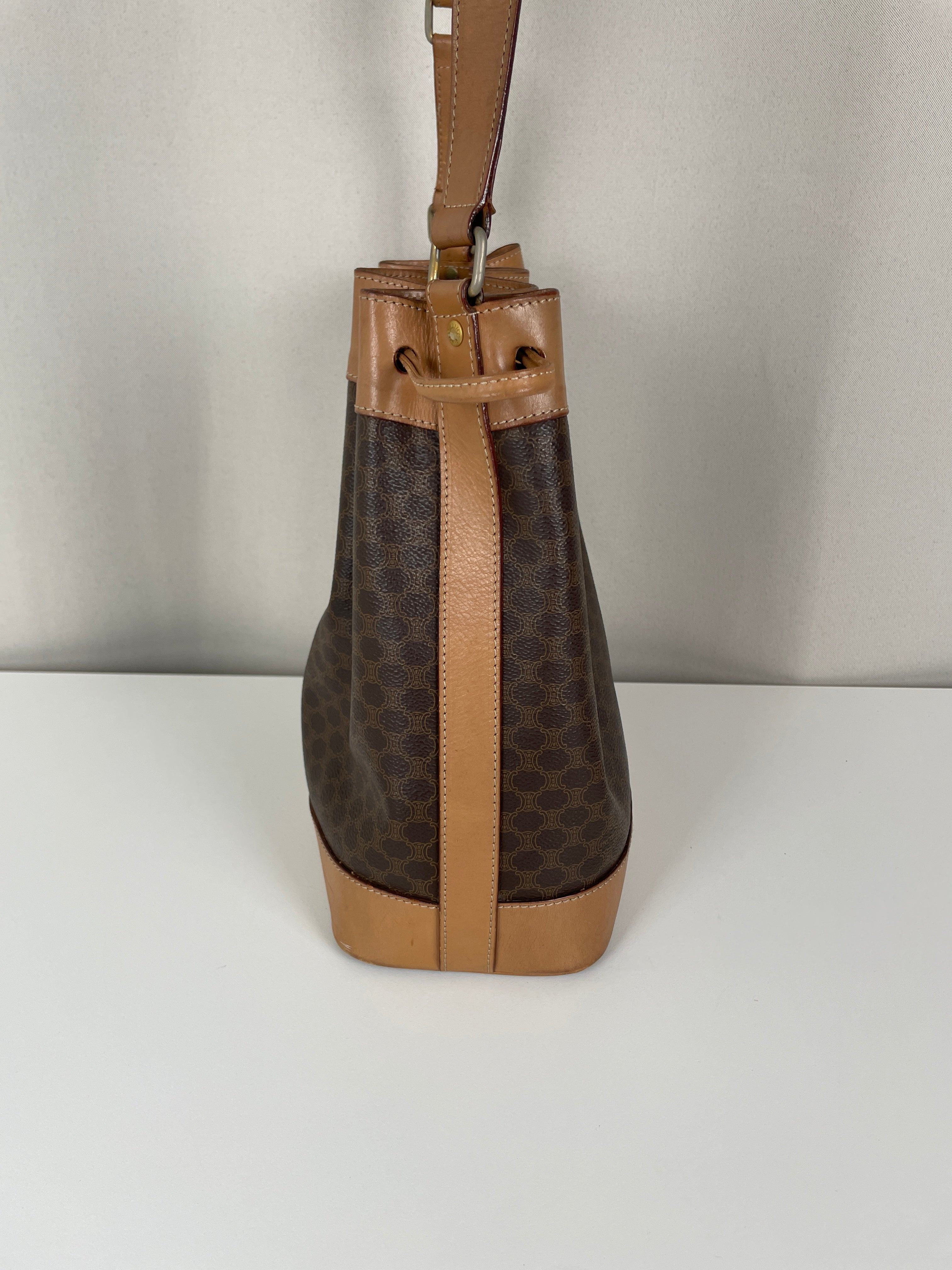 Ce sac Céline seau en toile macadam est en bon état. L'intérieur est en très bon état. Les passants sont légèrement abîmés. Les coins et le haut du sac sont abîmés, légèrement frottés.