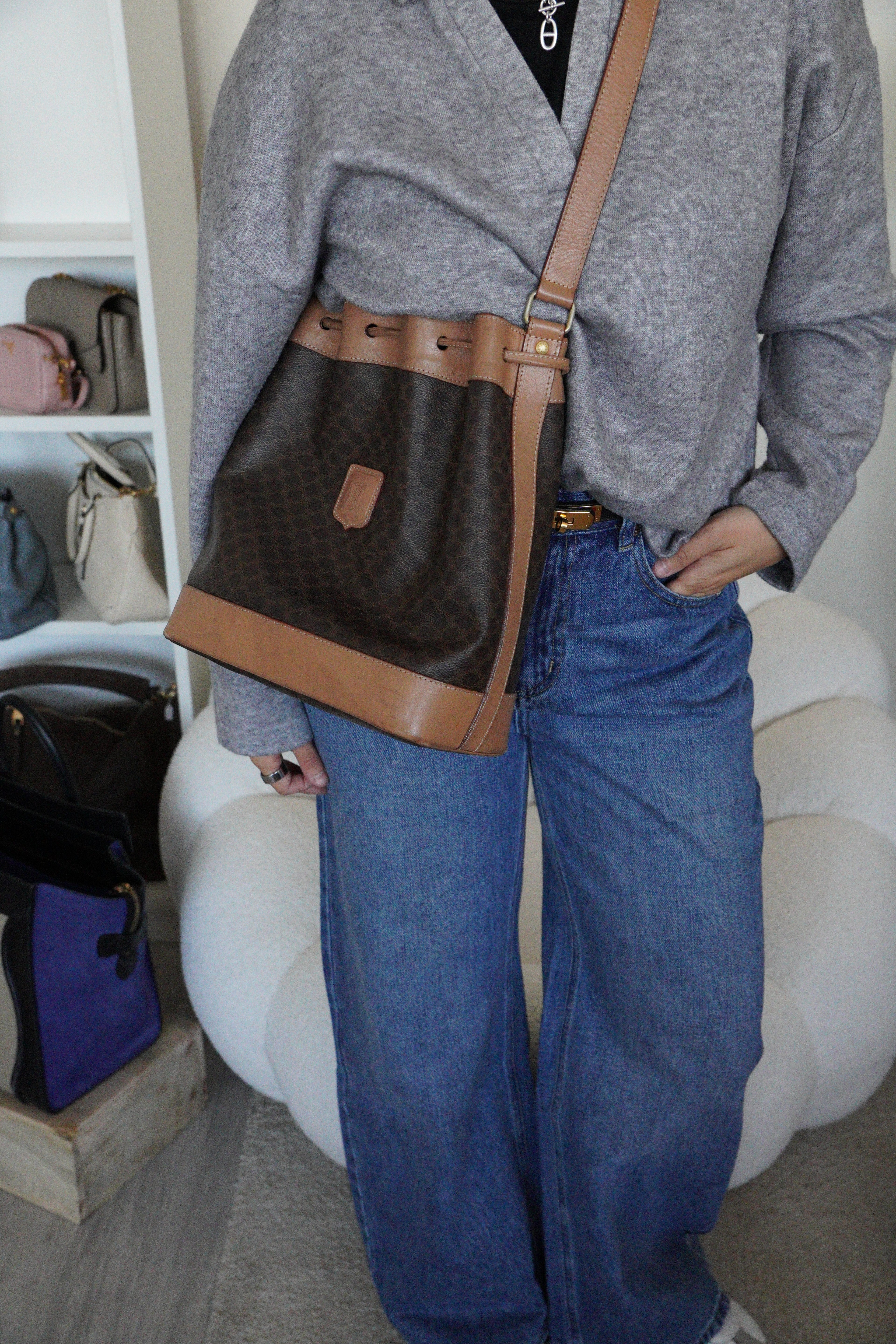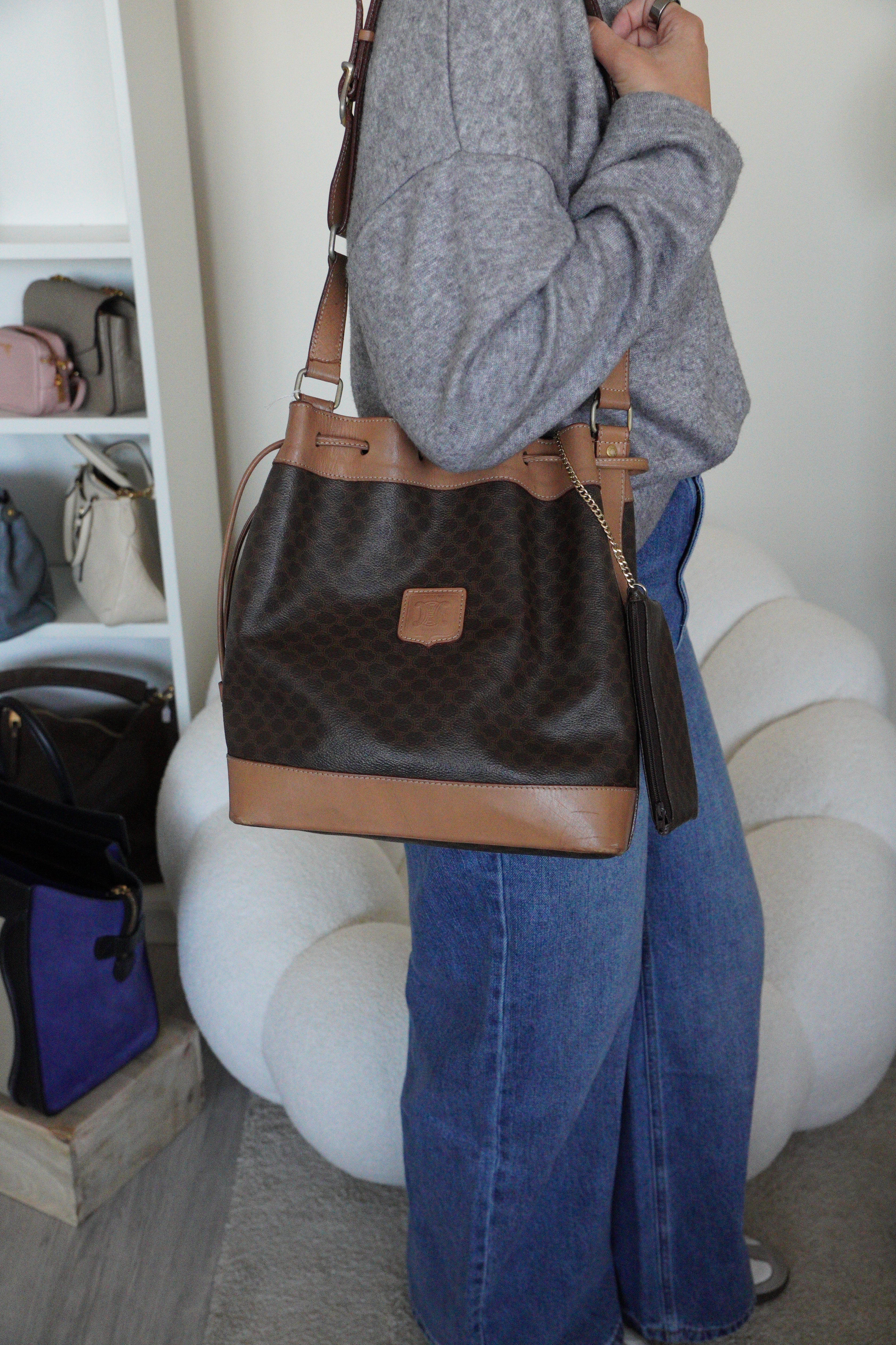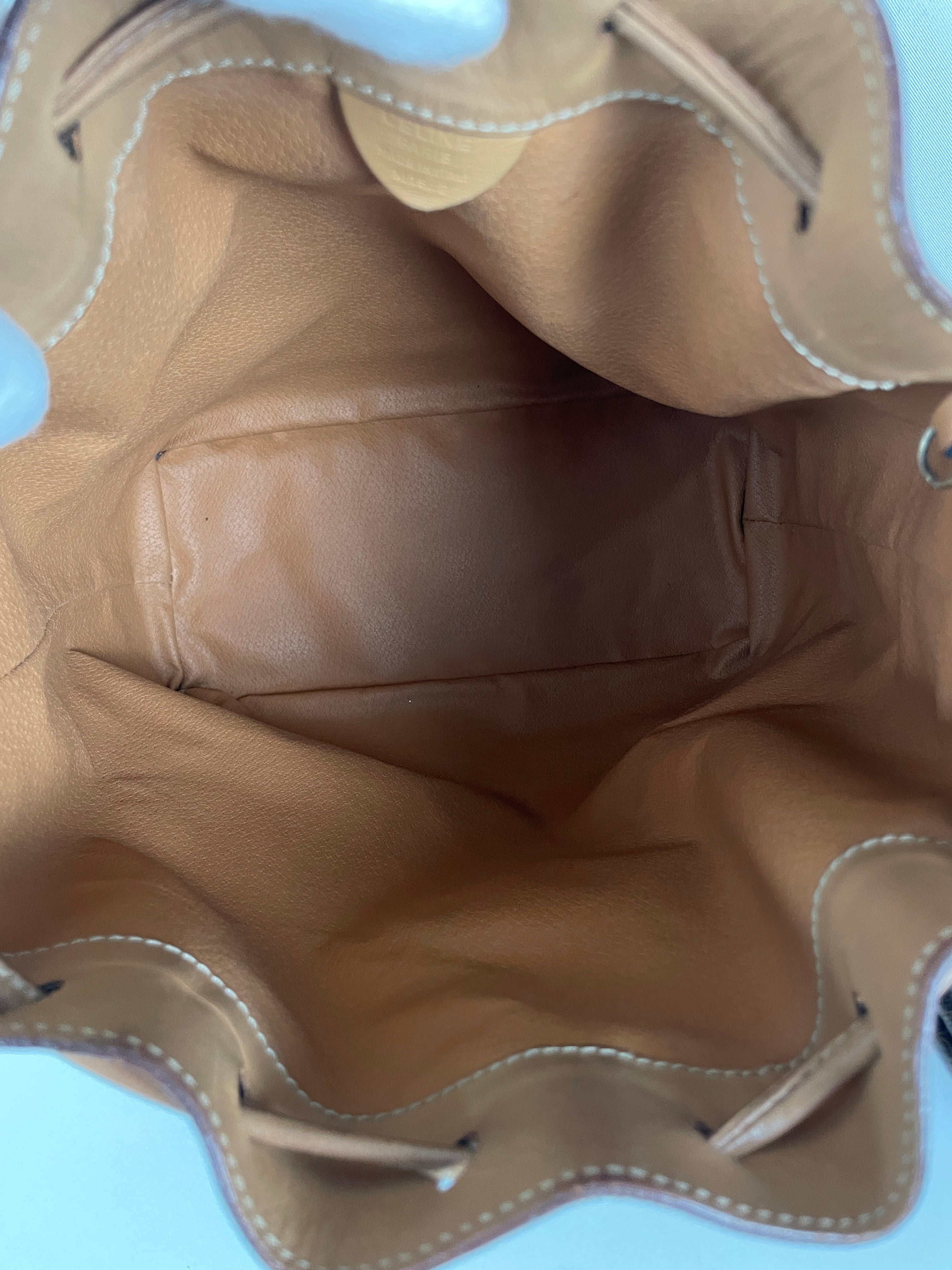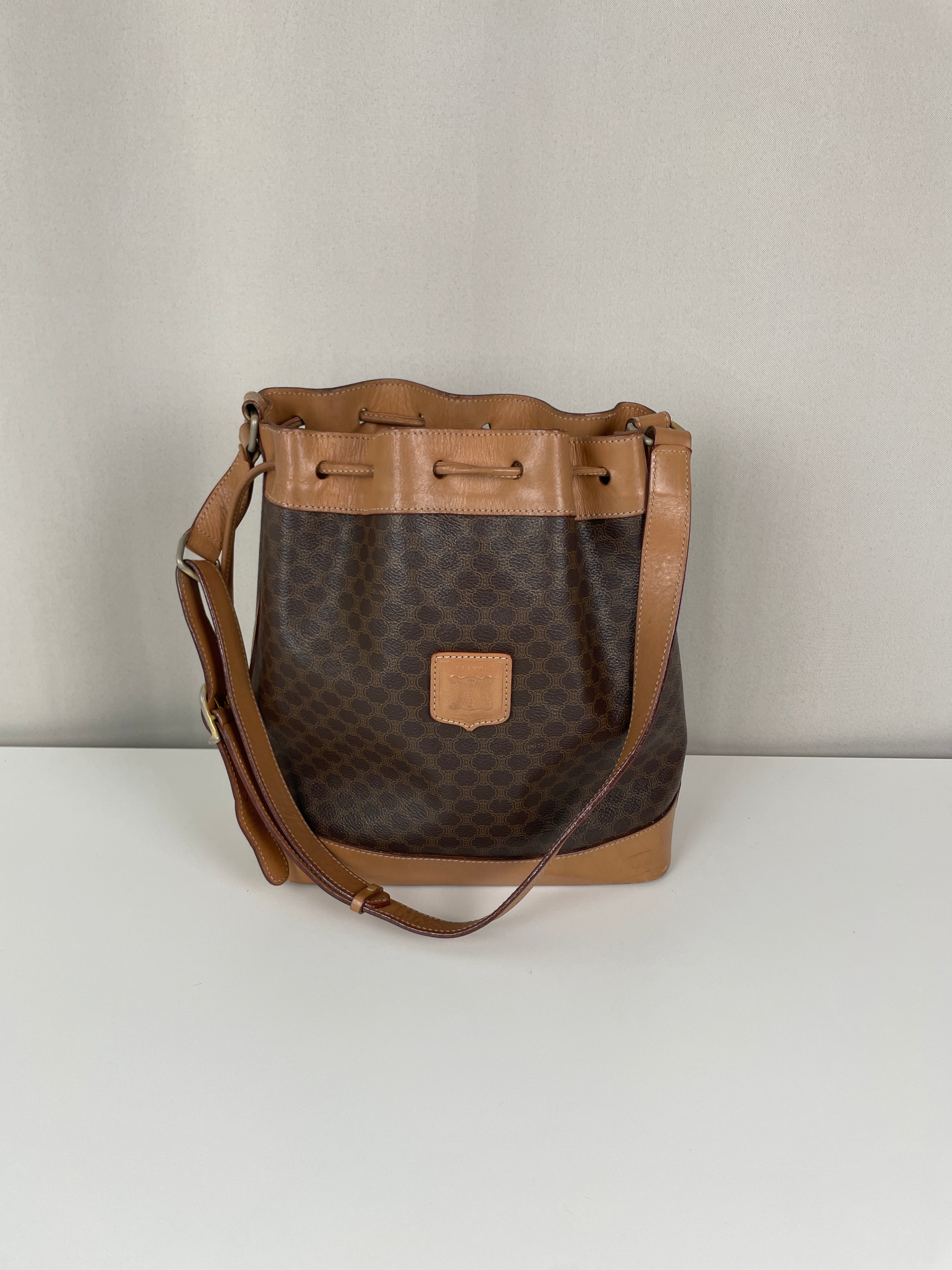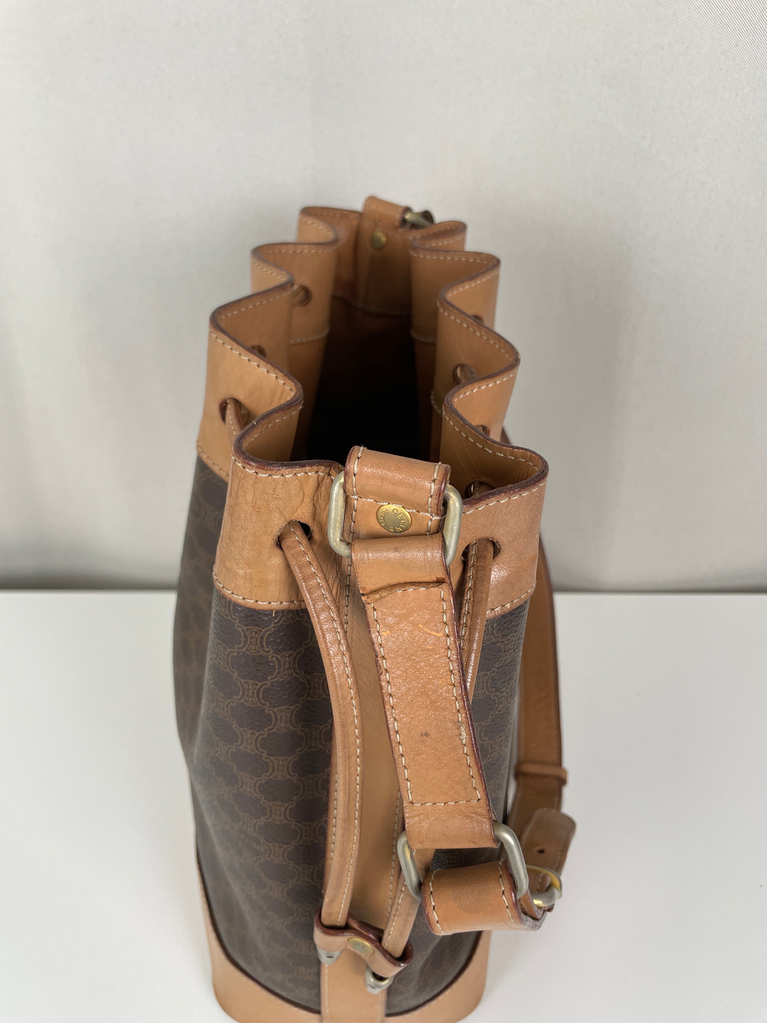 Ce sac Céline seau en toile macadam est en bon état. L'intérieur est en très bon état. Les passants sont légèrement abîmés. Les coins et le haut du sac sont abîmés, légèrement frottés.