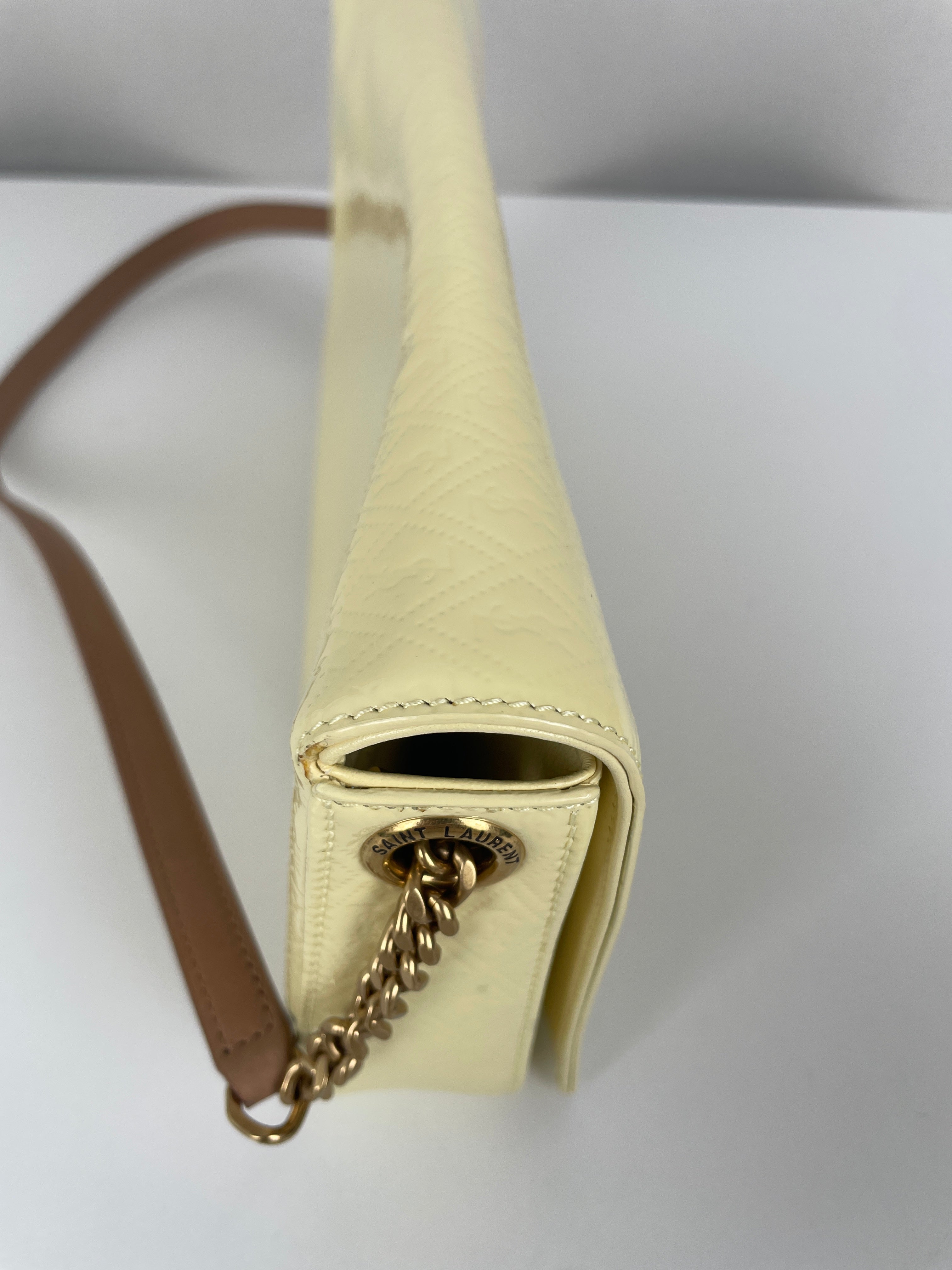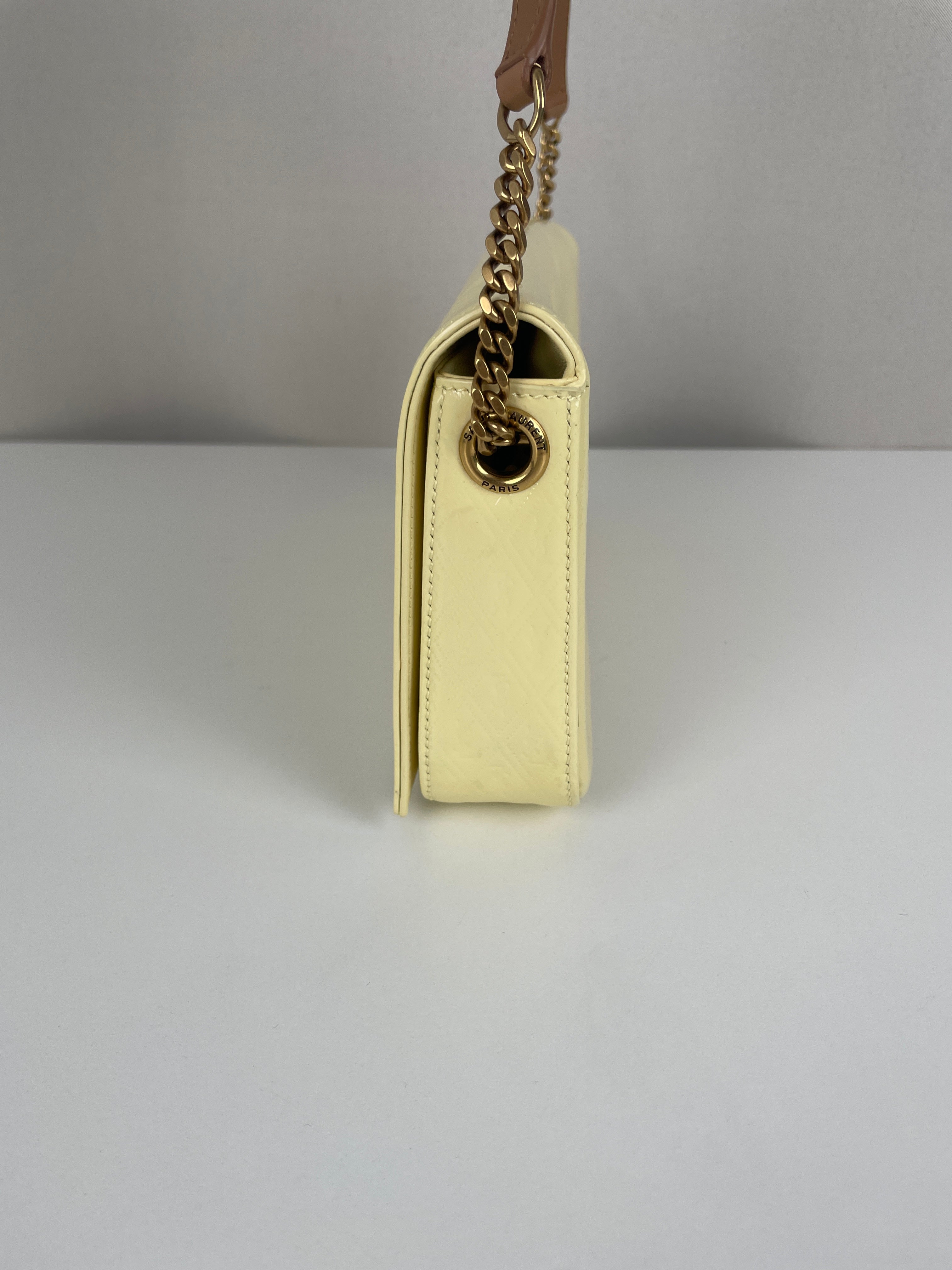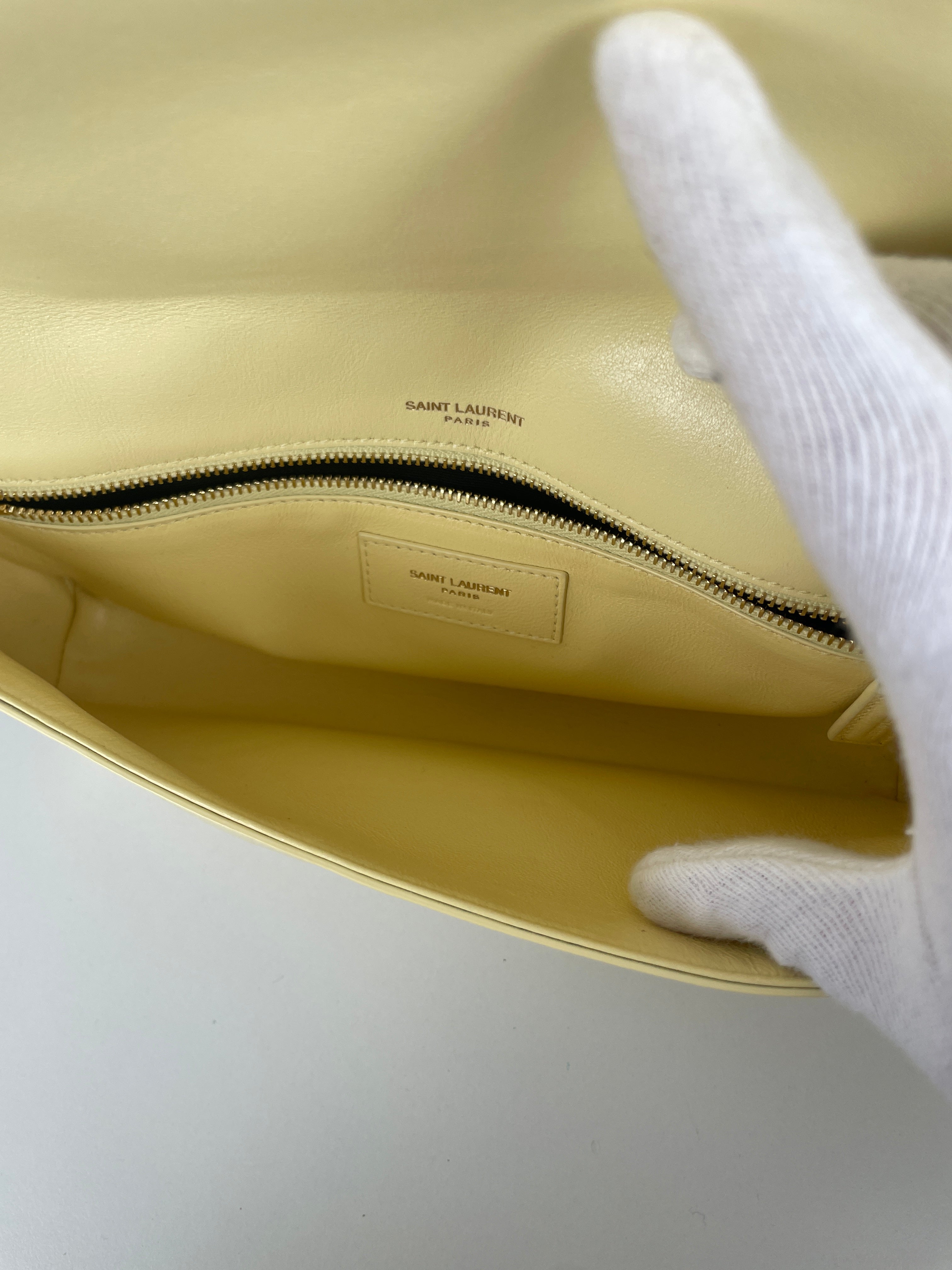 Ce modèle Saint Laurent Kate en cuir verni jaune est en excellent état. Le cuir est impeccable. Les coins sont également en très bon état. La bandoulière et l'intérieur sont également en très bon état. Il reste un autocollant de protection.