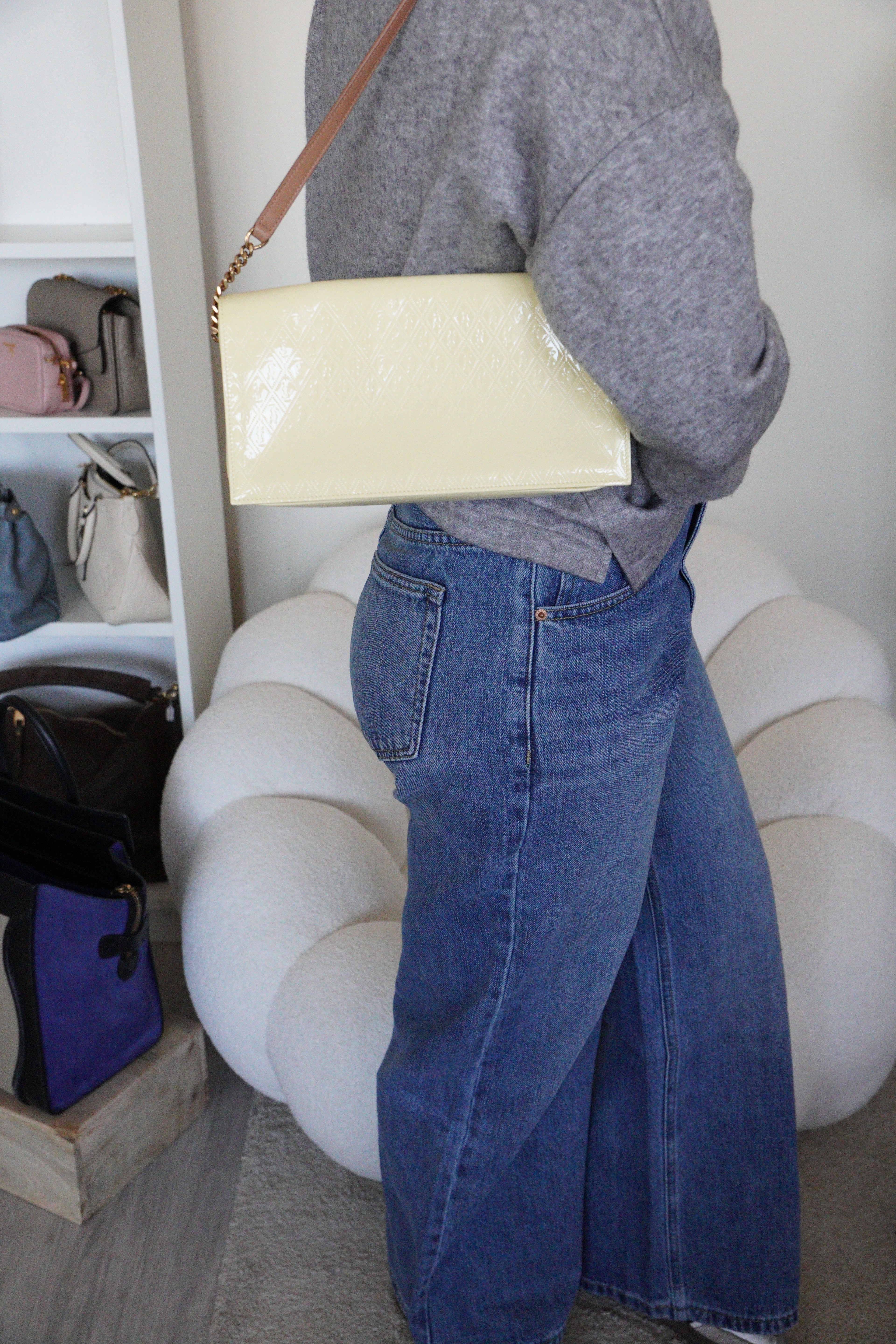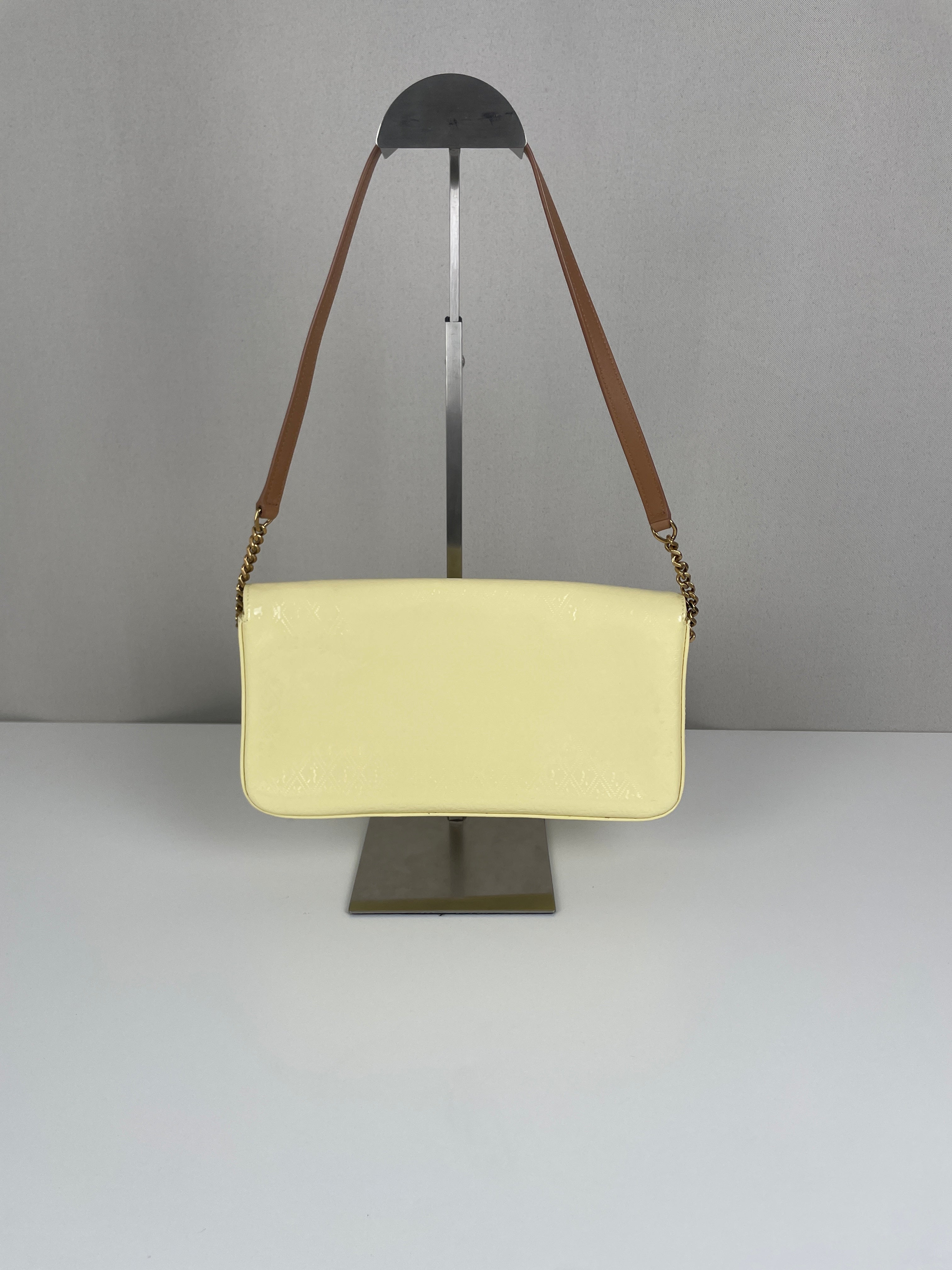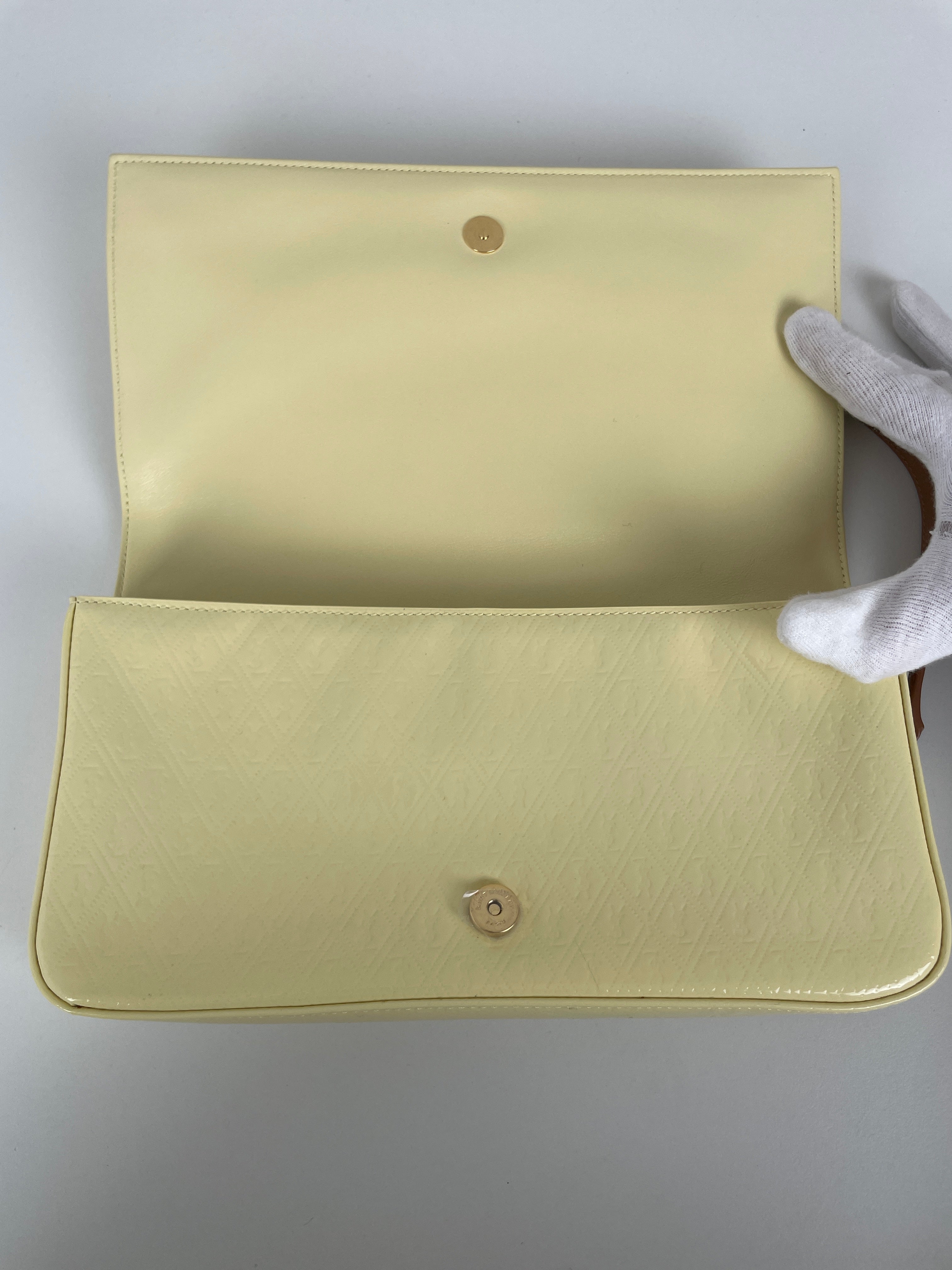 Ce modèle Saint Laurent Kate en cuir verni jaune est en excellent état. Le cuir est impeccable. Les coins sont également en très bon état. La bandoulière et l'intérieur sont également en très bon état. Il reste un autocollant de protection.