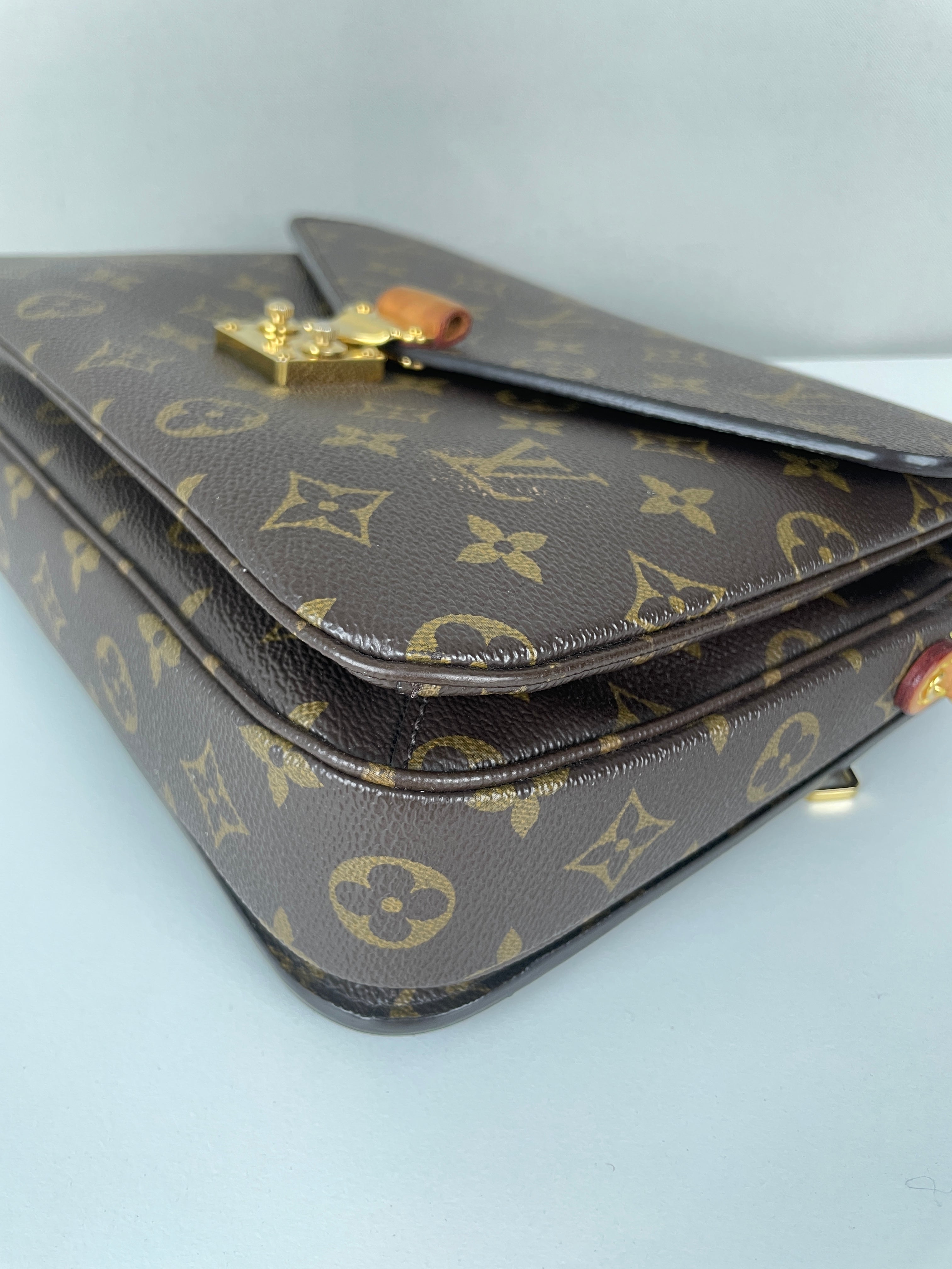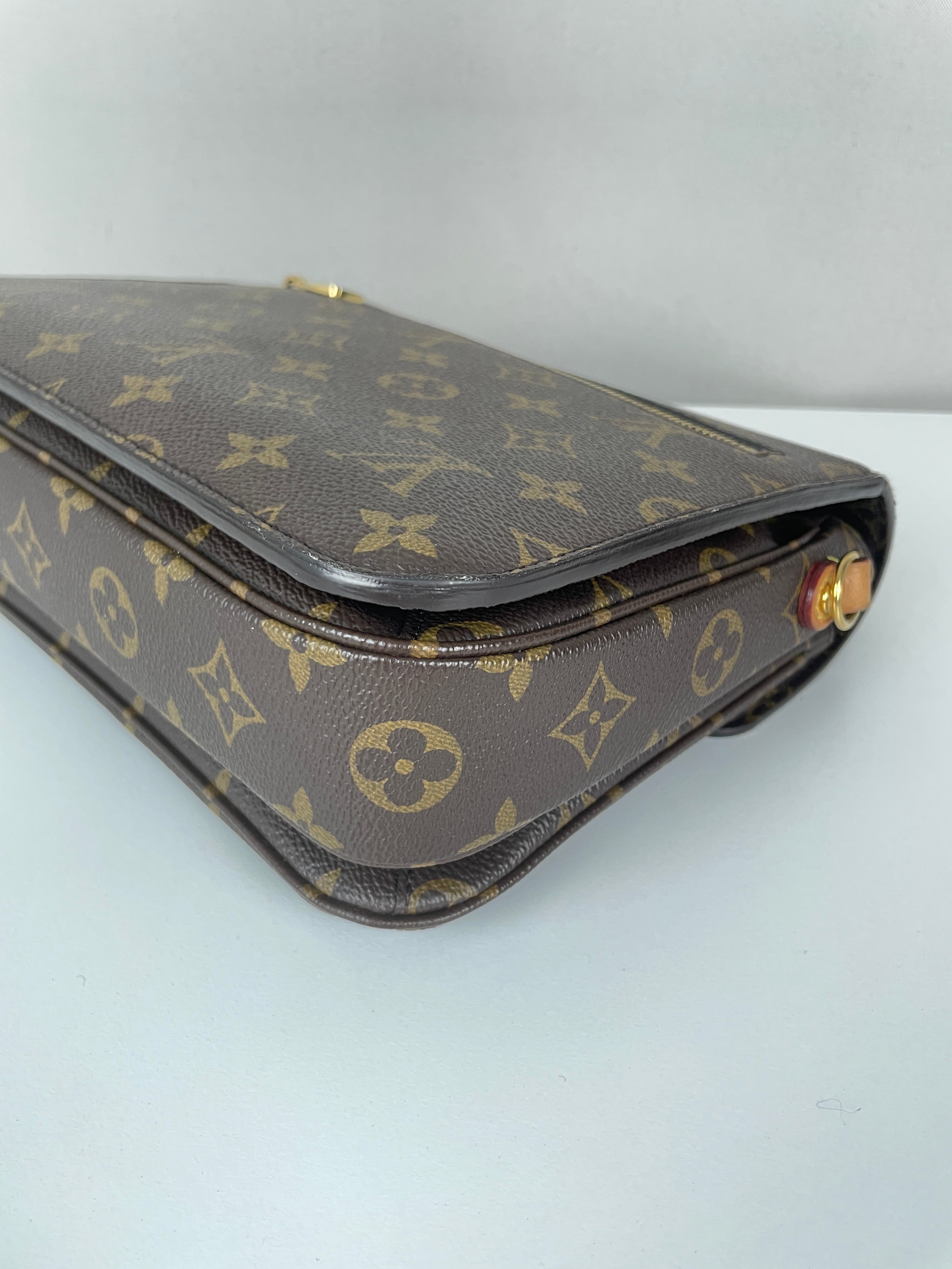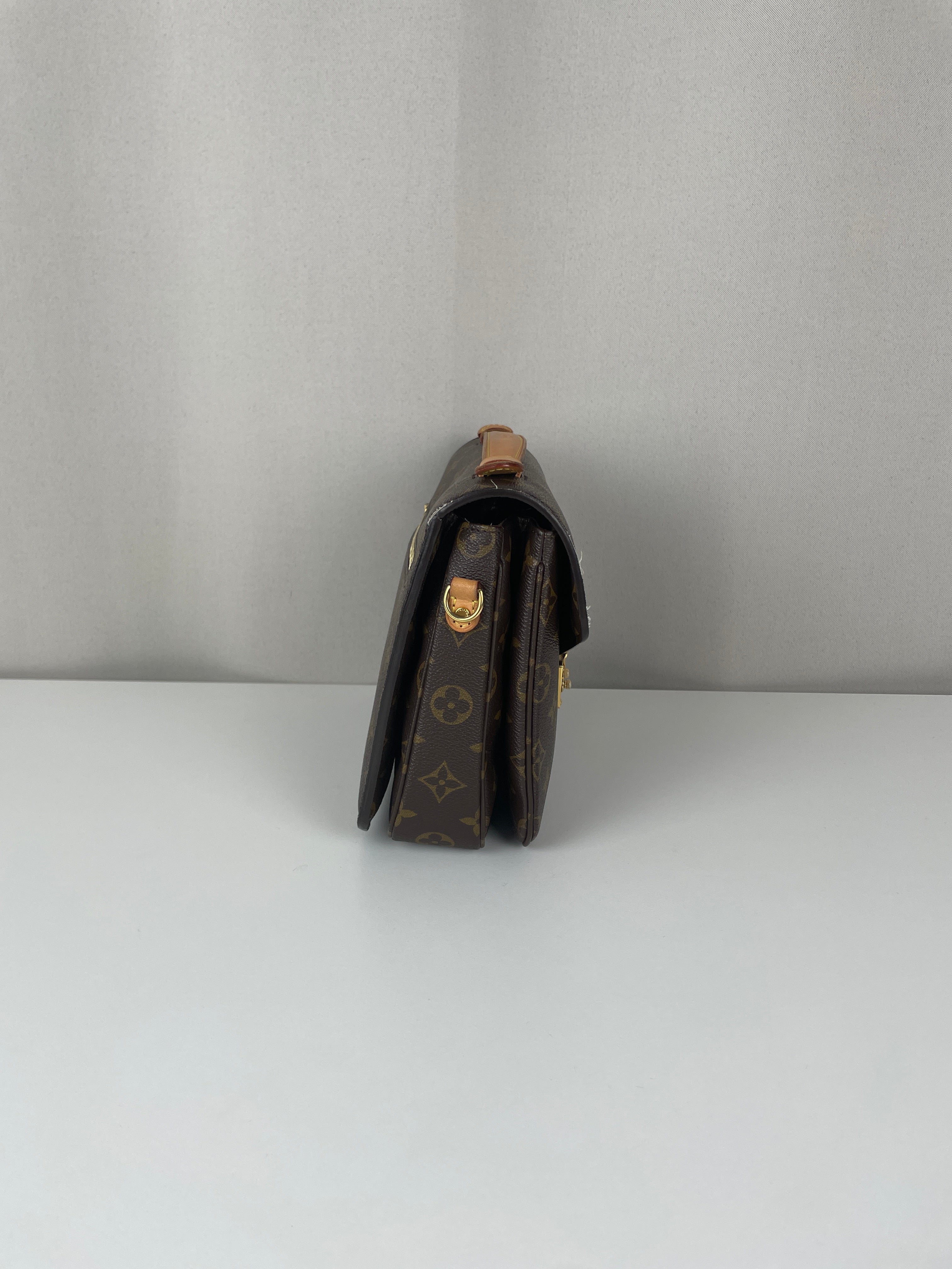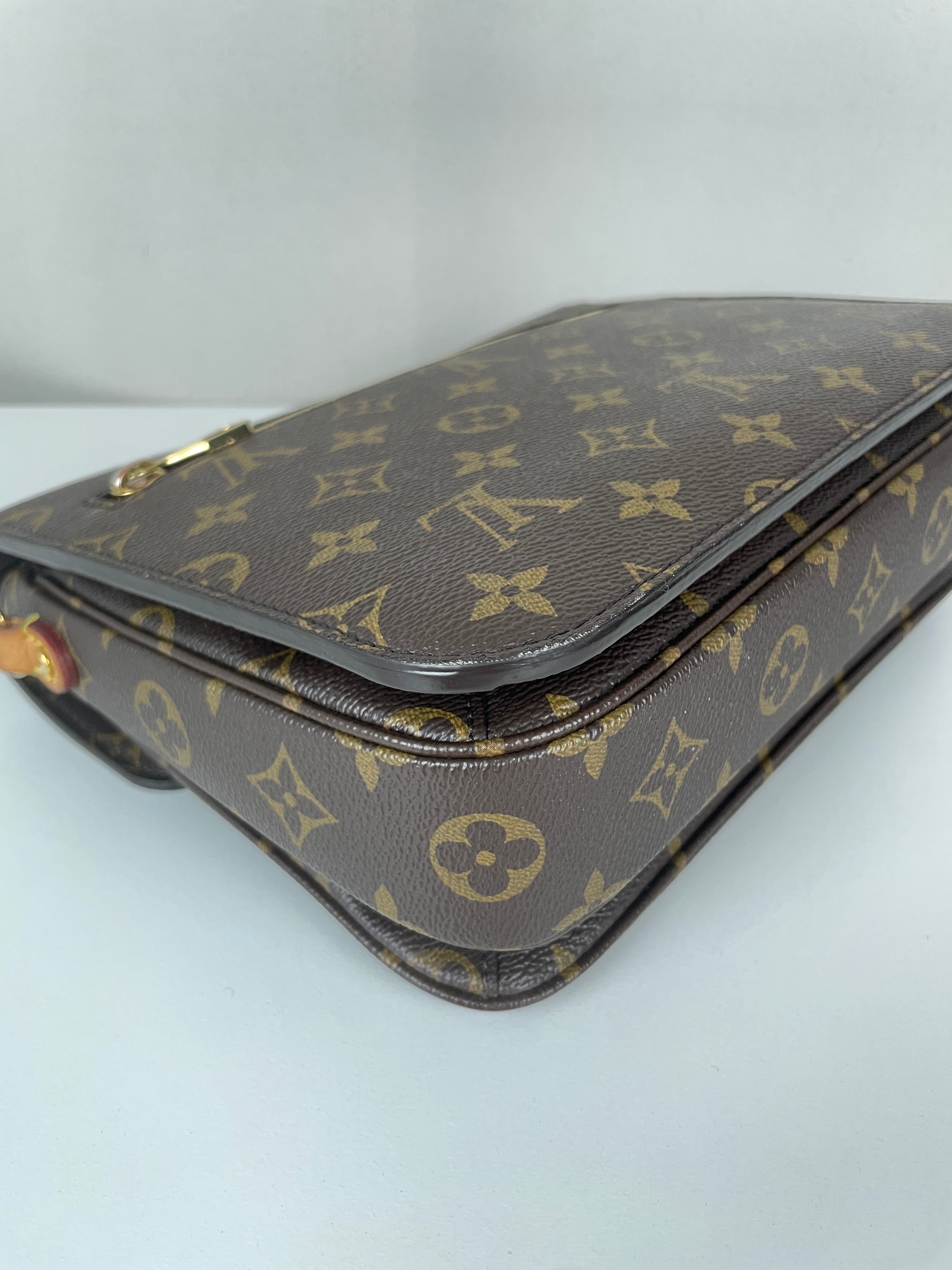 Classique de la maison Louis Vuitton, la pochette métis séduit par son format structuré et sa ligne intemporelle. Ce modèle de 2021 en toile monogram est resté en très bel état, avec une belle patine miel sur le cuir naturel. La toile est propre, les coins sont peu marqués, et la tenue générale est très bonne.