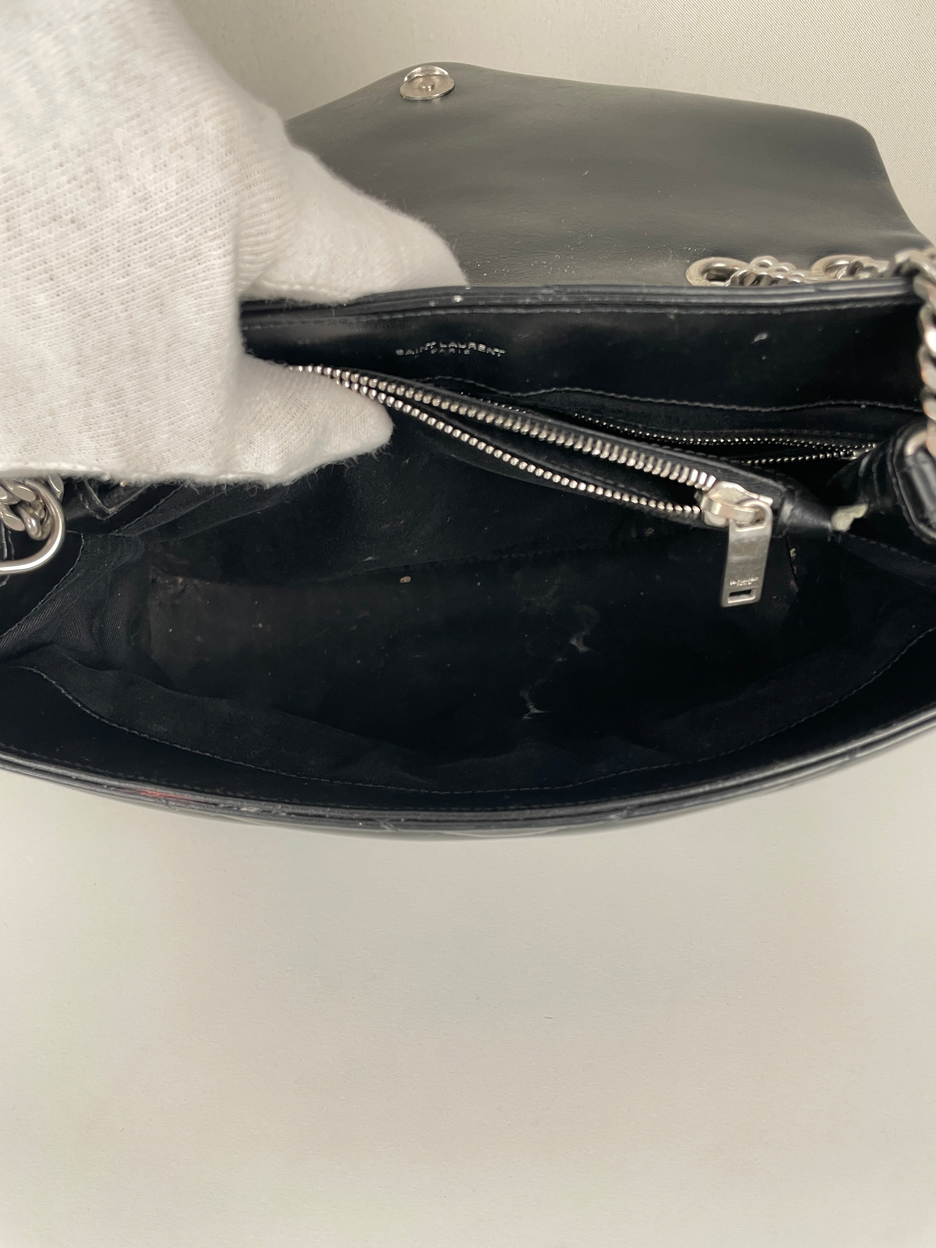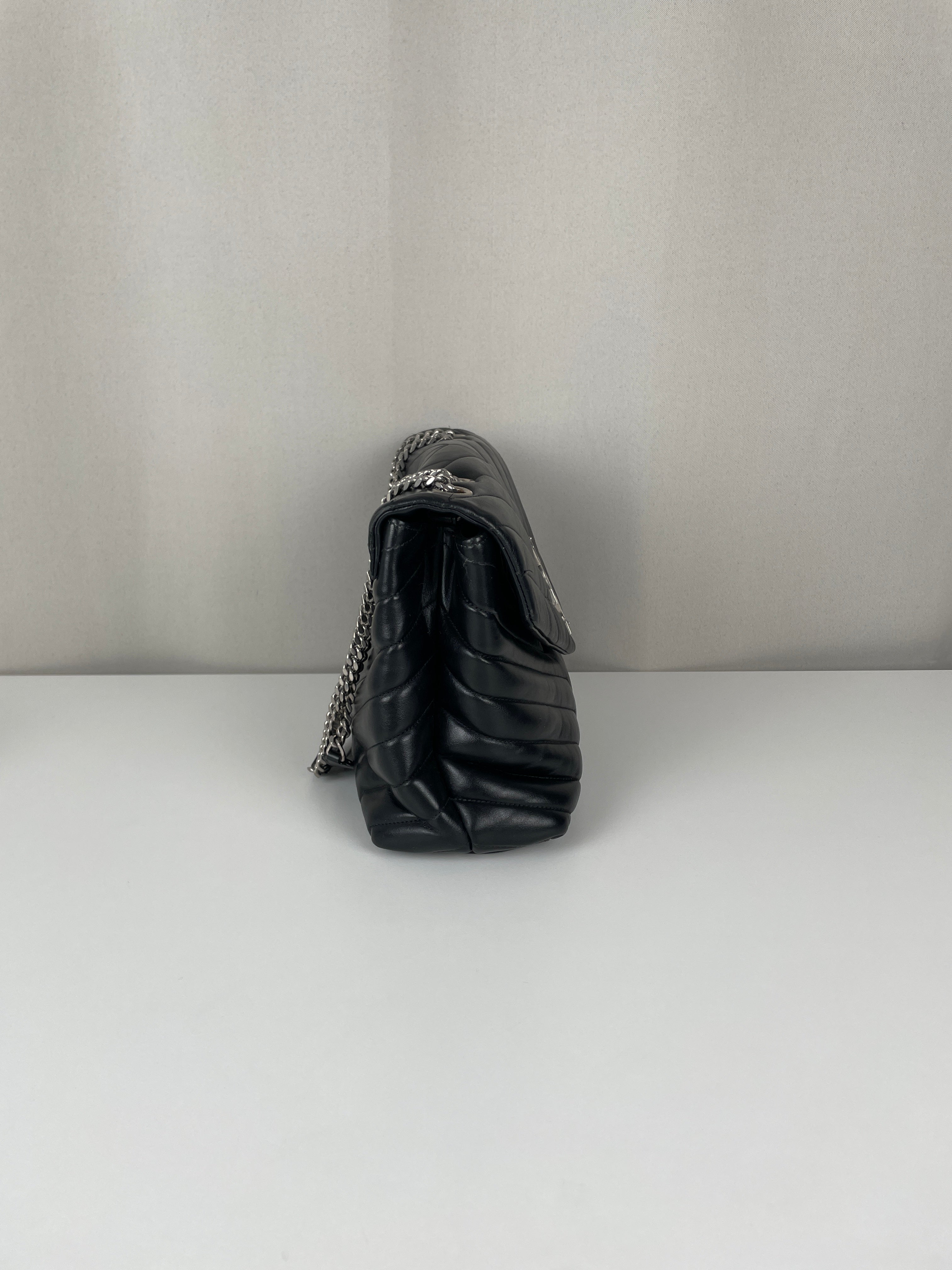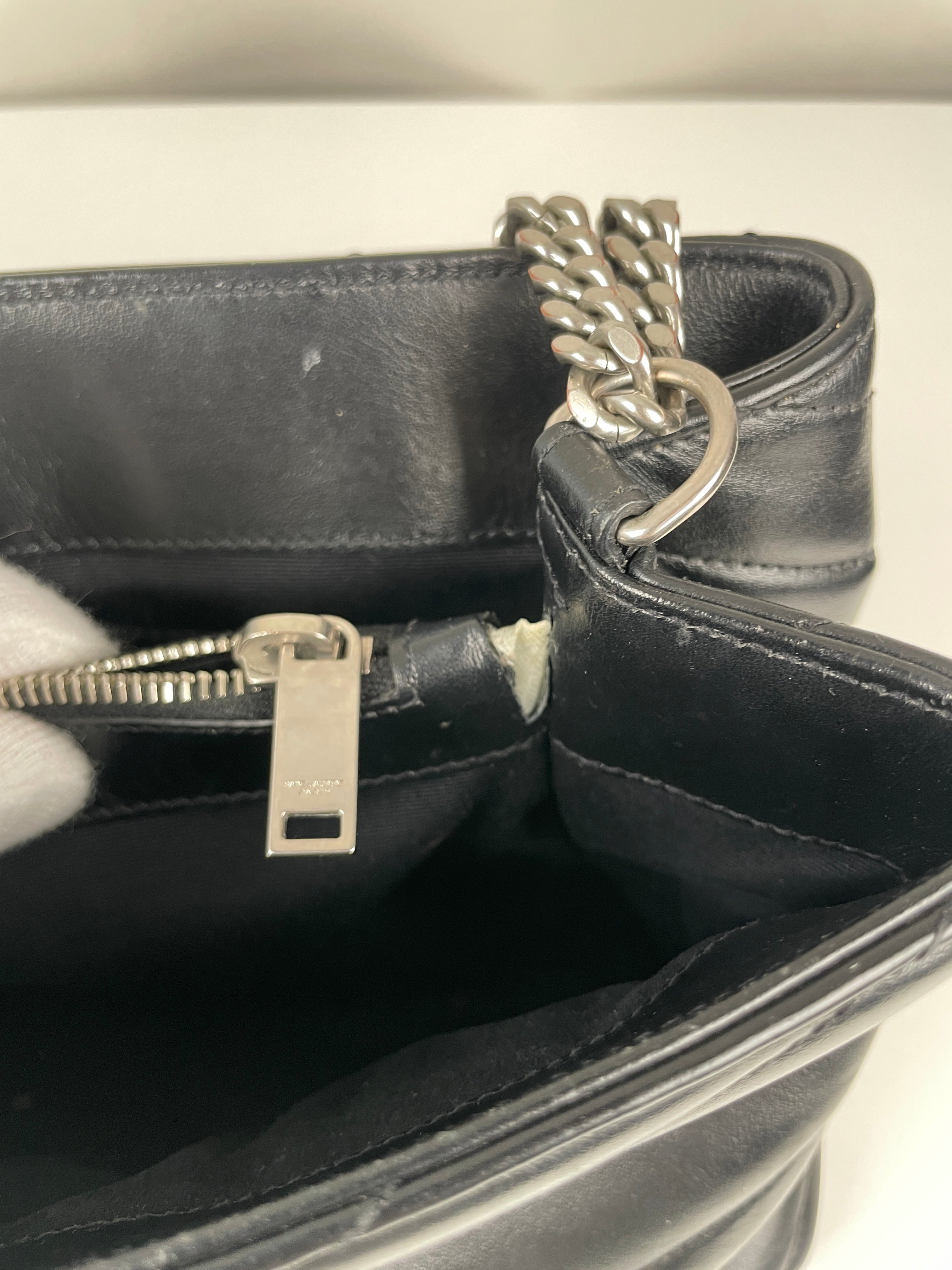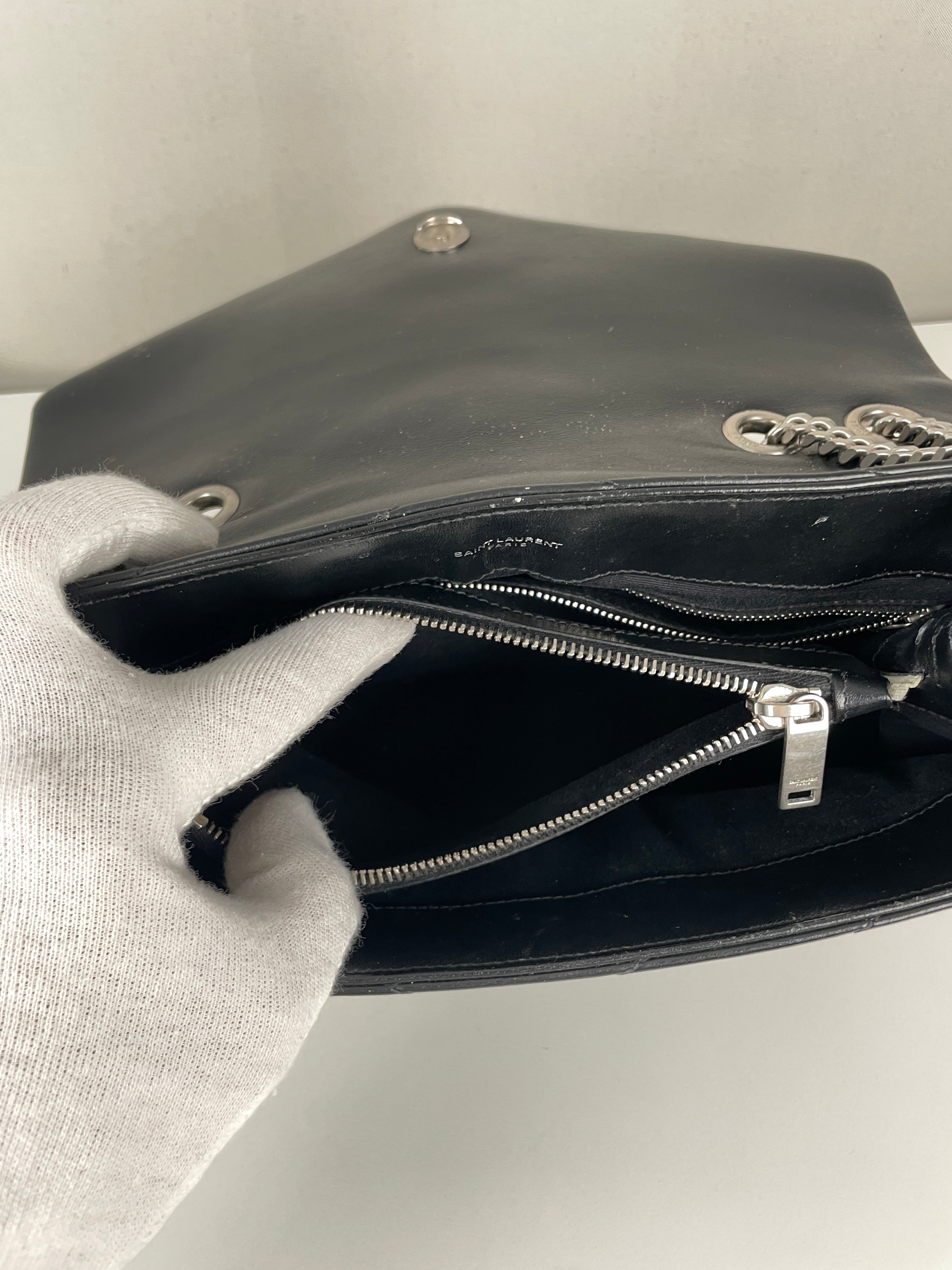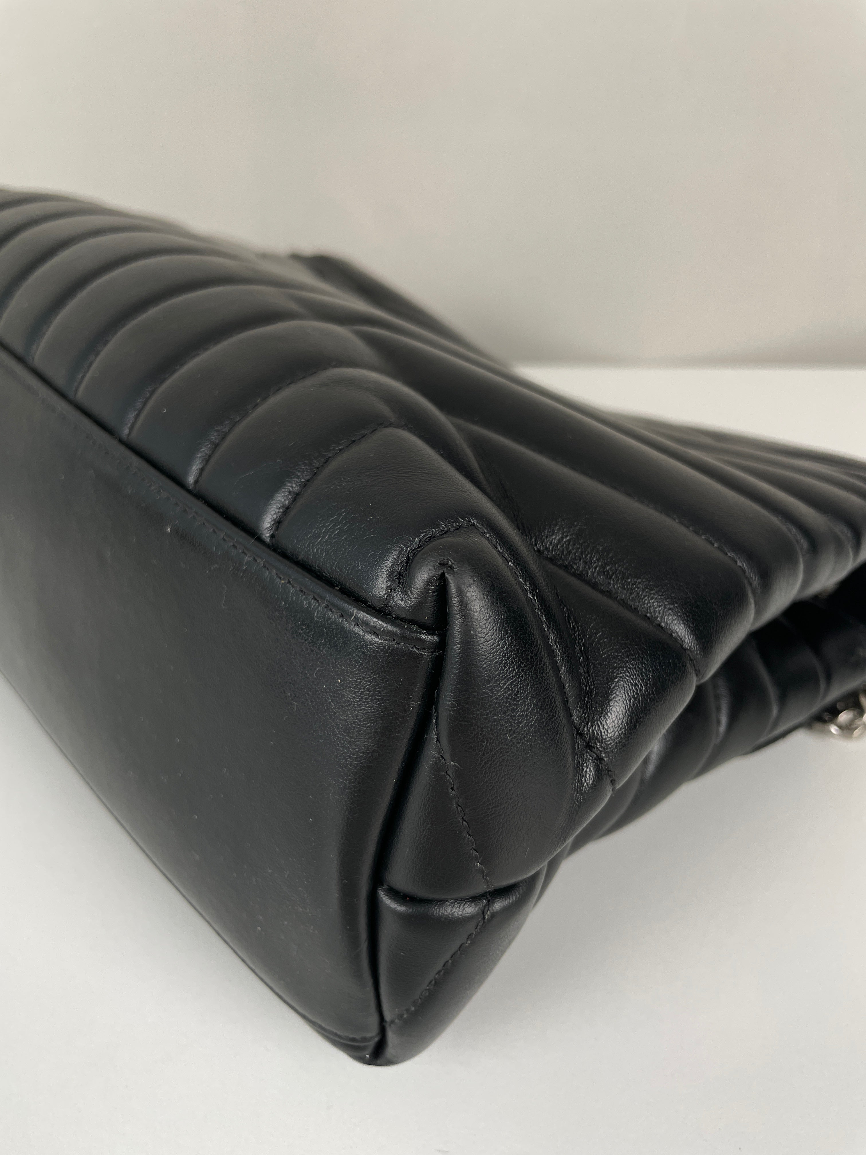 Le Loulou est l'un des modèles les plus contemporains et convoités de Saint Laurent. Cette édition en cuir noir illustre l'approche moderne du savoir-faire de luxe de la maison. Le cuir reste en bon état dans l'ensemble, avec quelques signes d'usage mineurs dans certaines zones qui témoignent de son caractère authentique. Les angles sont en bon état général, conservant la silhouette structurée du sac.