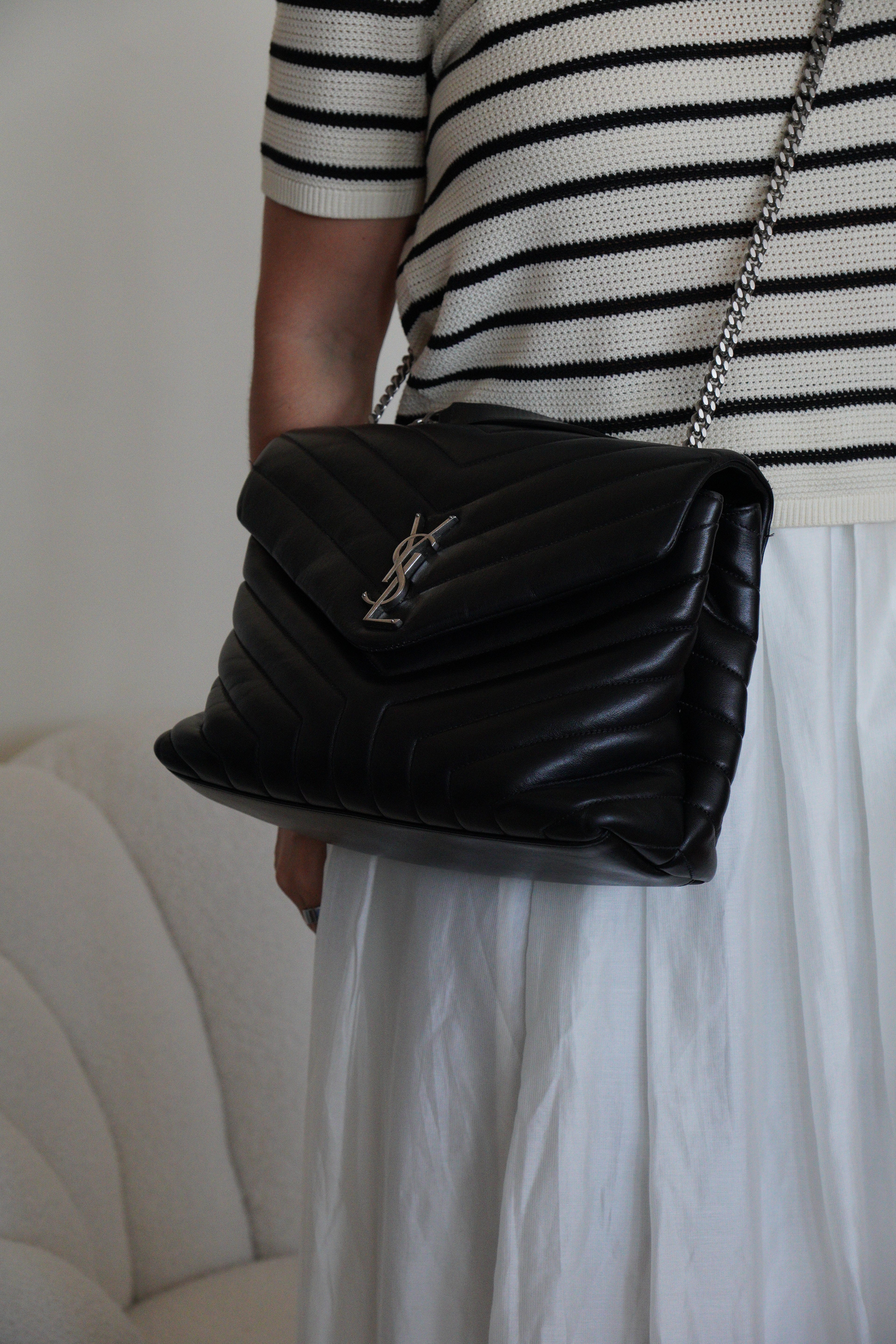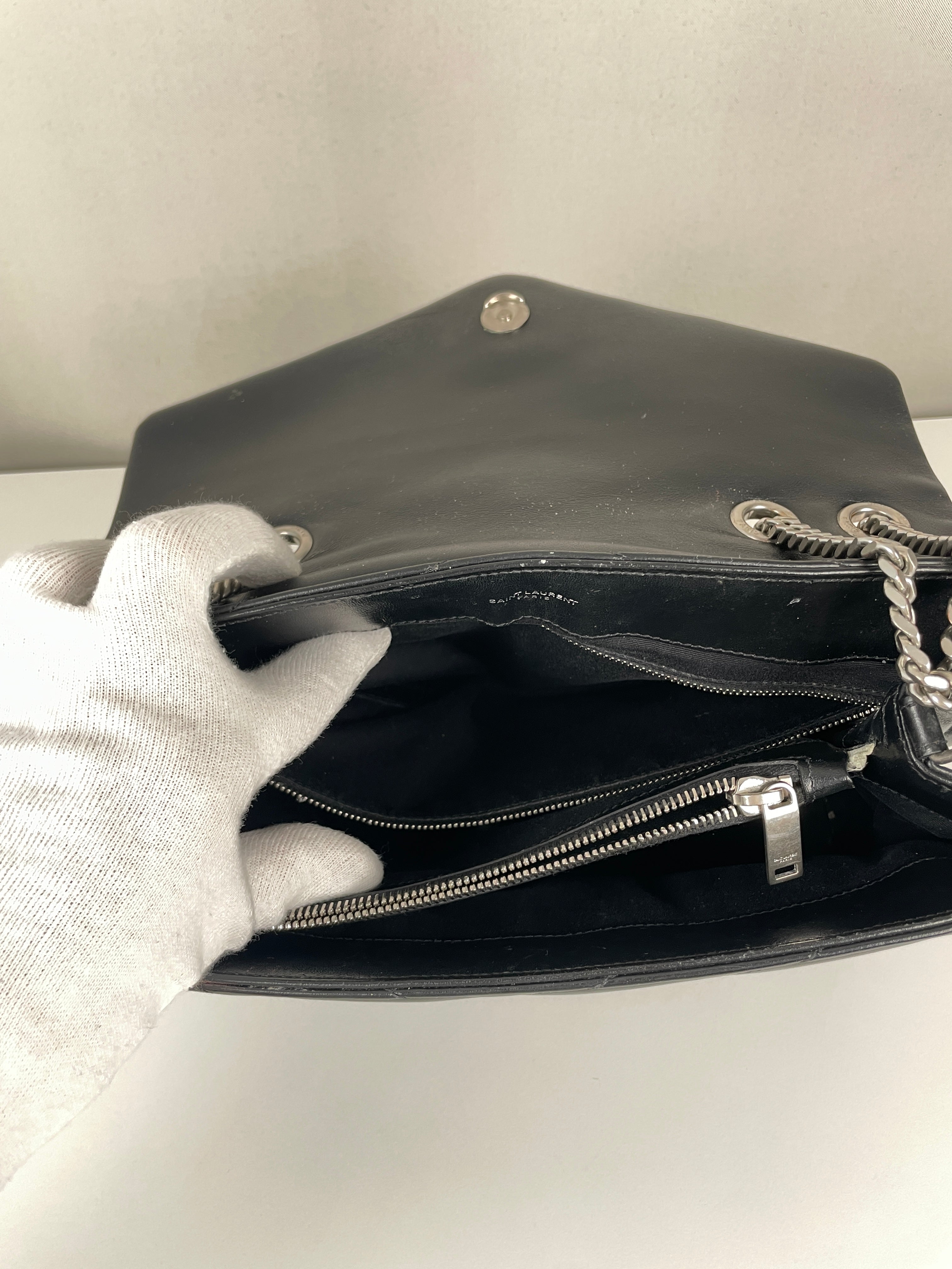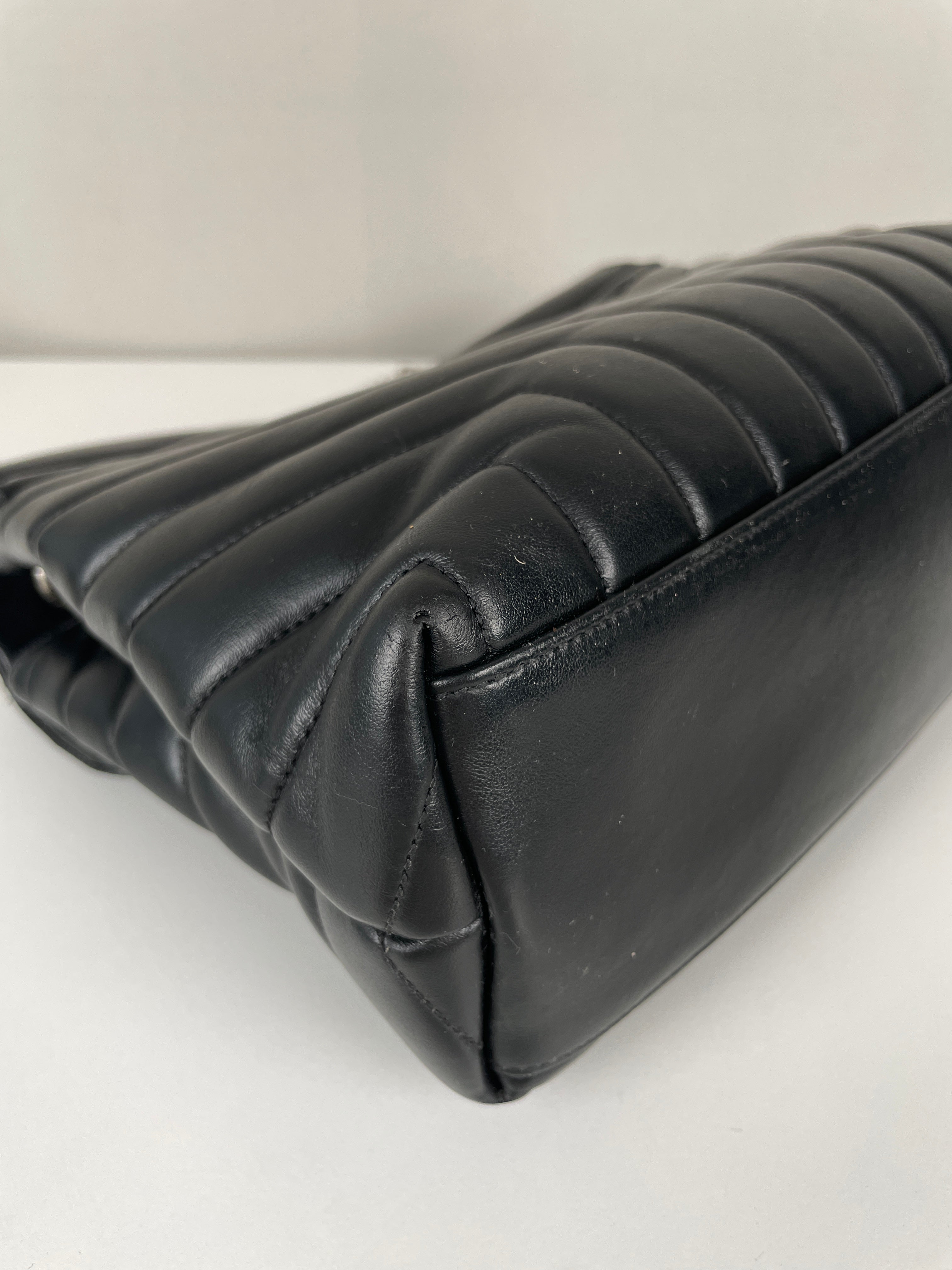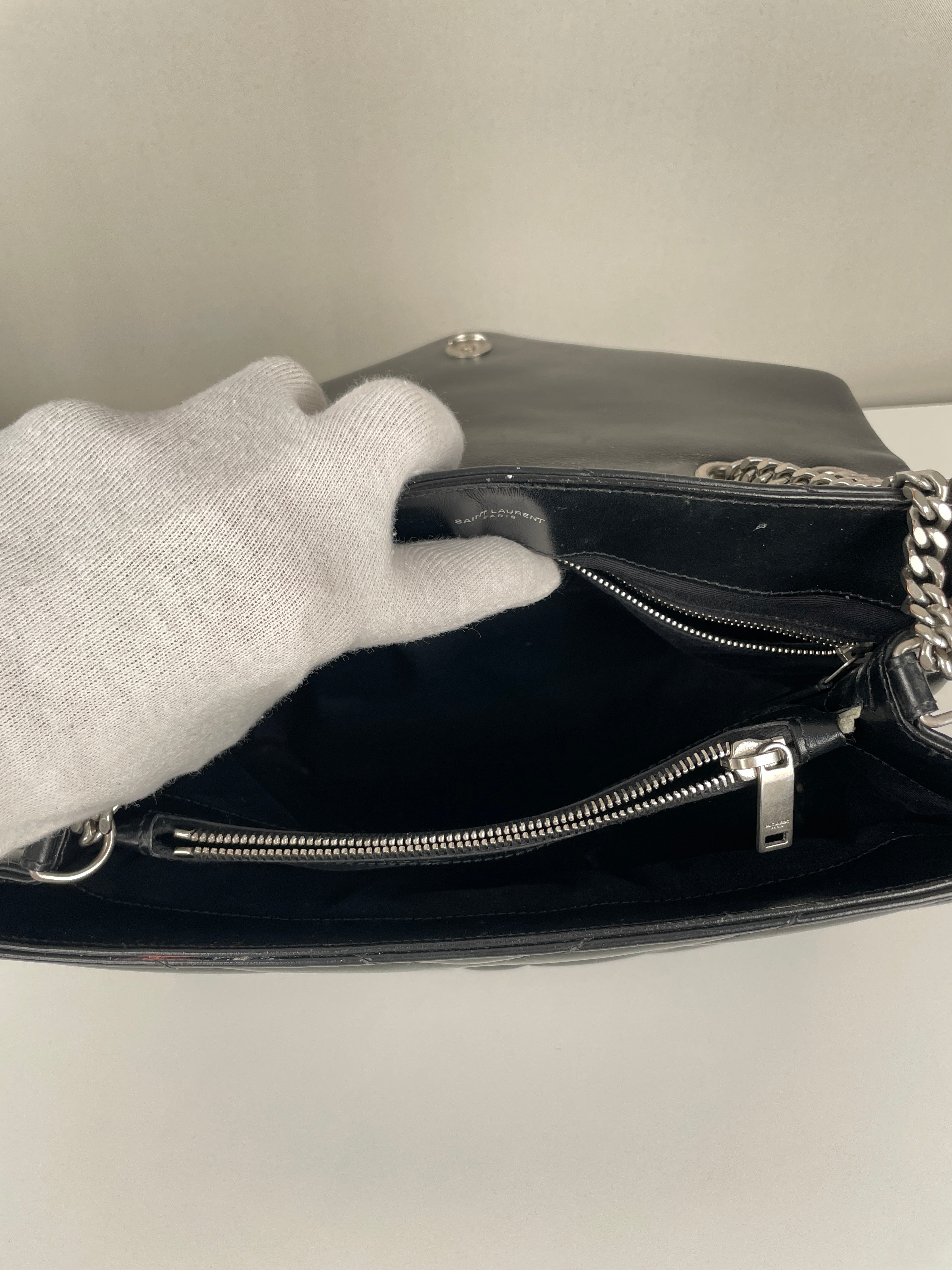 Le Loulou est l'un des modèles les plus contemporains et convoités de Saint Laurent. Cette édition en cuir noir illustre l'approche moderne du savoir-faire de luxe de la maison. Le cuir reste en bon état dans l'ensemble, avec quelques signes d'usage mineurs dans certaines zones qui témoignent de son caractère authentique. Les angles sont en bon état général, conservant la silhouette structurée du sac.